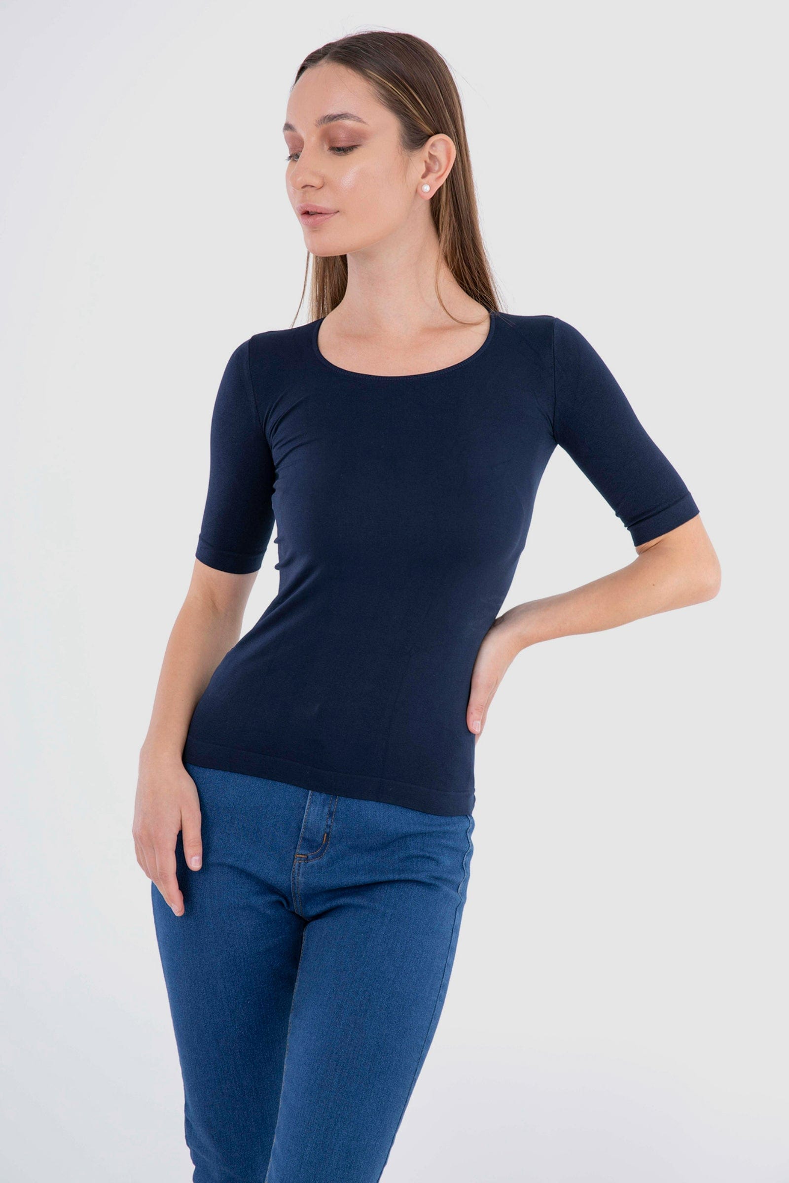 بلوزة سادة كم قصير مايكروفايبر بياقة دائرية