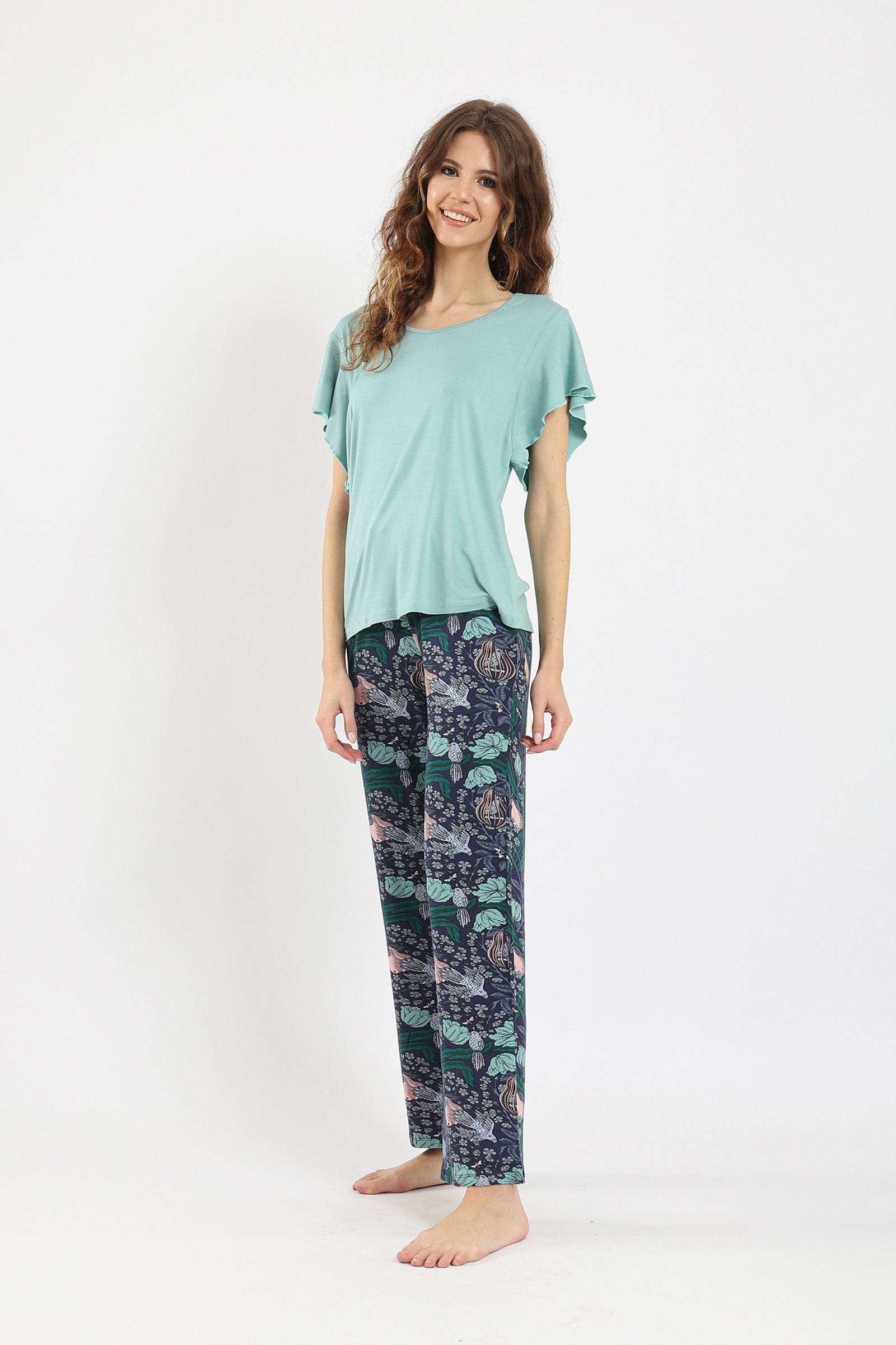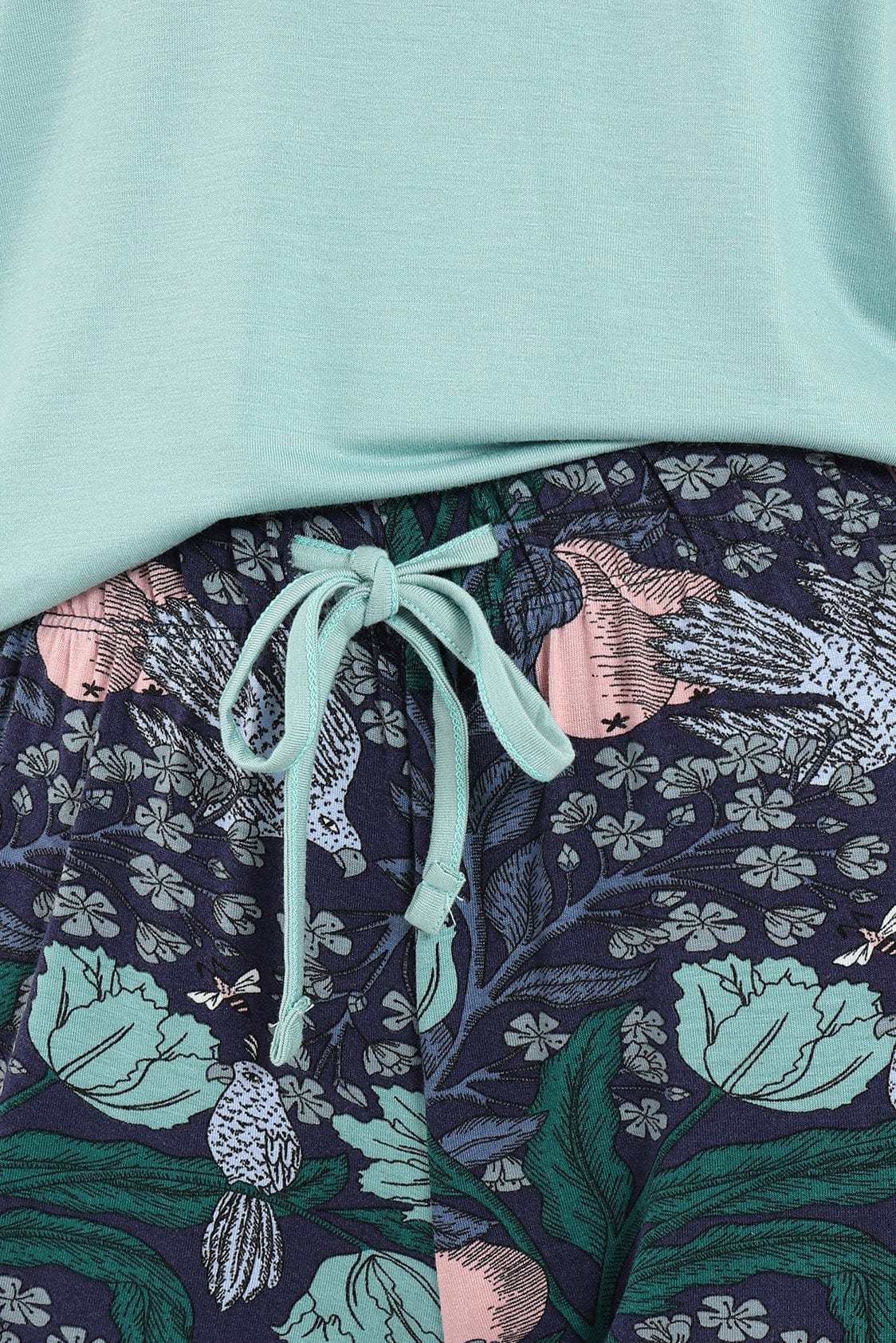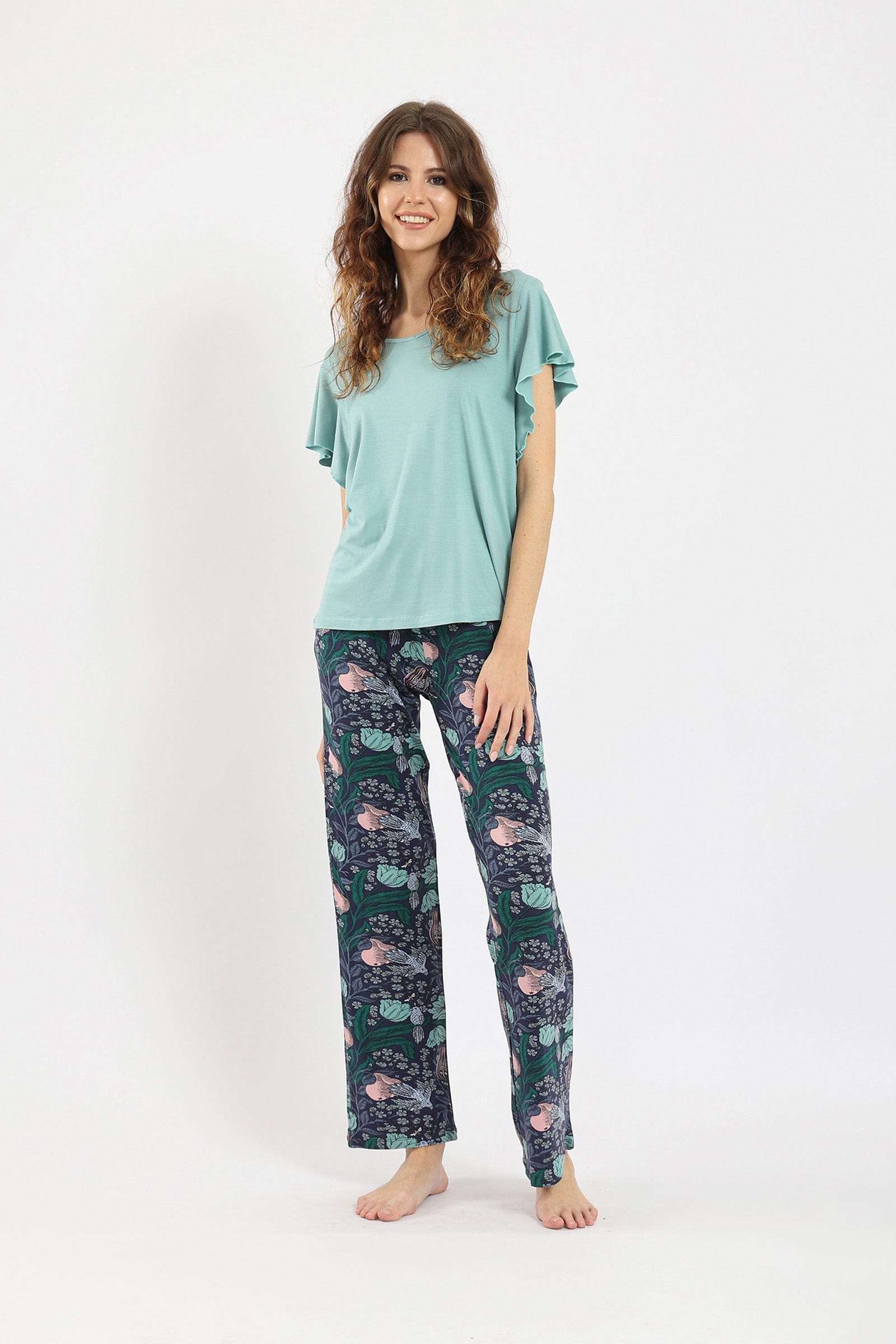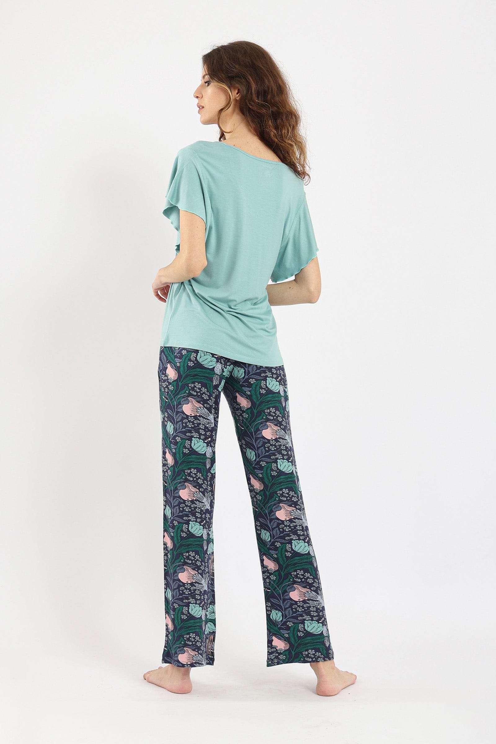 طقم بيجامة بلوزة نص كم سادة وبنطلون منقوش زهور