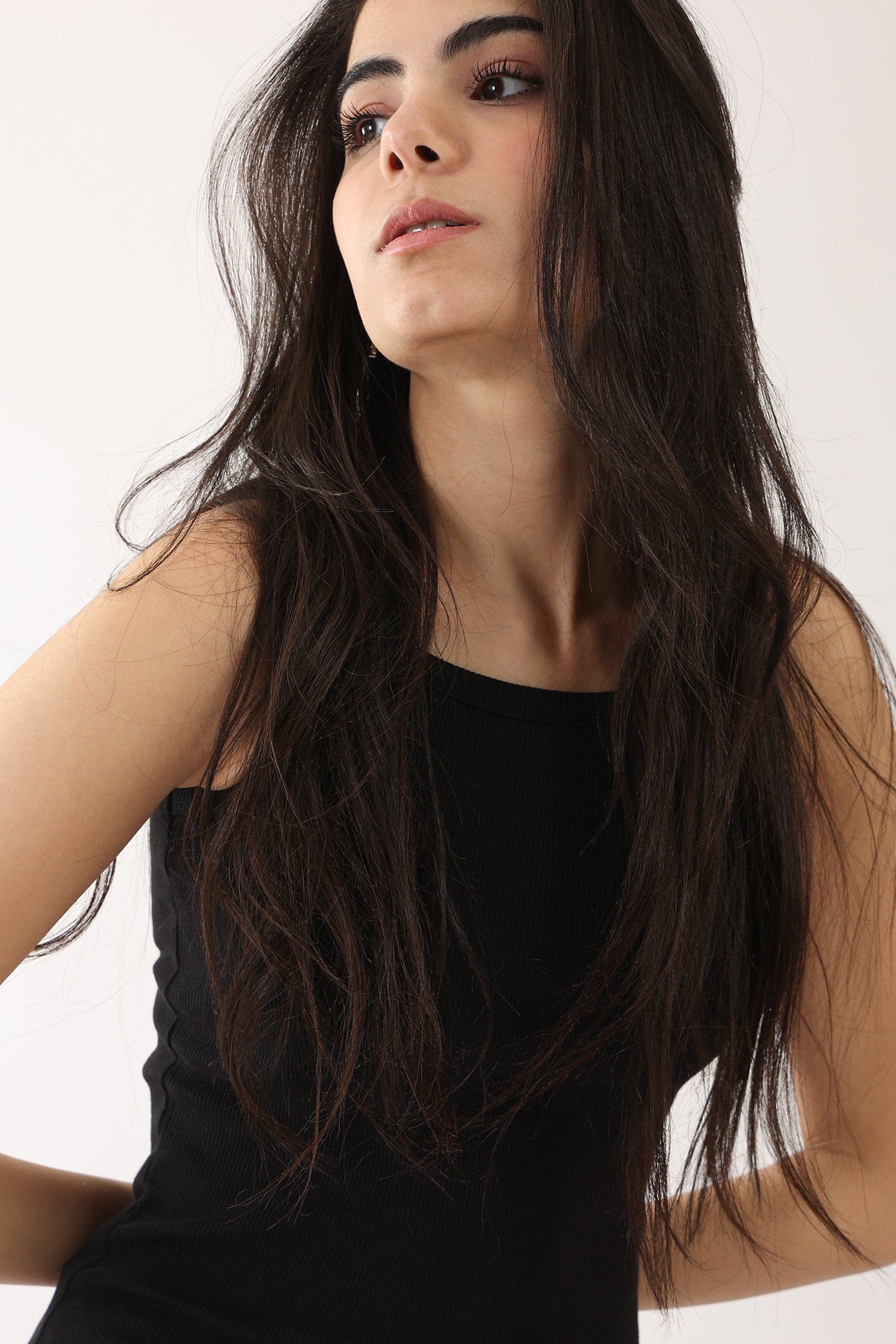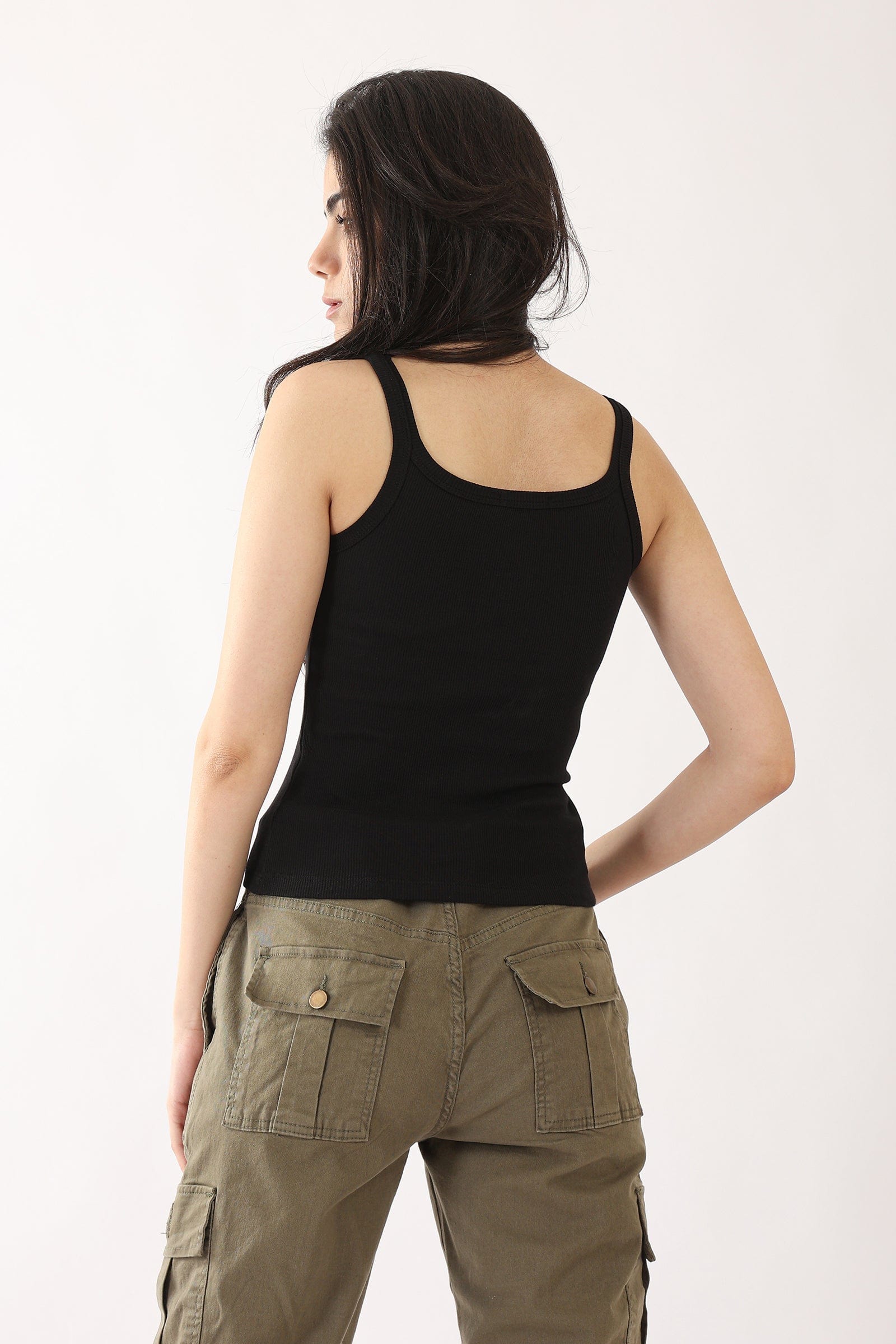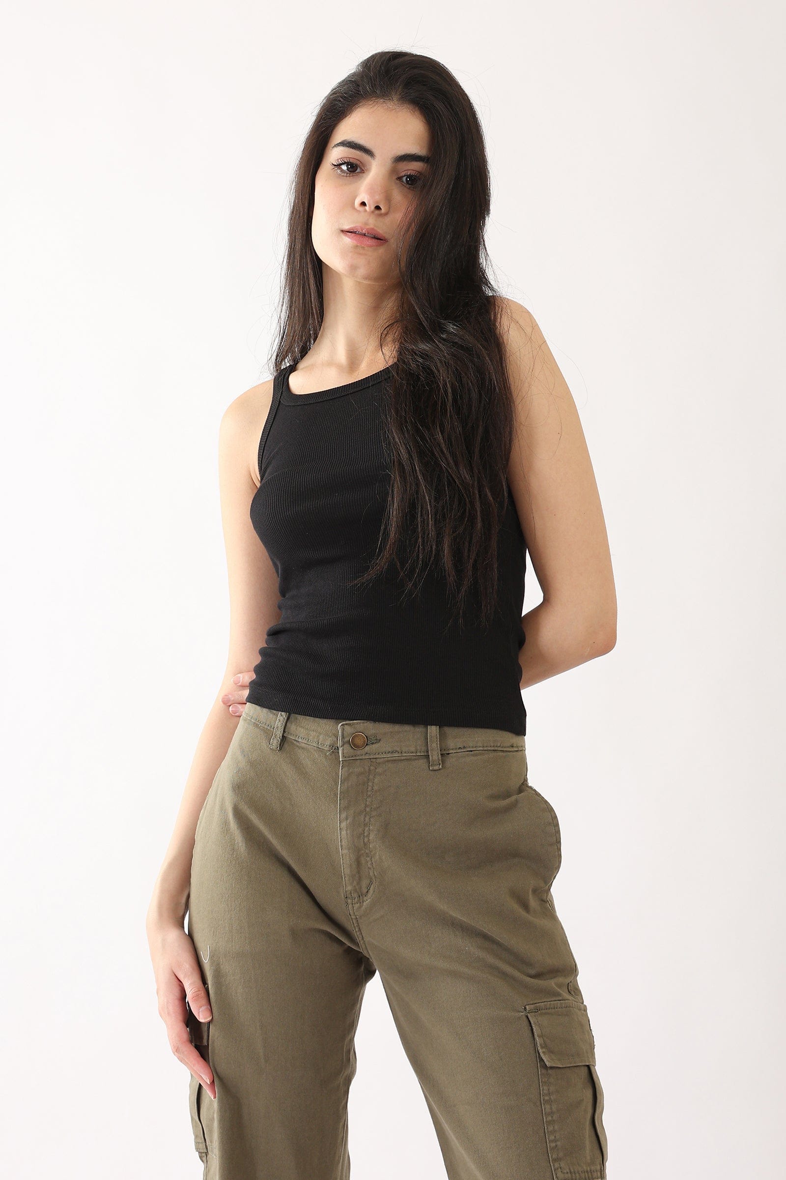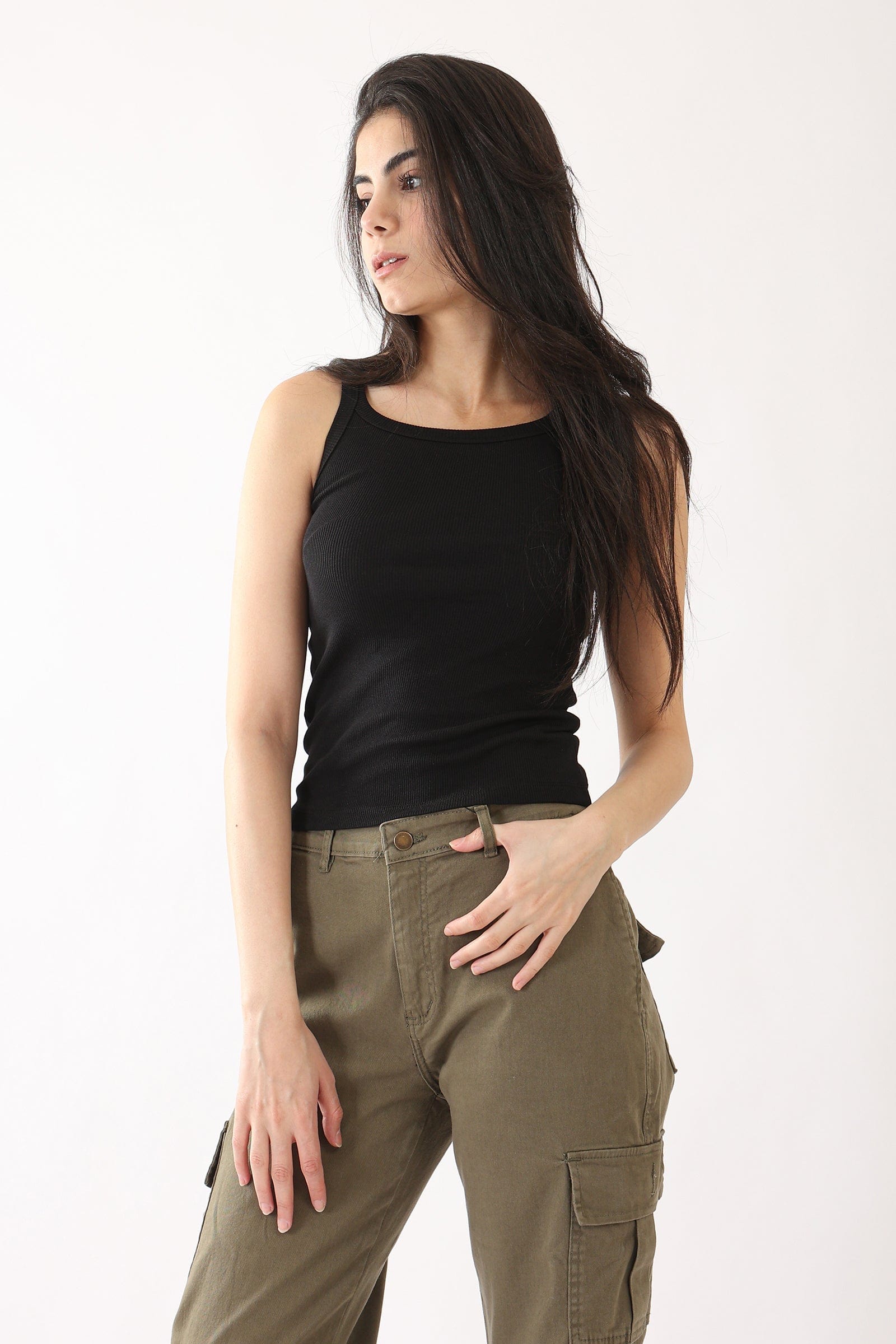 بلوزة مضلعة كت بياقة مستديرة بحمالات