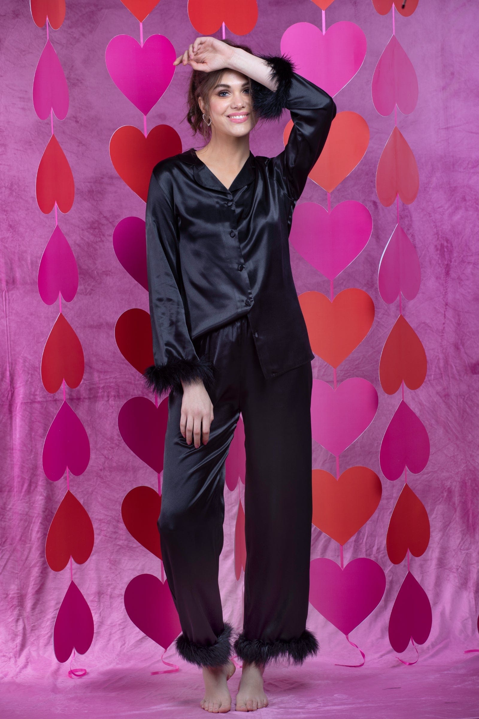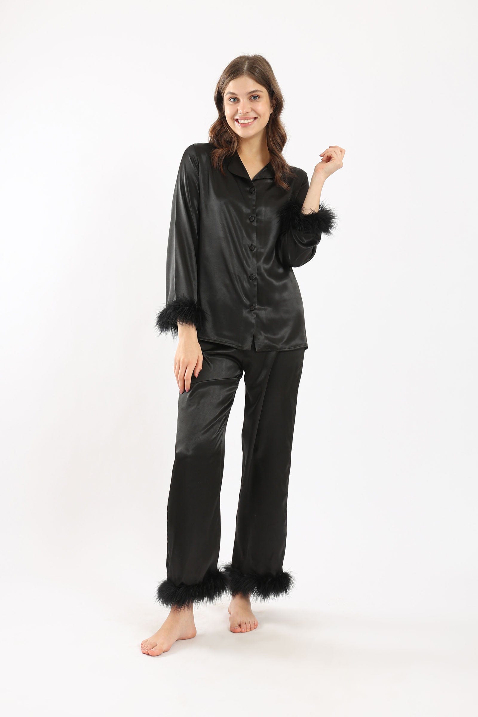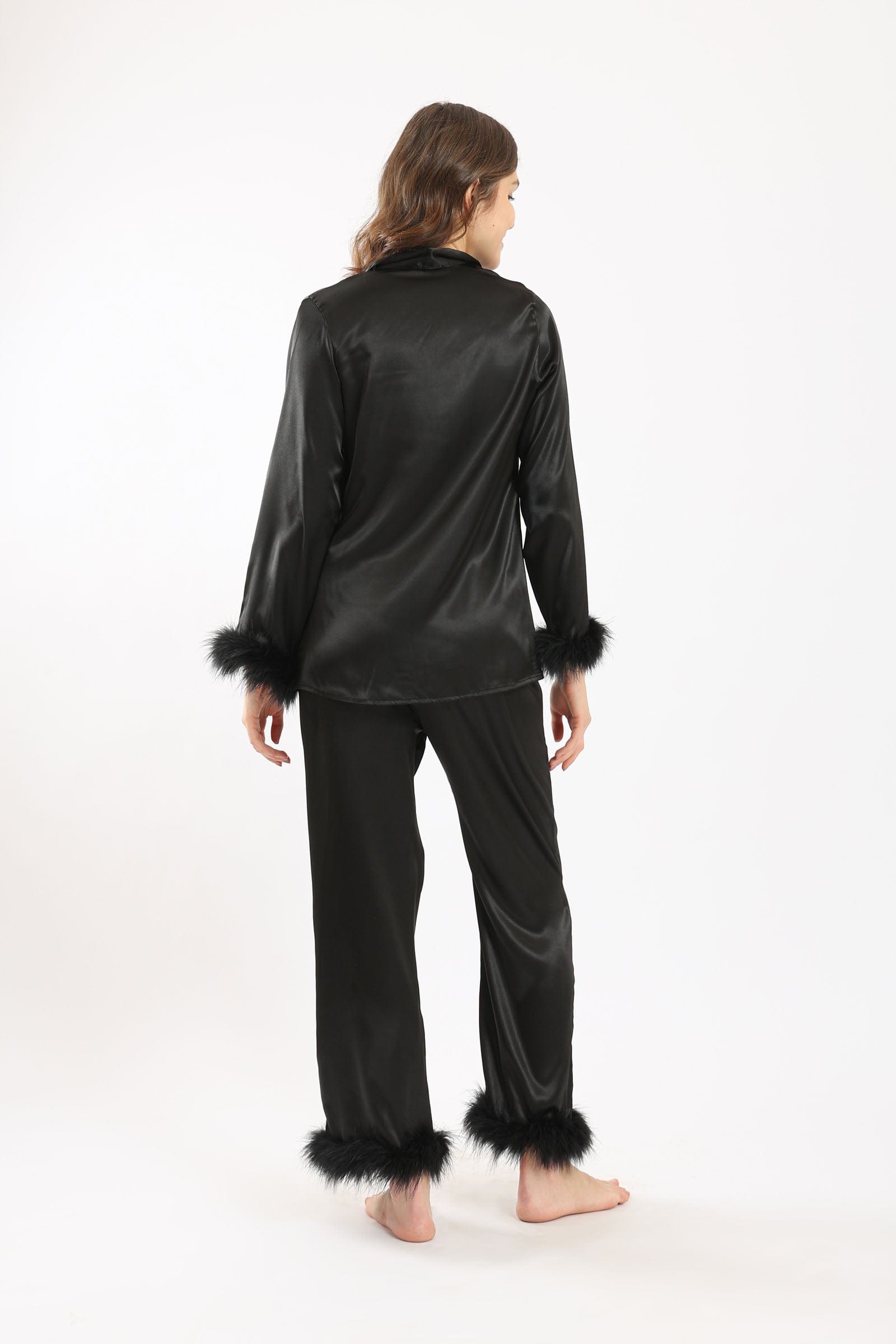طقم بيجامة بلوزة وبنطلون مزين بالريش