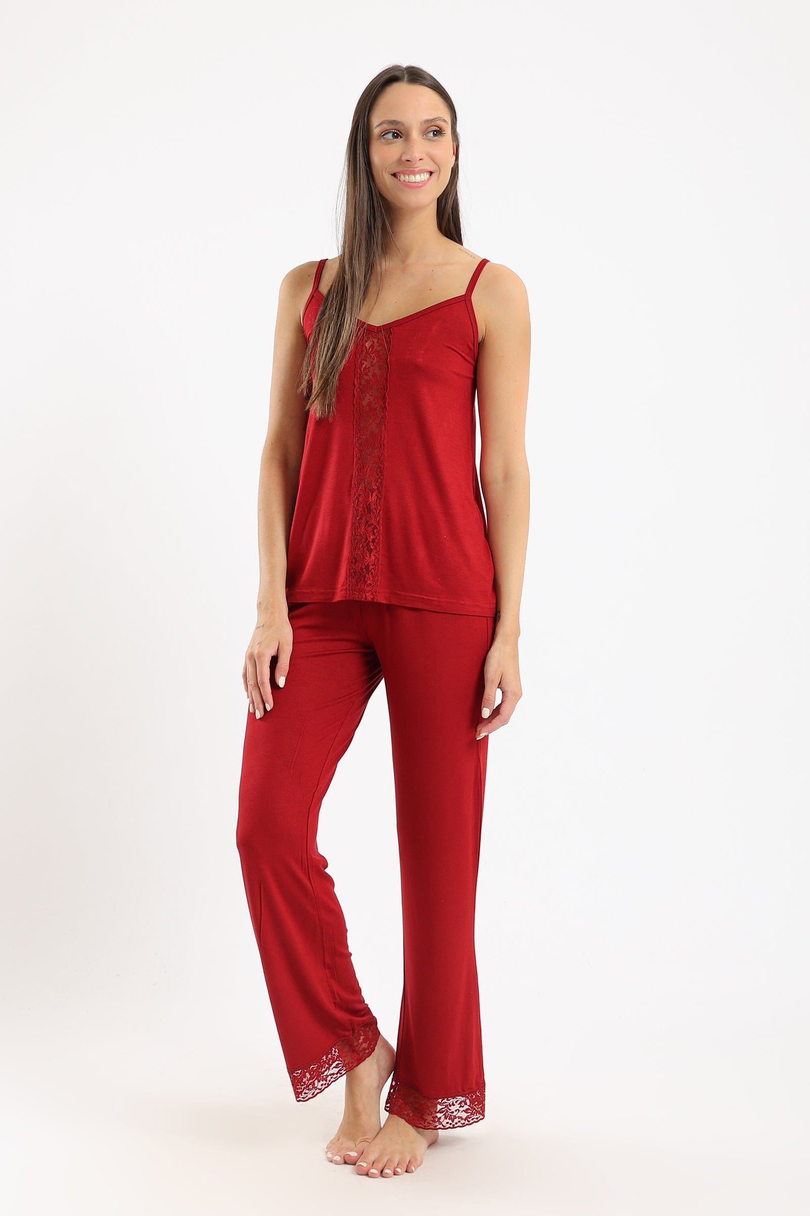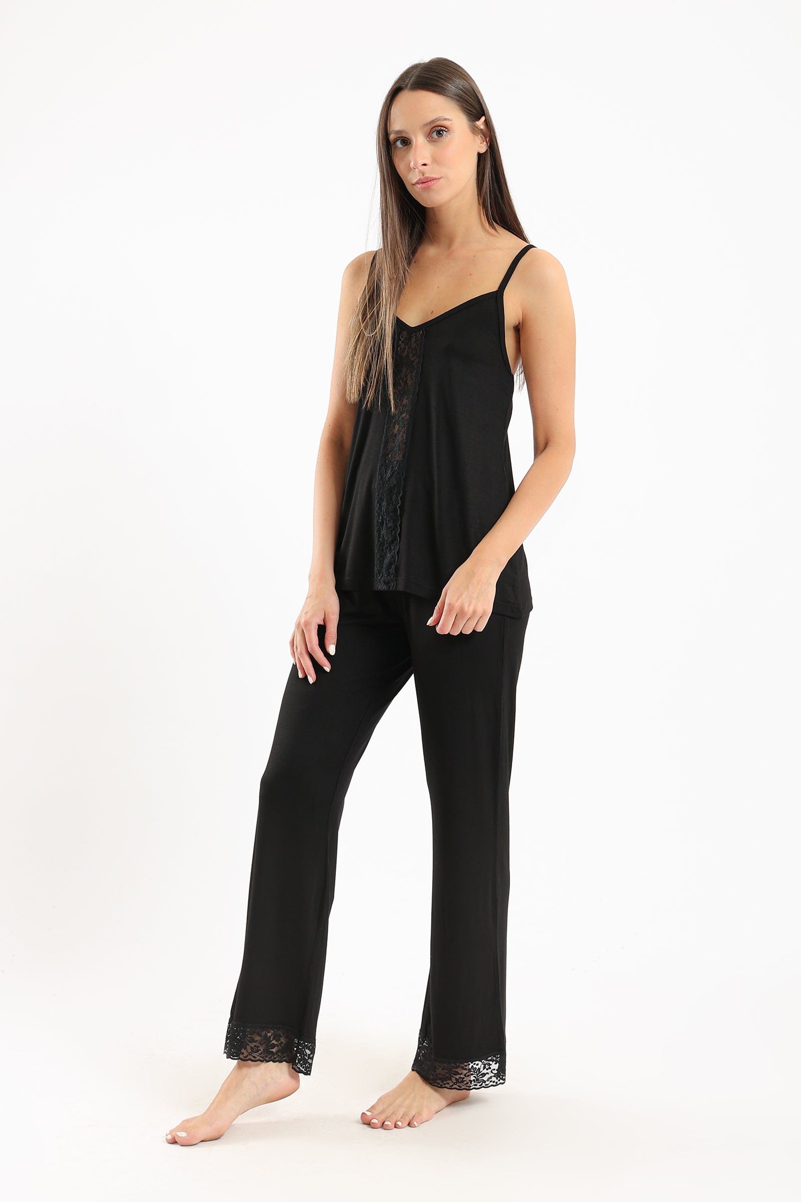 طقم بيجامة تيشيرت بدانتيل أمامي وبنطلون