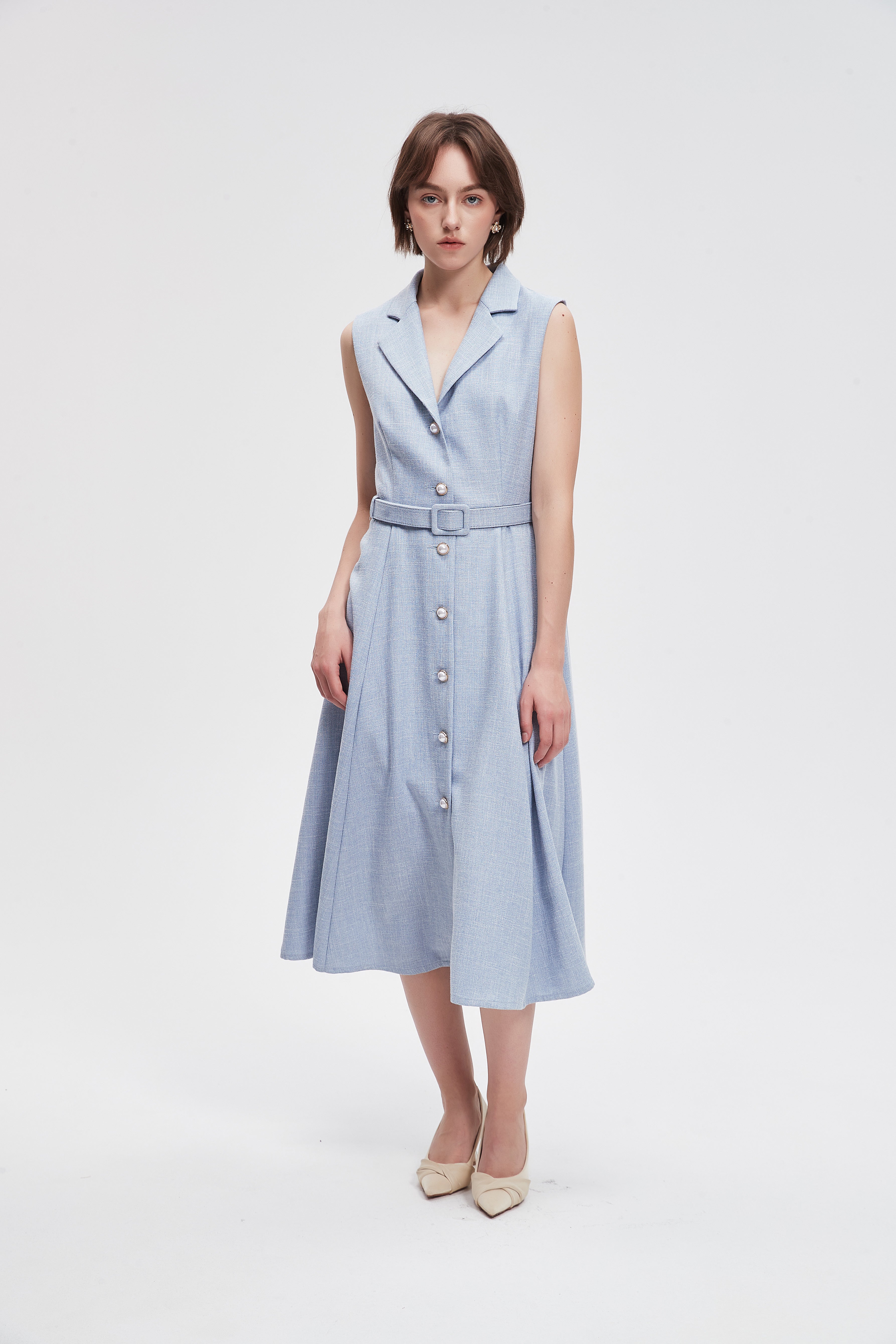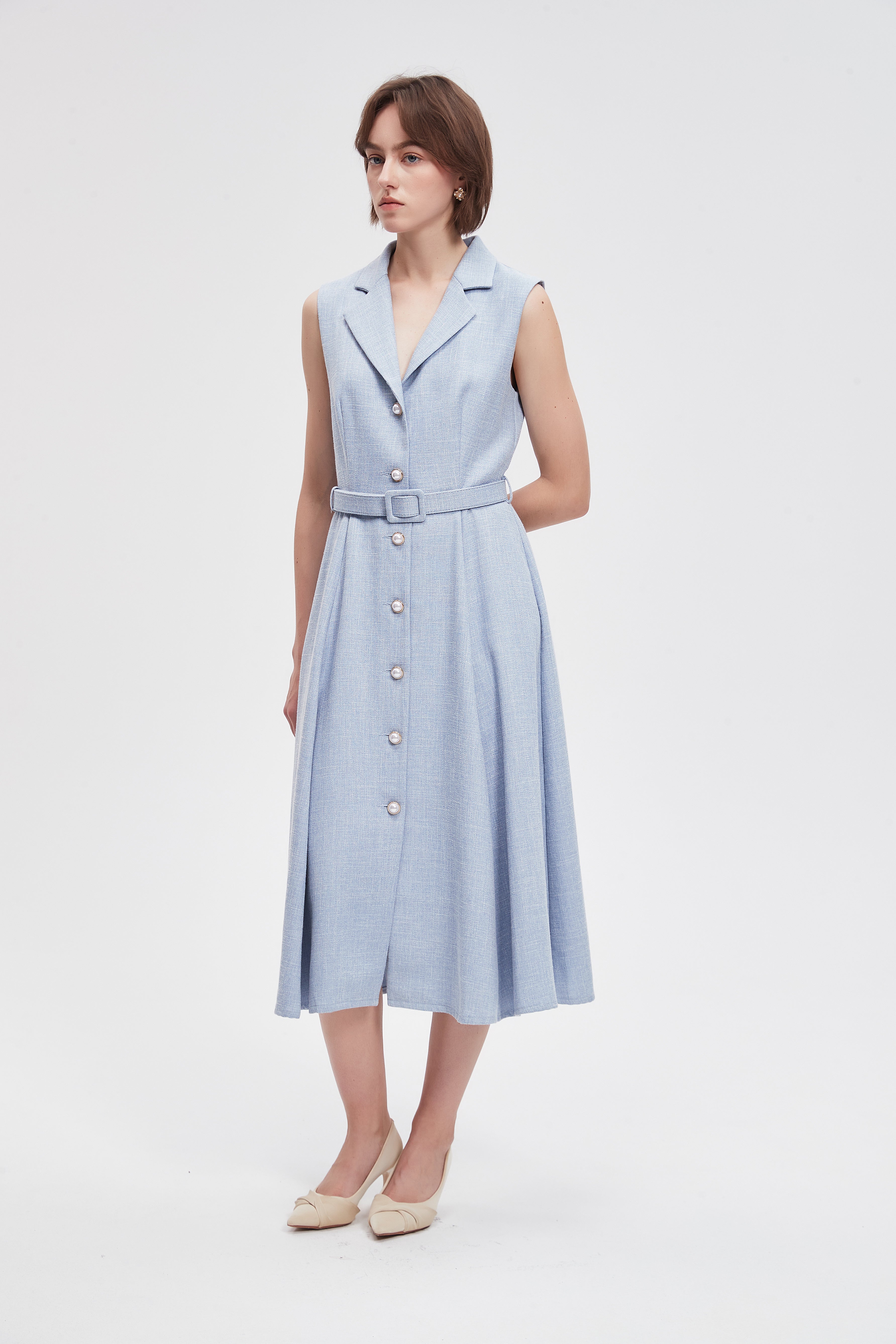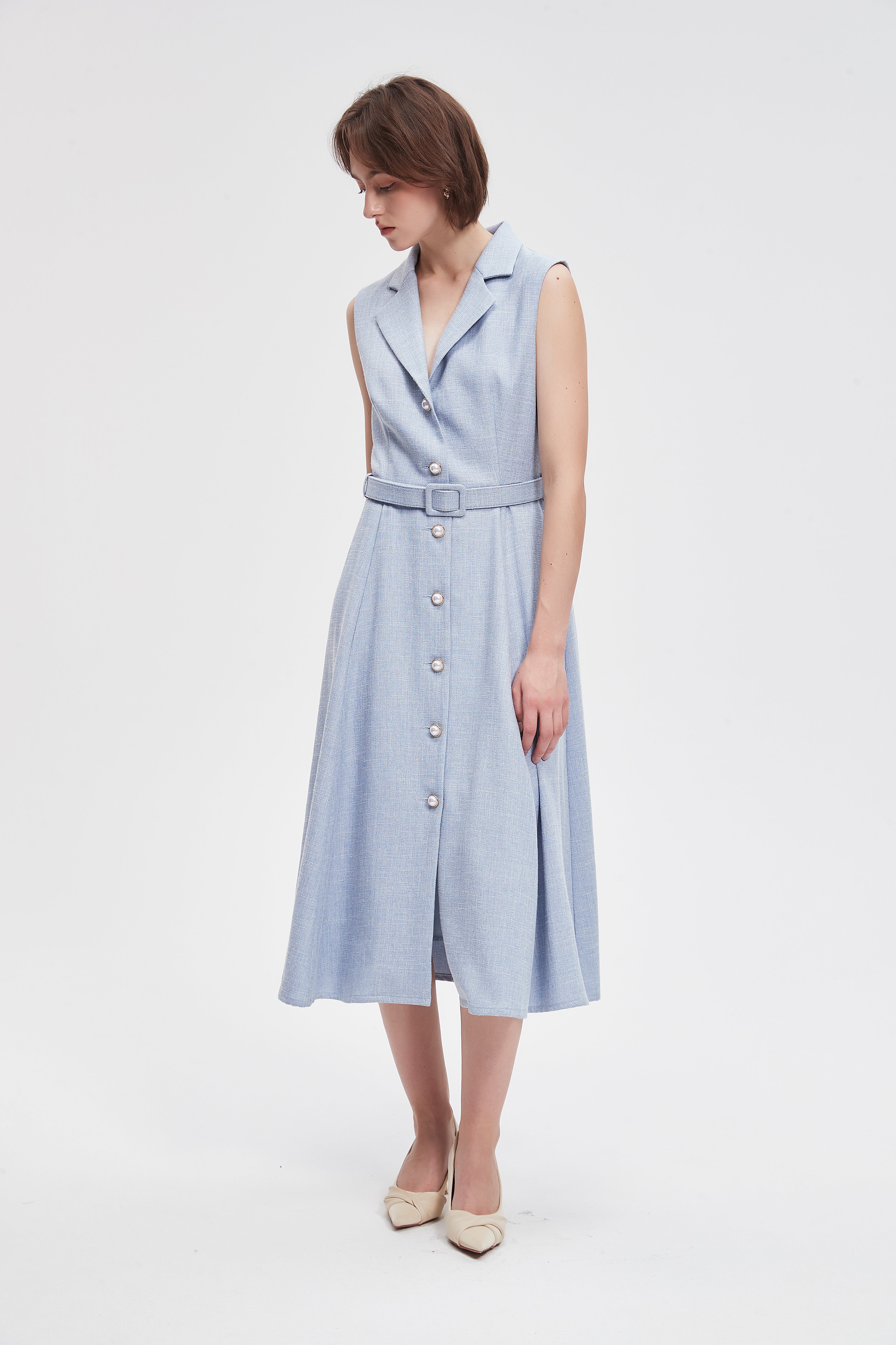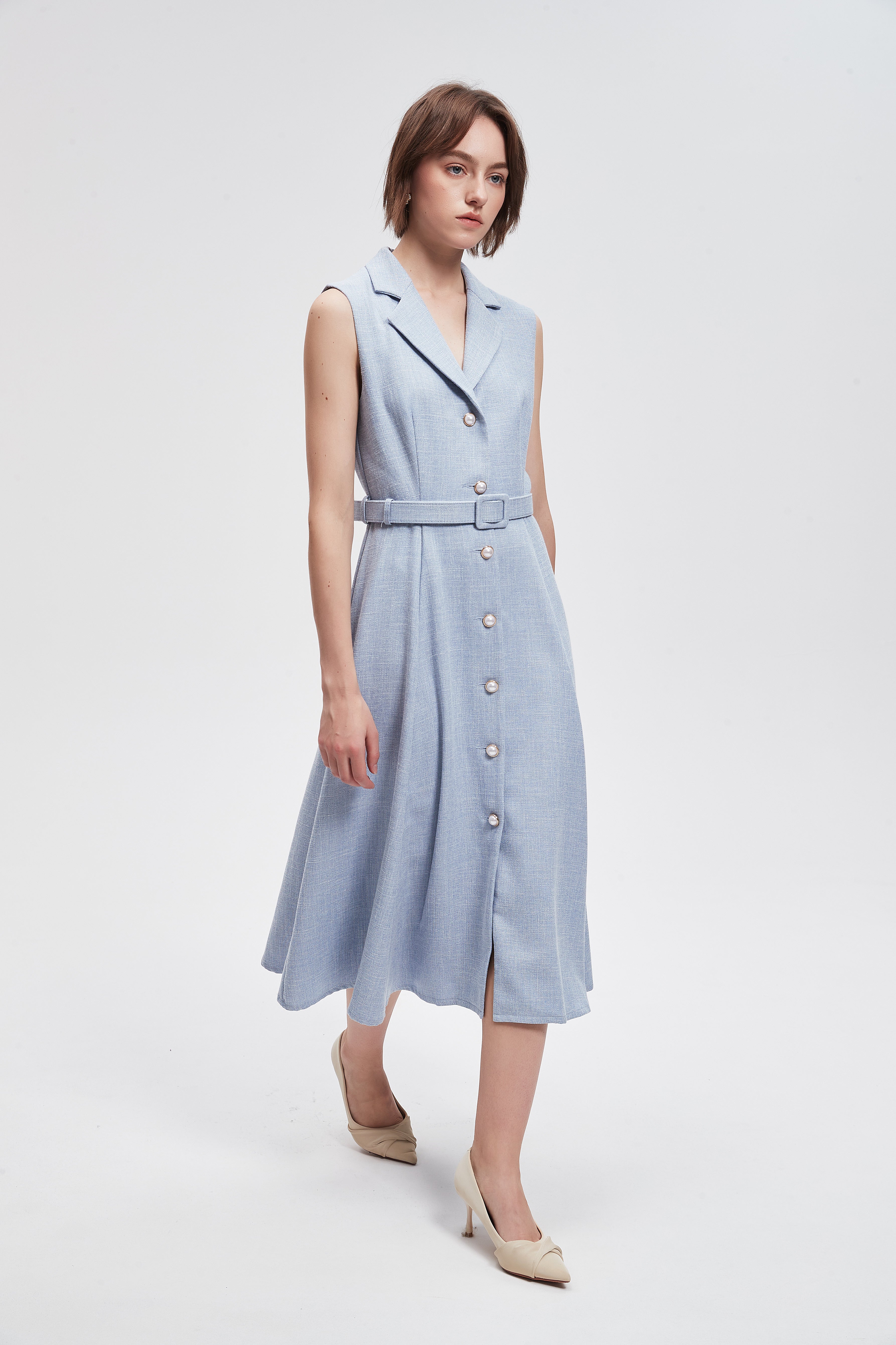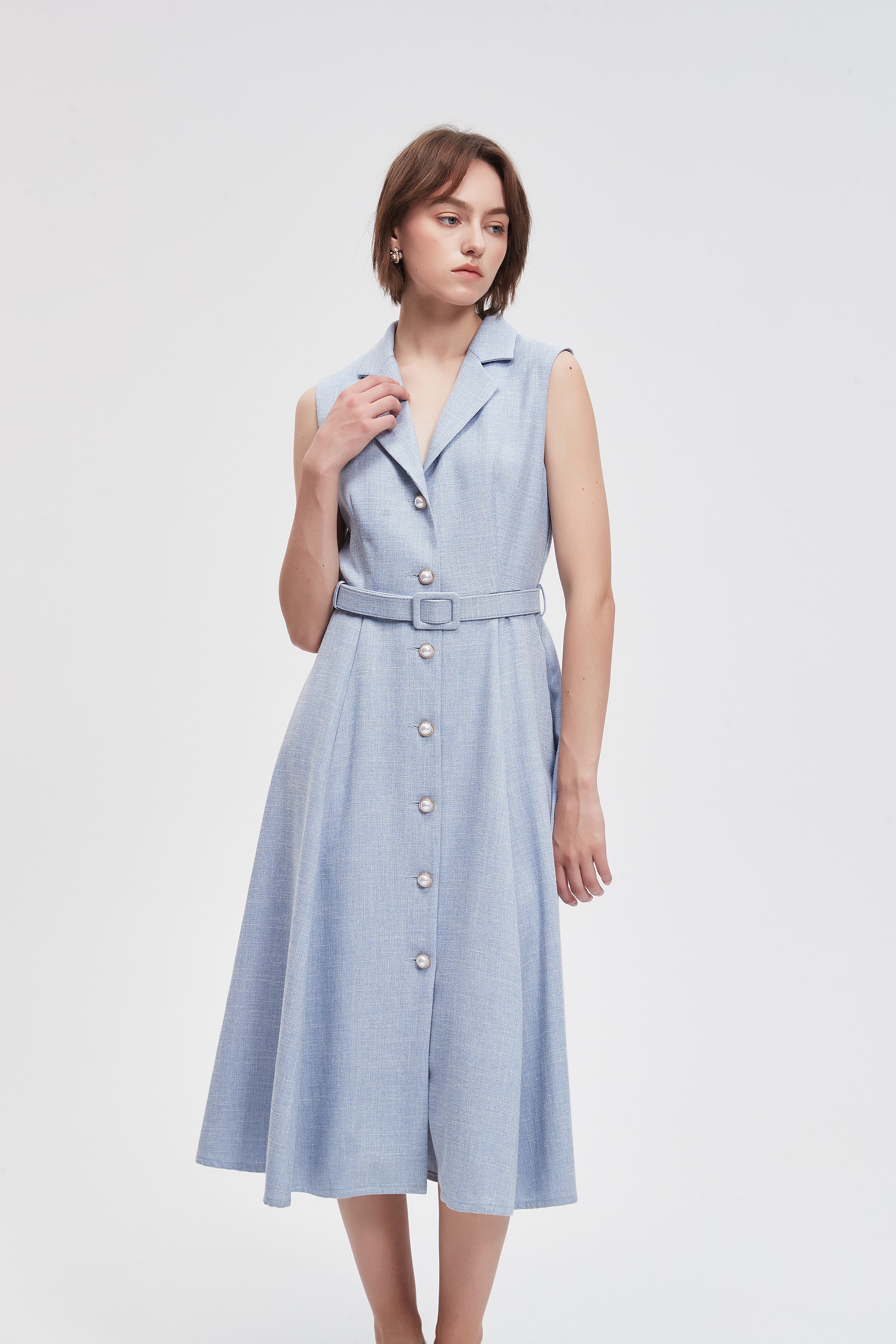 فستان ميدي سادة بحزام خصر وازرار امامية