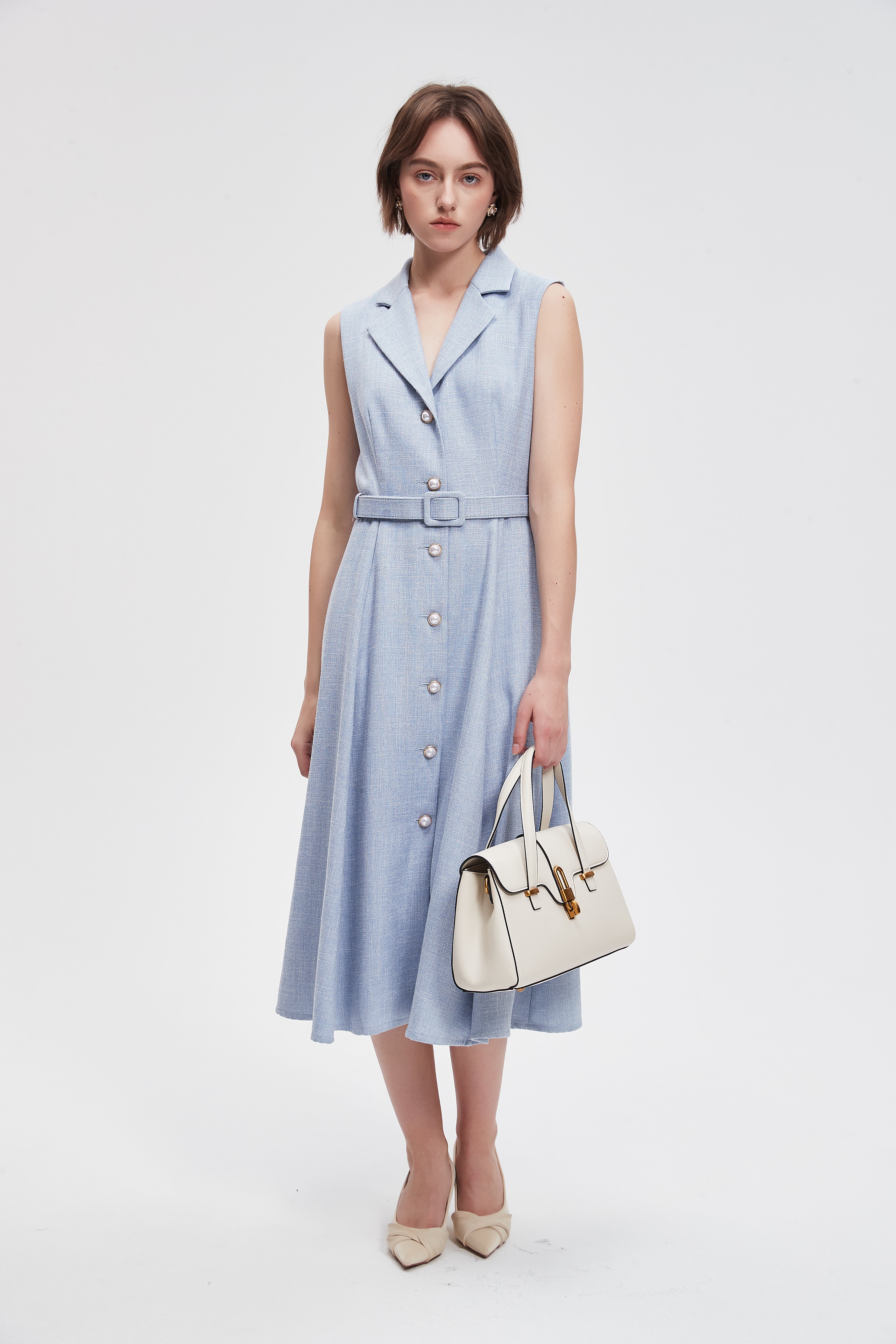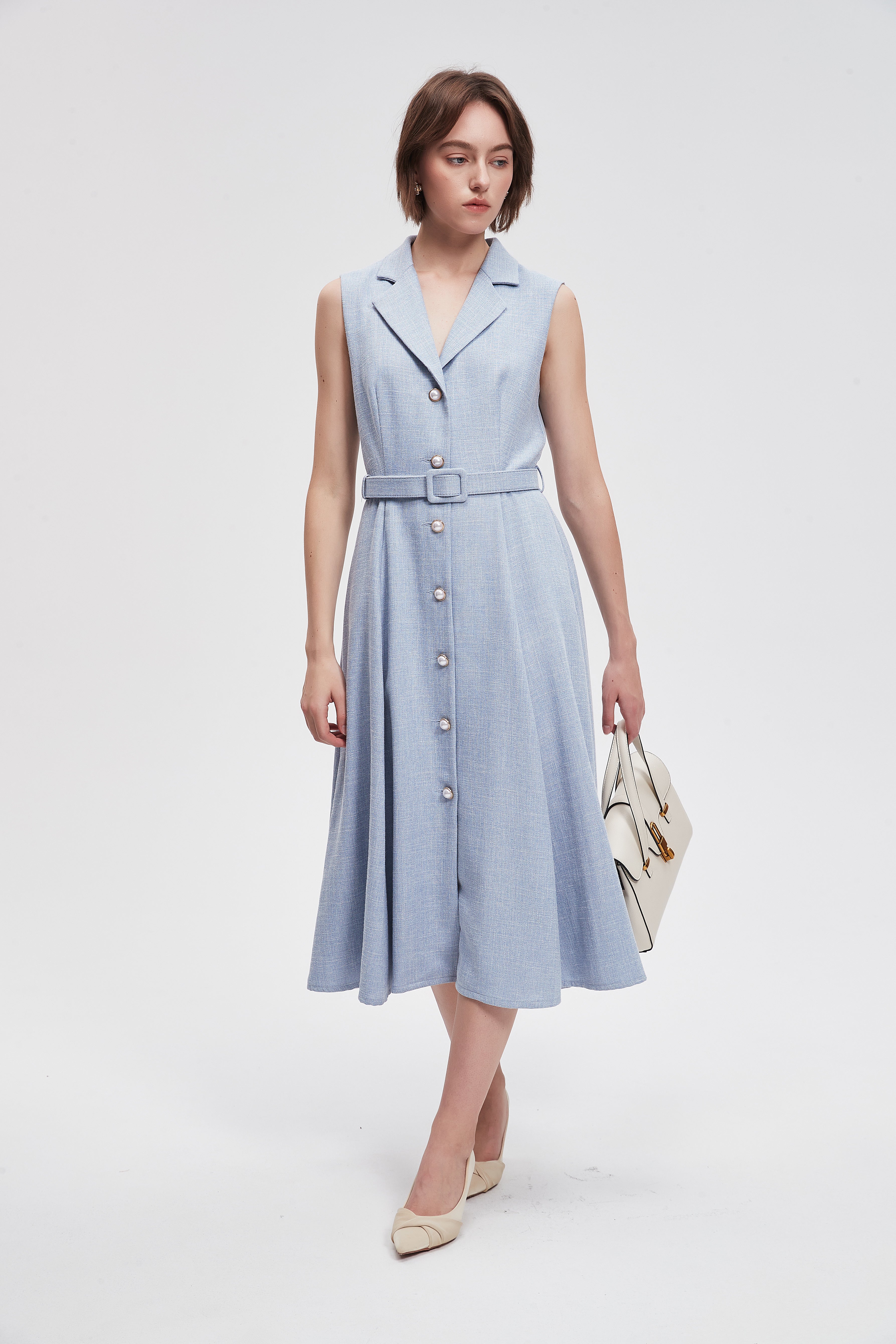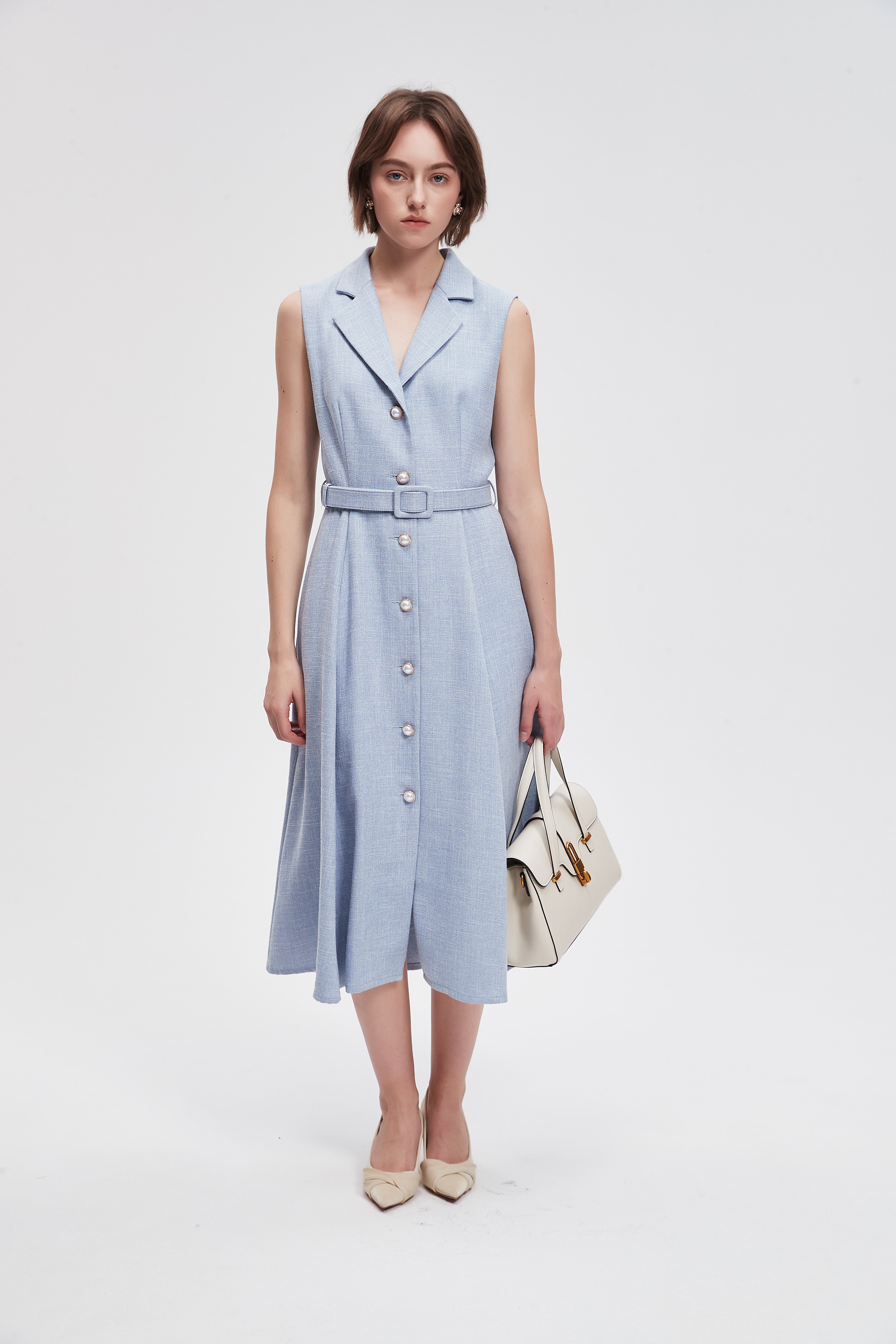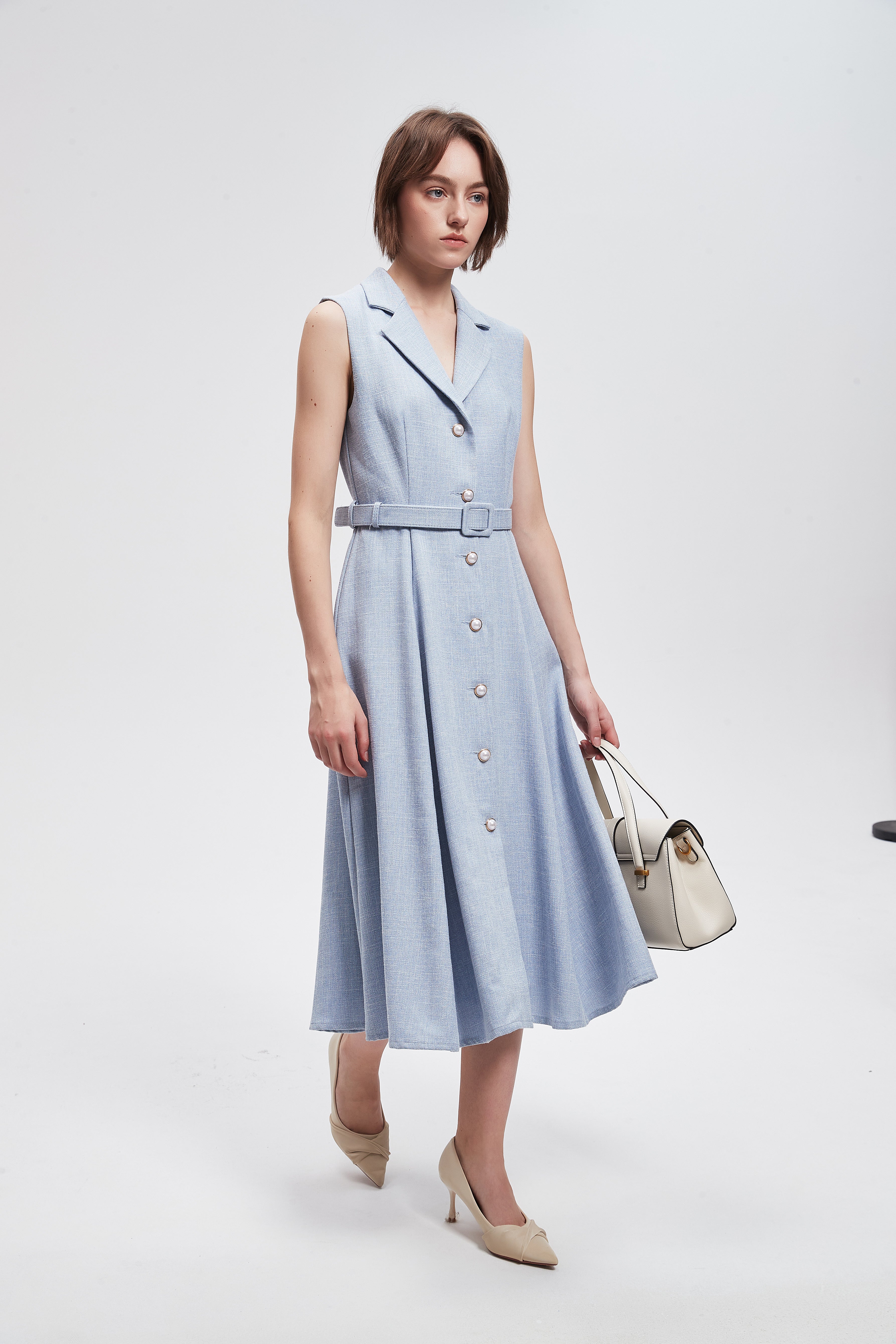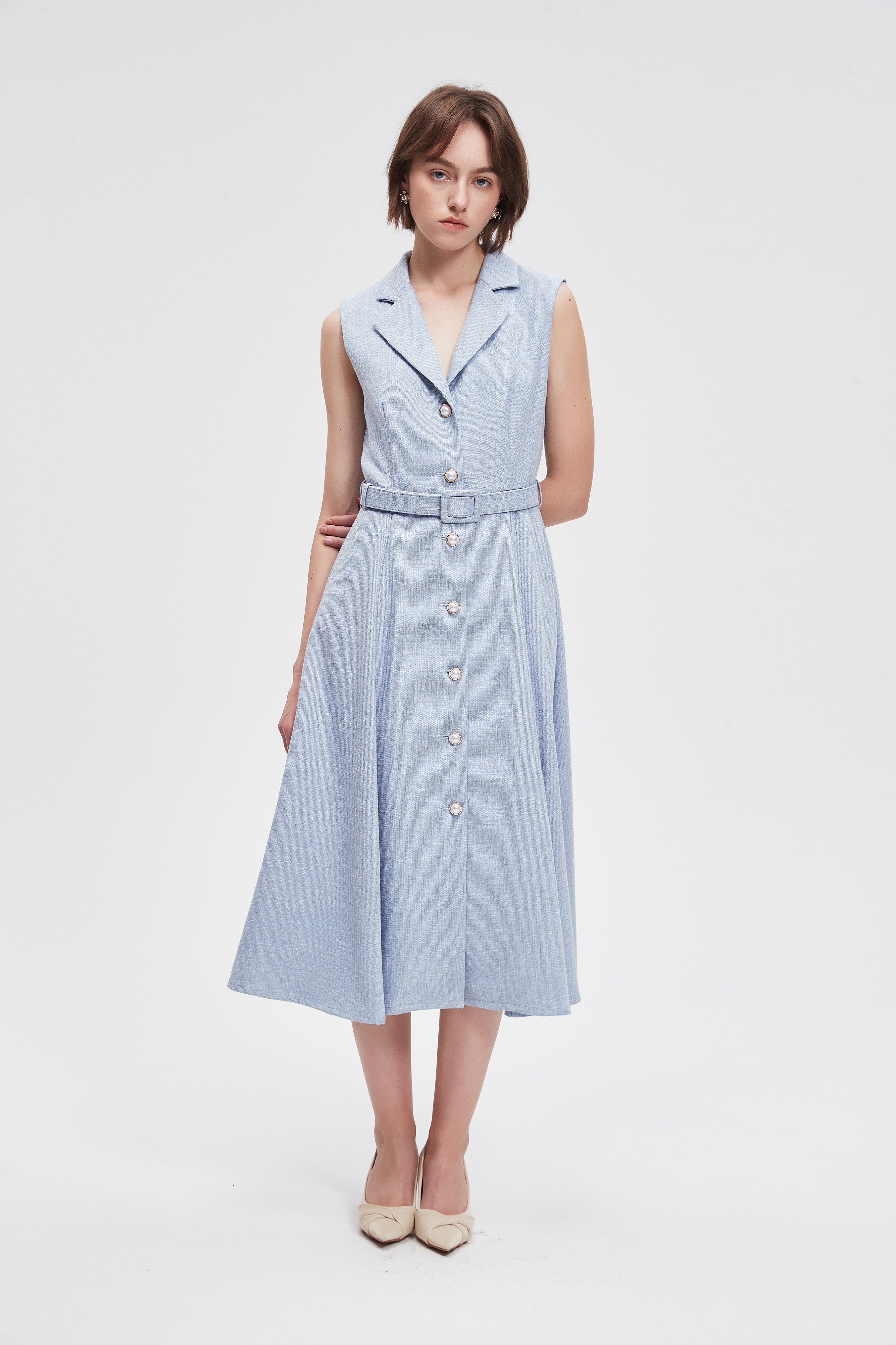 فستان ميدي سادة بحزام خصر وازرار امامية