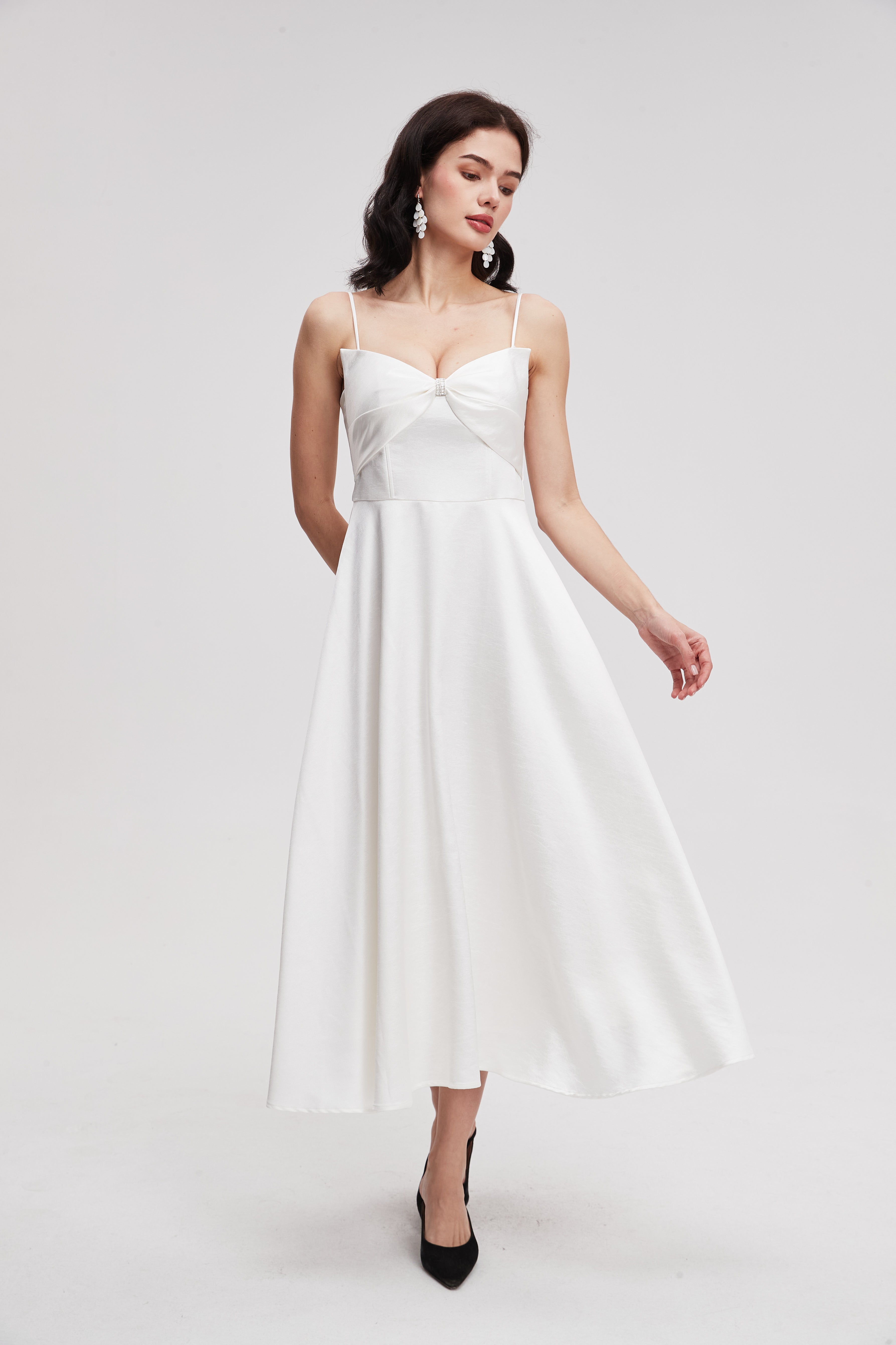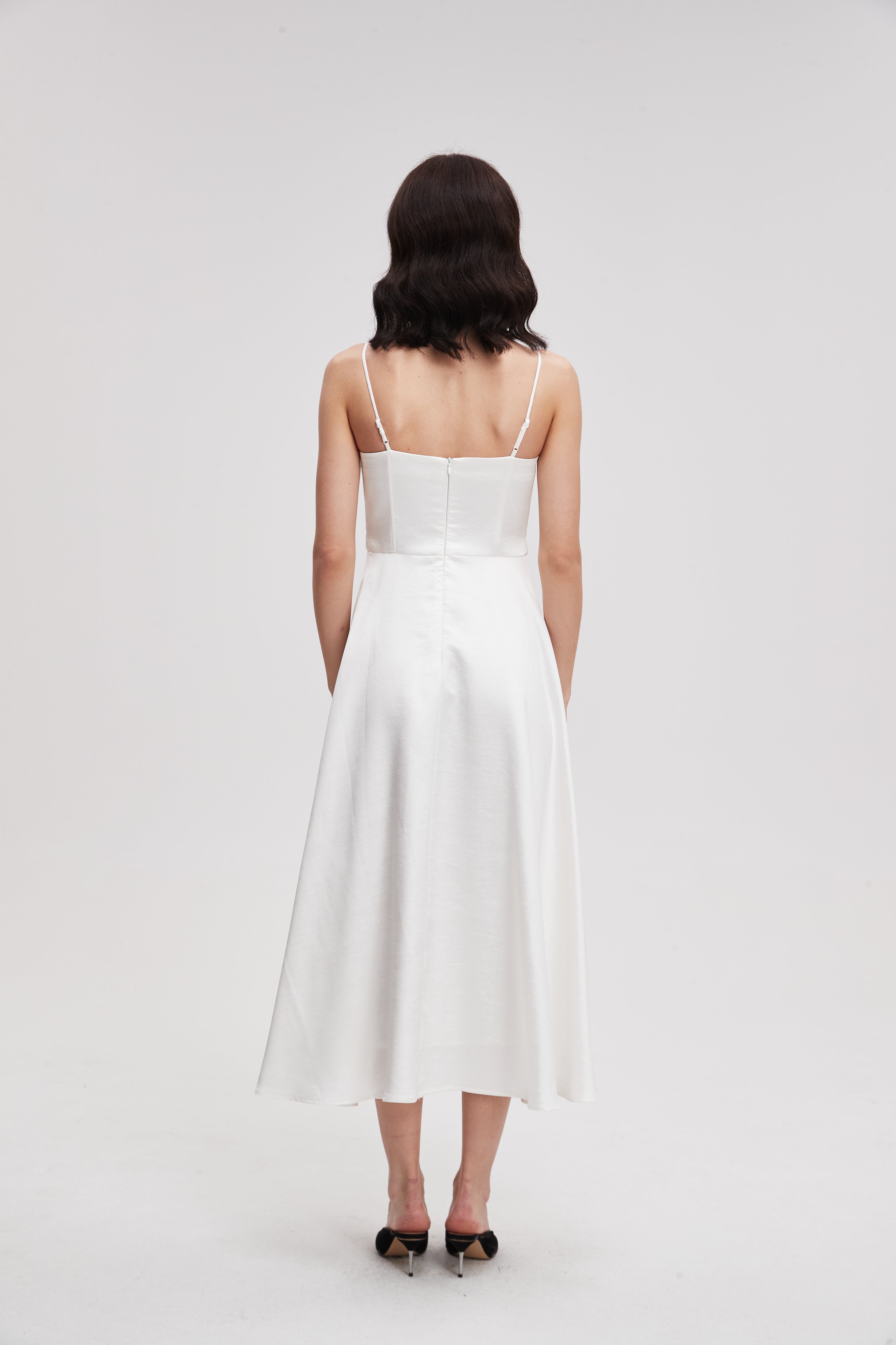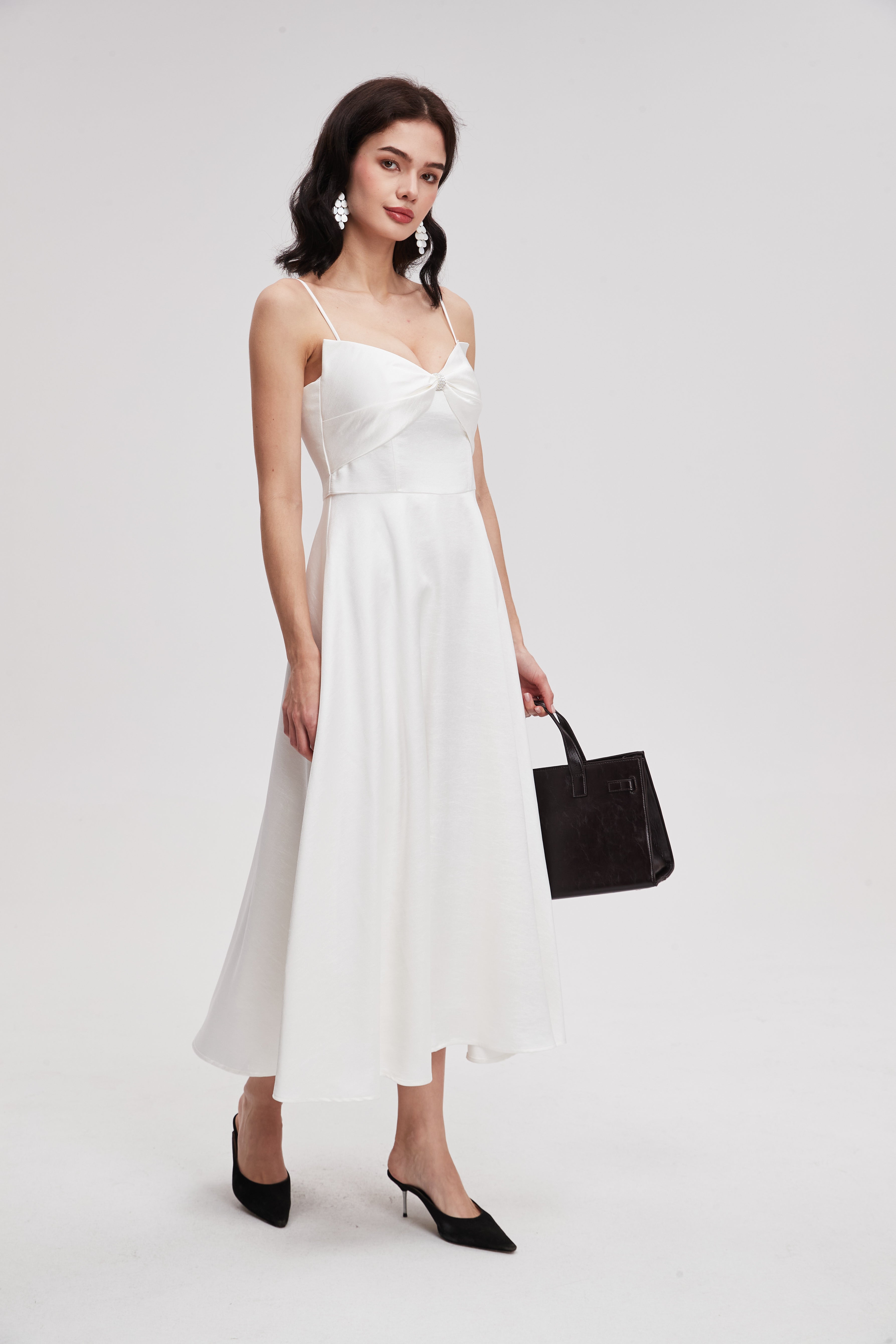 على الرغم من أن الخامة غير محددة، فإن فستاناً بهذا التصميم غالباً ما يُصنع من أقمشة خفيفة ومنسدلة مثل القطن أو الفيسكوز. هذا يوفر شعوراً بالبرودة والتهوية، خاصة مع اللون الأبيض الذي يعكس أشعة الشمس. ينساب القماش الناعم على الجسم، مما يضمن أقصى درجات الراحة والأناقة. إنه استثمار في قطعة عملية تمنحك إحساساً بالانتعاش والجاذبية في الأيام الدافئة.