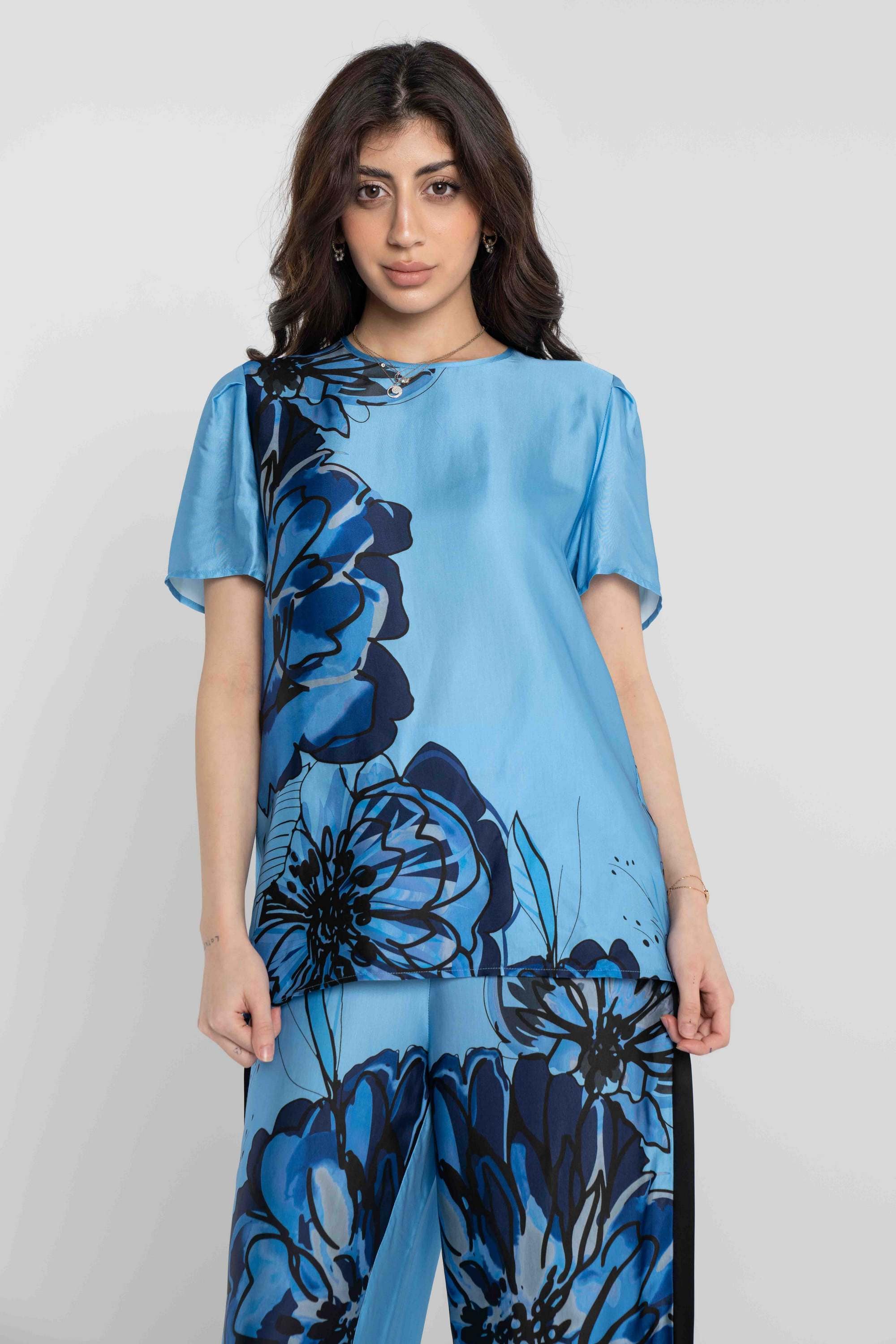 بلوزة نص كم موردة كم قصير برقبة دائرية نسائي