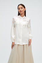 بلوزة طويلة بأكمام طويلة منقوشة عالأكتاف