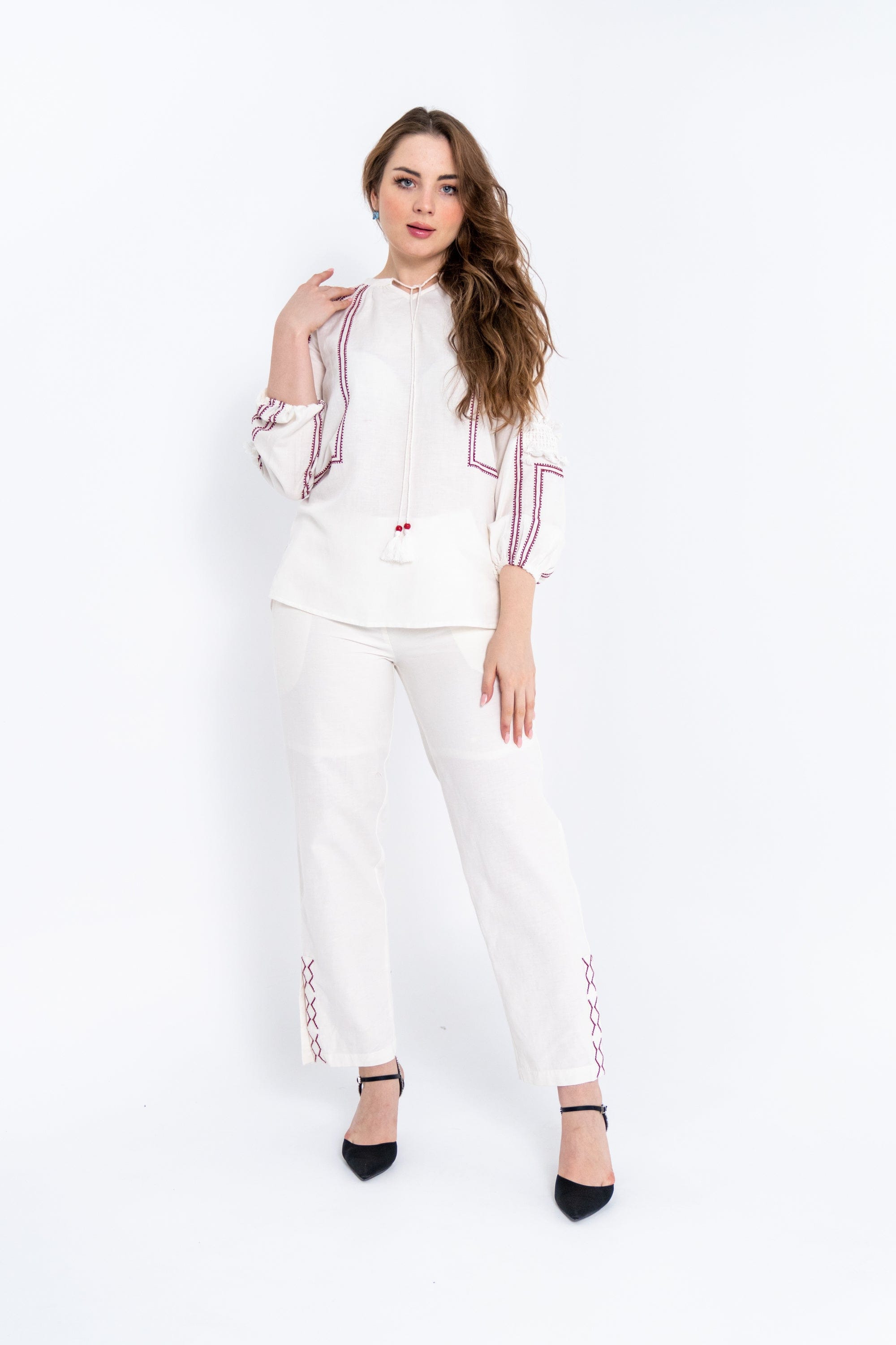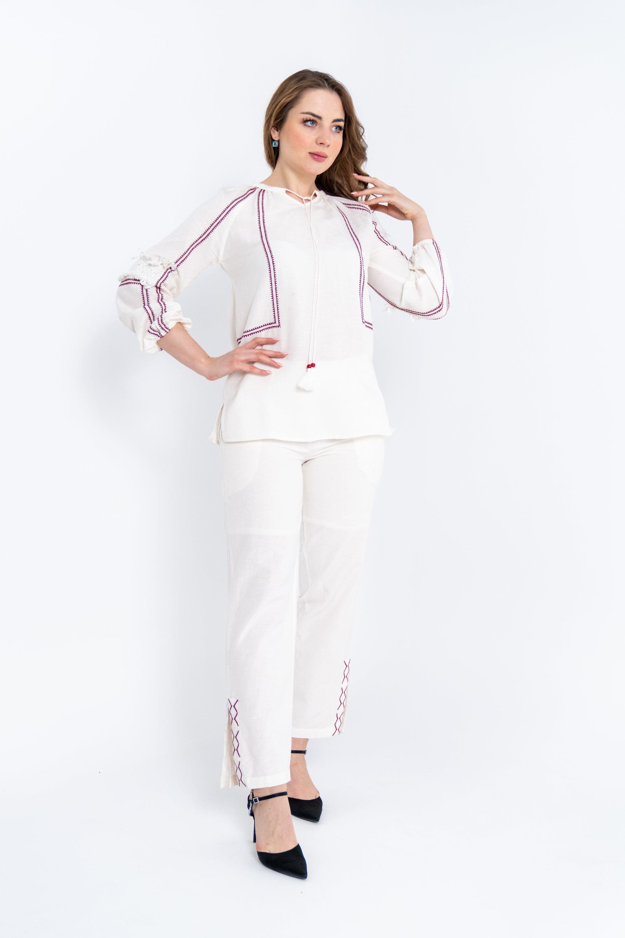 بنطلون نسائي سادة مزين بتطريز من الأسفل