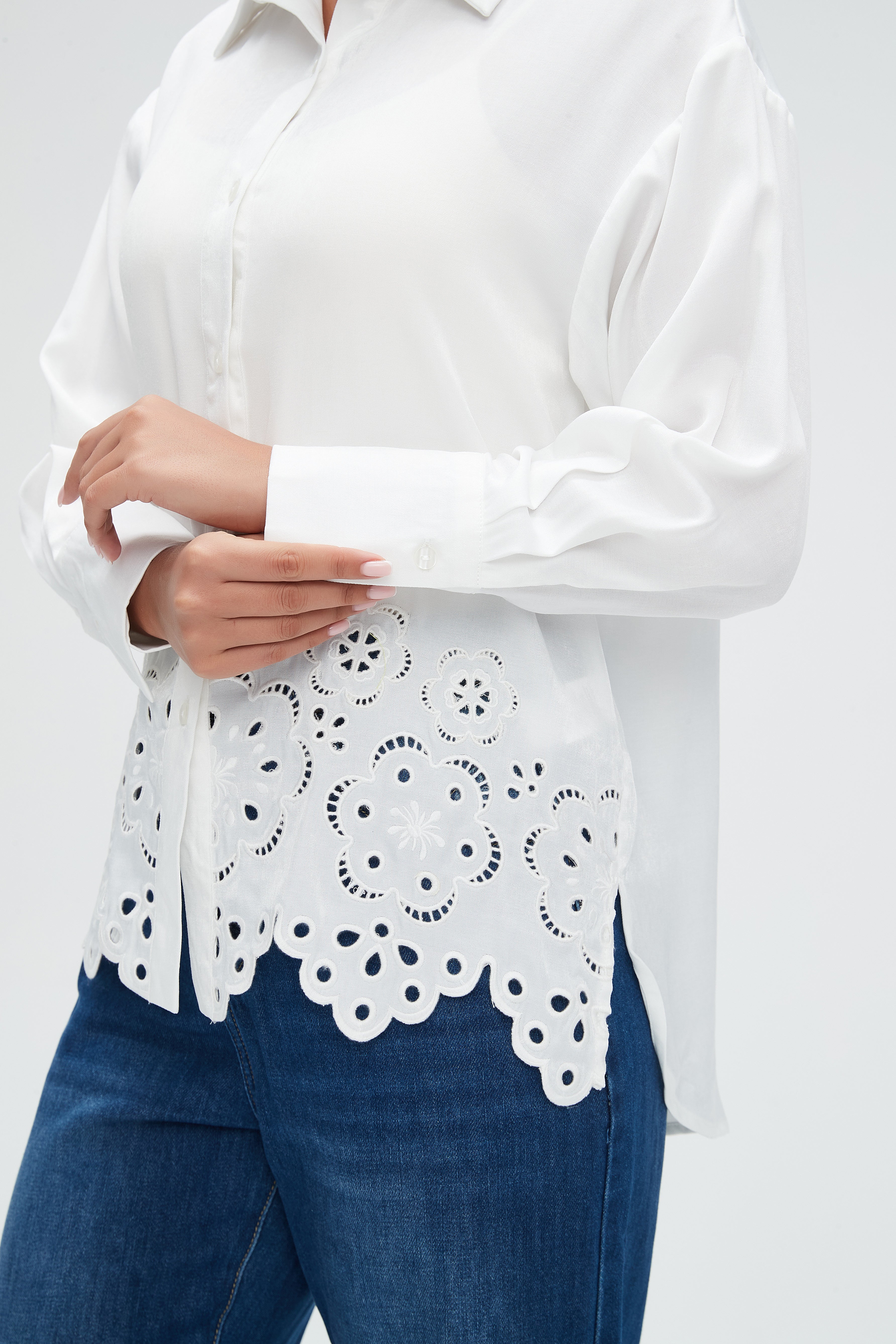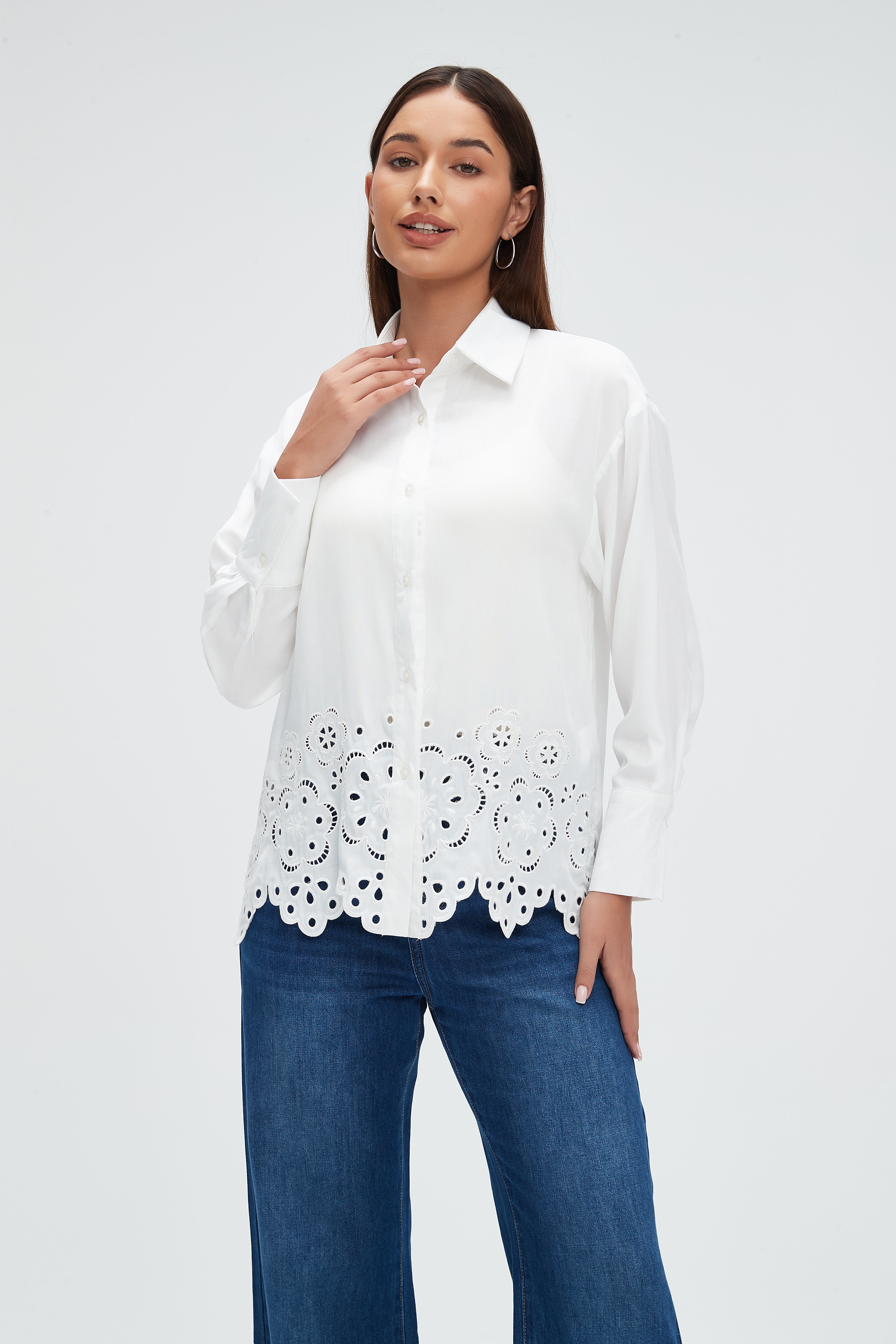 بلوزة طويلة كم طويل مزخرفة من الأسفل بنقشة ورد