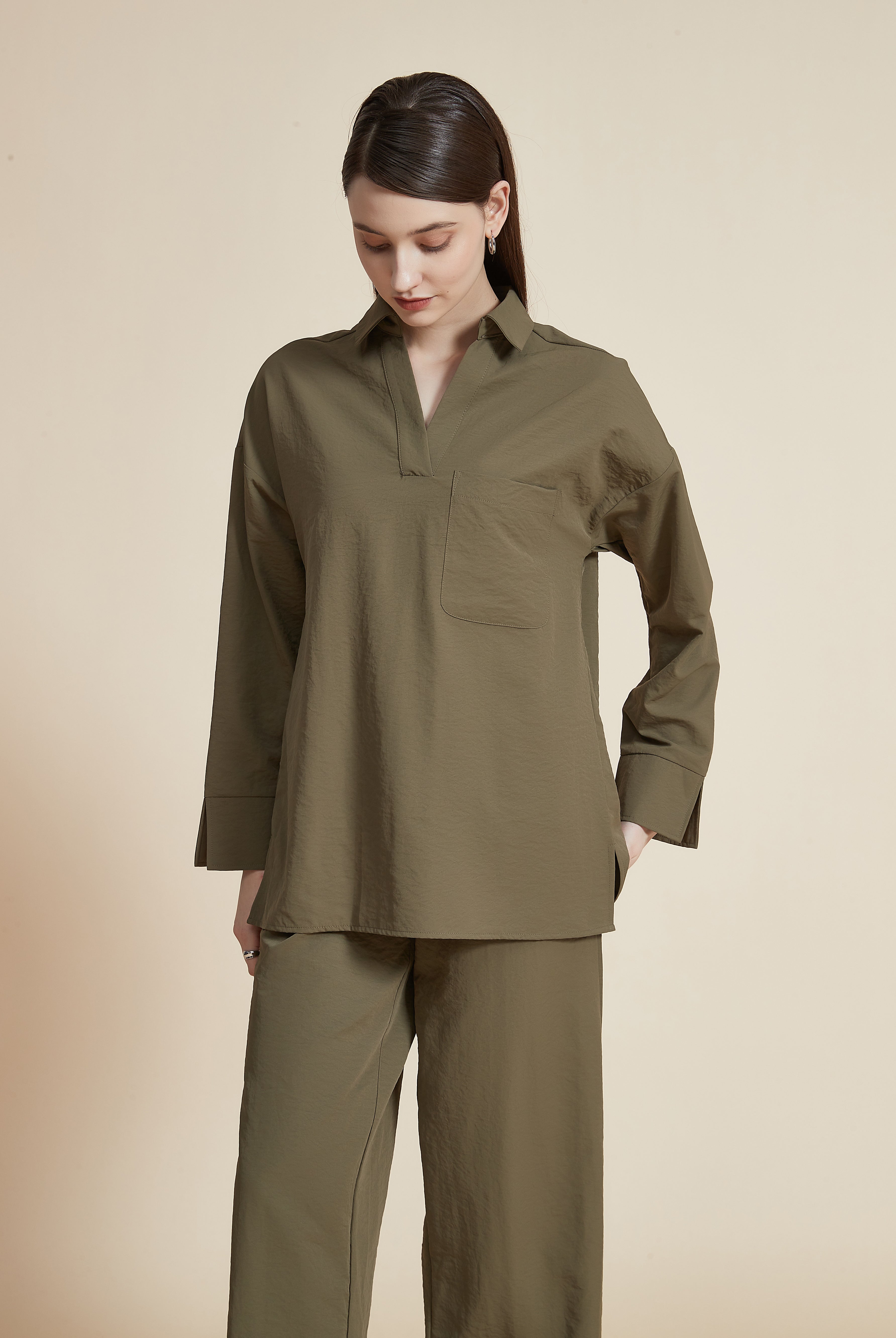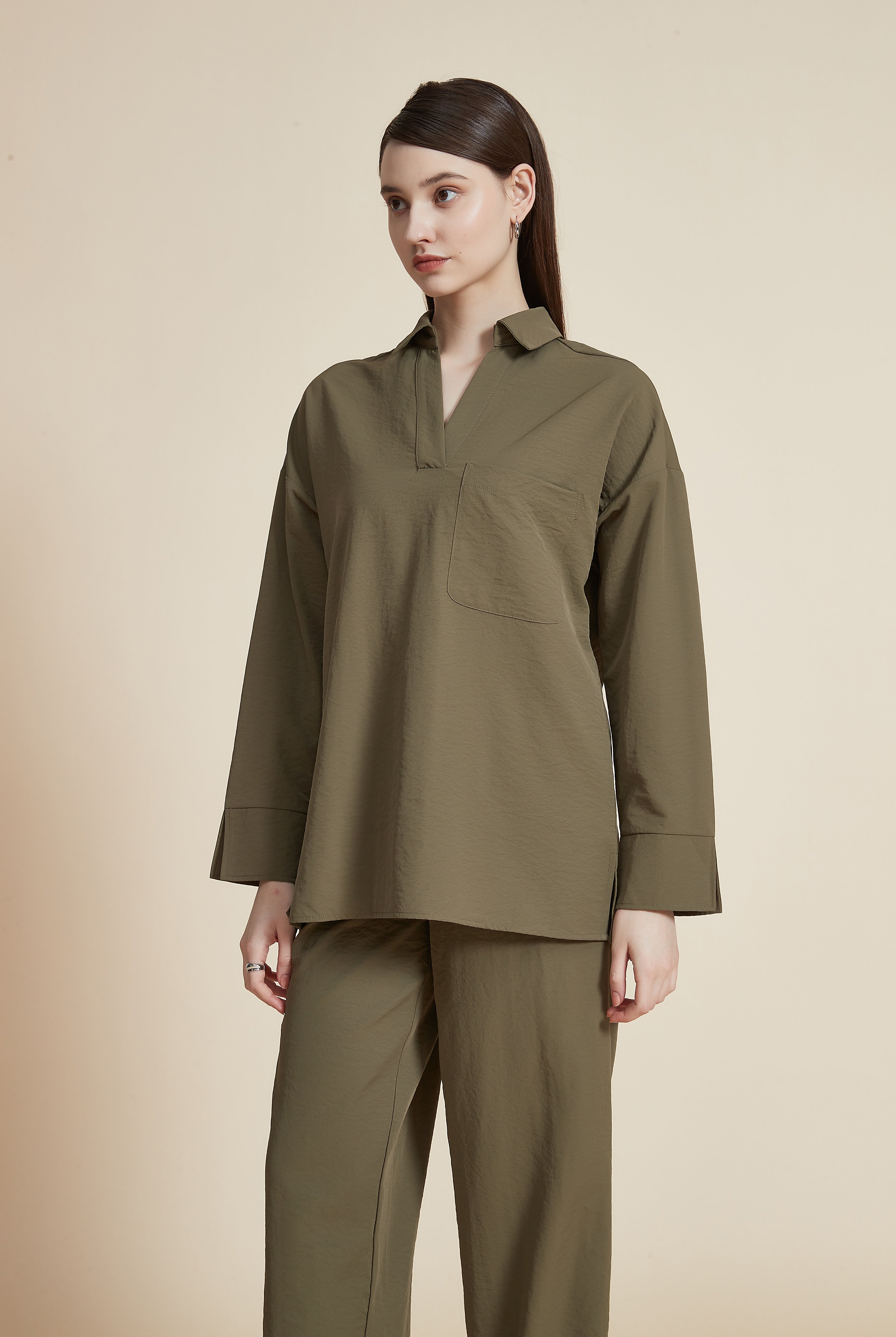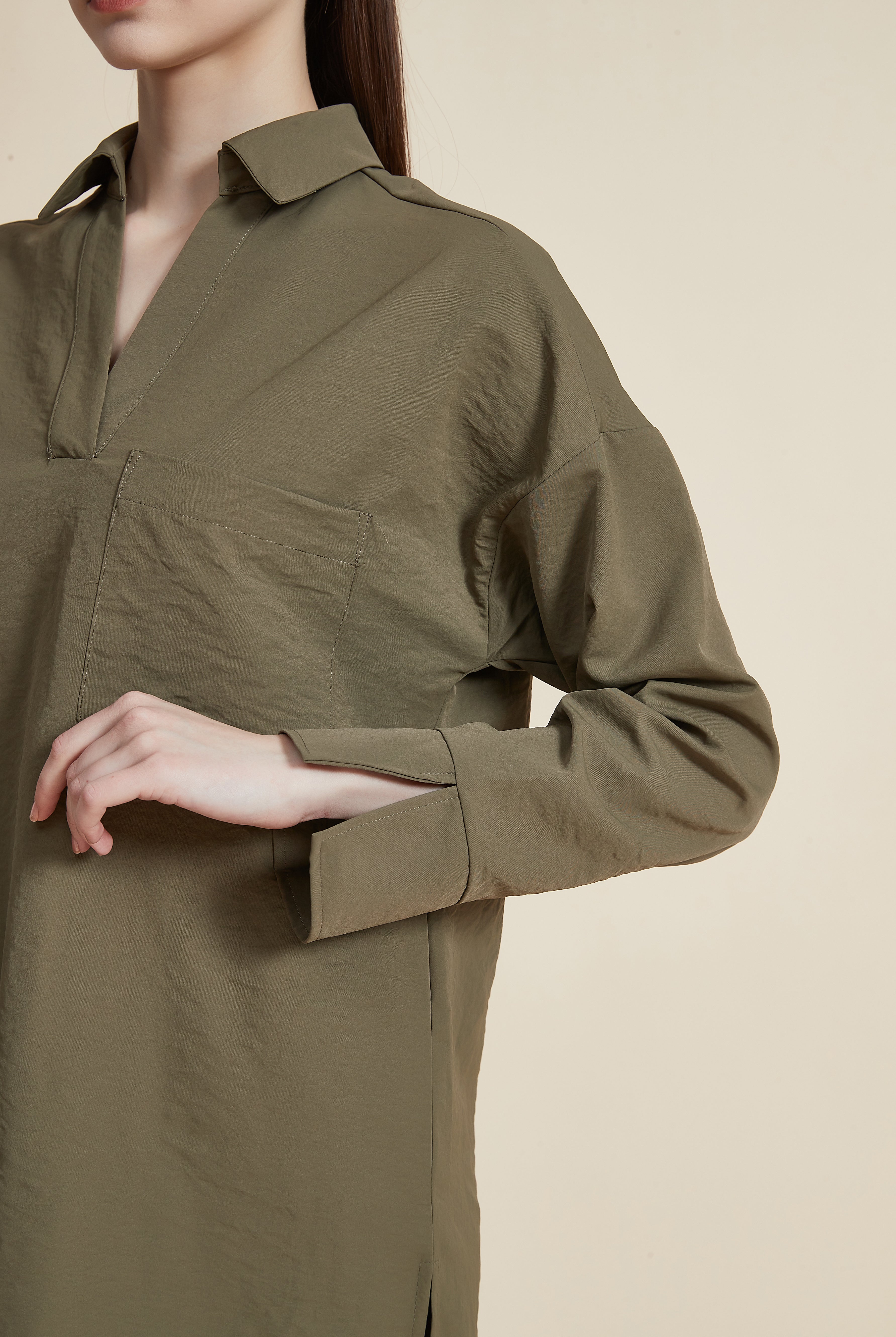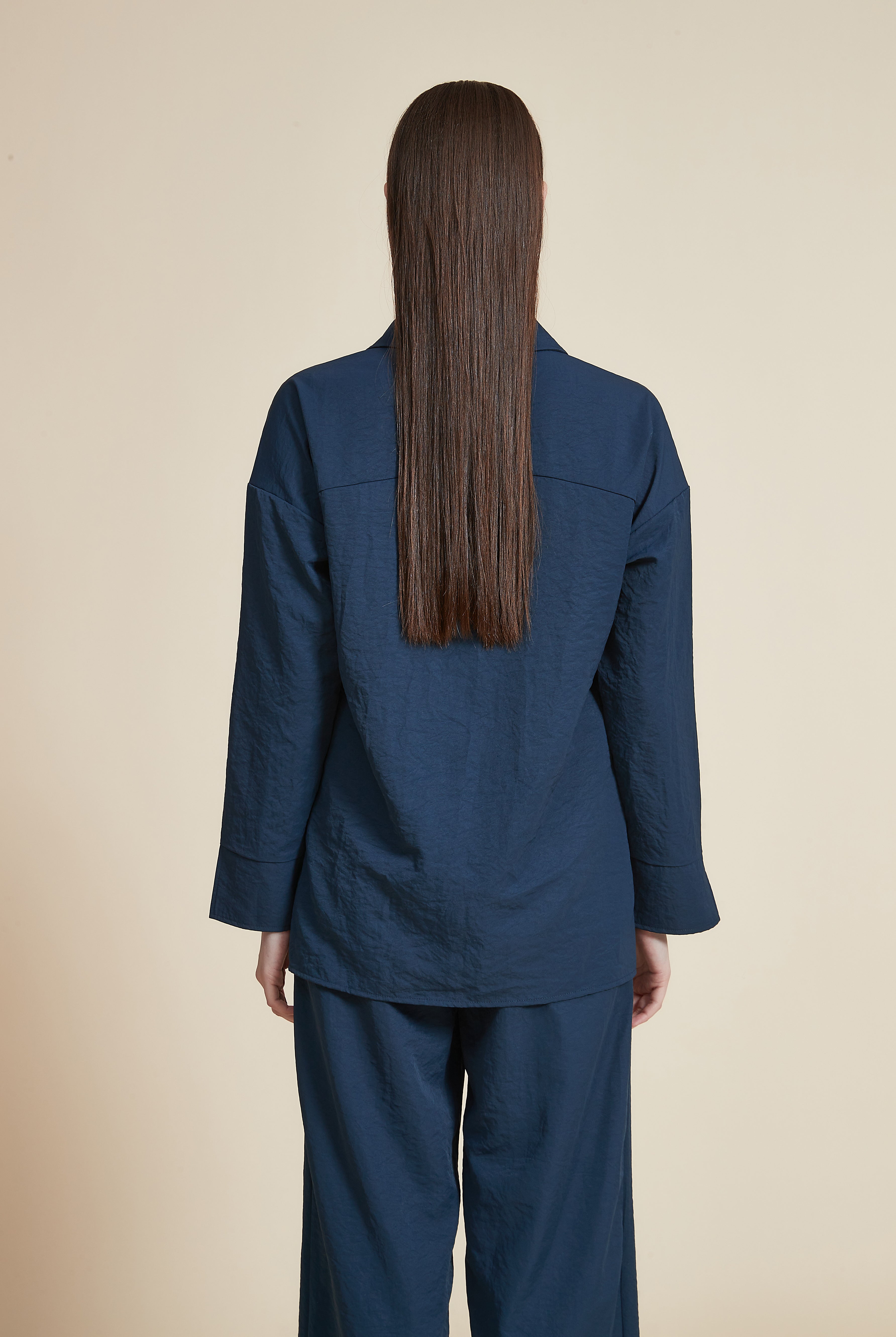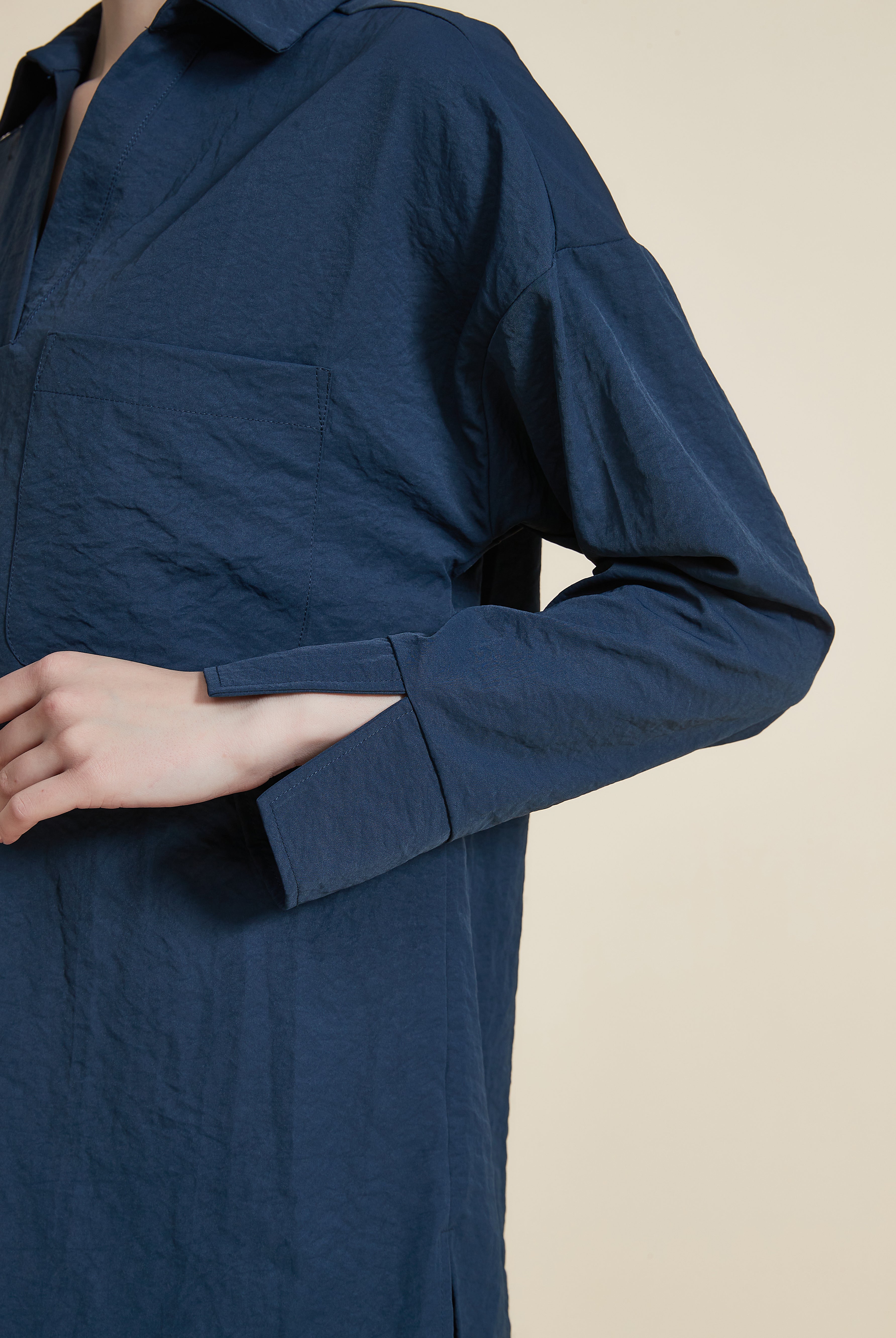 بلوزة بطول الخصر كم طويل بجيب وياقة قميص