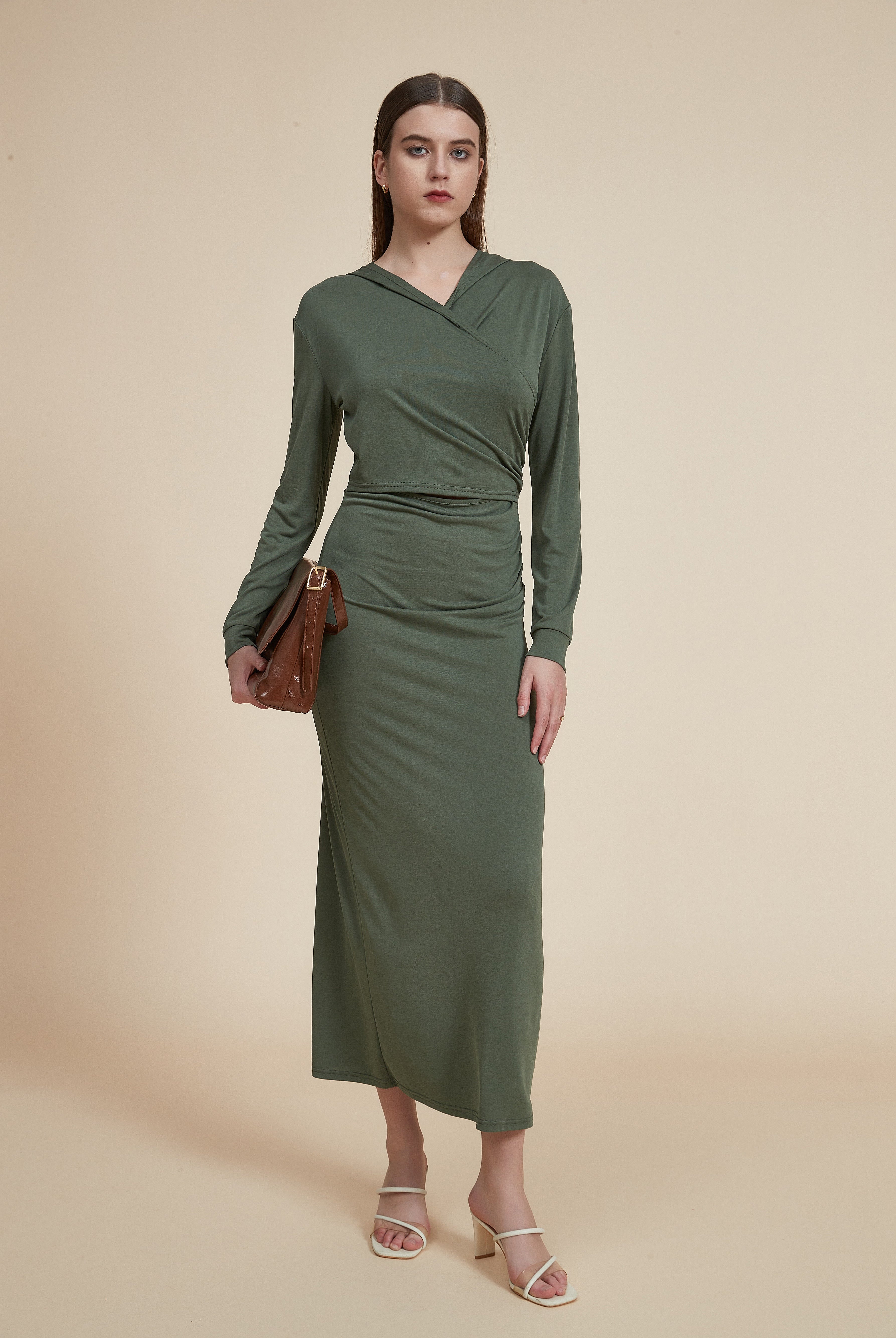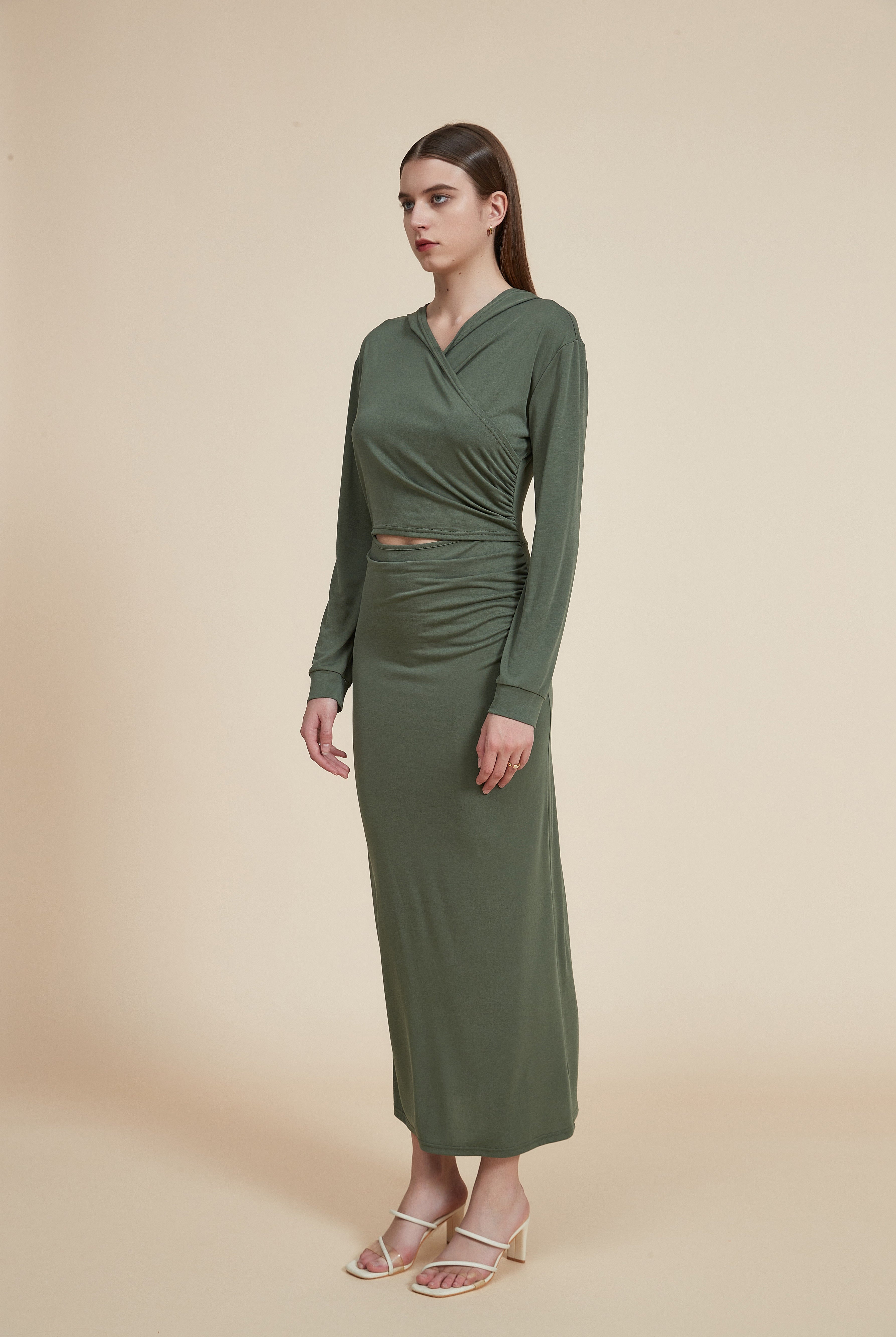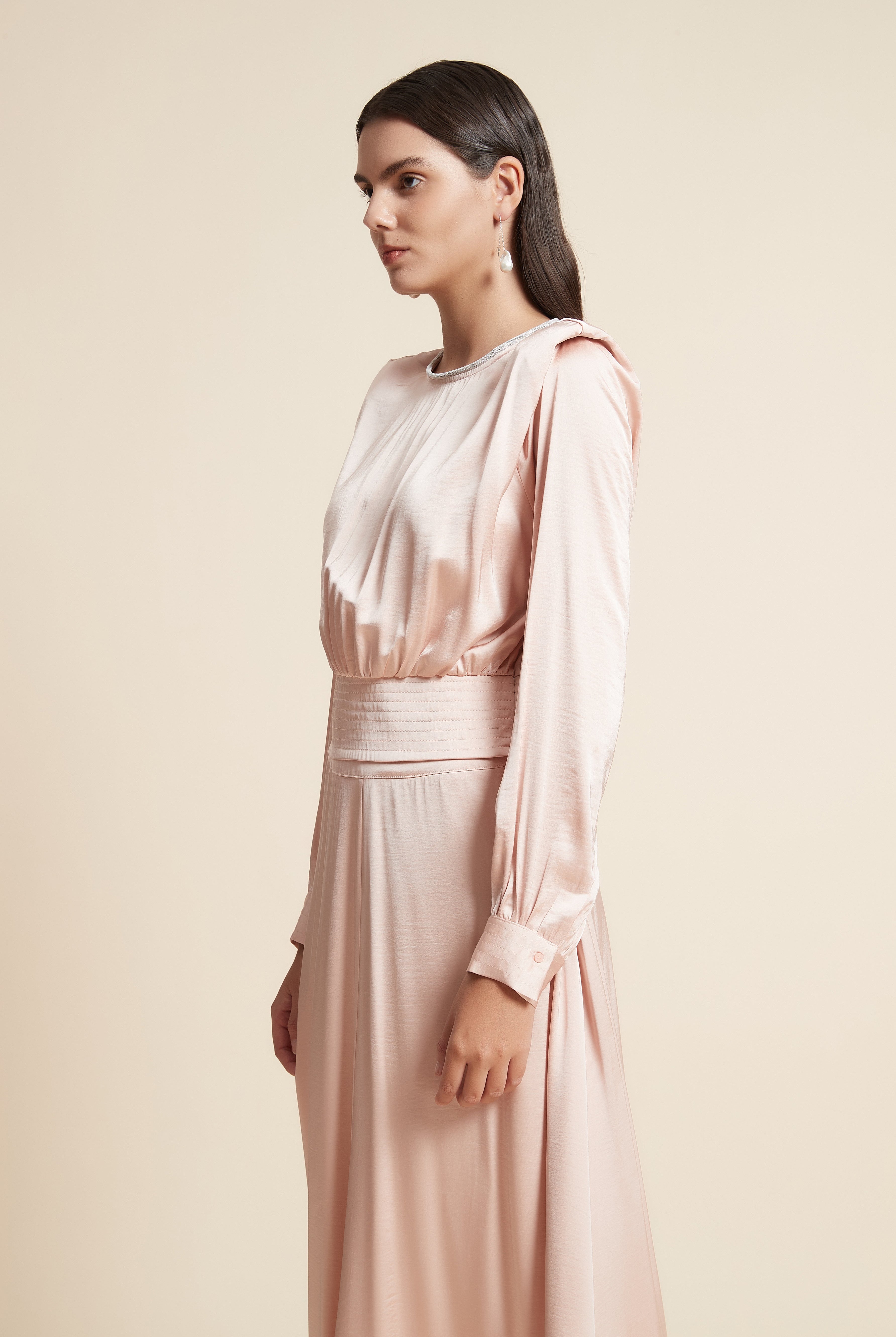 فستان طويل سليم بأكمام طويلة وفتحة في الخصر