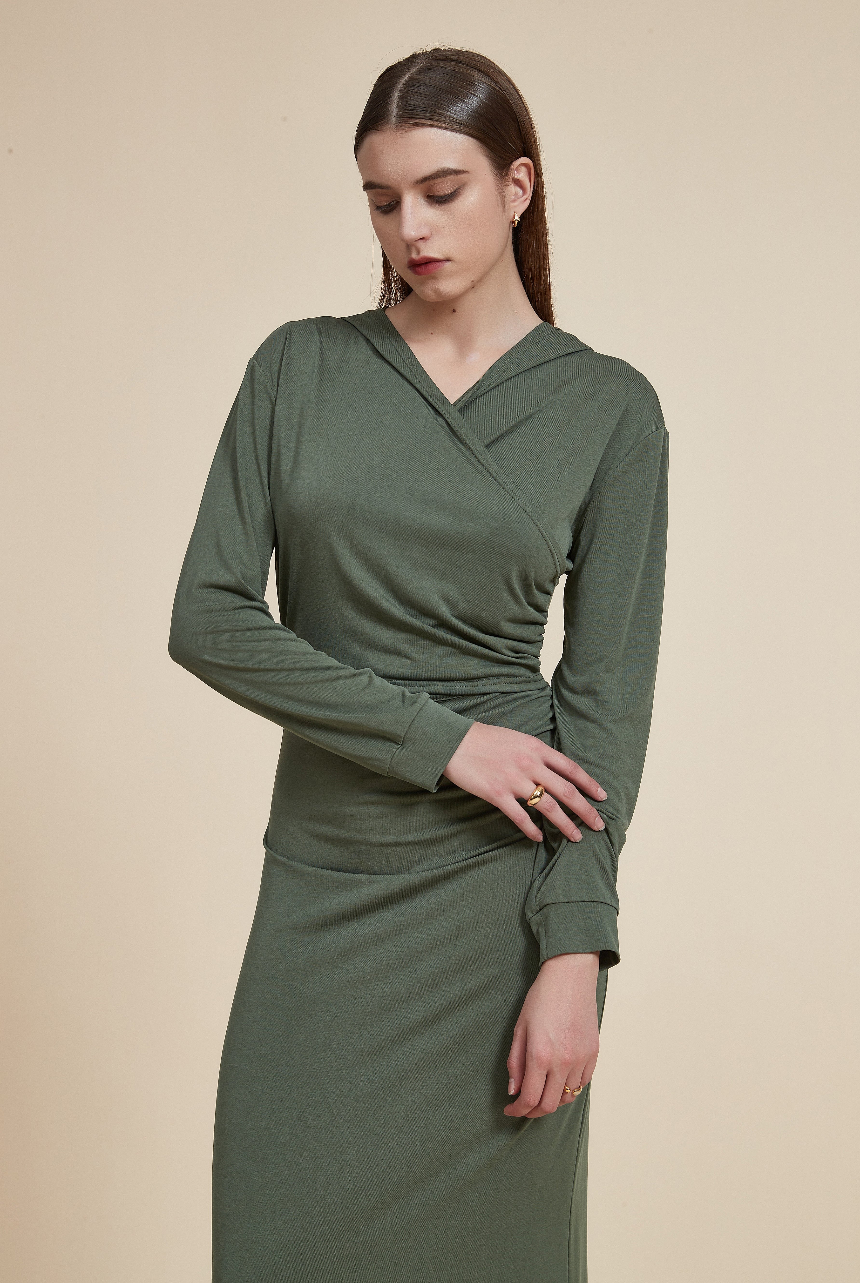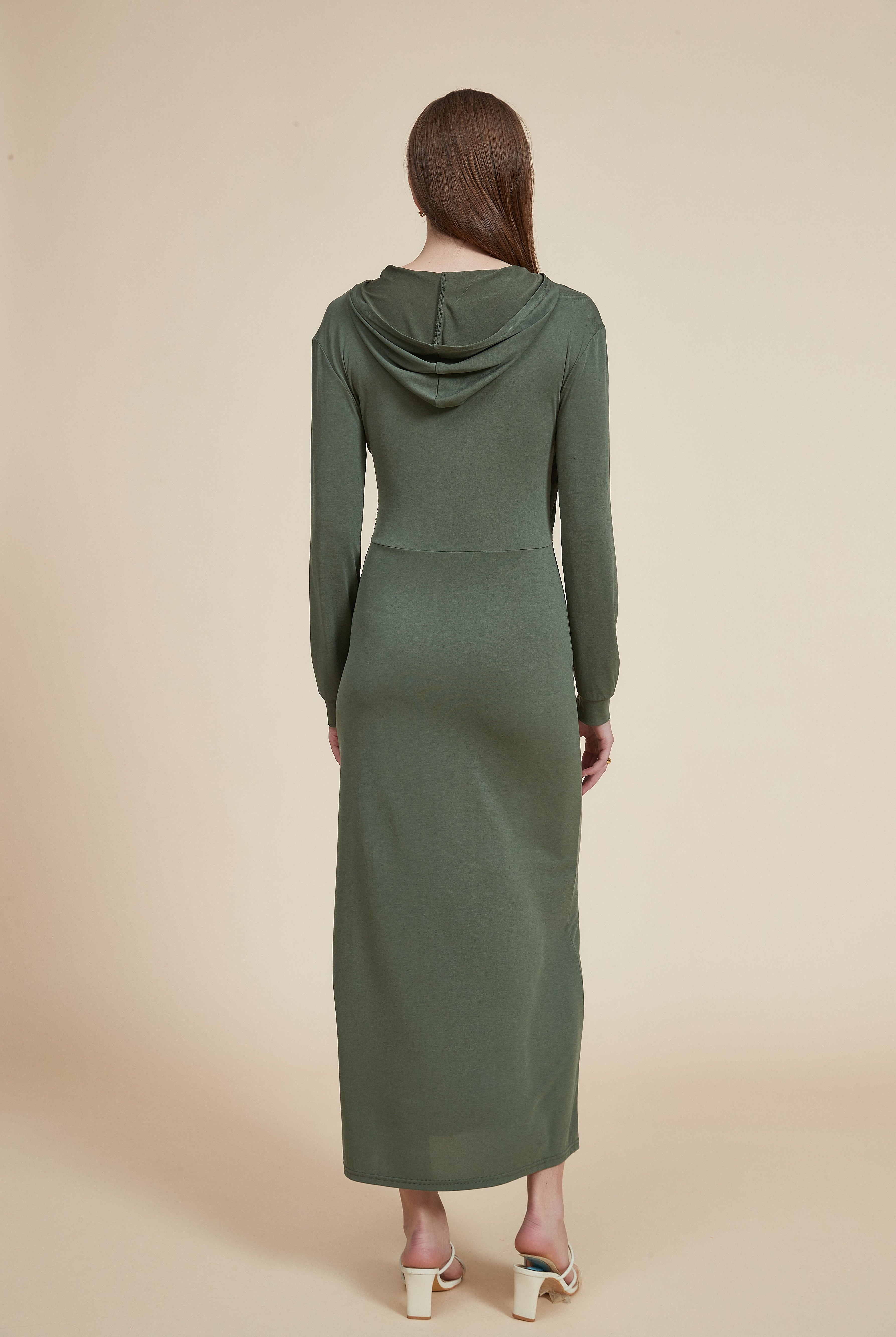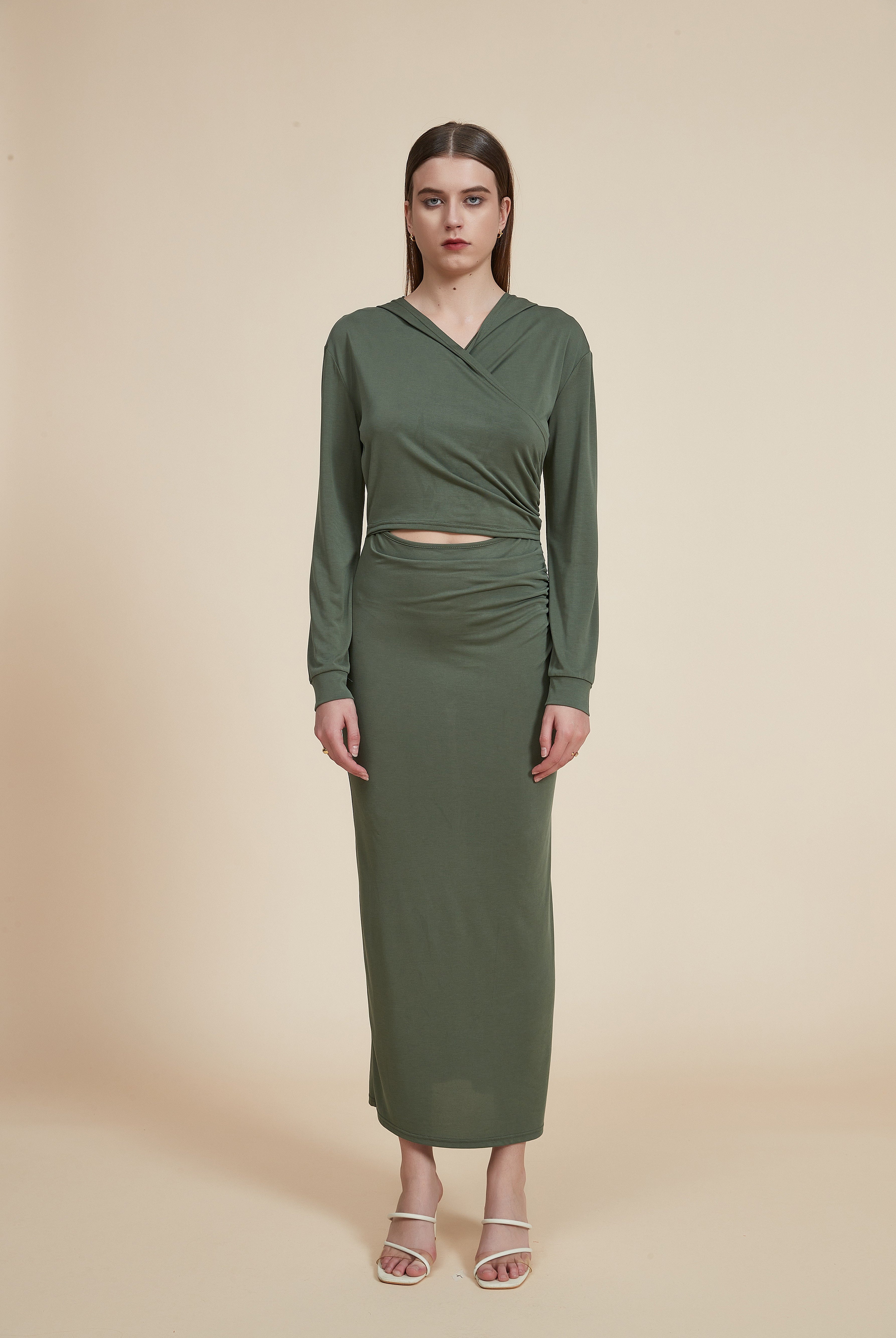 فستان طويل سليم بأكمام طويلة وفتحة في الخصر