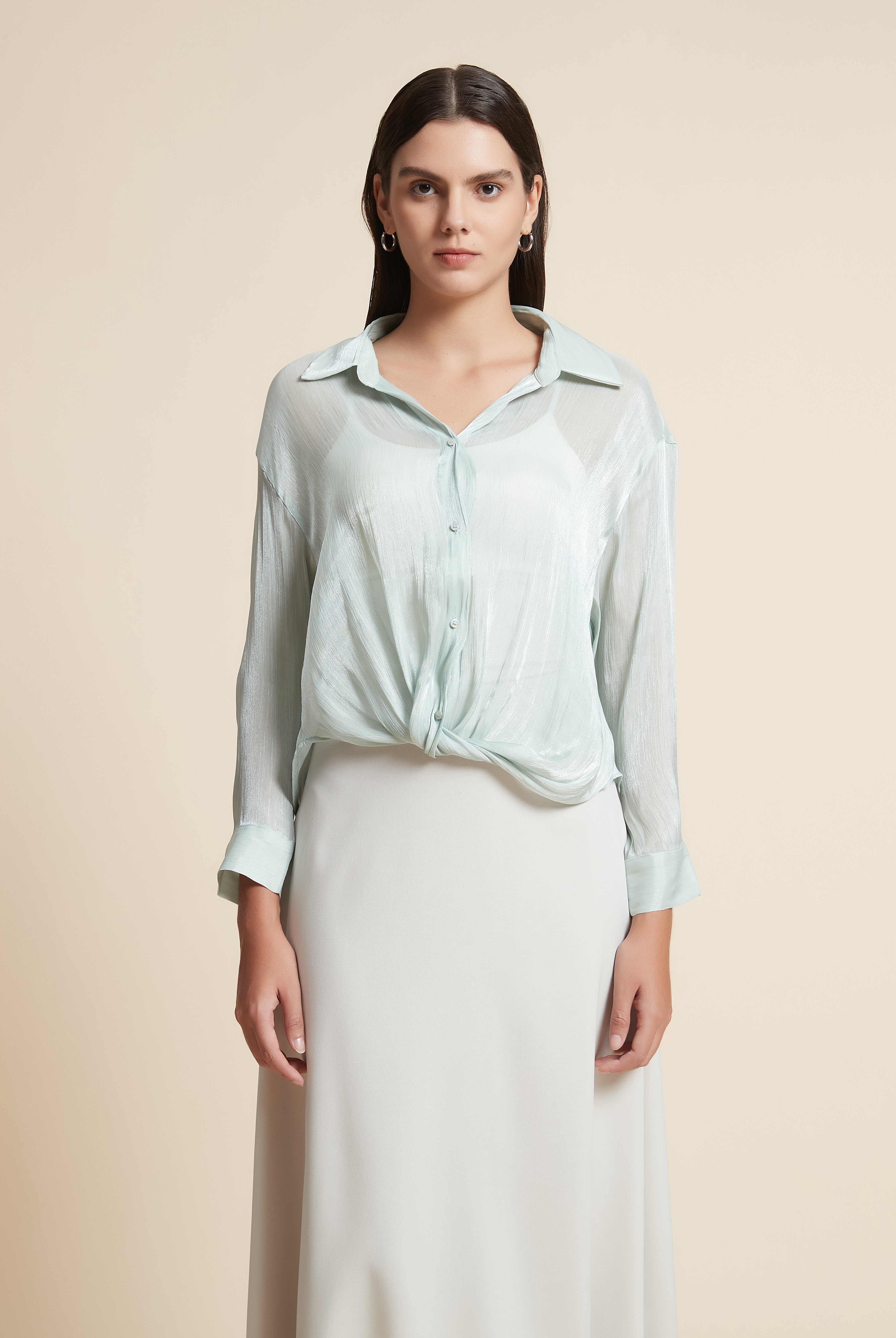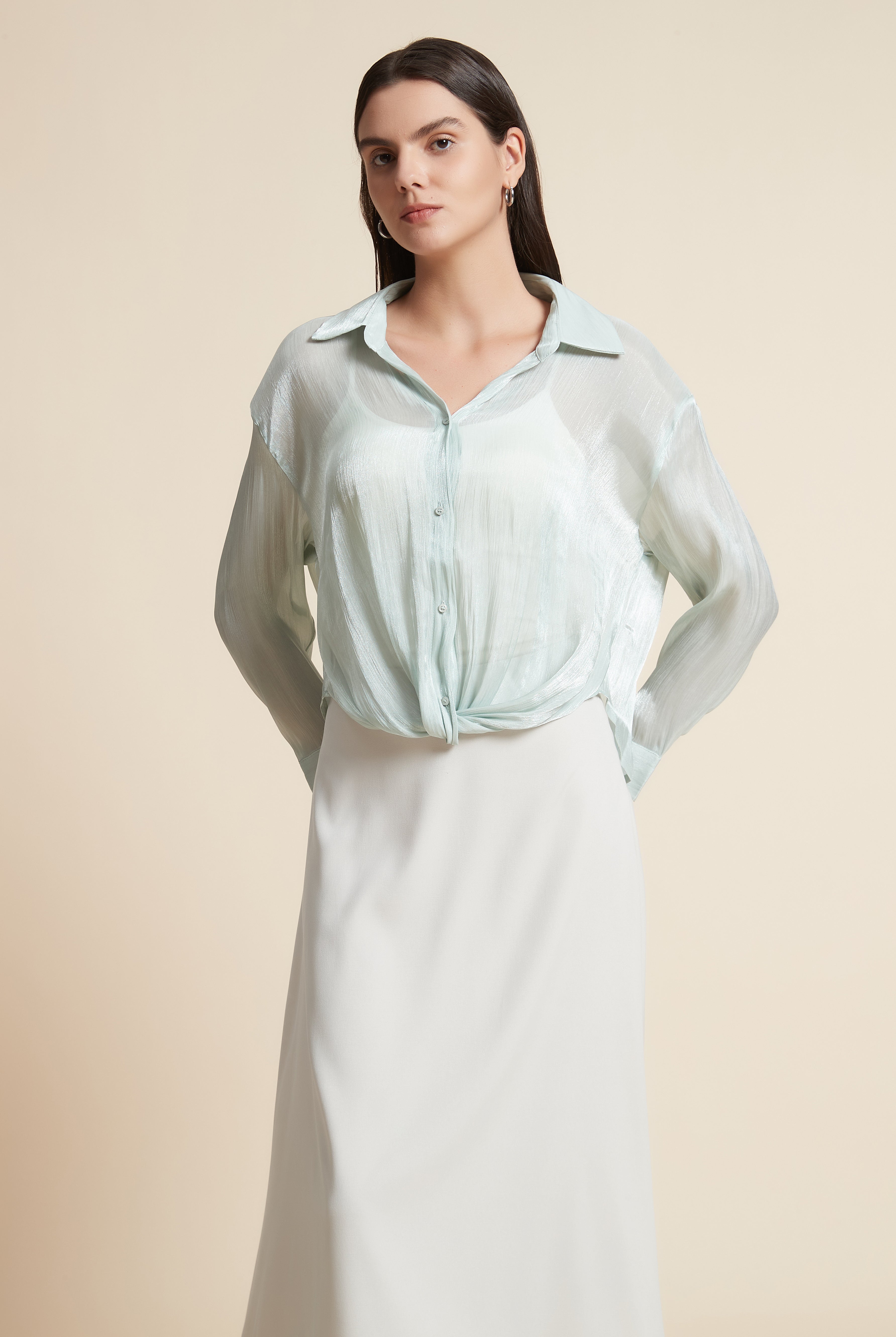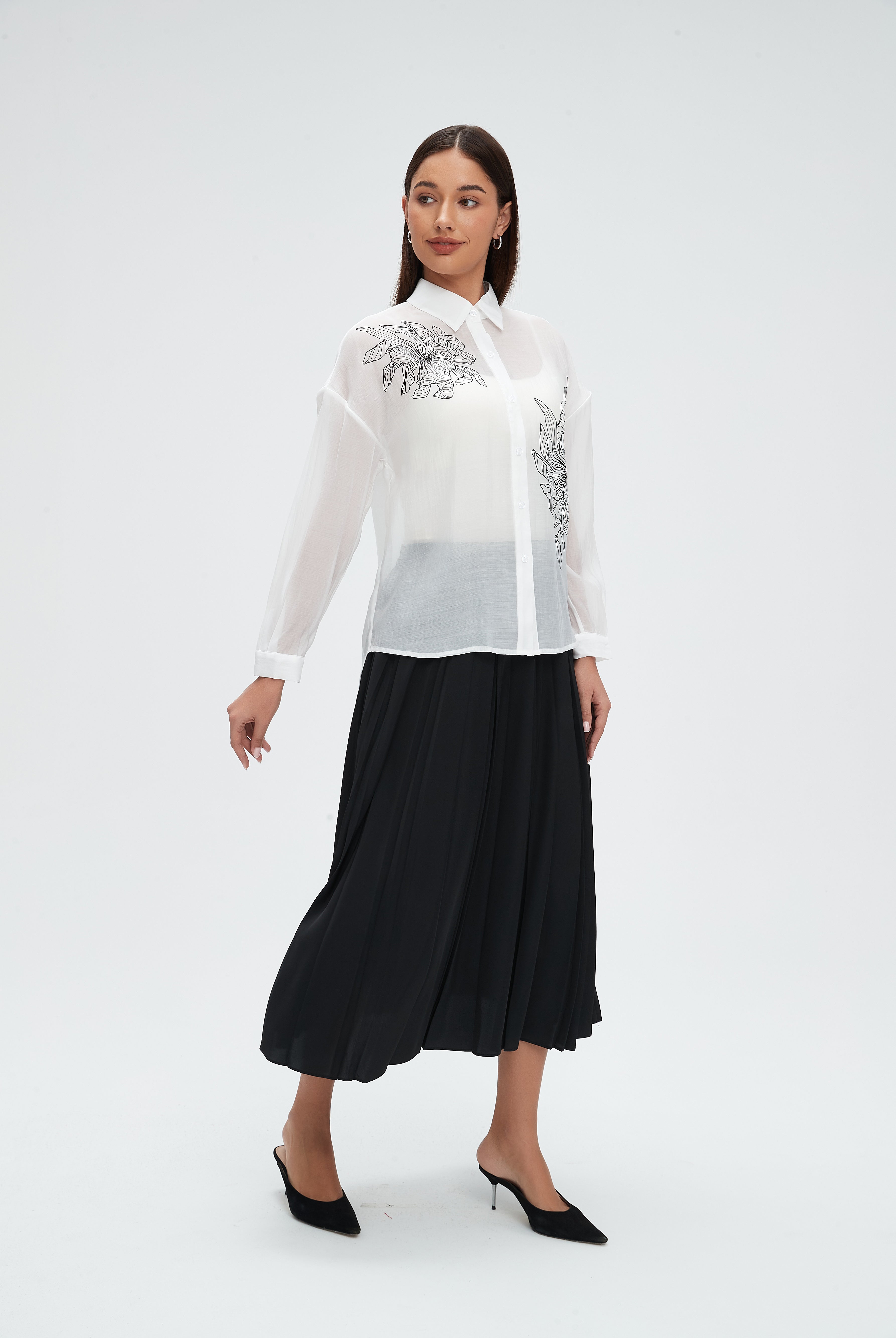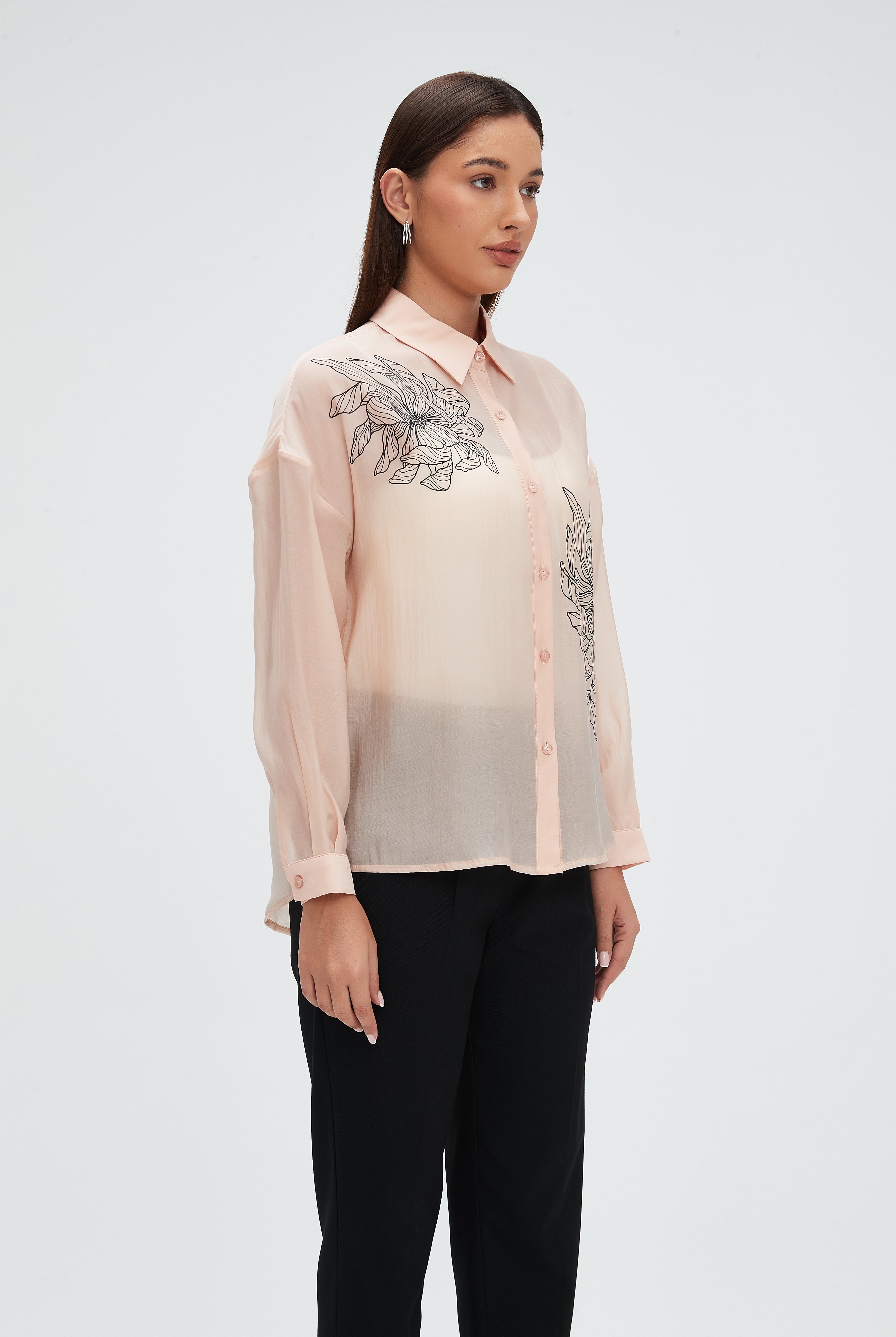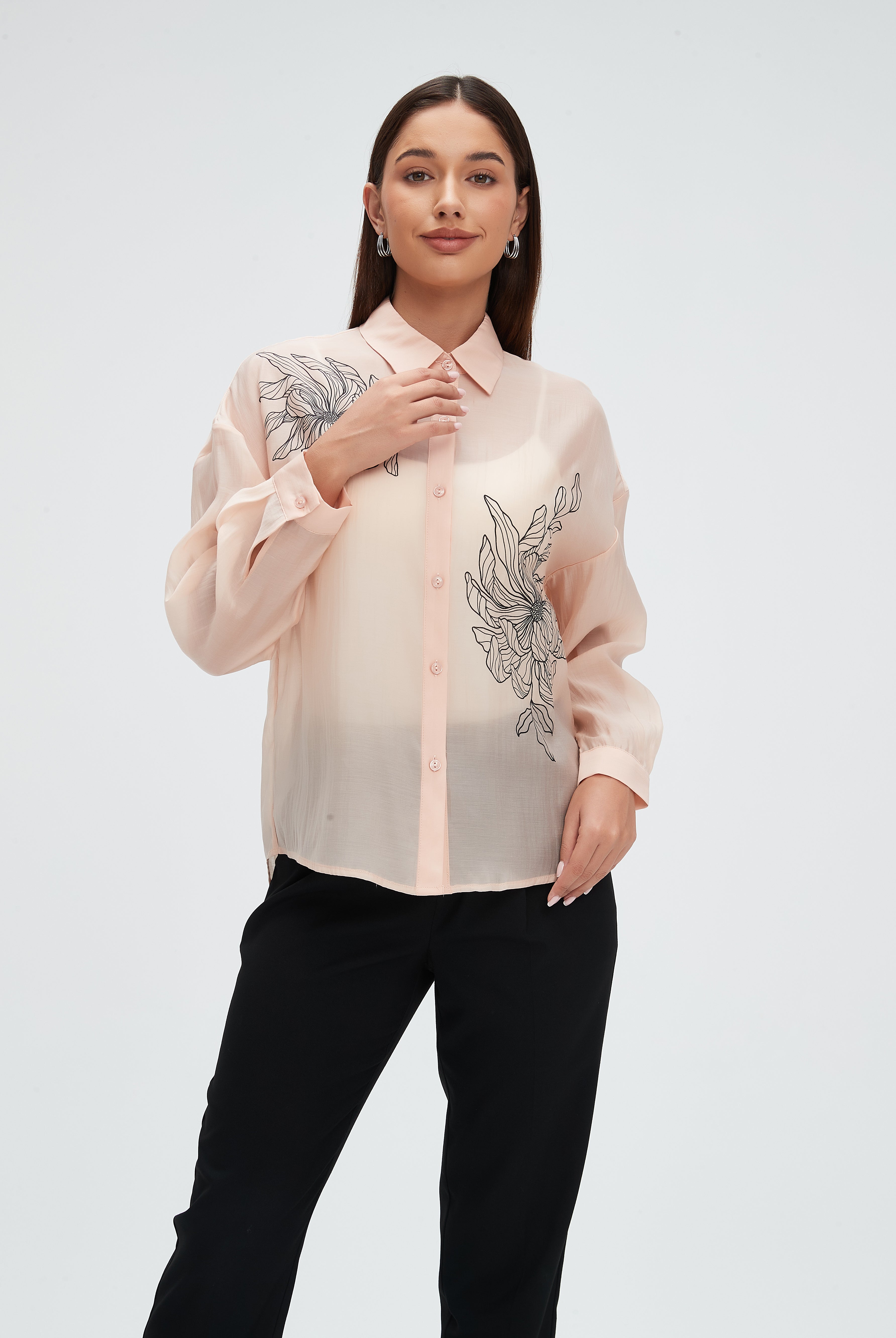 قميص كم طويل شفاف منقوش