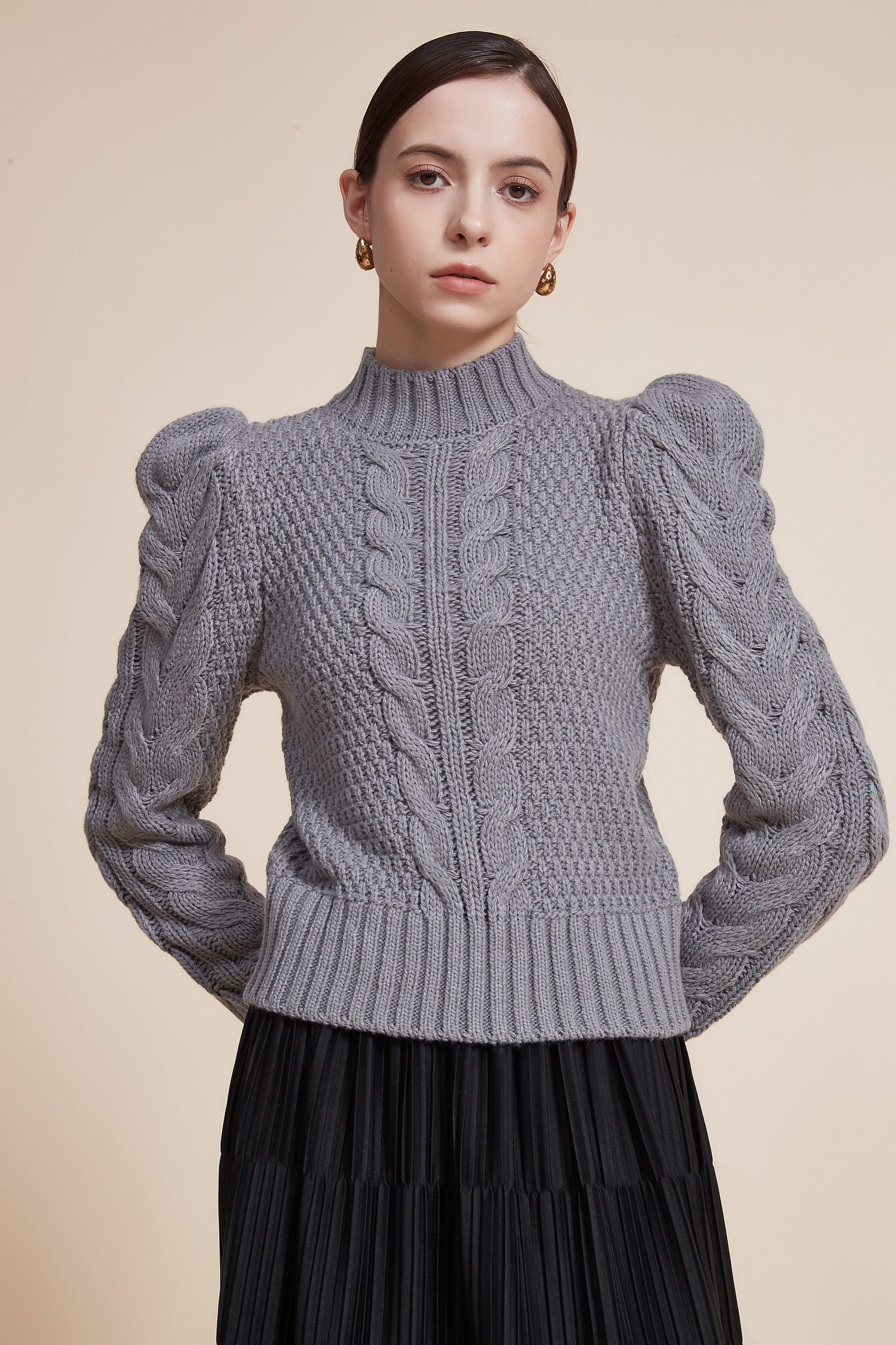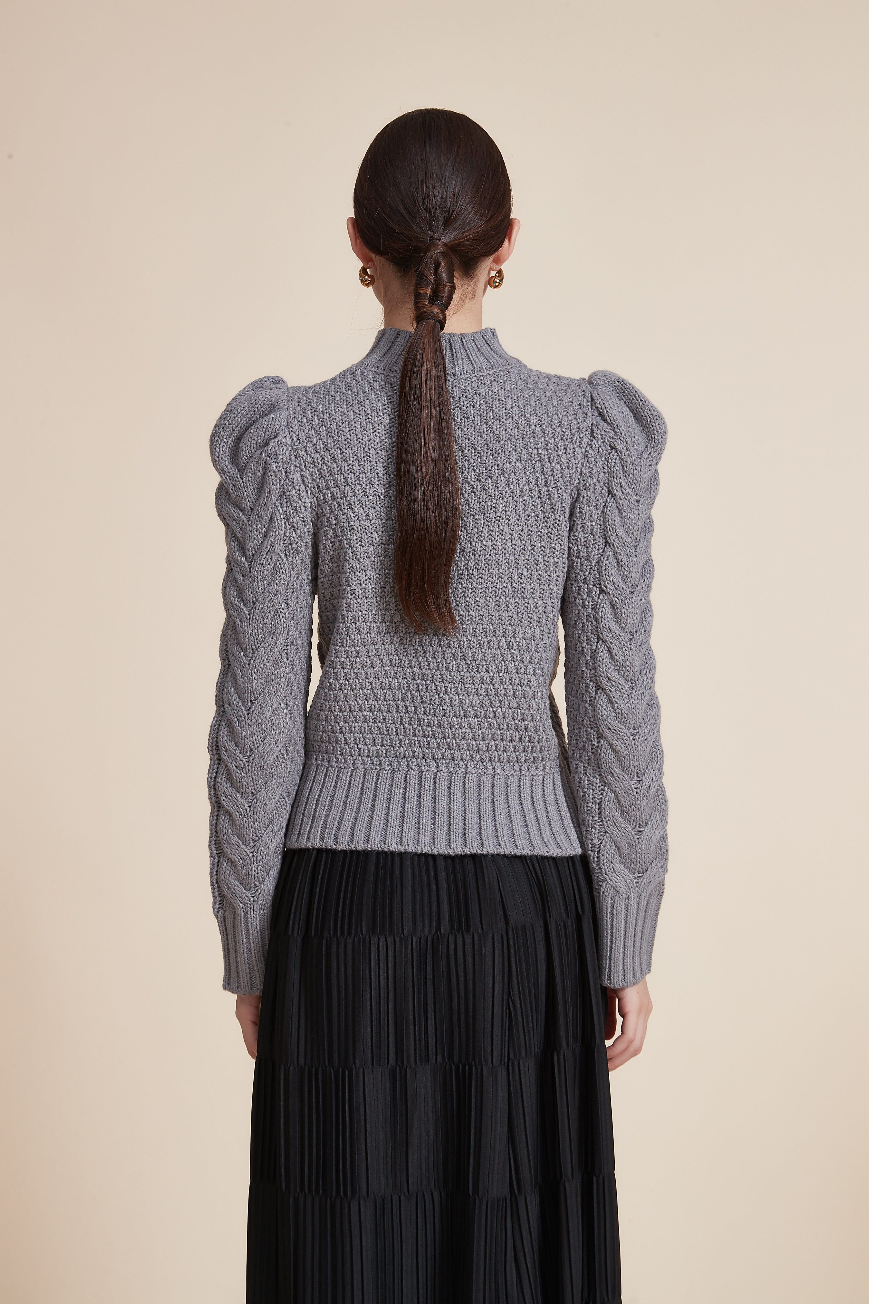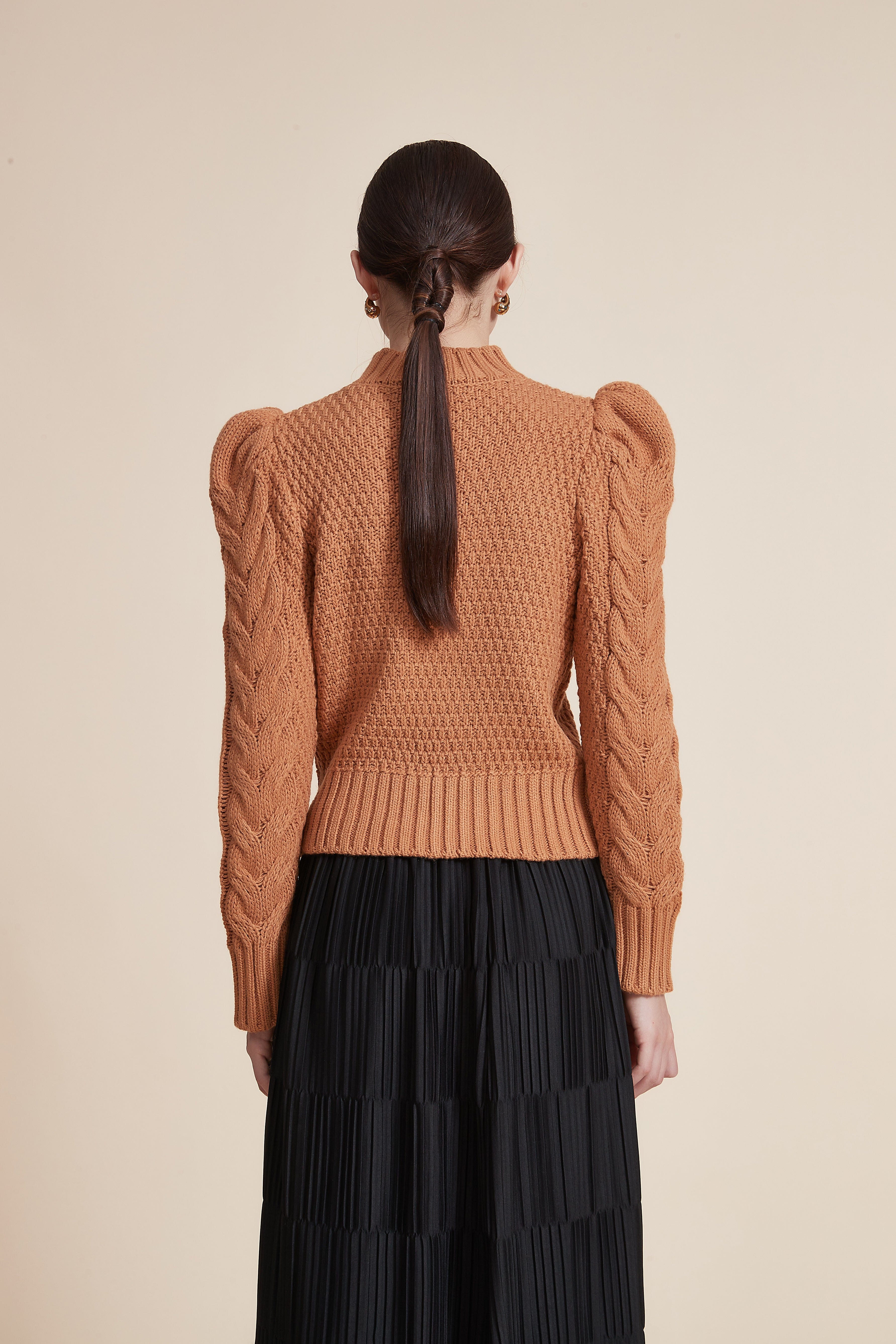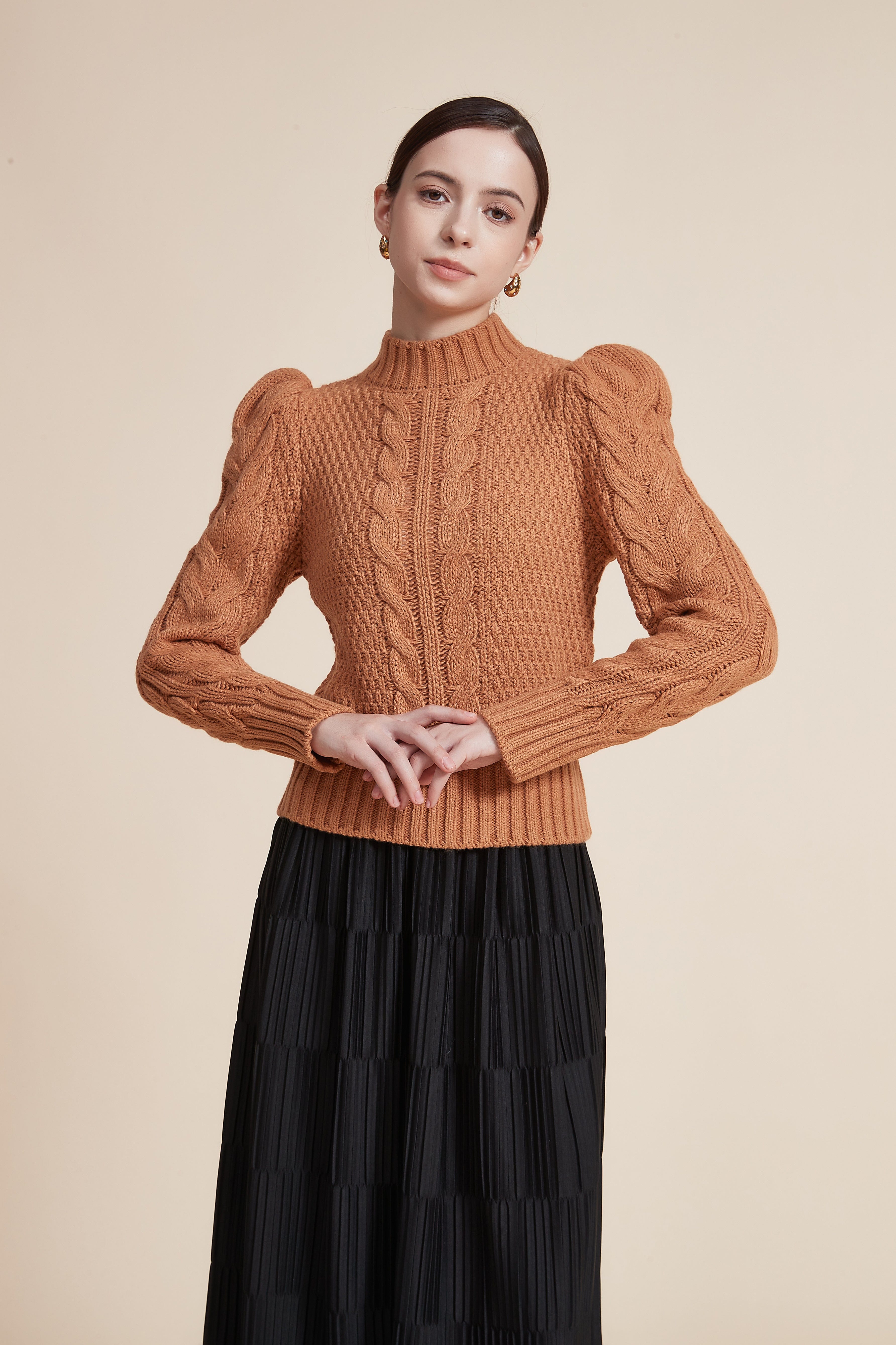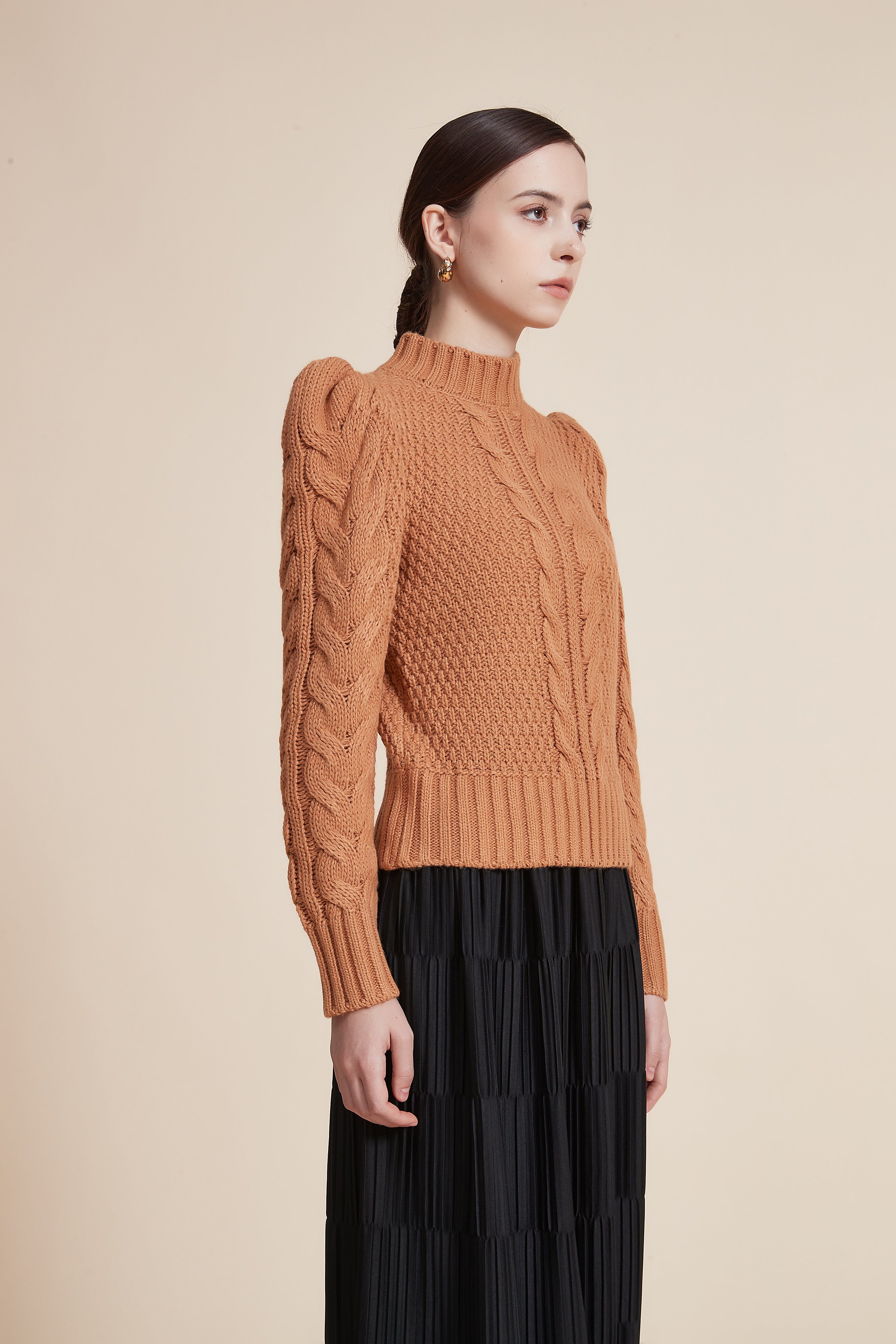 بلوزة مضلعة بكم طويل بف برقبة عالية