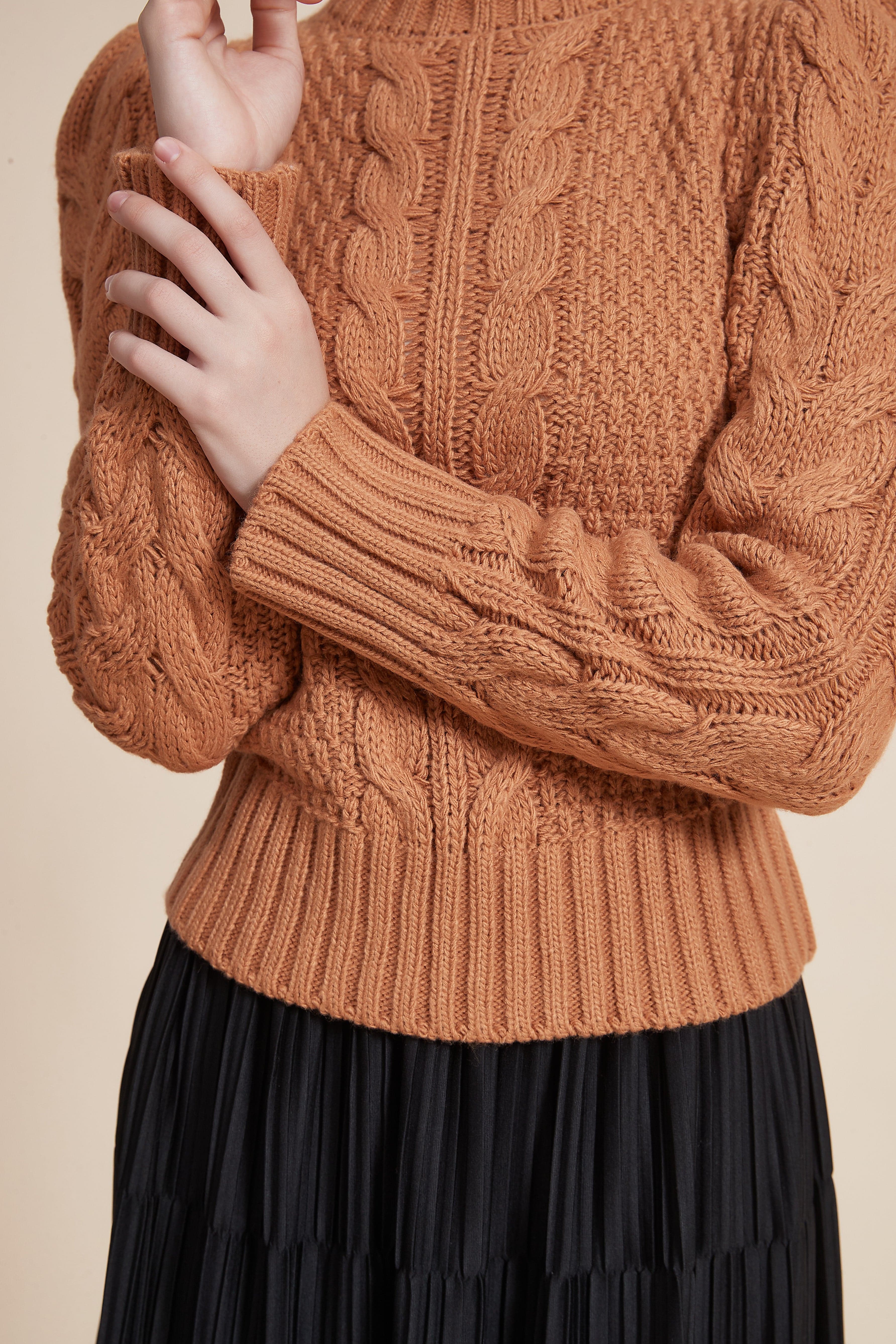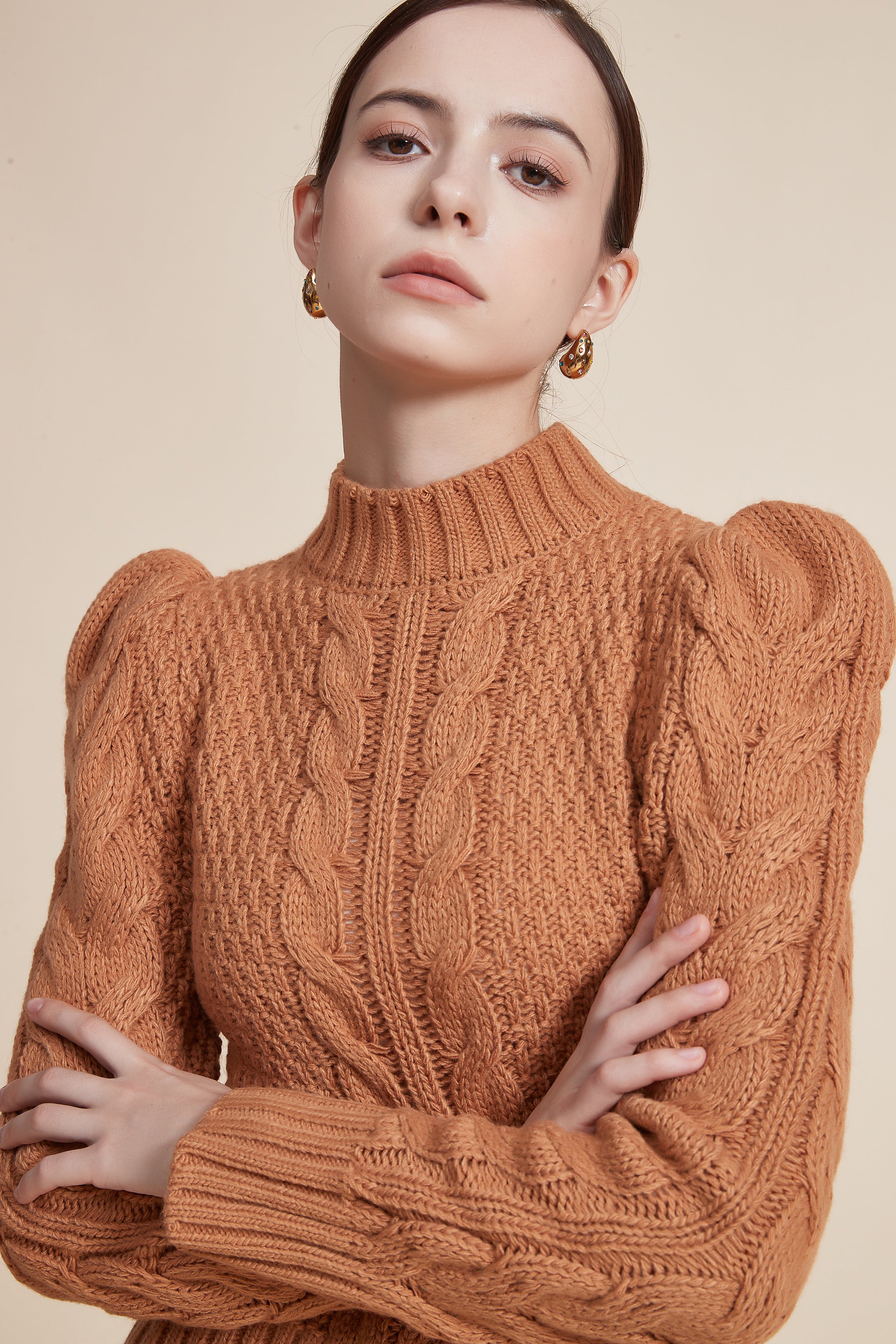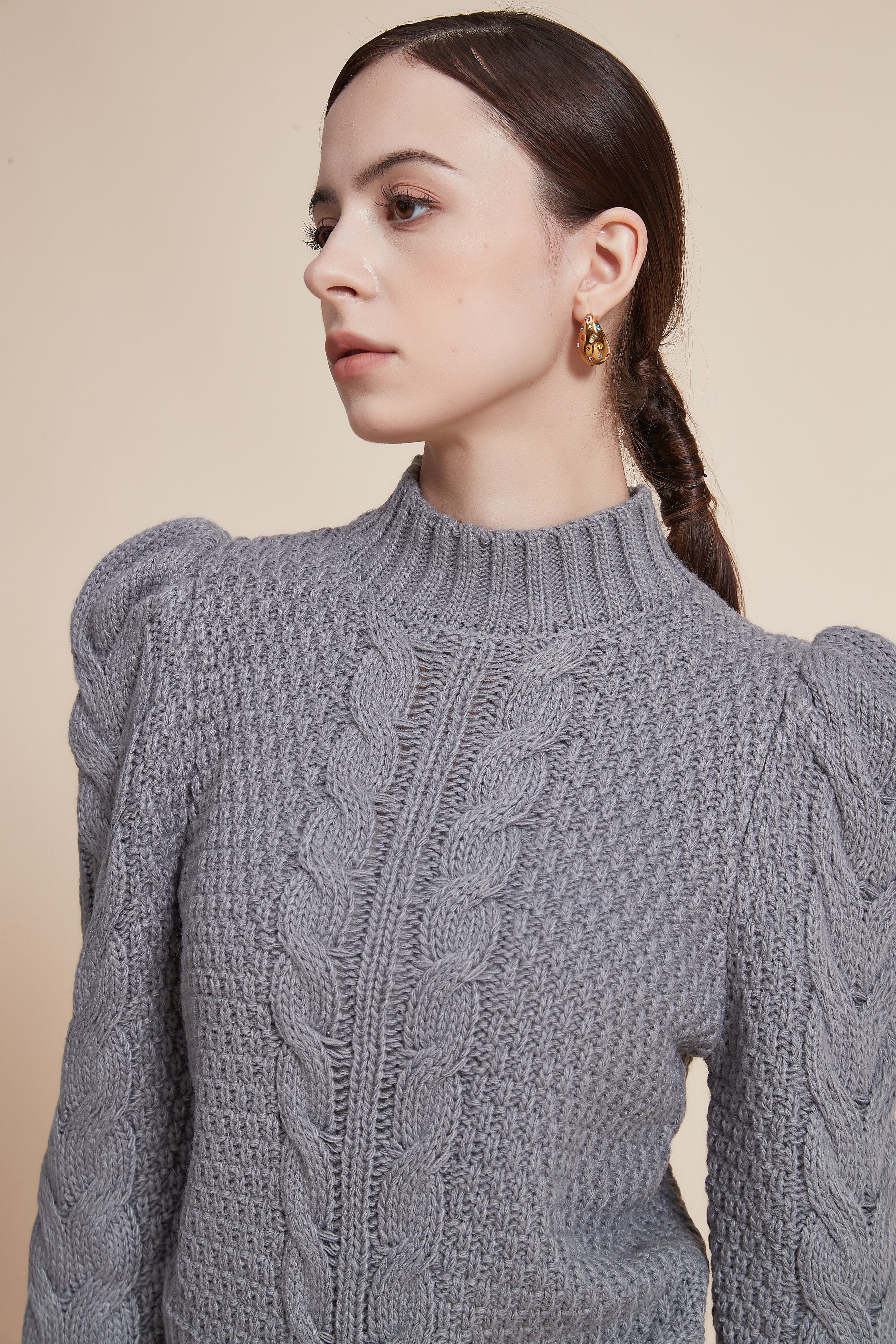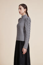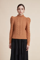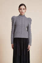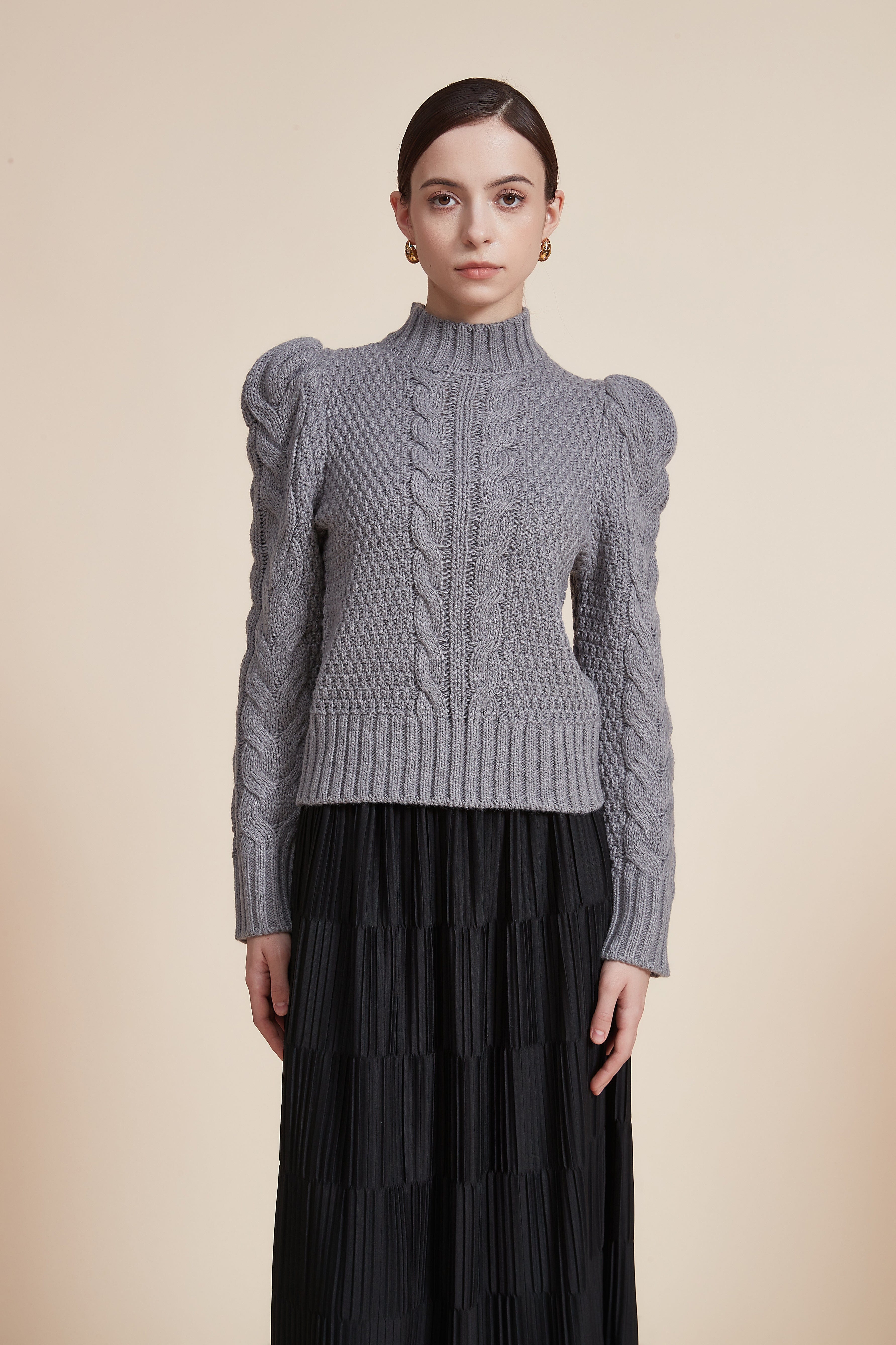 بلوزة مضلعة بكم طويل بف برقبة عالية