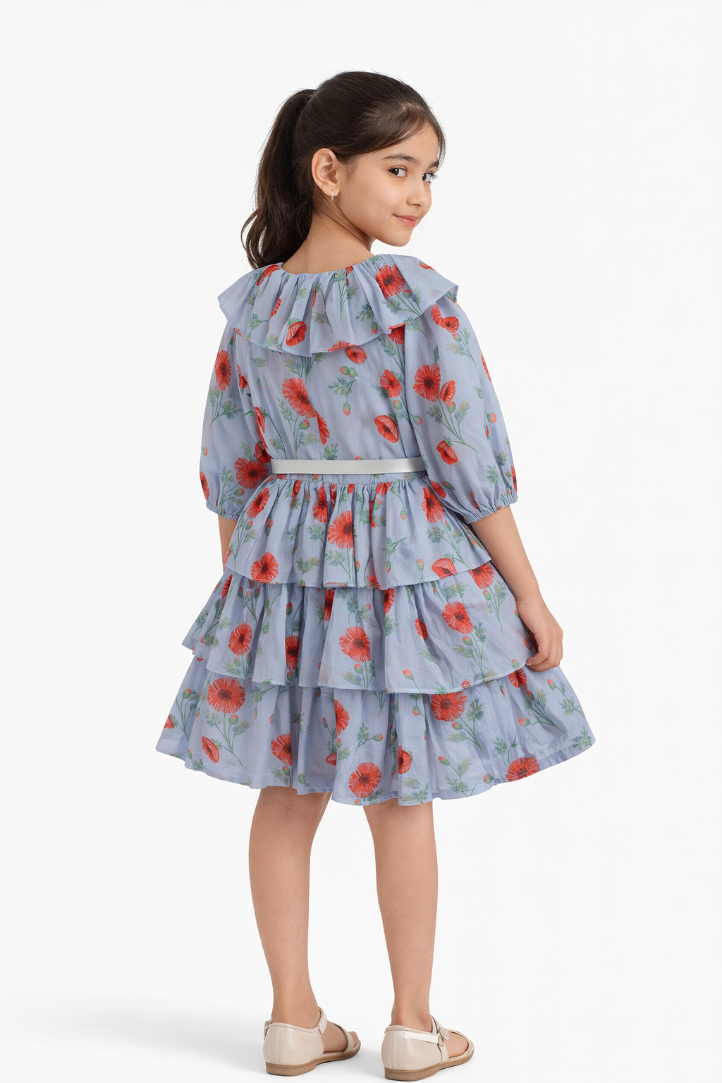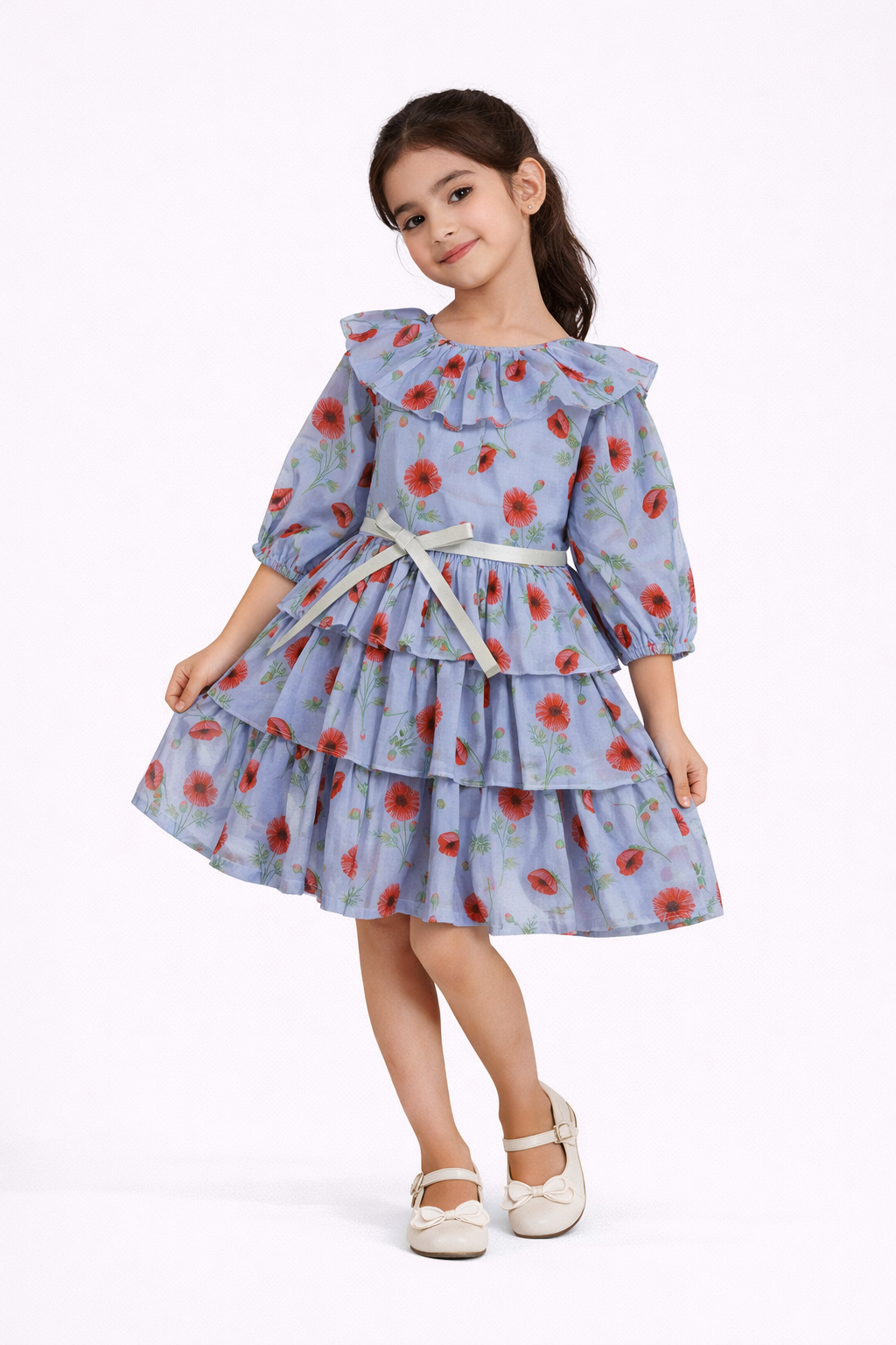 فستان بناتي مشجر طبقات مزين بكلوش على الياقة