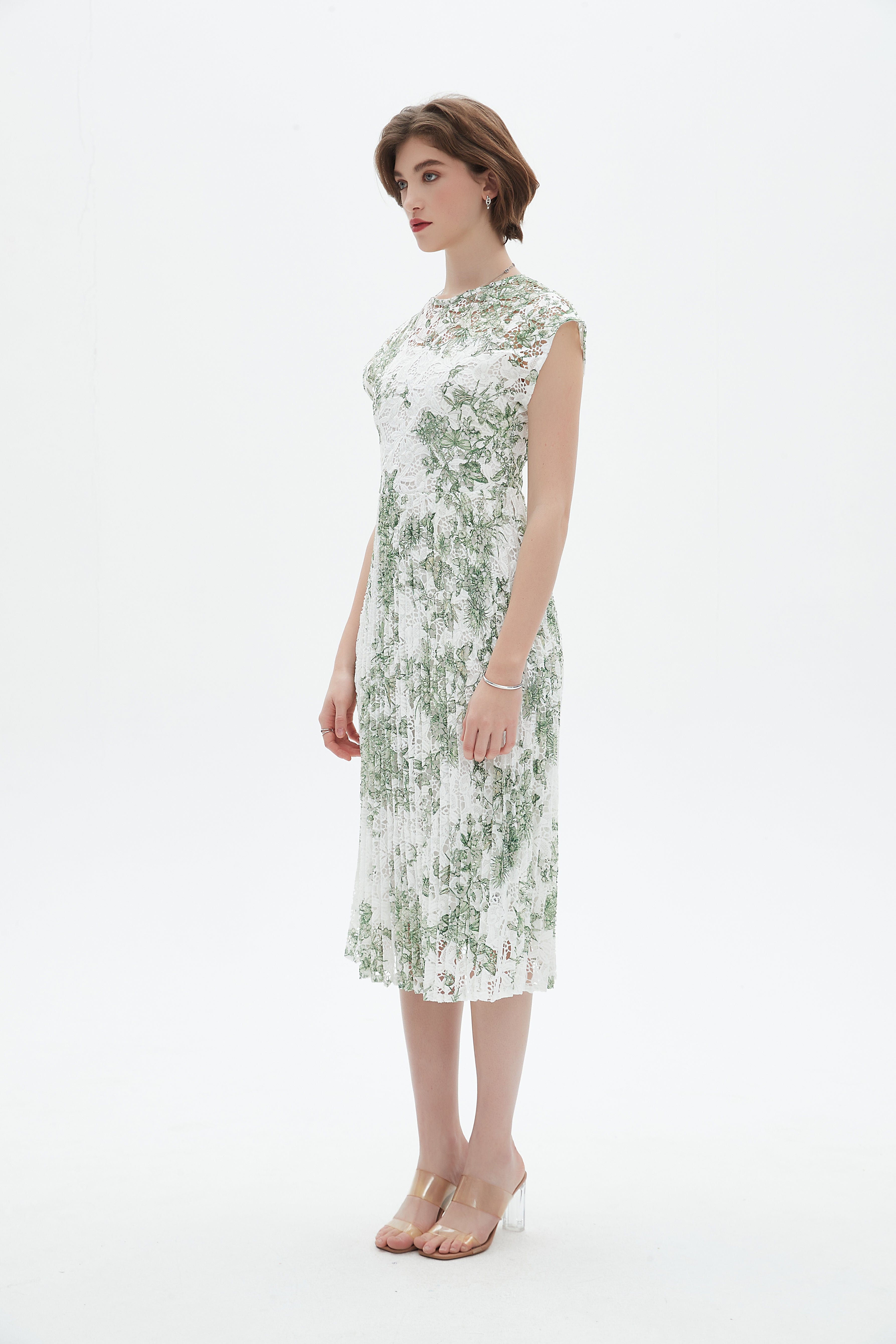فستان نسائي ميدي بكم قصير وفتحة رقبة دائرية بليسيه