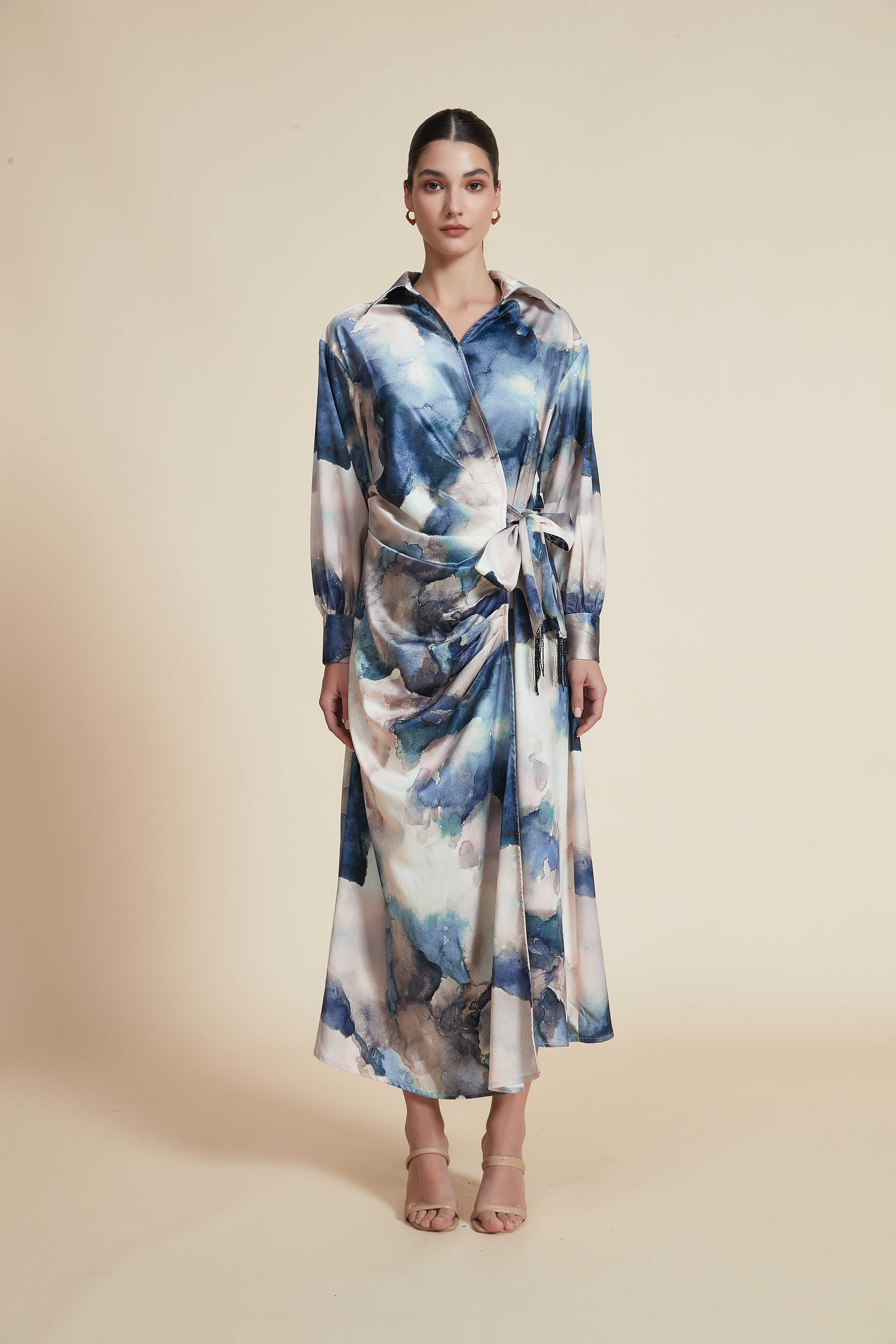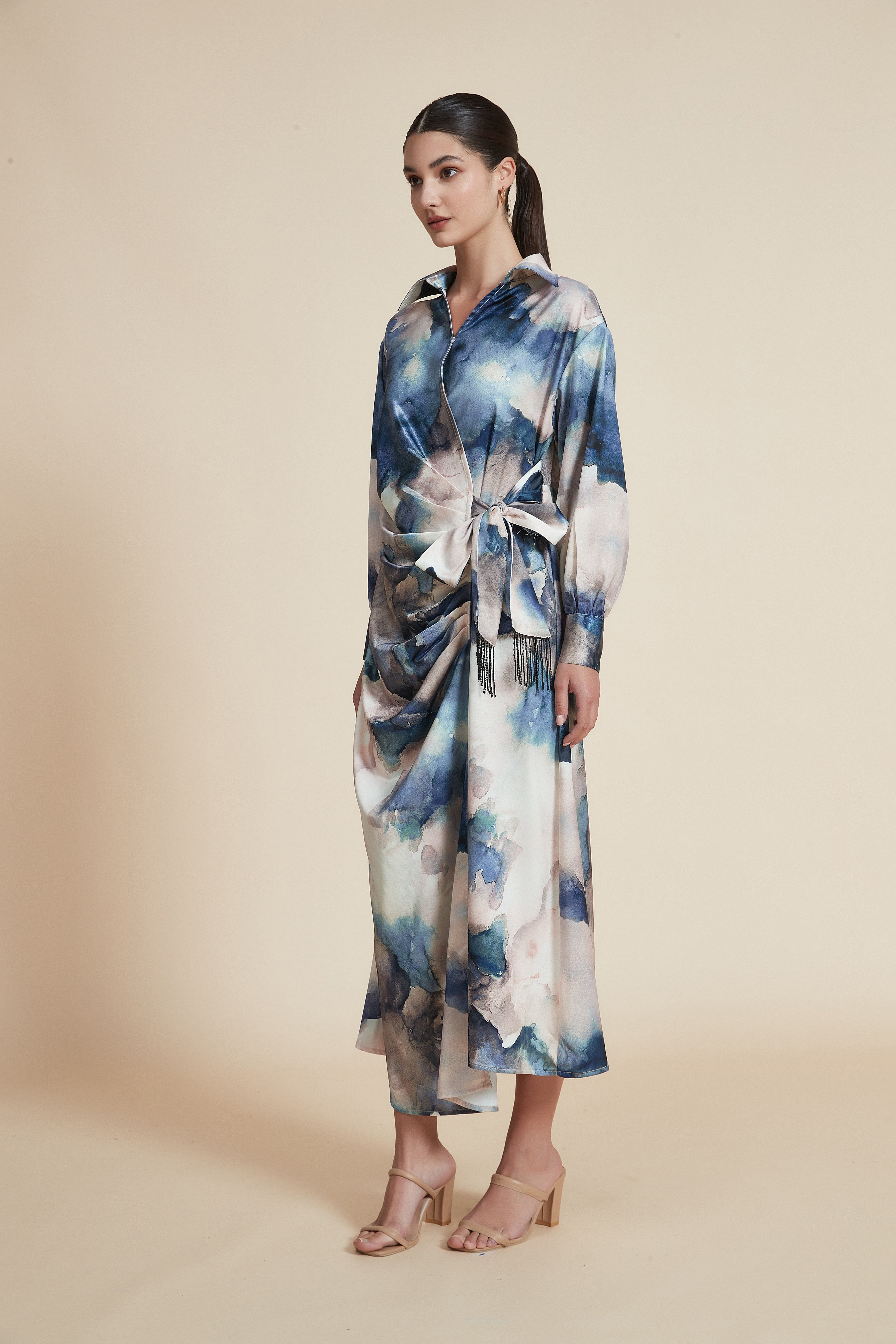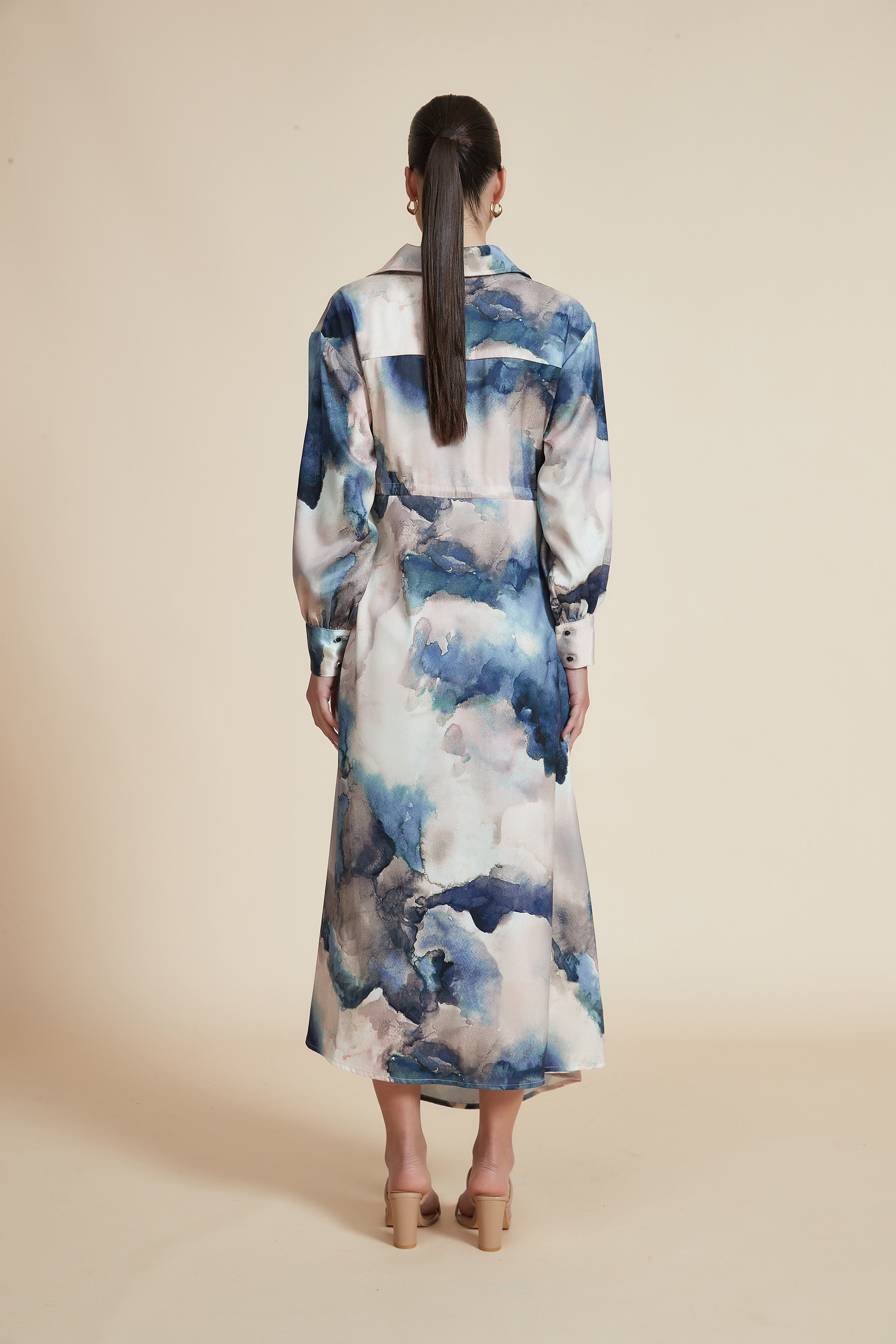 فستان مطبوع مكشكش بكم طويل وياقة قميص