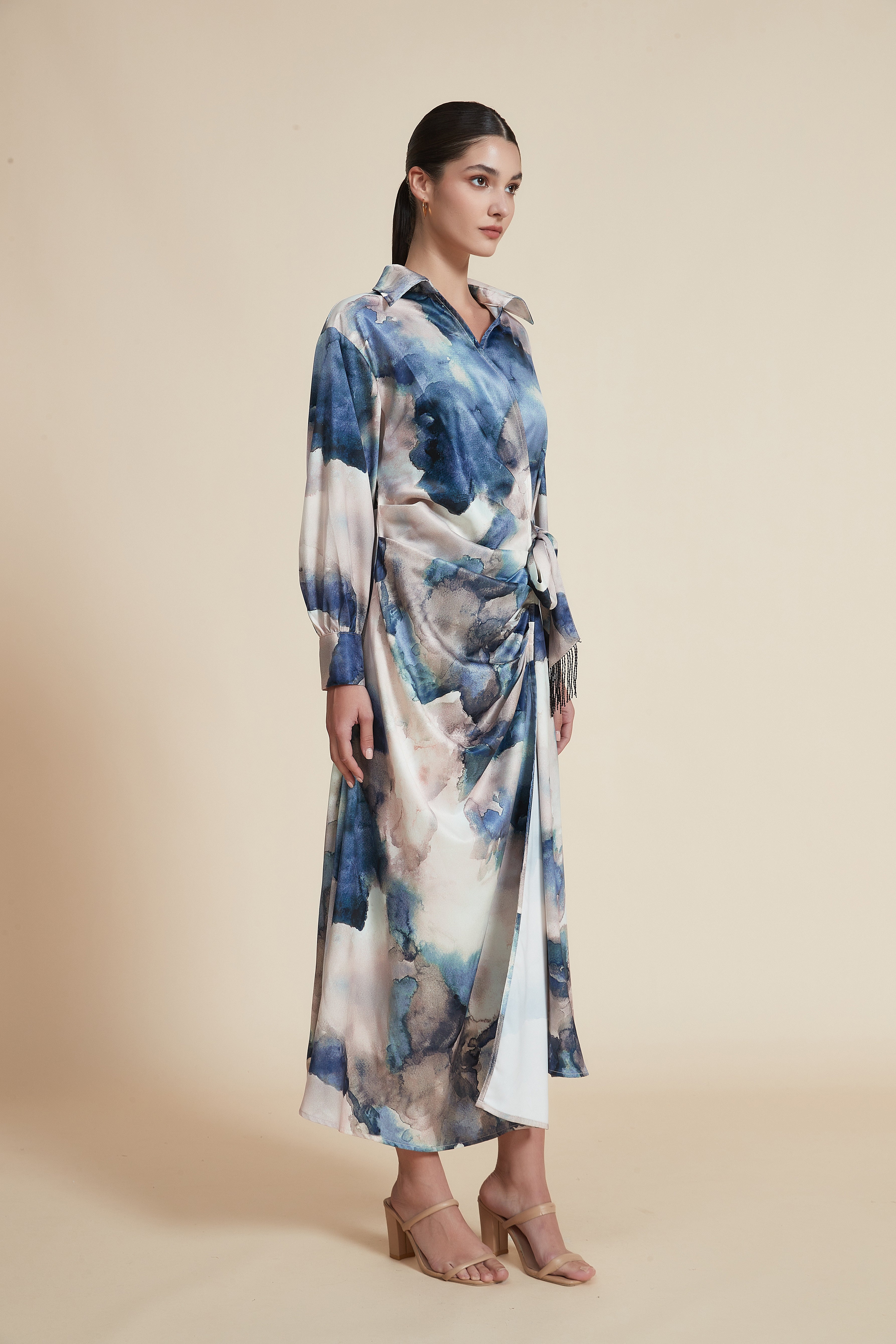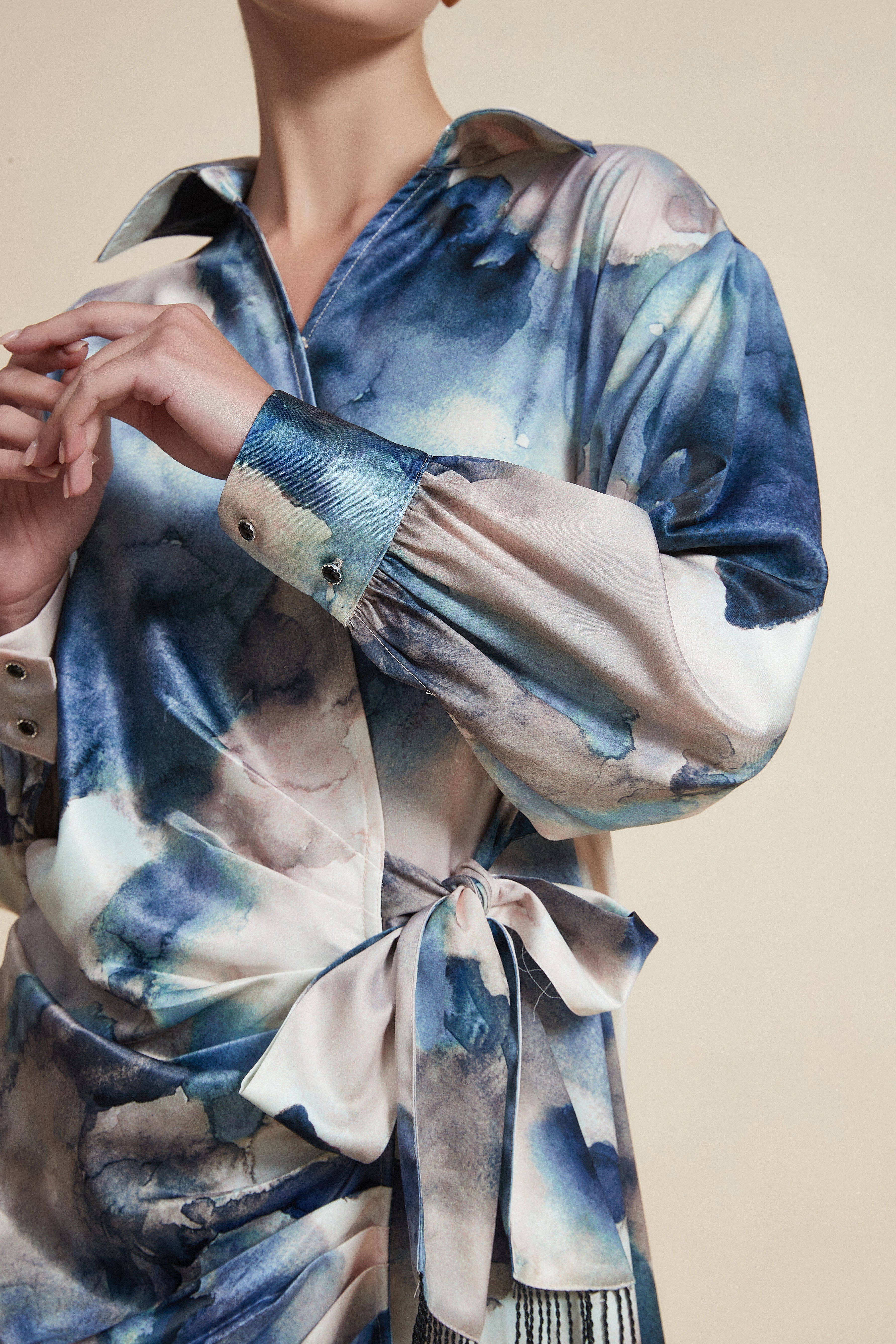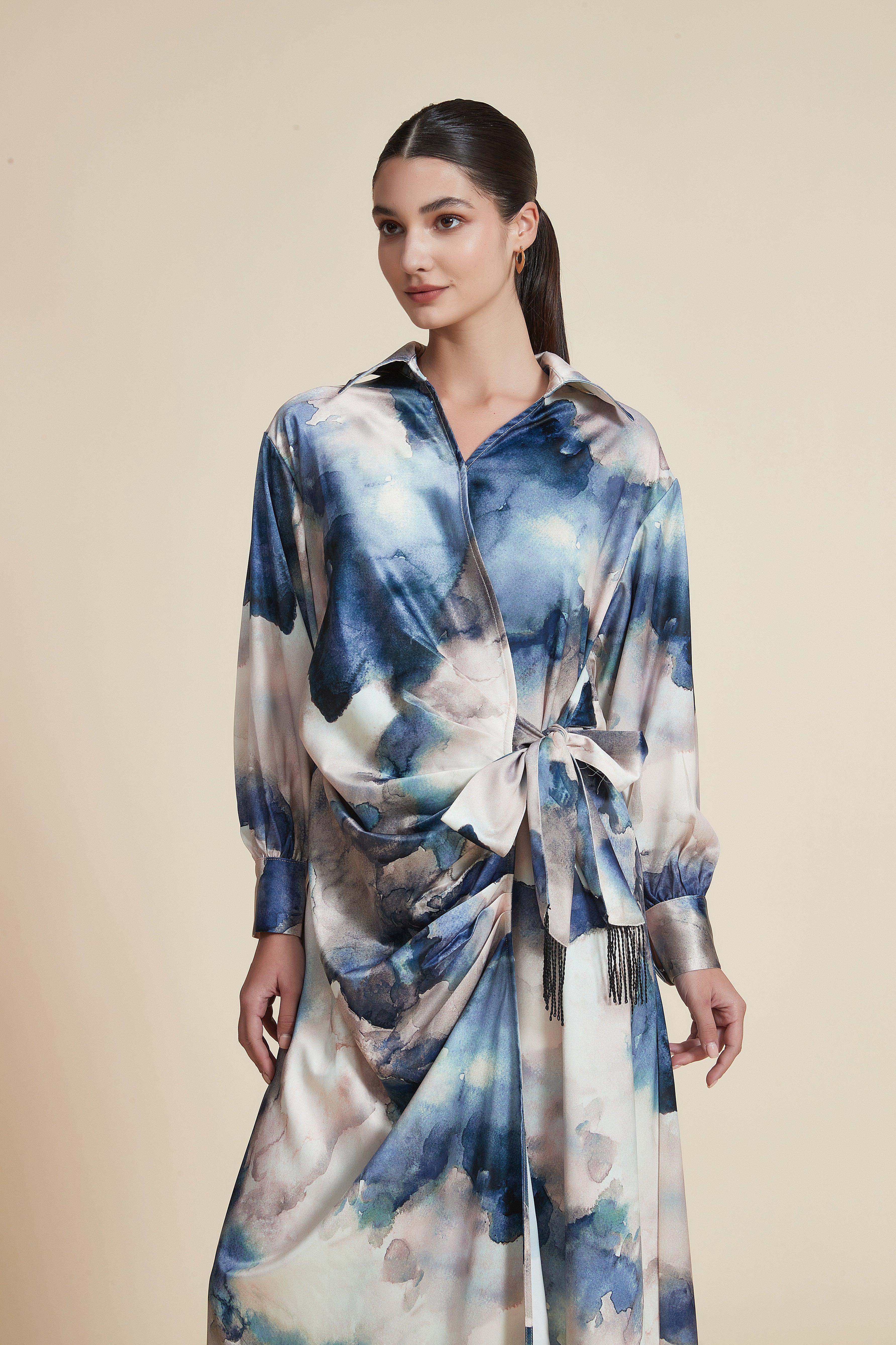 فستان مطبوع مكشكش بكم طويل وياقة قميص