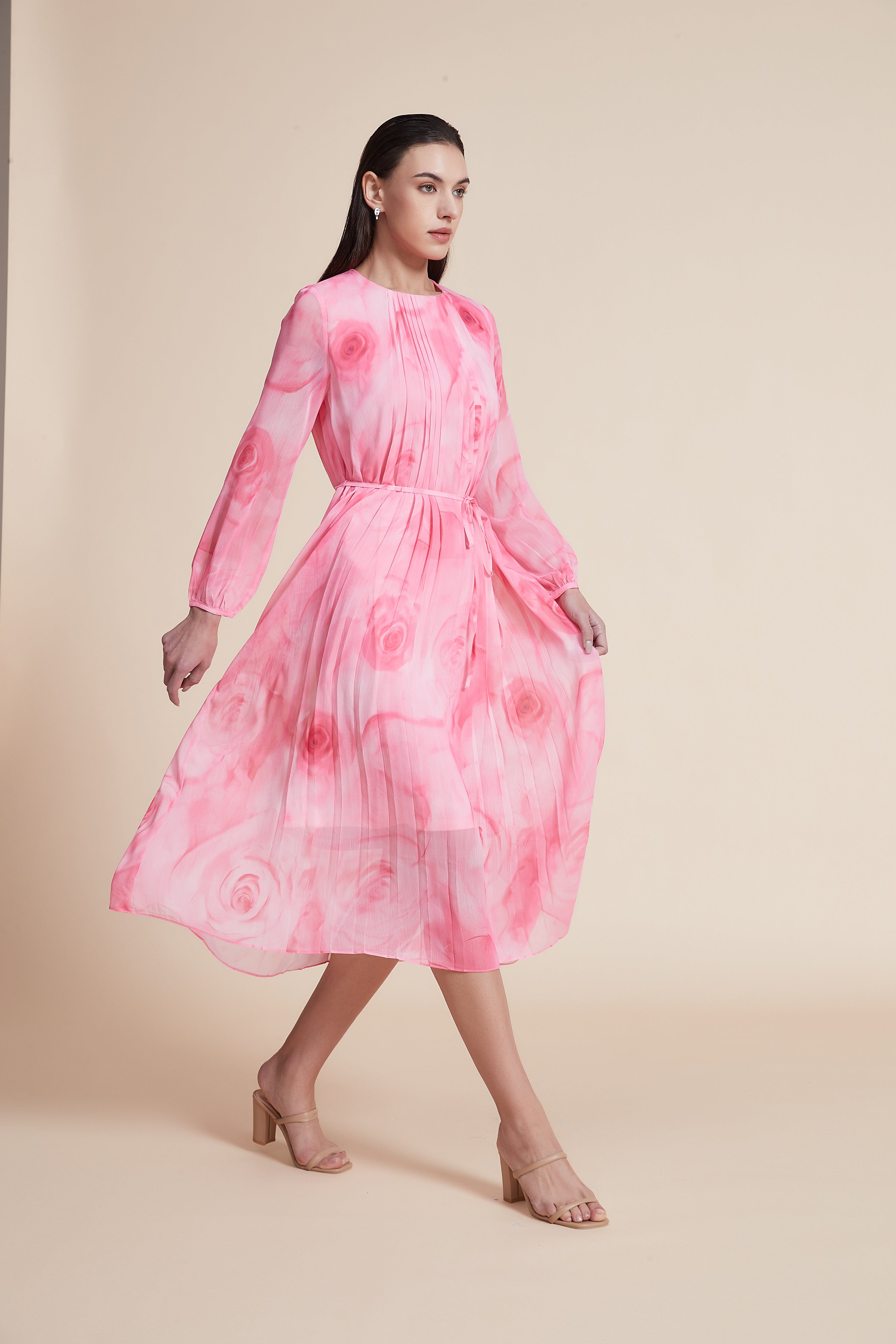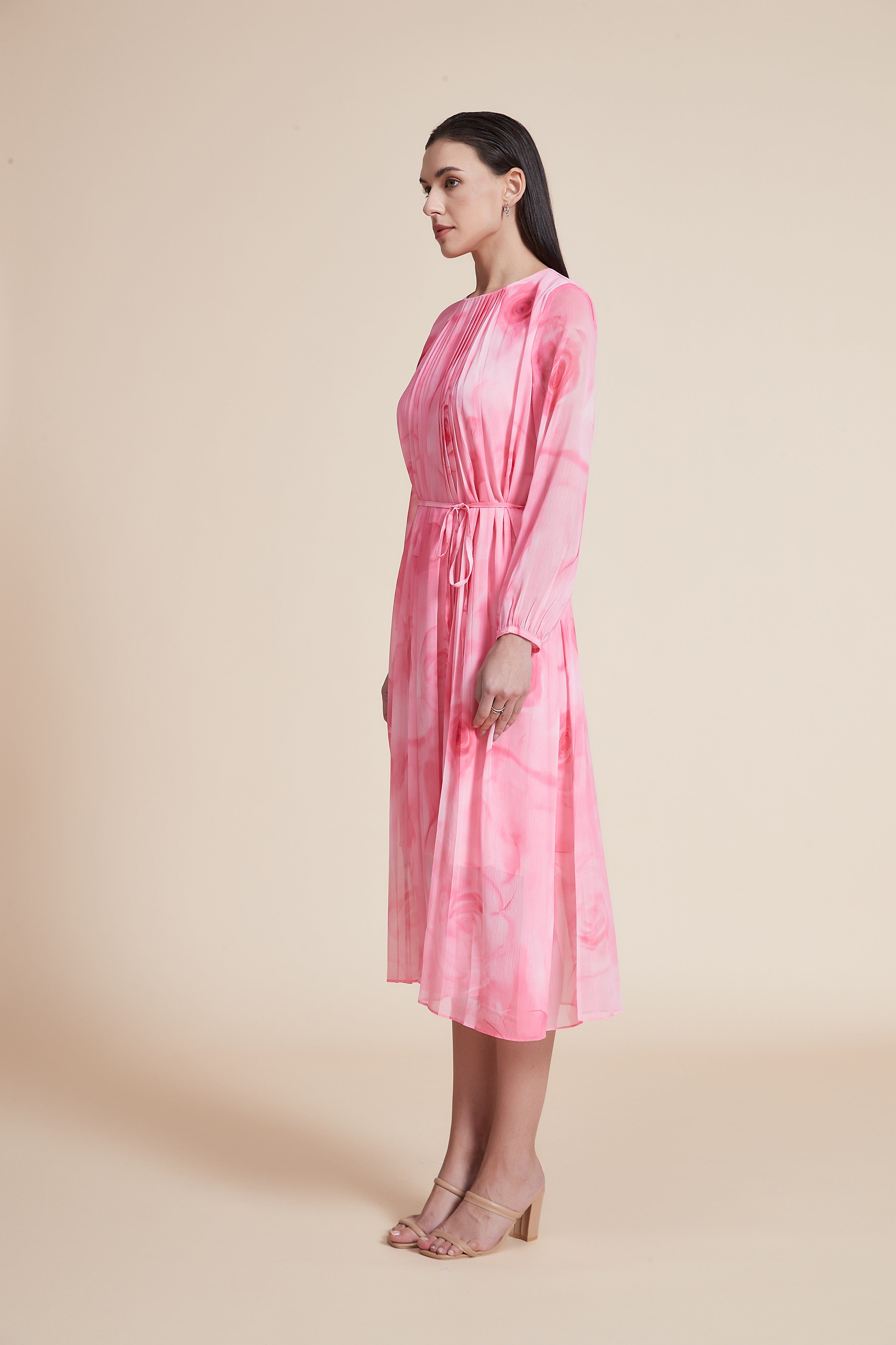 فستان ميدي بكم طويل وفتحة رقبة مستديرة