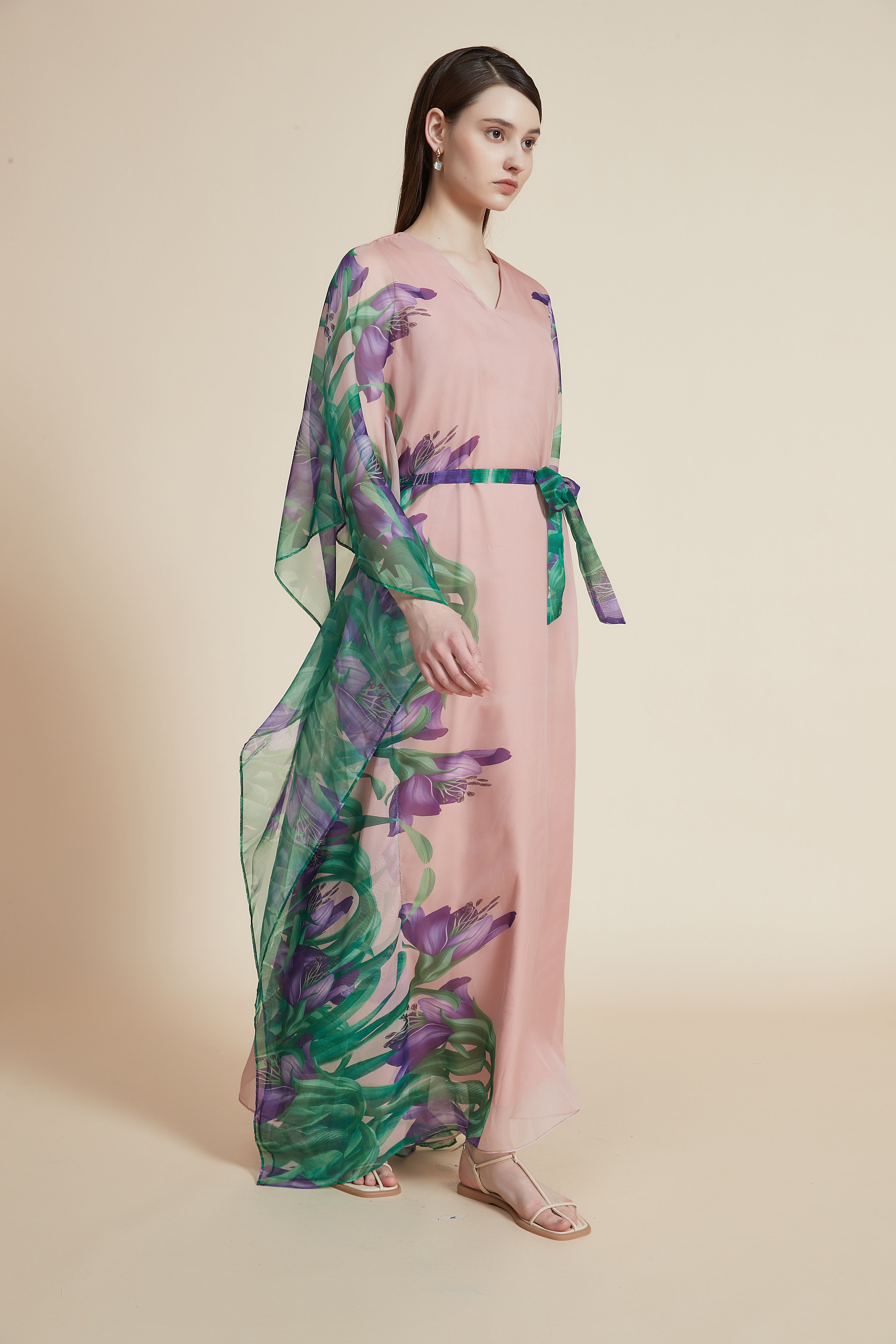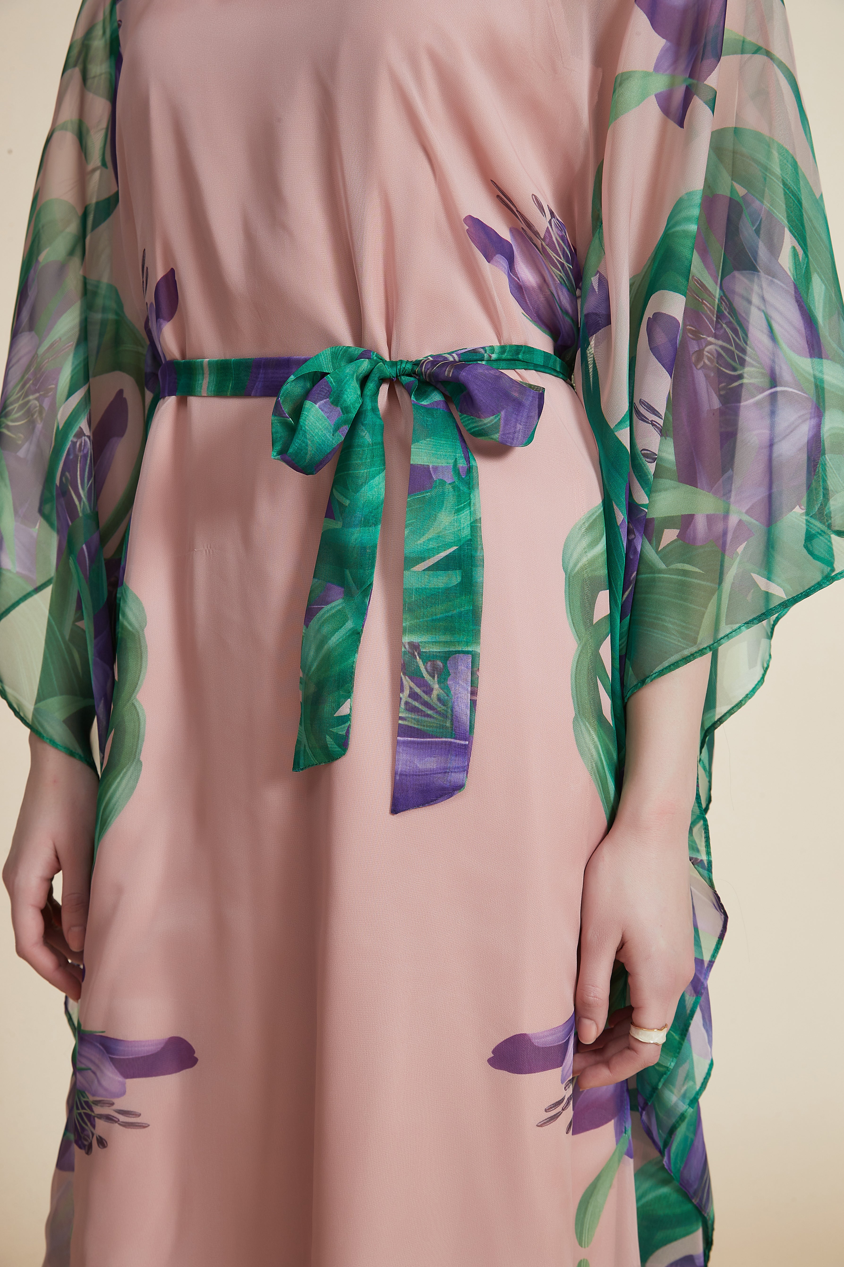 لو ترغبين في فستان ماكسي يجمع بين الراحة والمظهر المواكب للموضة، هذا الفستان رائع. بخامة رفيعة وبدون بطانة يعطي إحساسًا خفيفًا في كل المواسم، وستحبين كيف يتحرك معك عند المشي. تصميمه بقصة A وقصة عادية يمنح انسيابية وأنوثة دون تباطؤ، وياقة V تكمل الرقبة بشكل جذاب، وأكمام كم كيمونو طويلة تضيف لمسة عصرية. النقشة زهور بطباعة رقمية ودرجات وردي متعدد الألوان تضفي حيوية مرحة، ويُغلق بحزام مرفق لتحديد الخصر. مناسب للخروجات الكاجوال والمشاوير اليومية وحتى الخروجات الرومانسية؛ مثالي لخزانة ملابسك الصيفية والربيعية. ملاحظة عملية: بدون جيوب ومصمم للنساء البالغات الباحثات عن قطعة رقيقة وعصرية. اعثري على مقاسك في فاشن السعودية وأضيفي هذه القطعة المتنوعة إلى خزانة ملابسك اليوم.