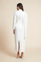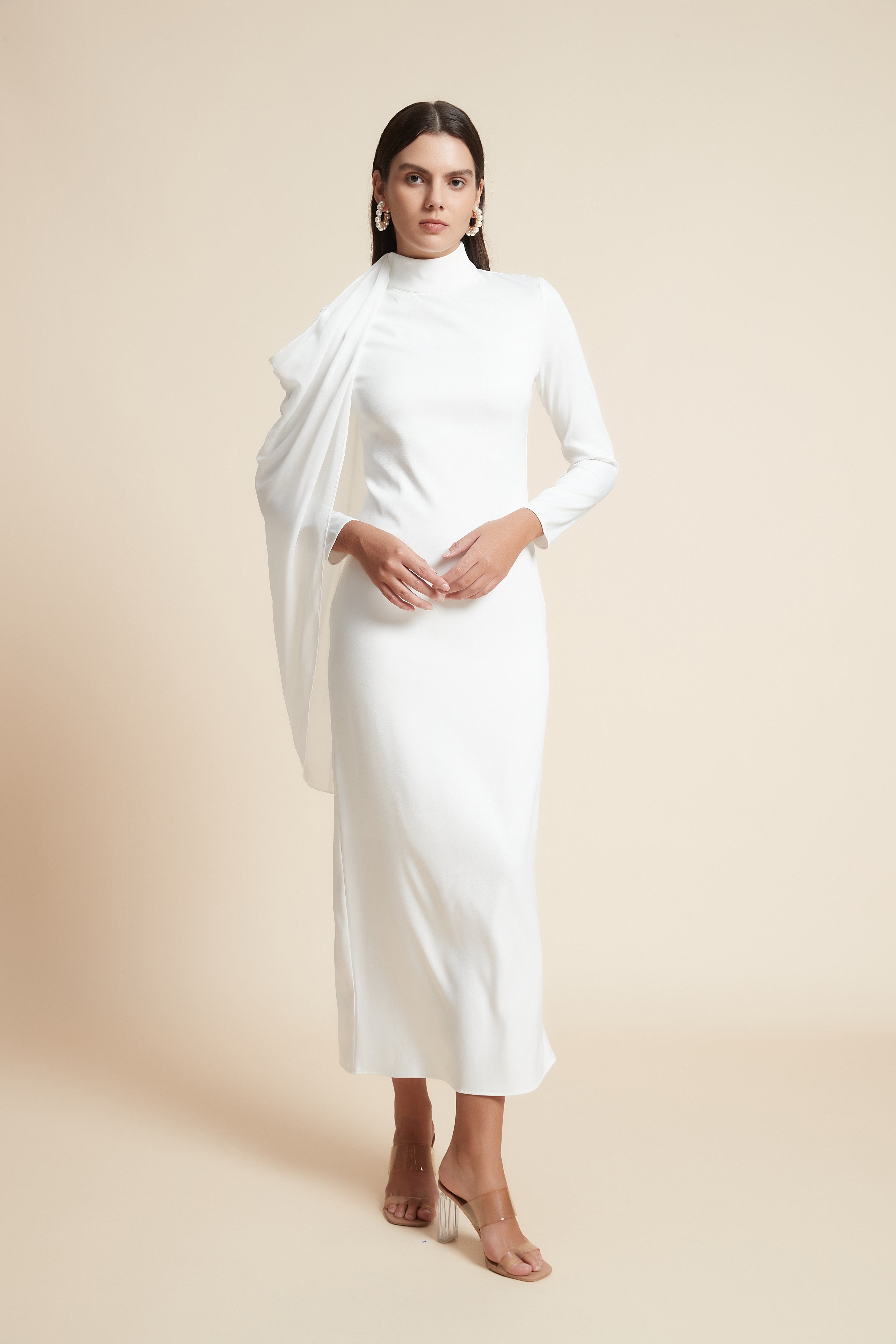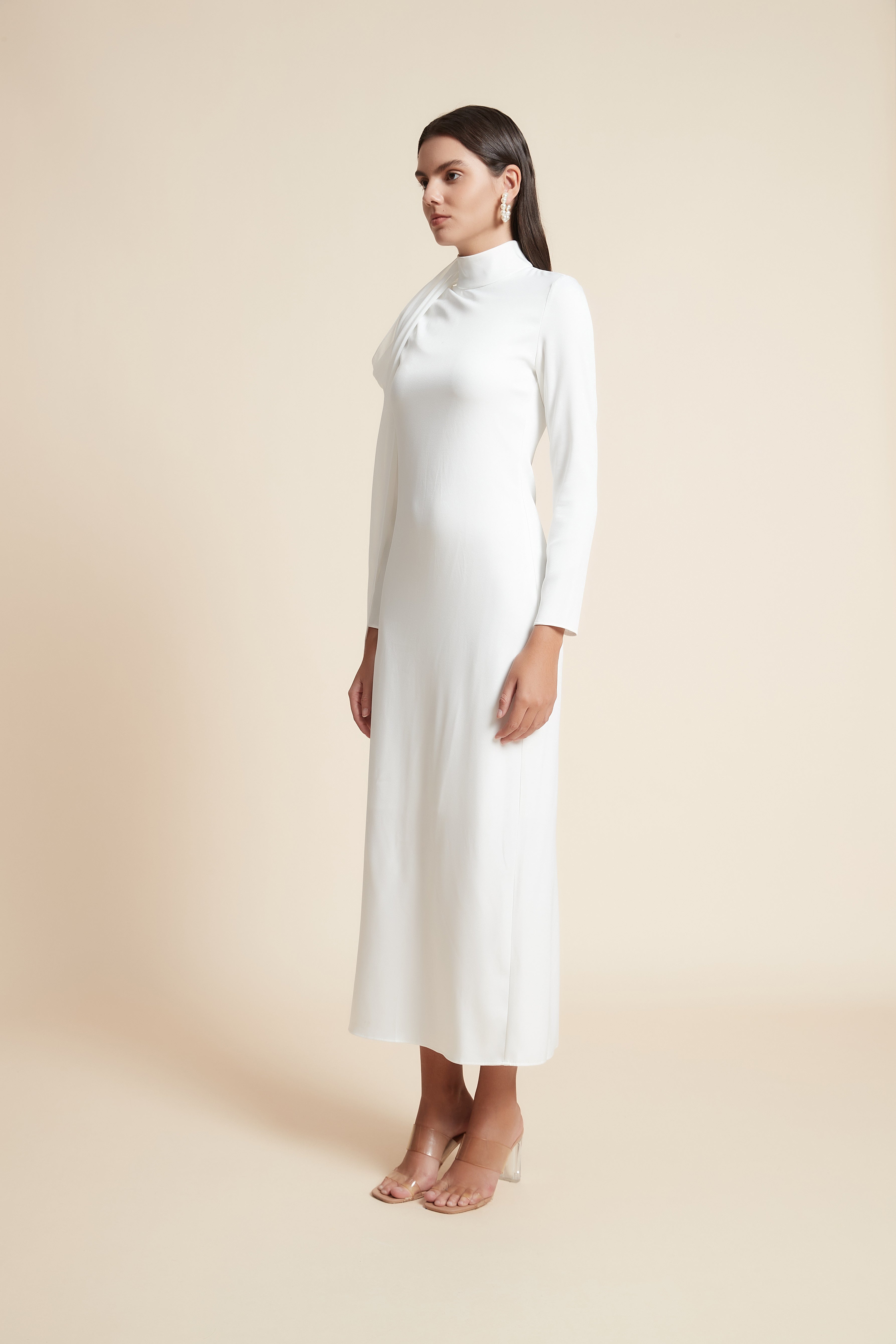 فستان ميدي بياقة مرتفعة وكم طويل سادة