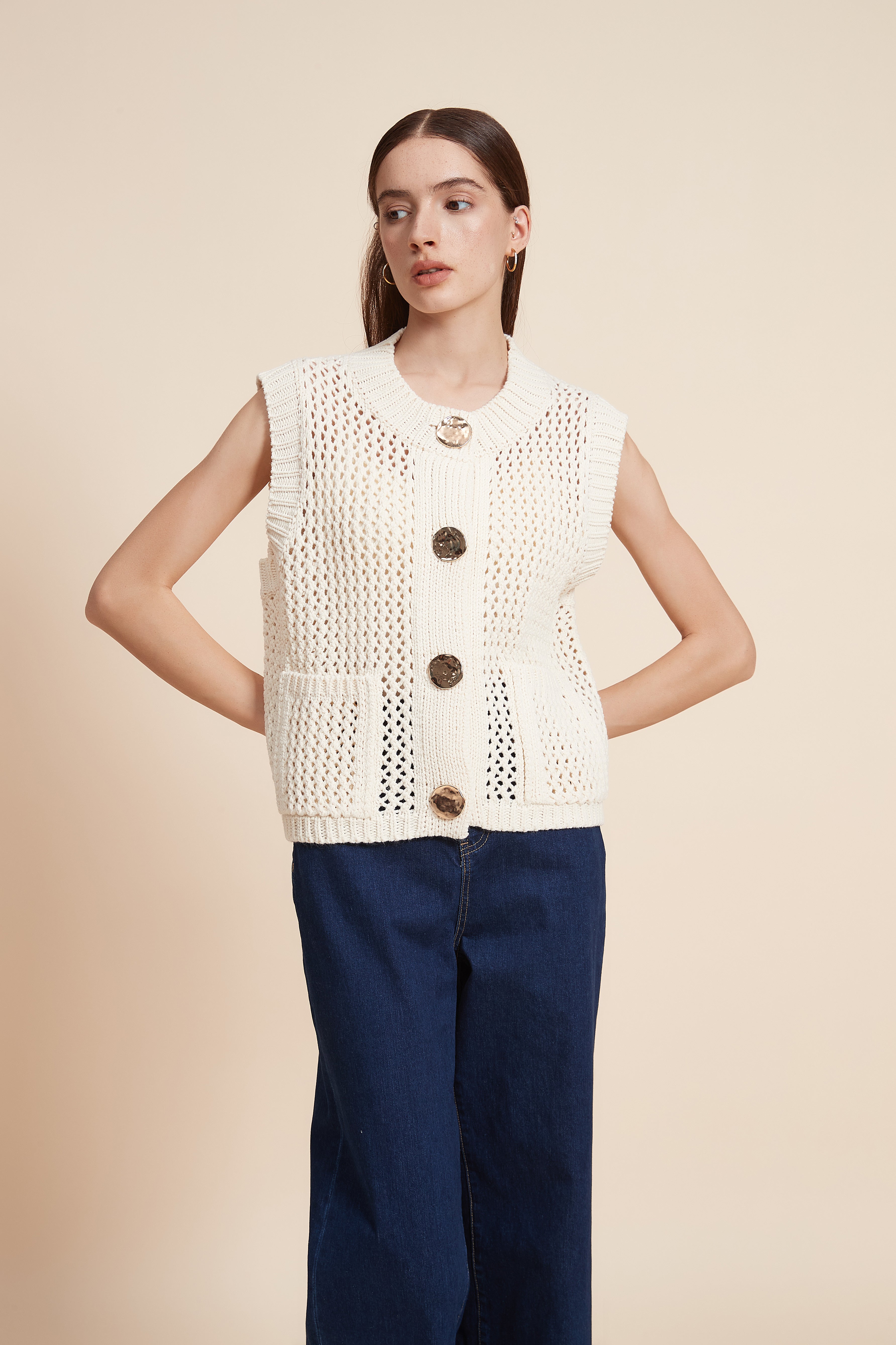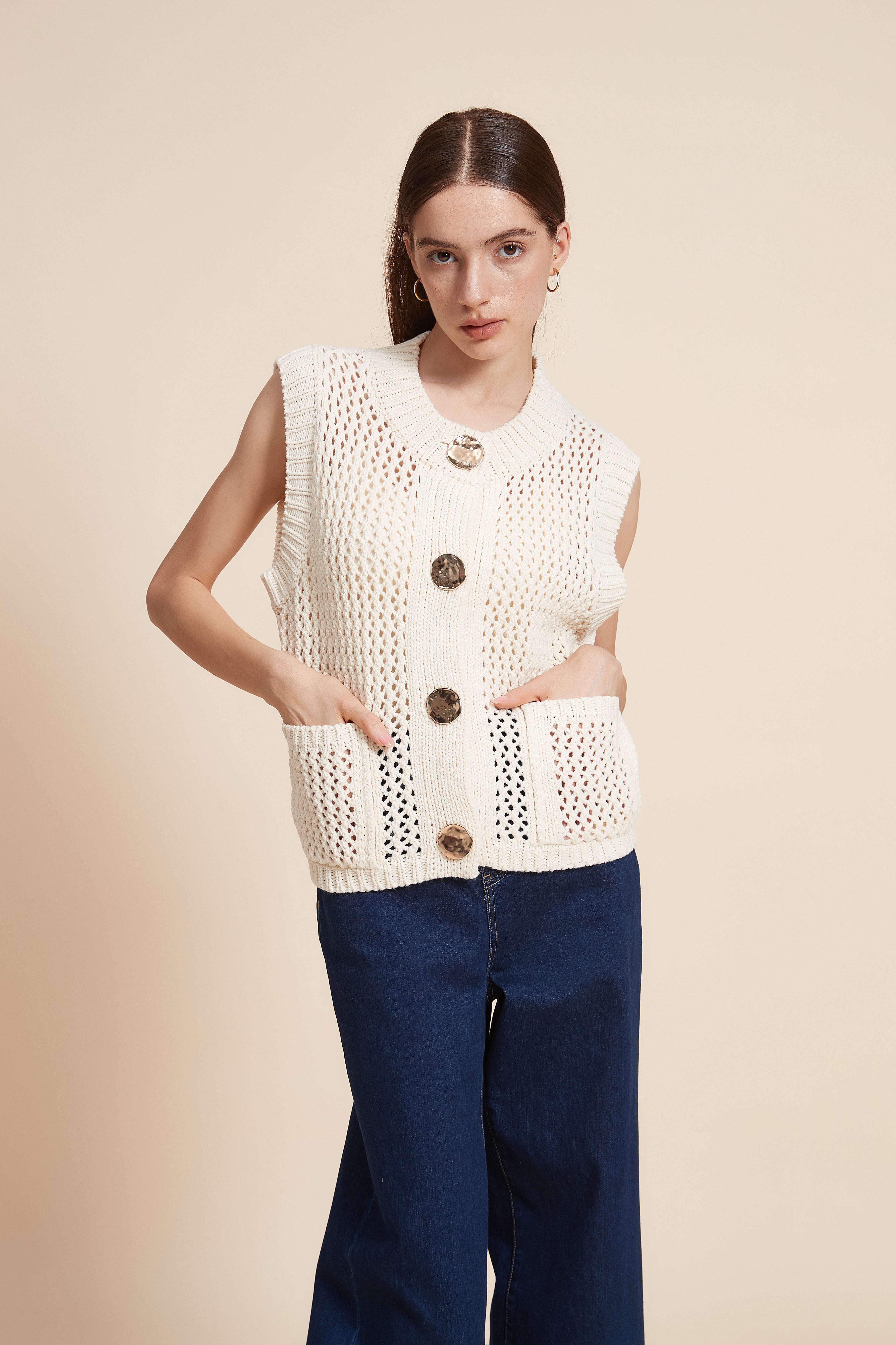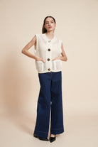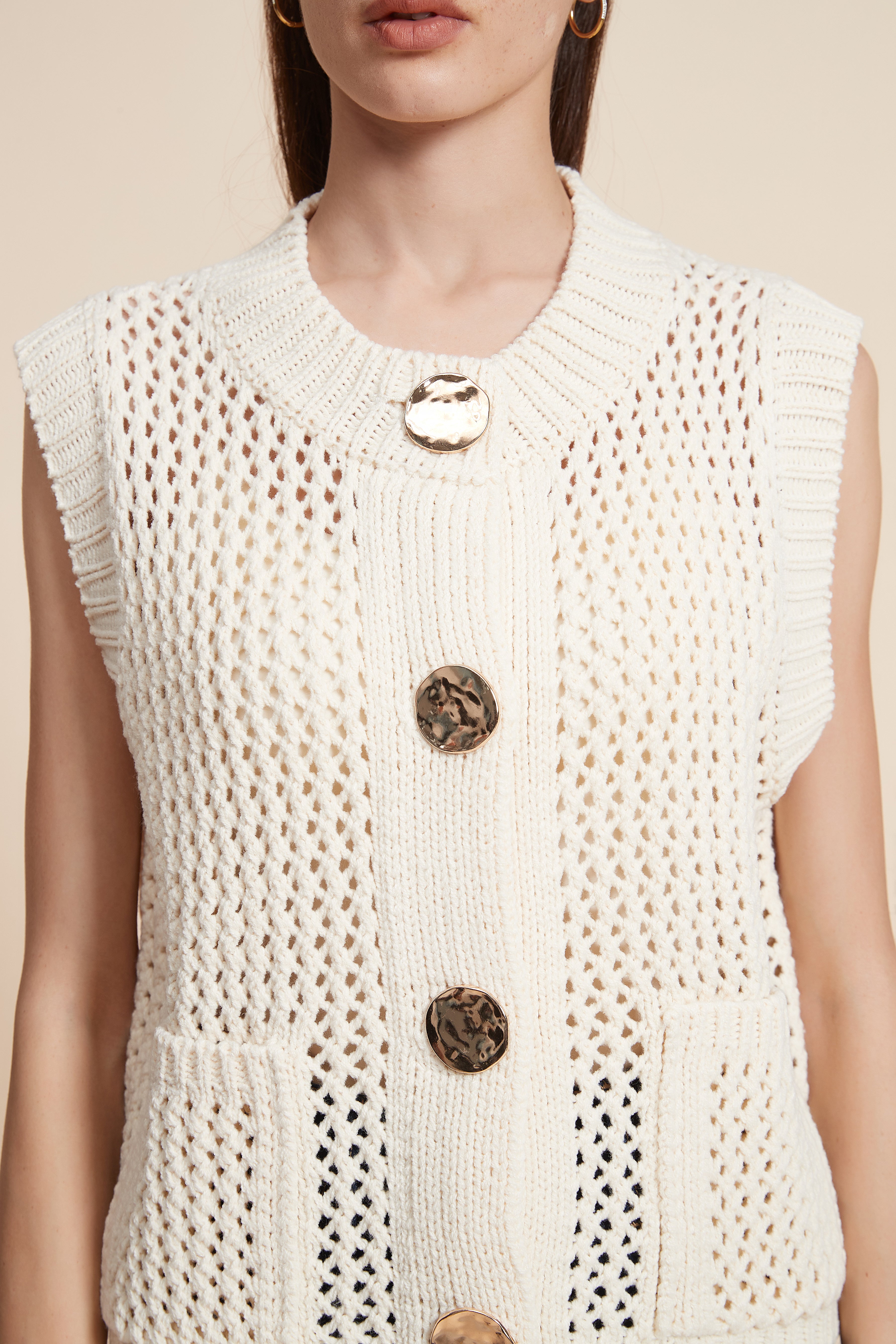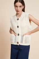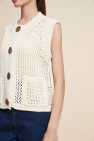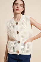 كنزة بدون كم مخرمة بأزرار أمامية
