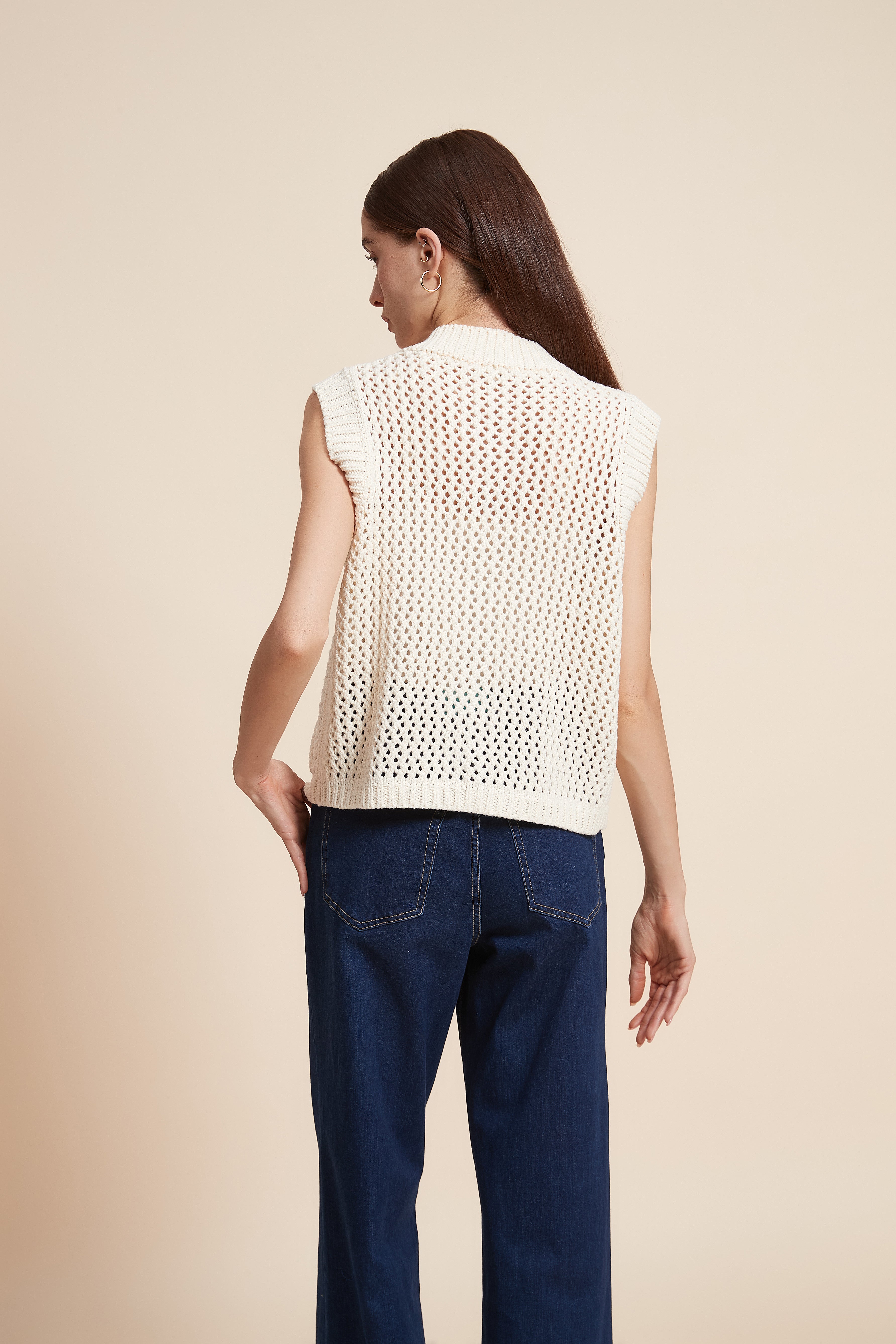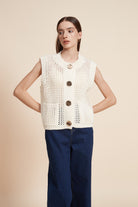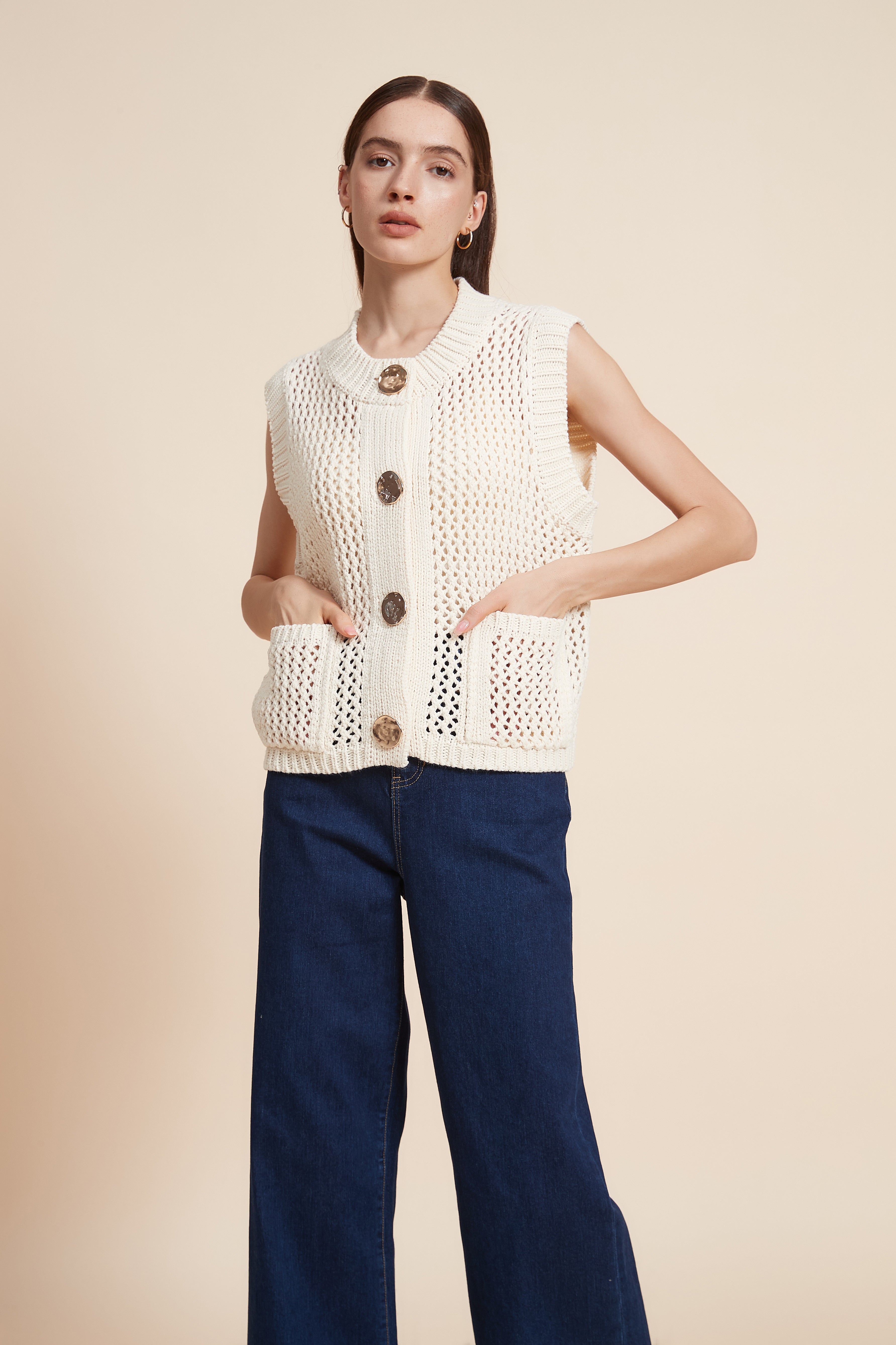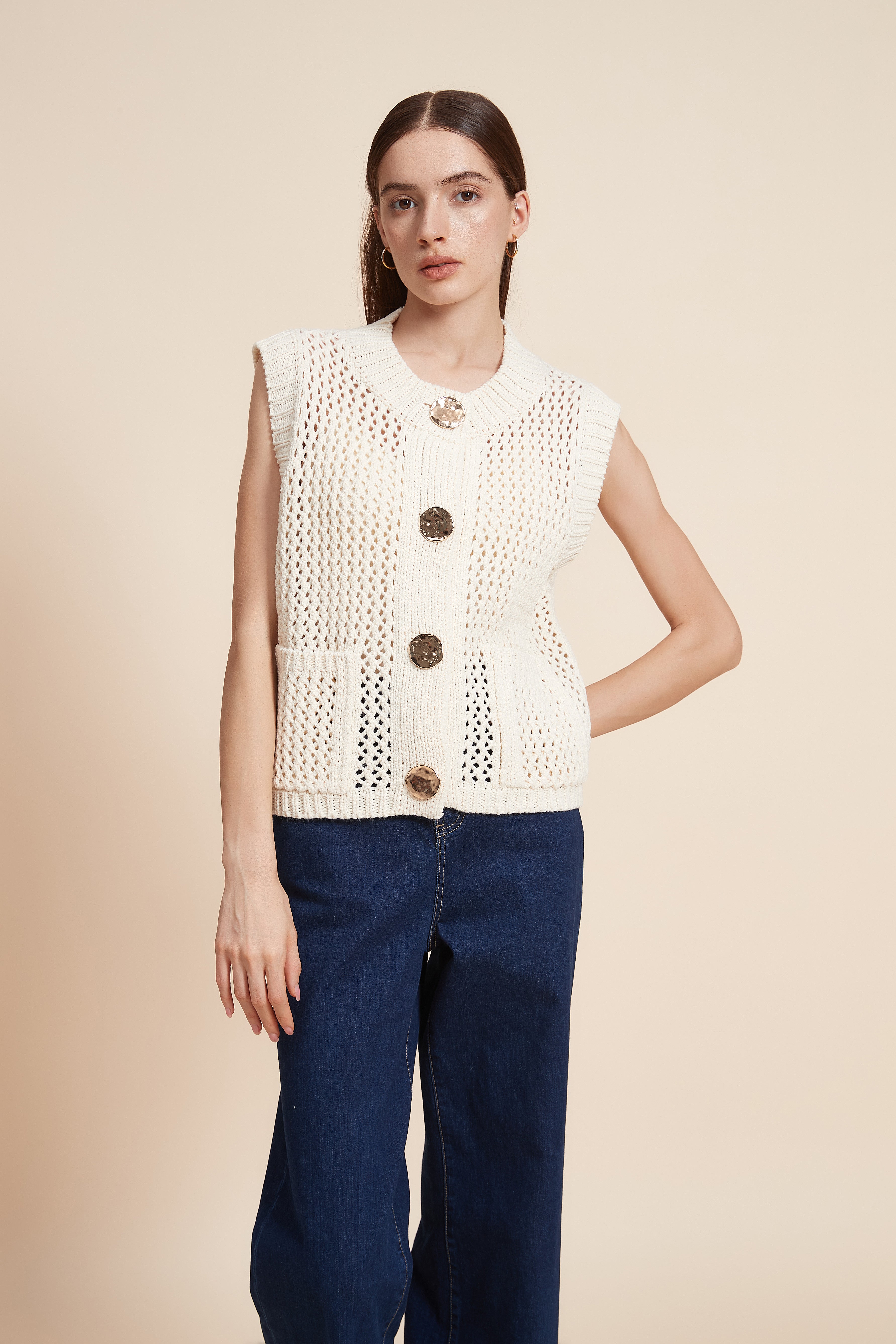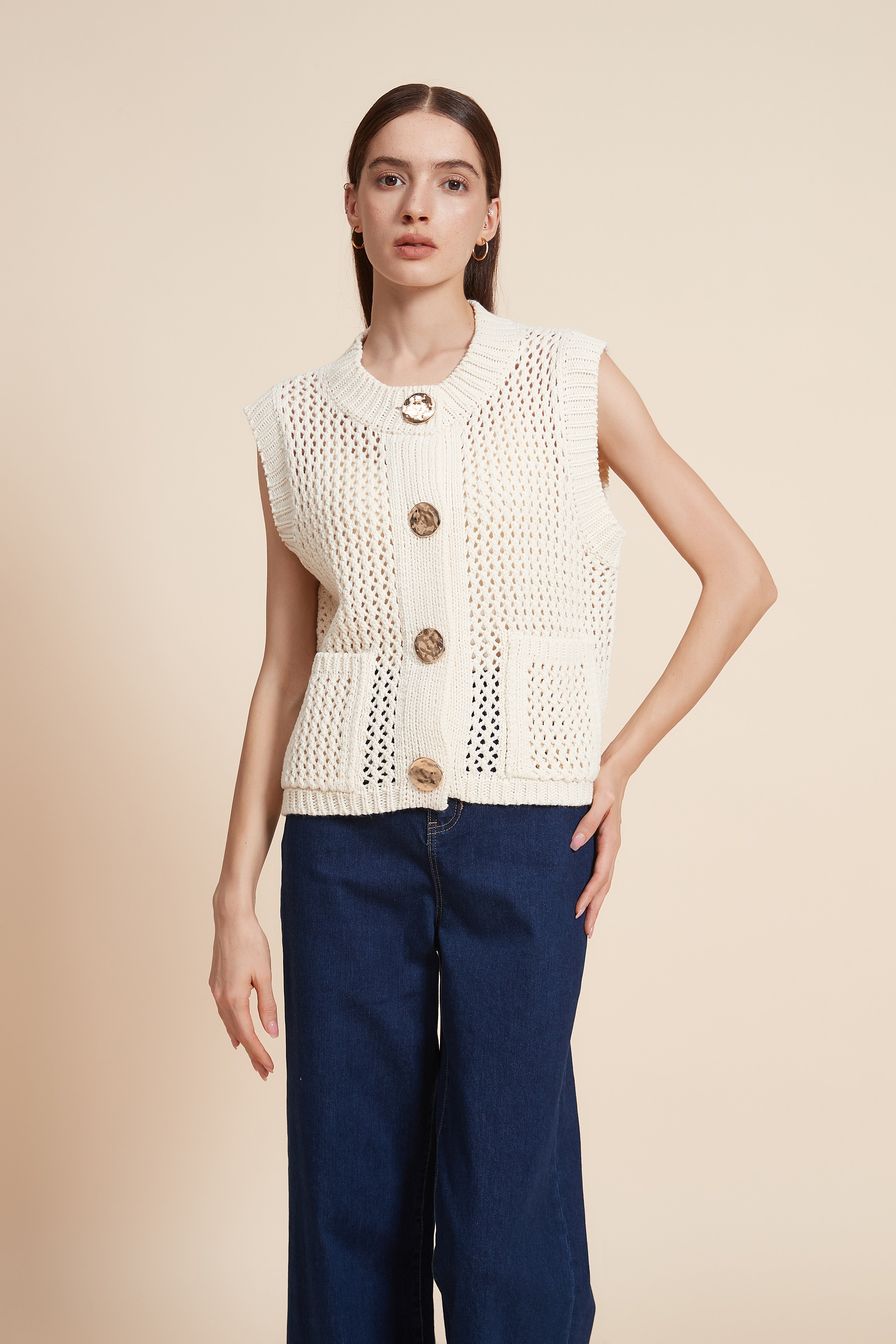 كنزة بدون كم مخرمة بأزرار أمامية