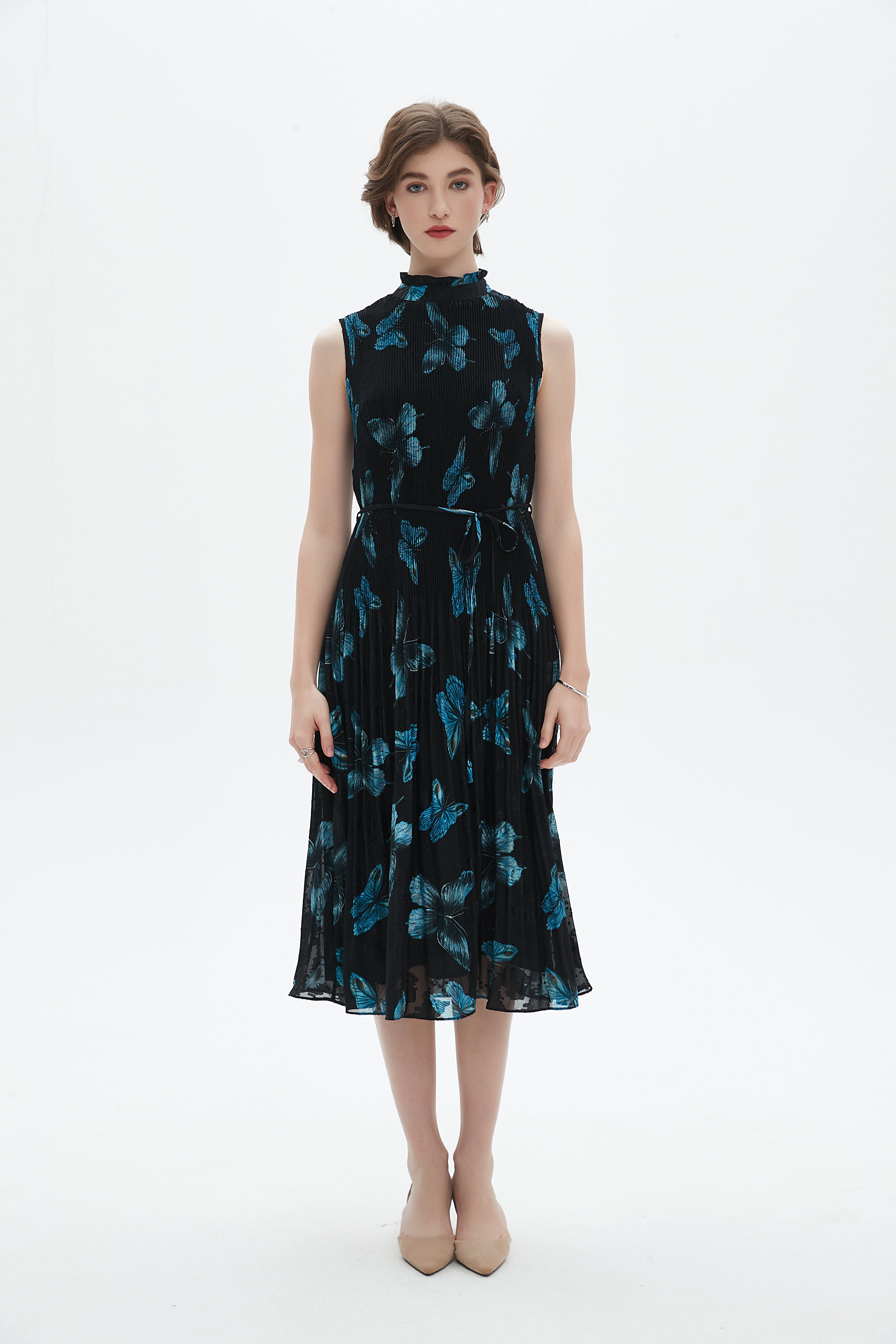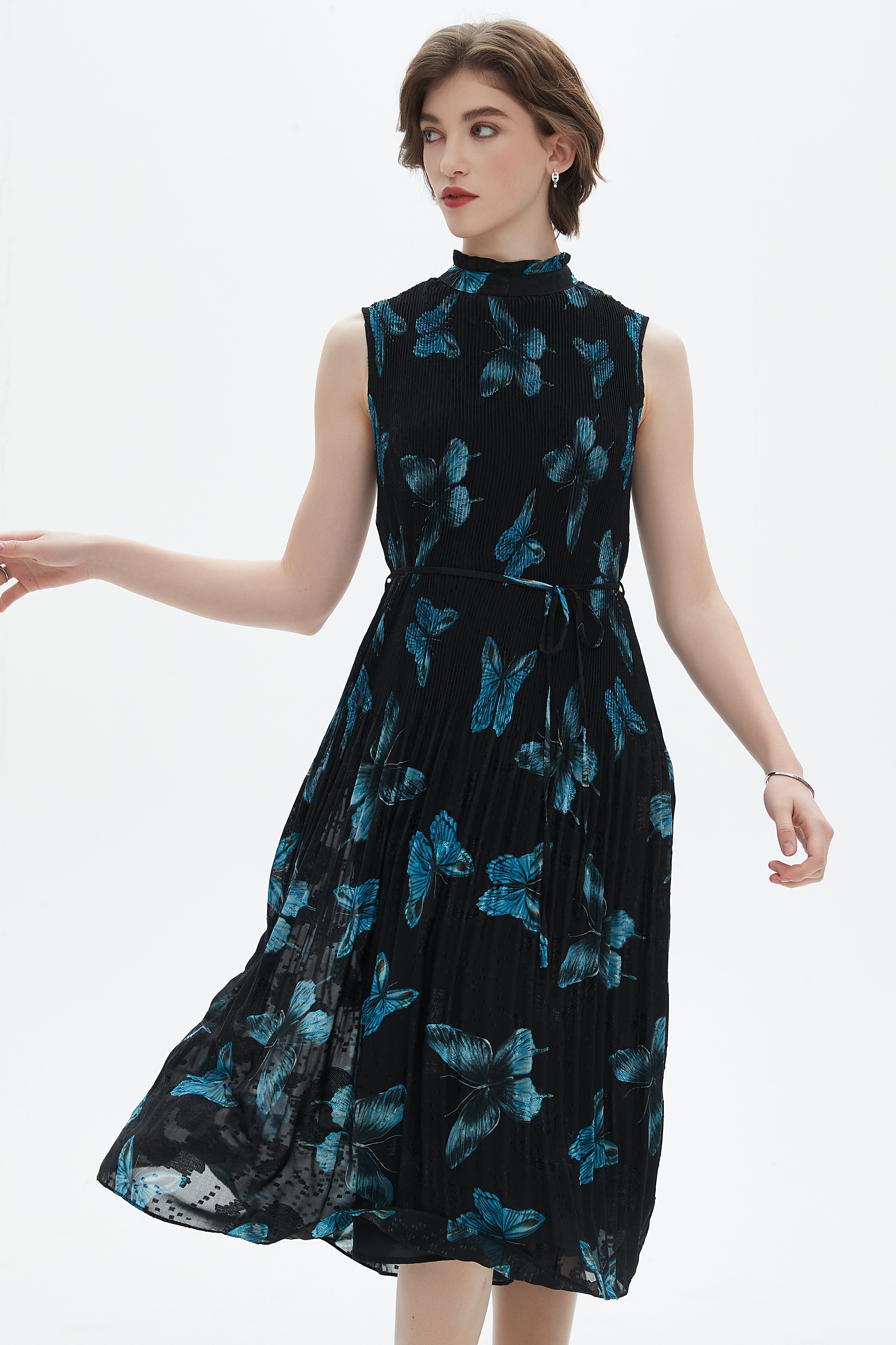 فستان نسائي ميدي كات مطبوع فراشات بليسية برقبة عالية