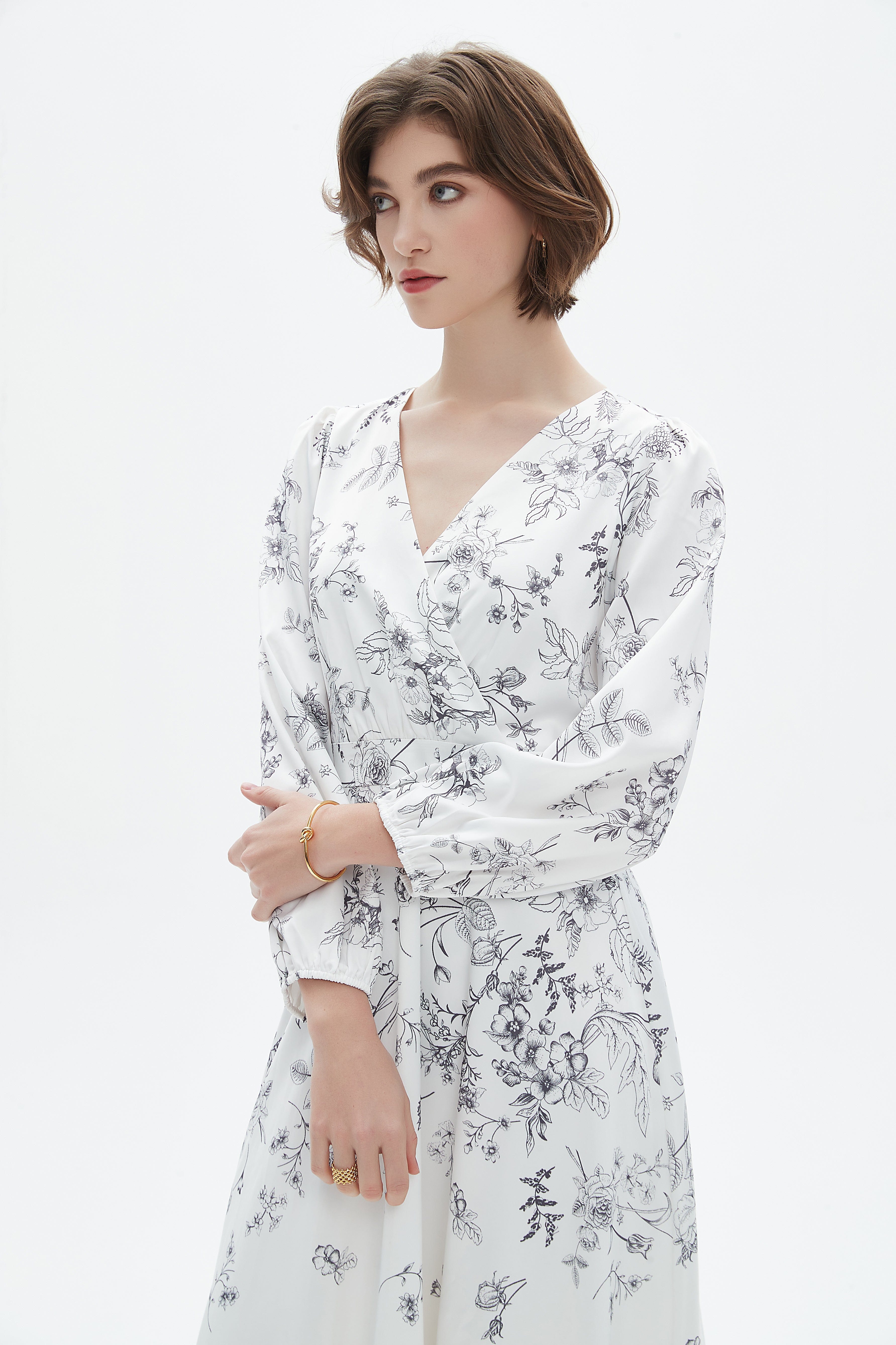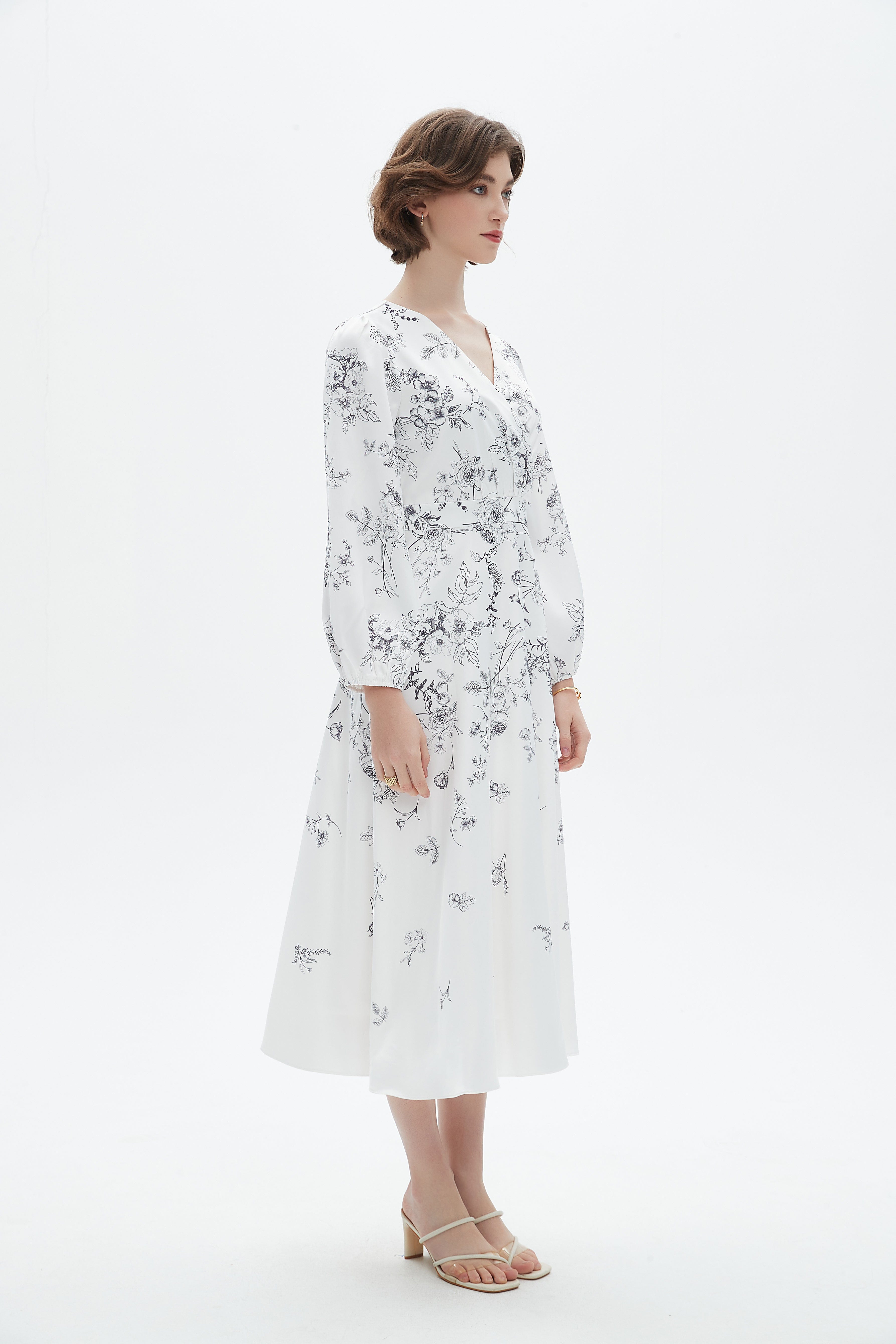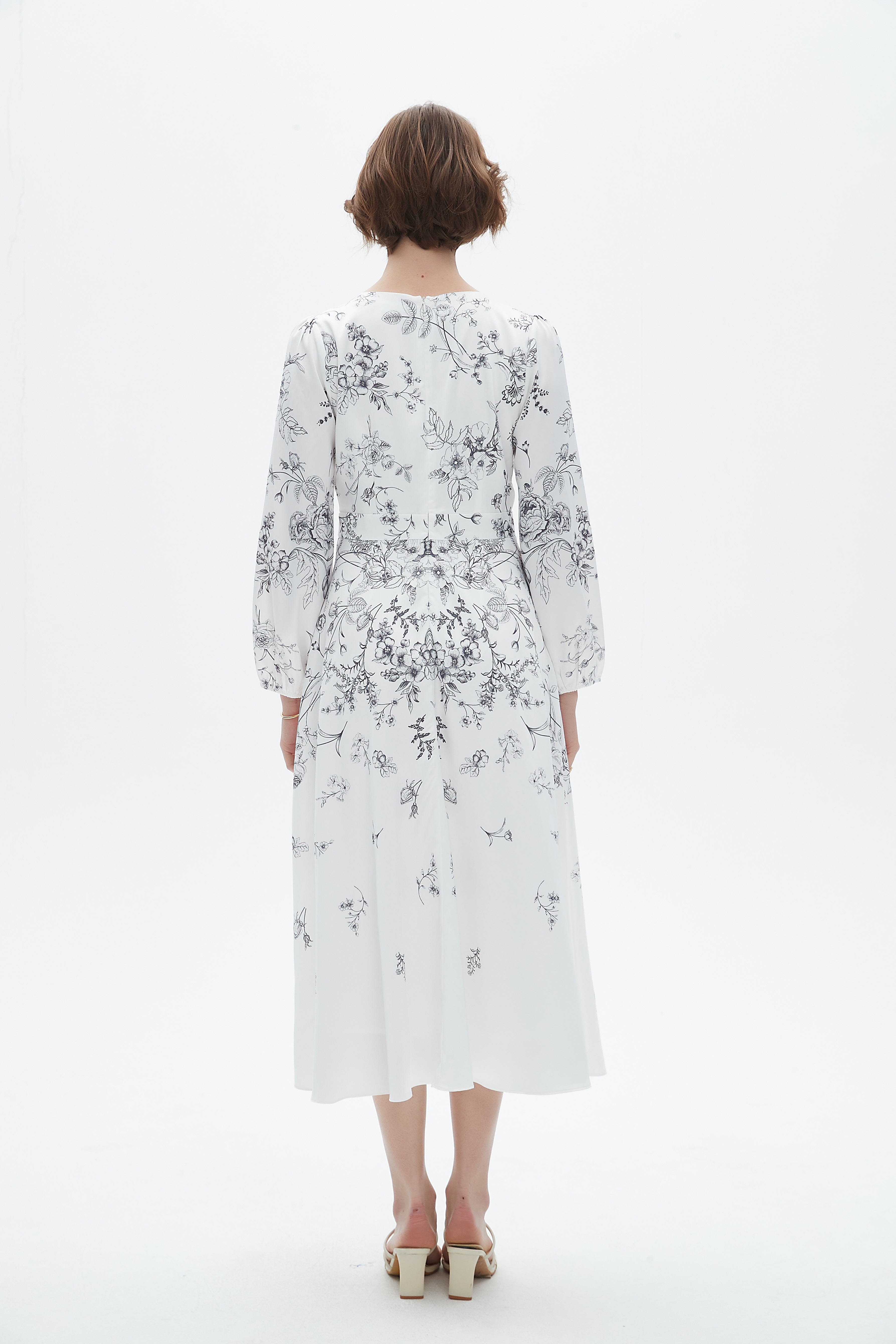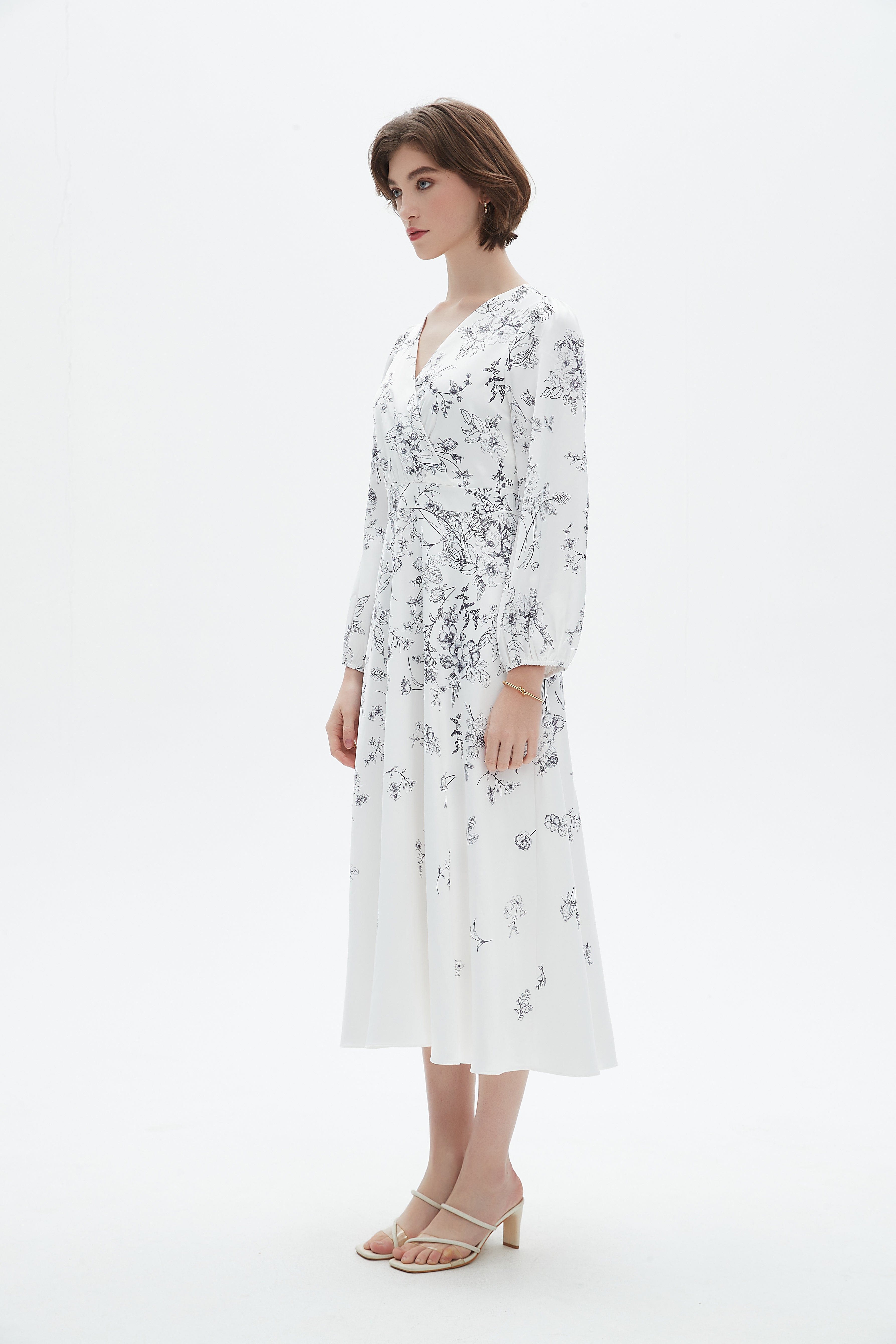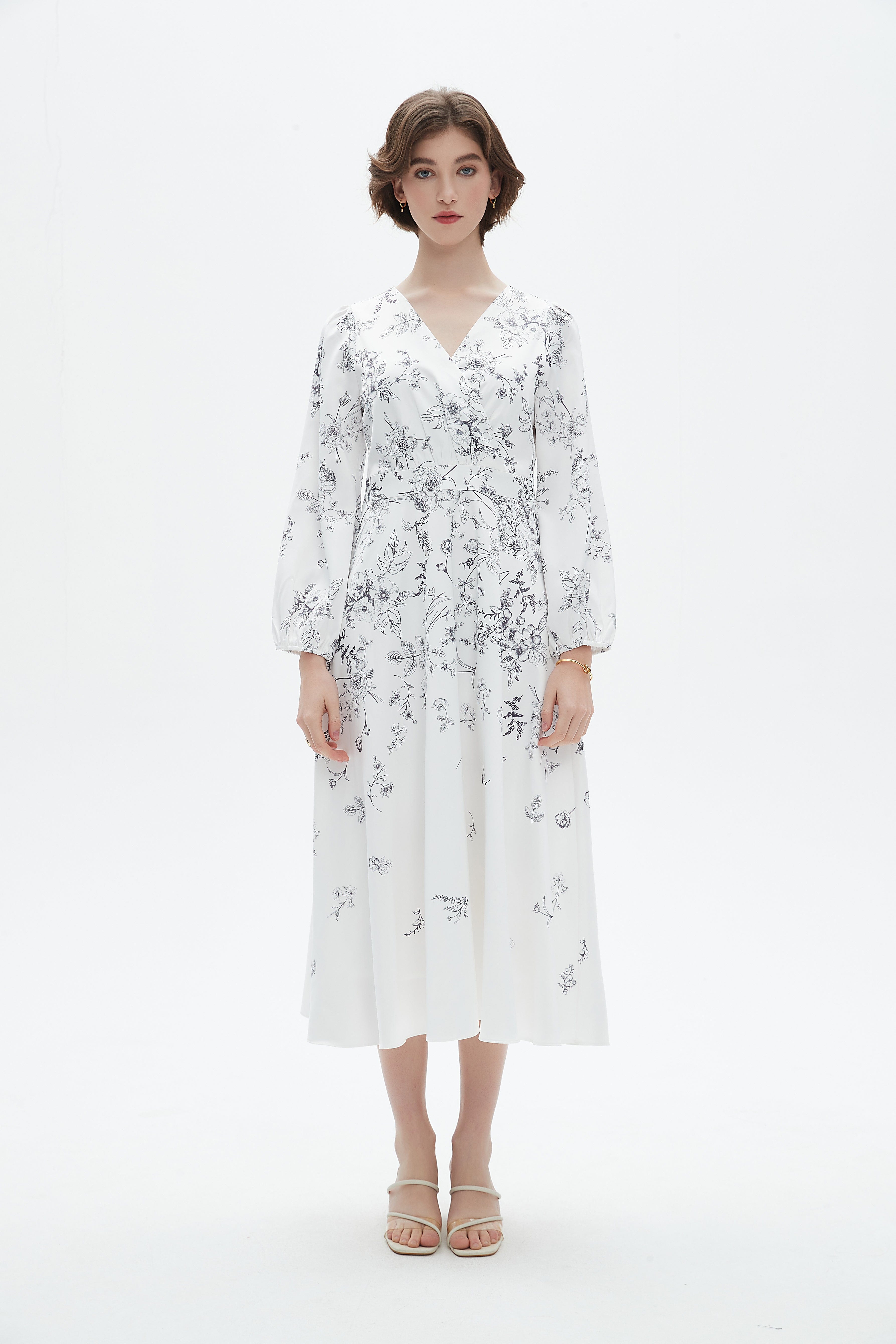 فستان ميدي مشجر بكم طويل واسع وفتحة رقبة على شكل V