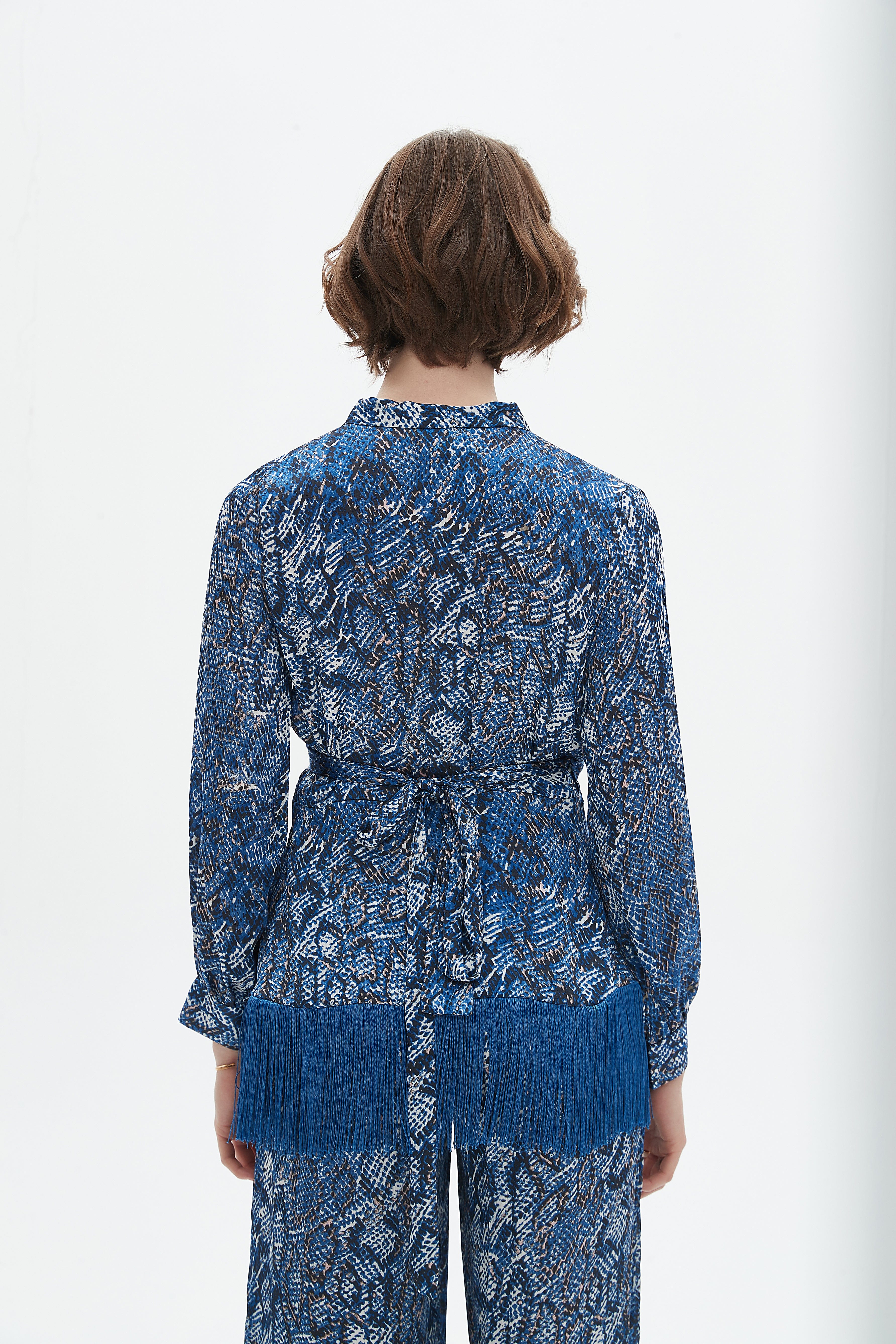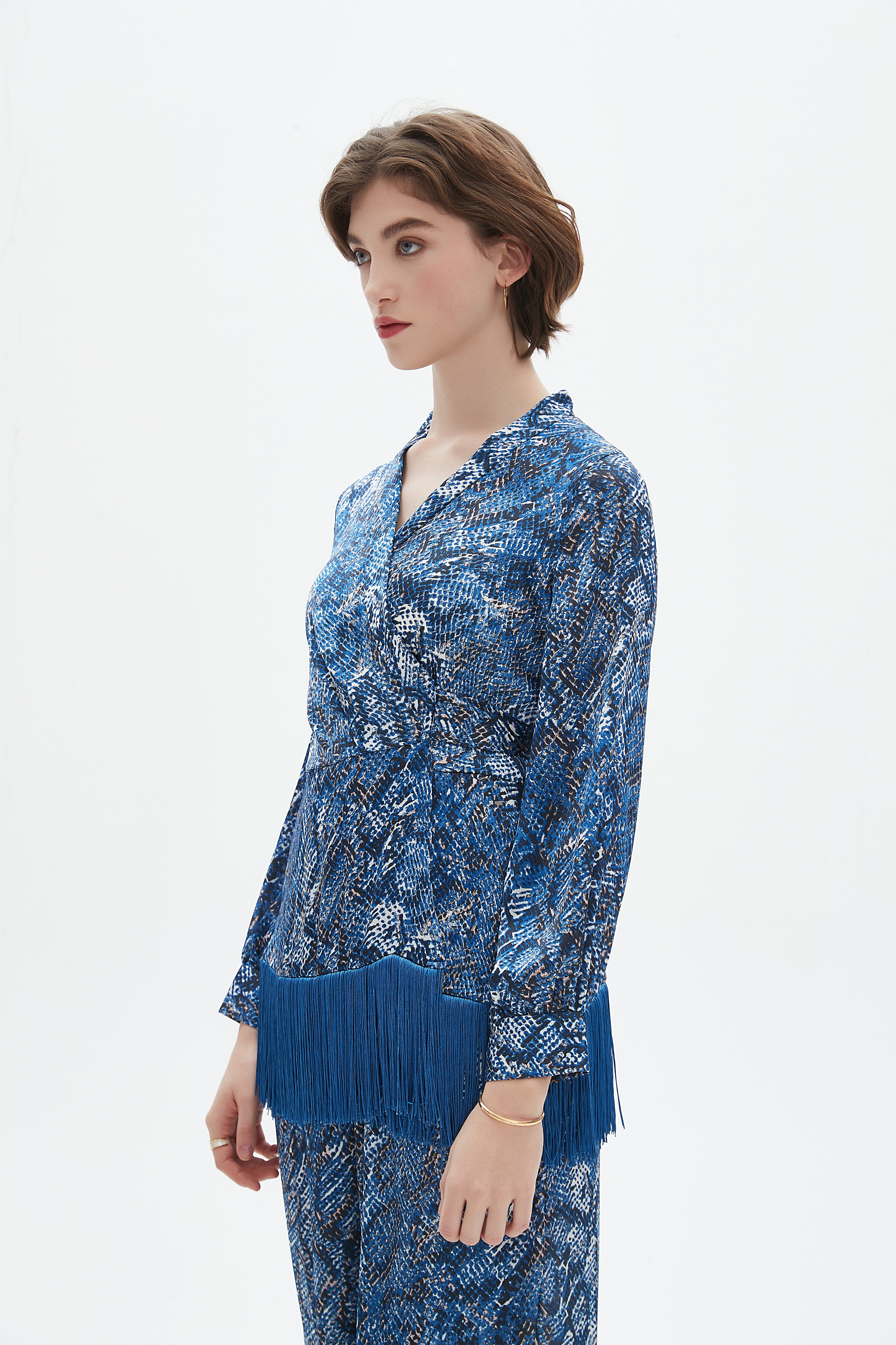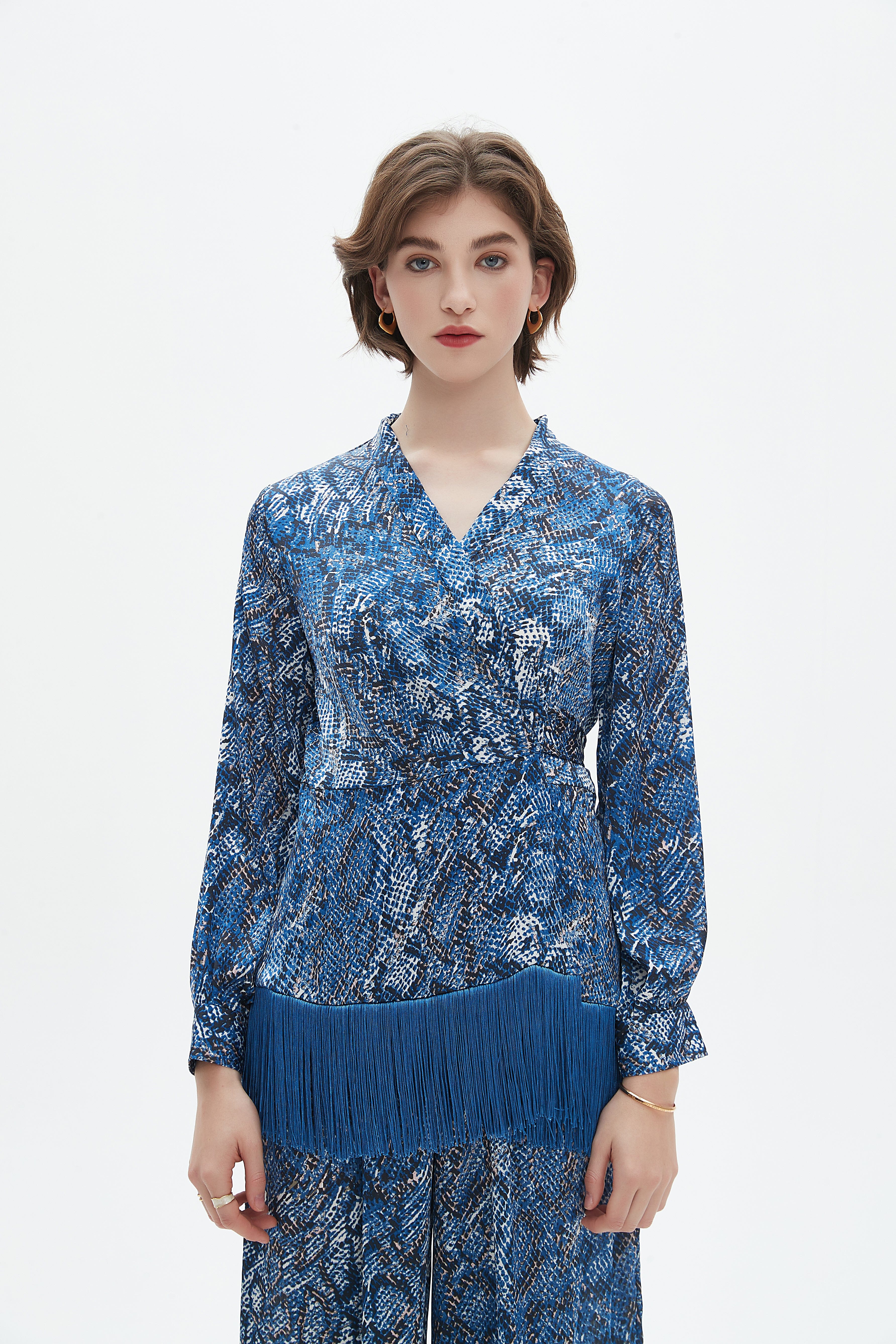 بلوزة نسائية كم طويل مشجرة وبشراشيب فتحة رقبة على شكل V