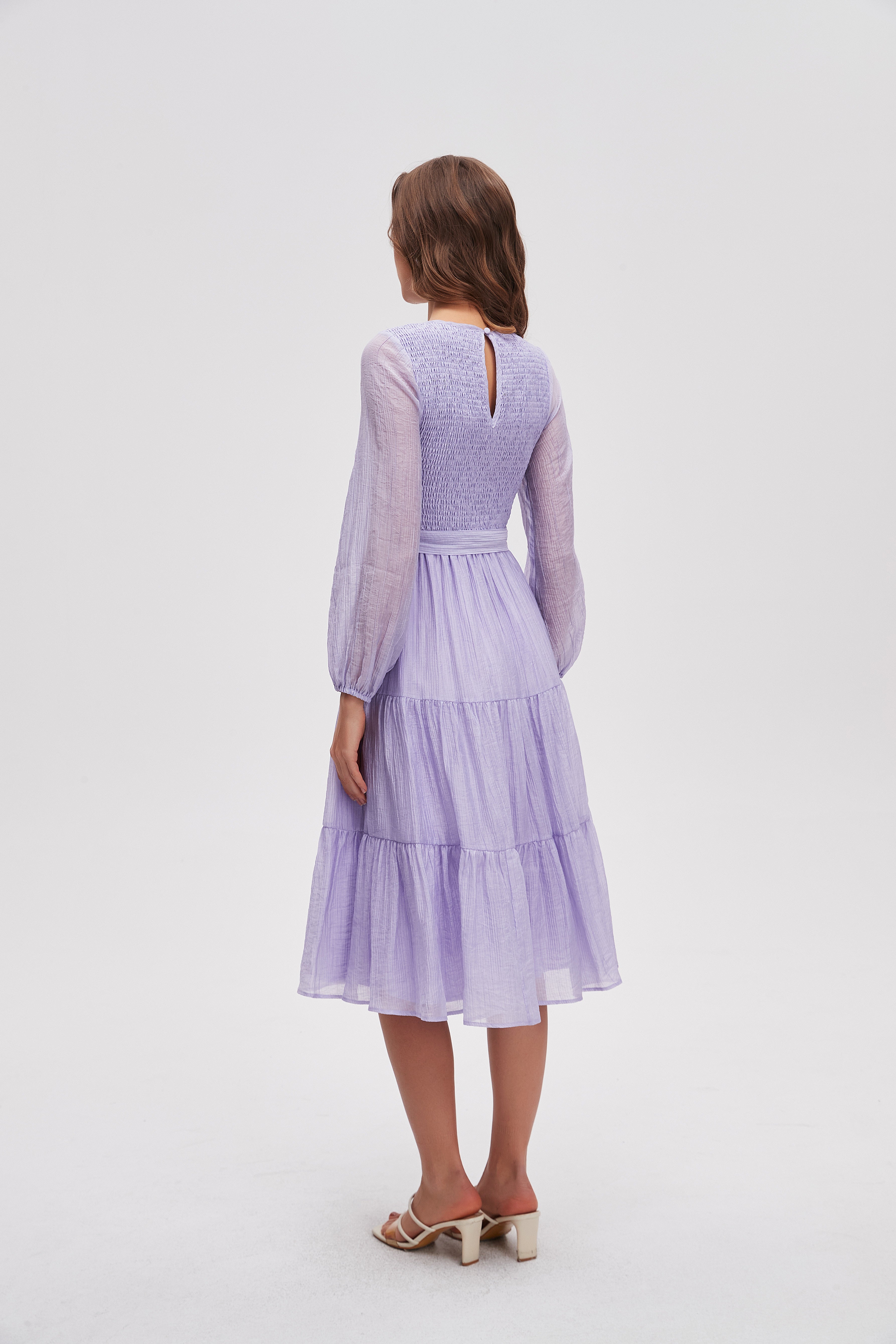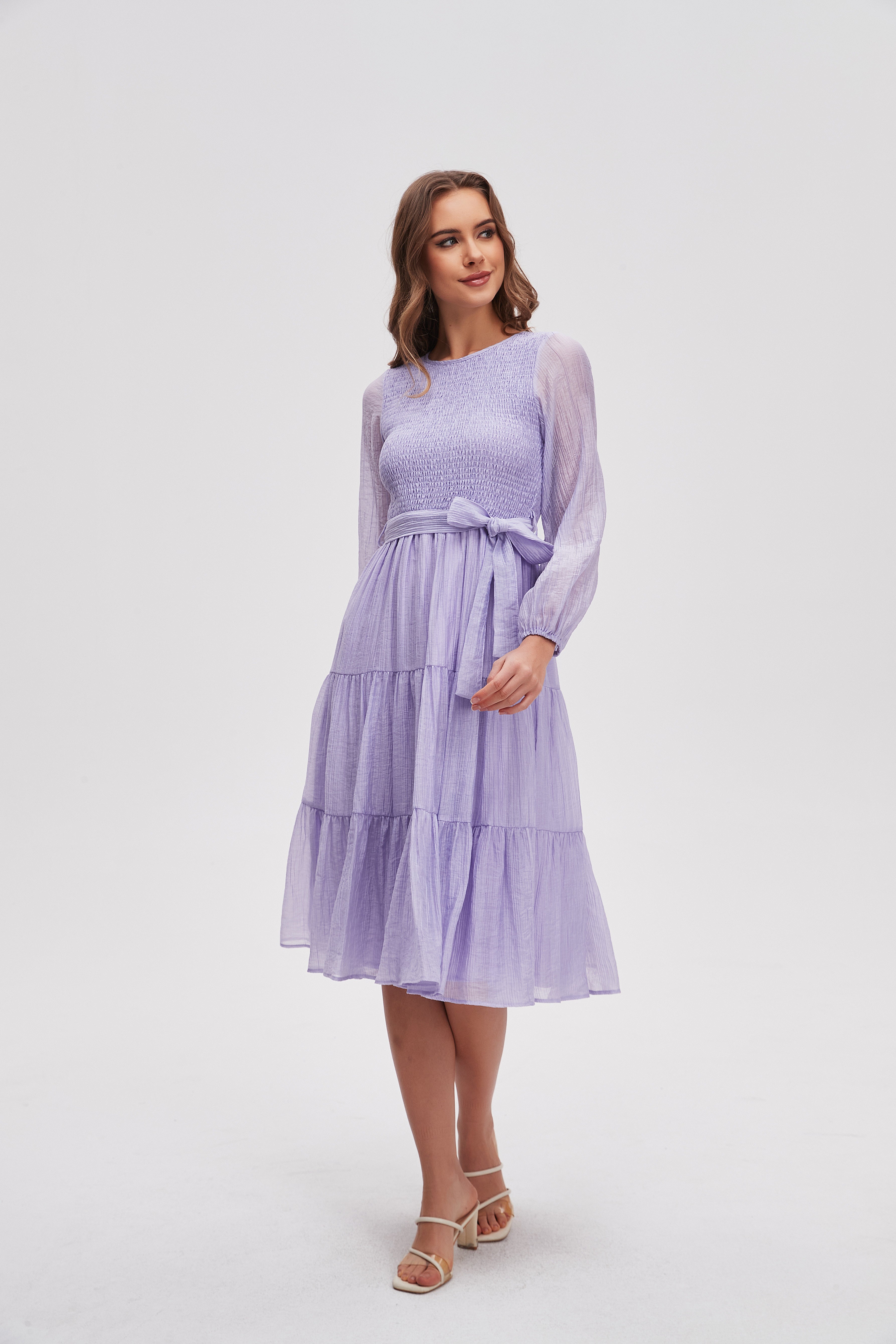 فستان ميدي سادة كم طويل بحزام