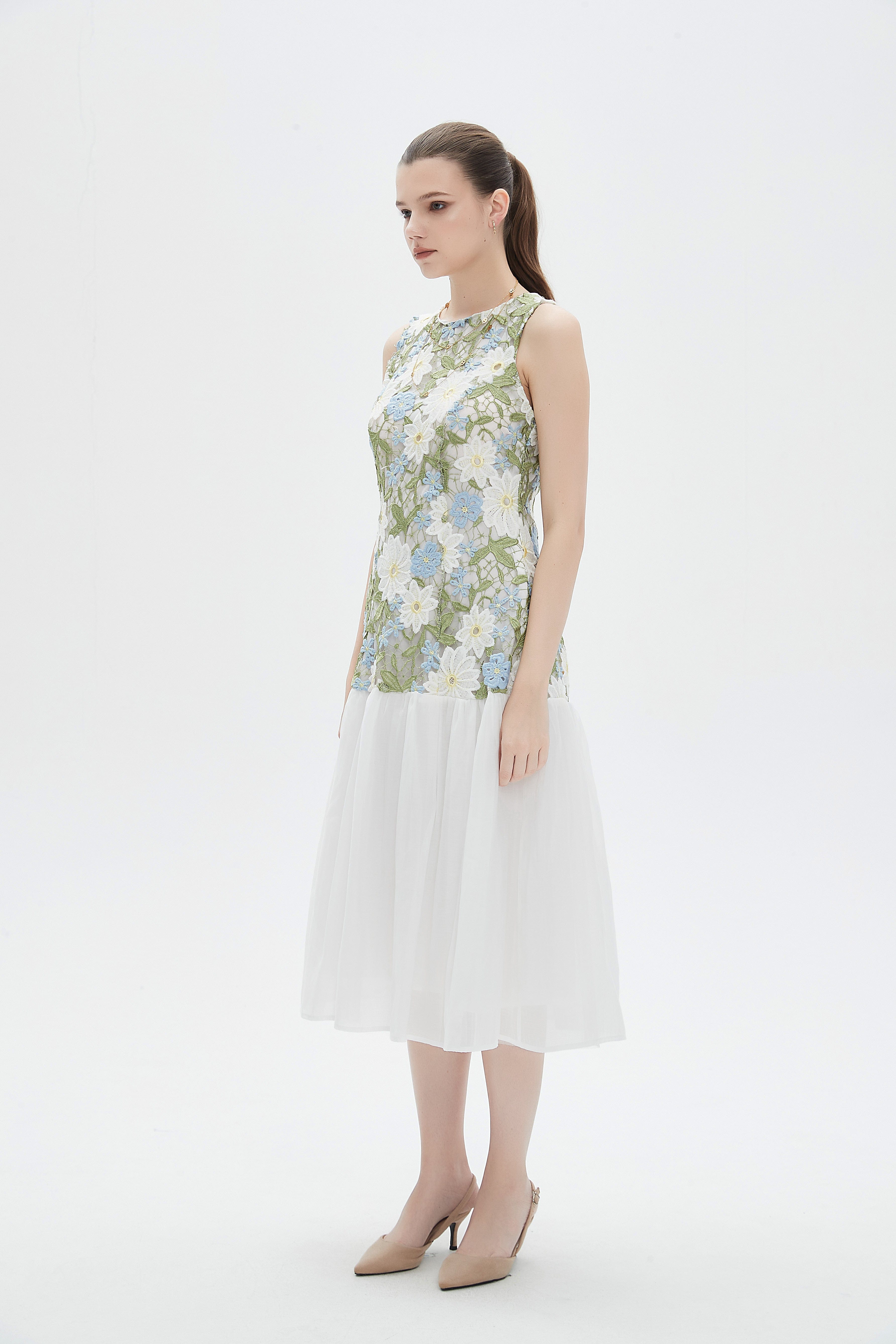 فستان ميدي بدون اكمام مشجر ومكشكش من الاسفل بفتحة رقبة دائرية