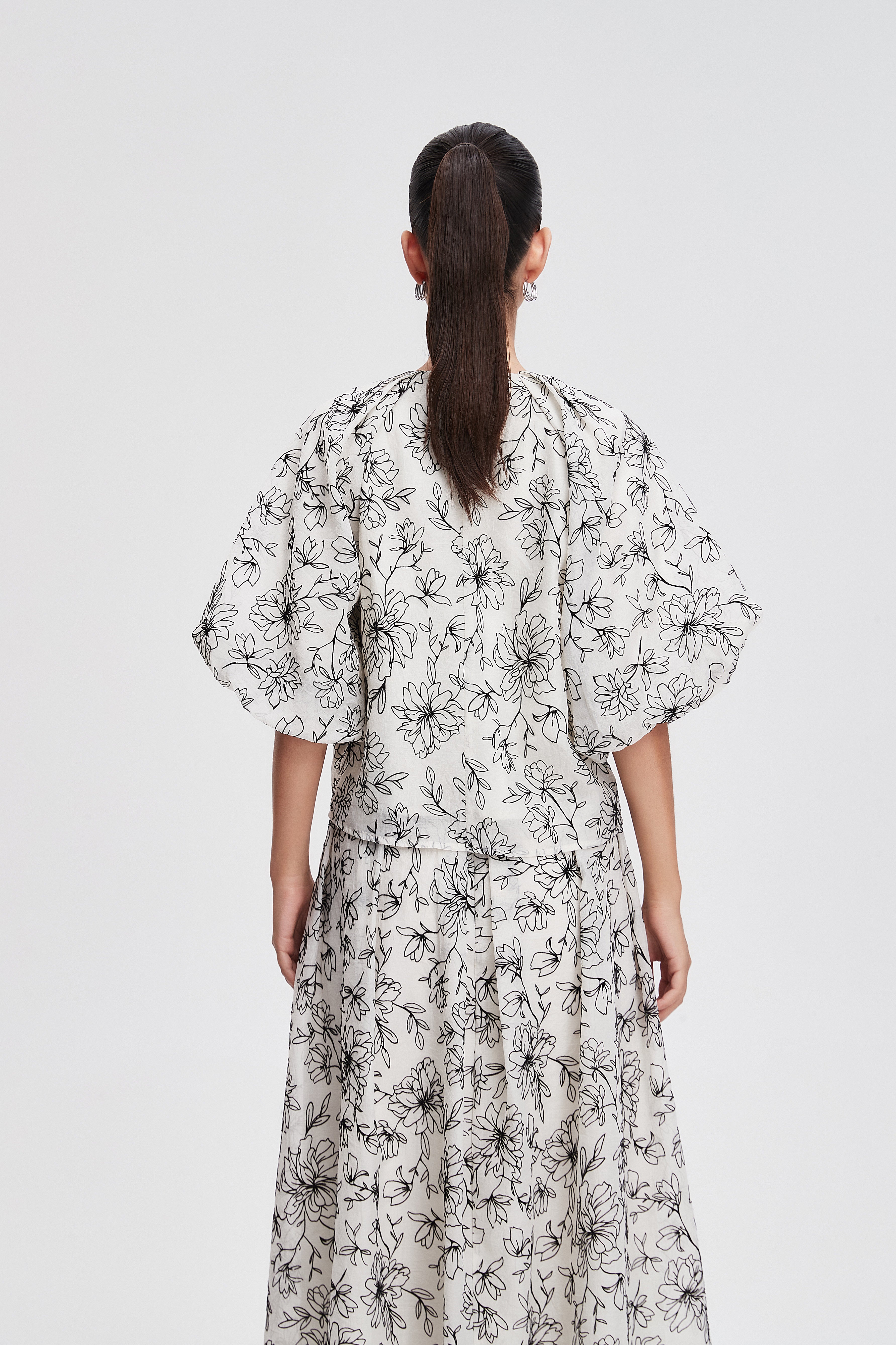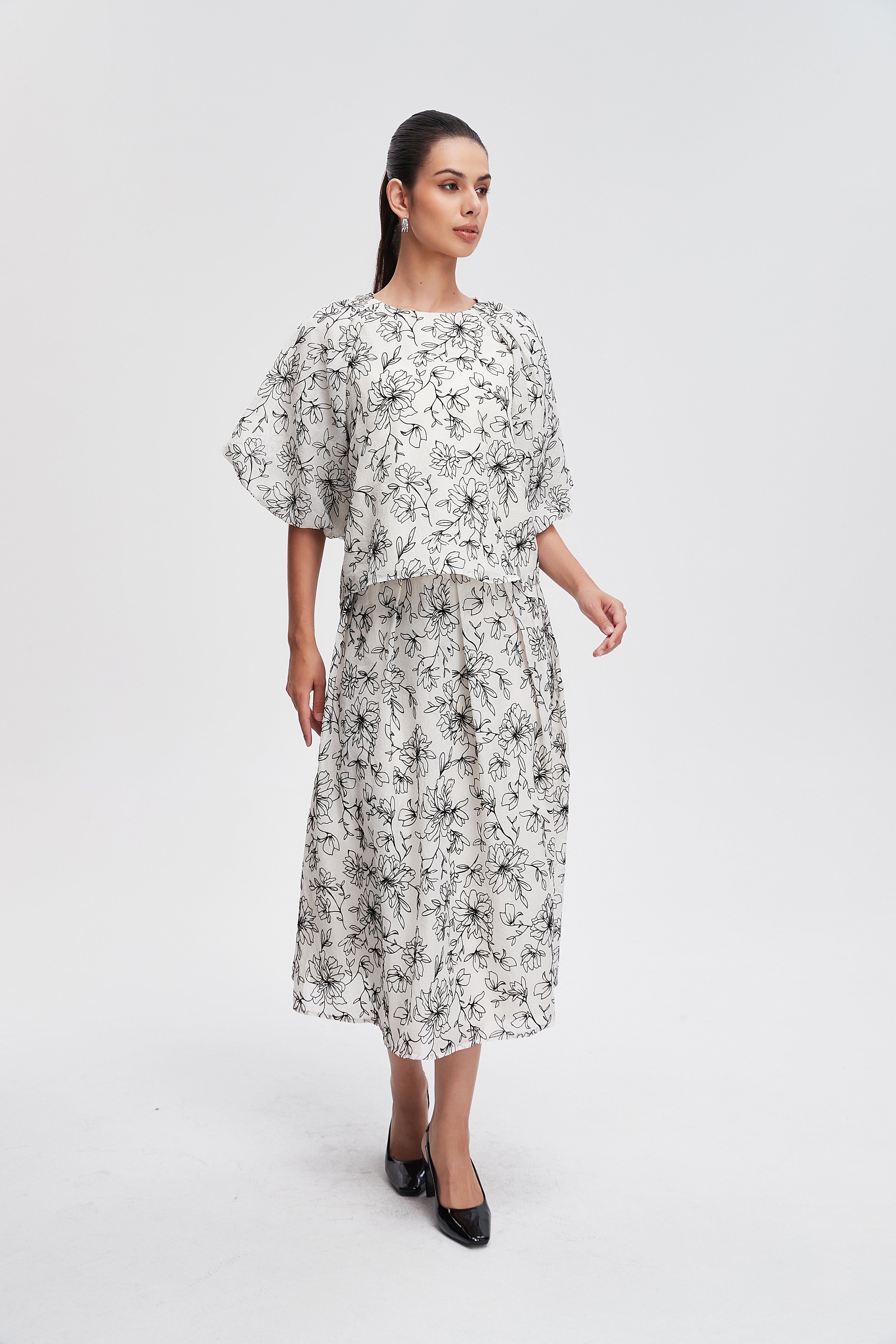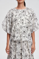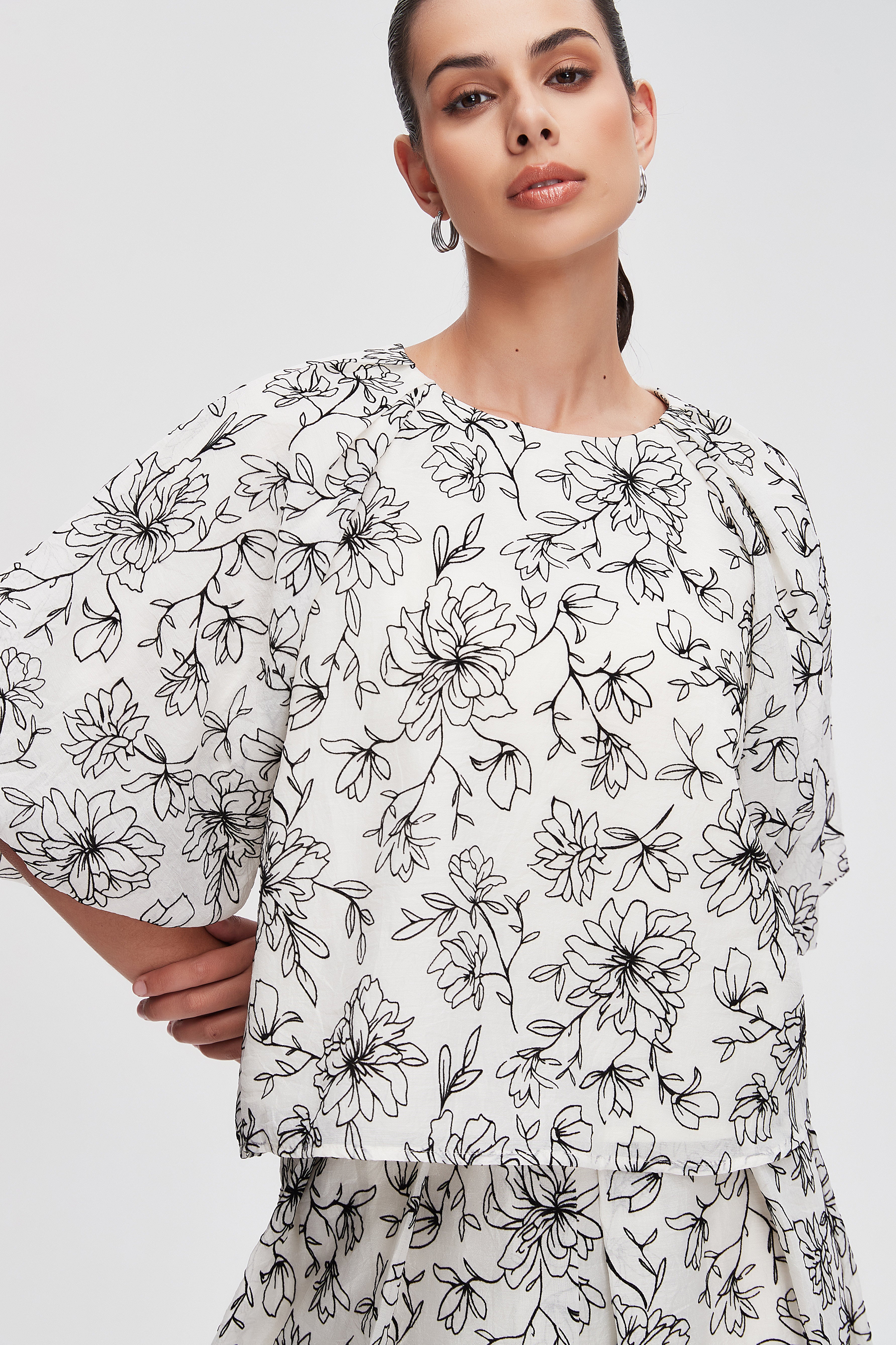 بلوزة مشجرة نصف كم بفتحة رقبة مستديرة
