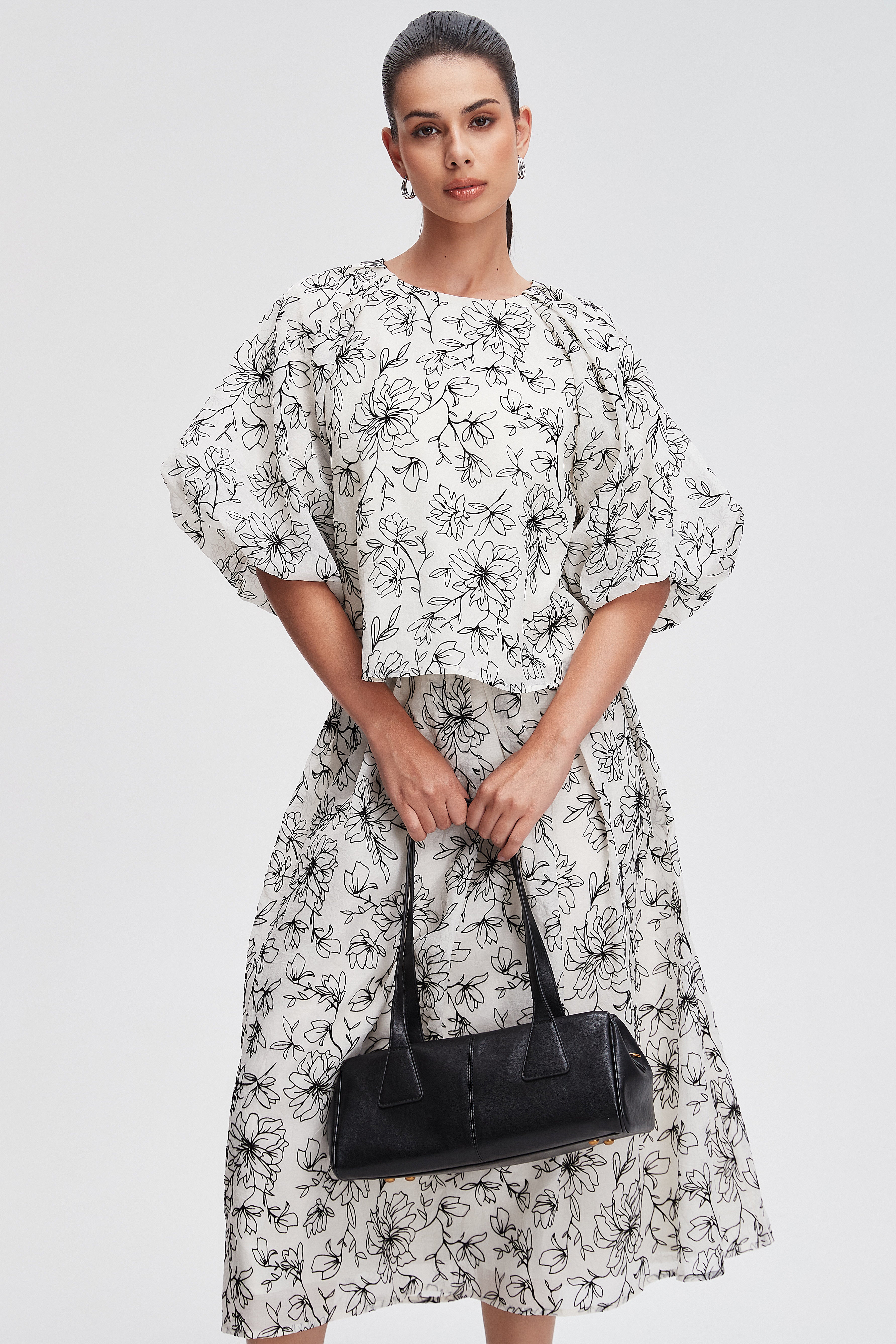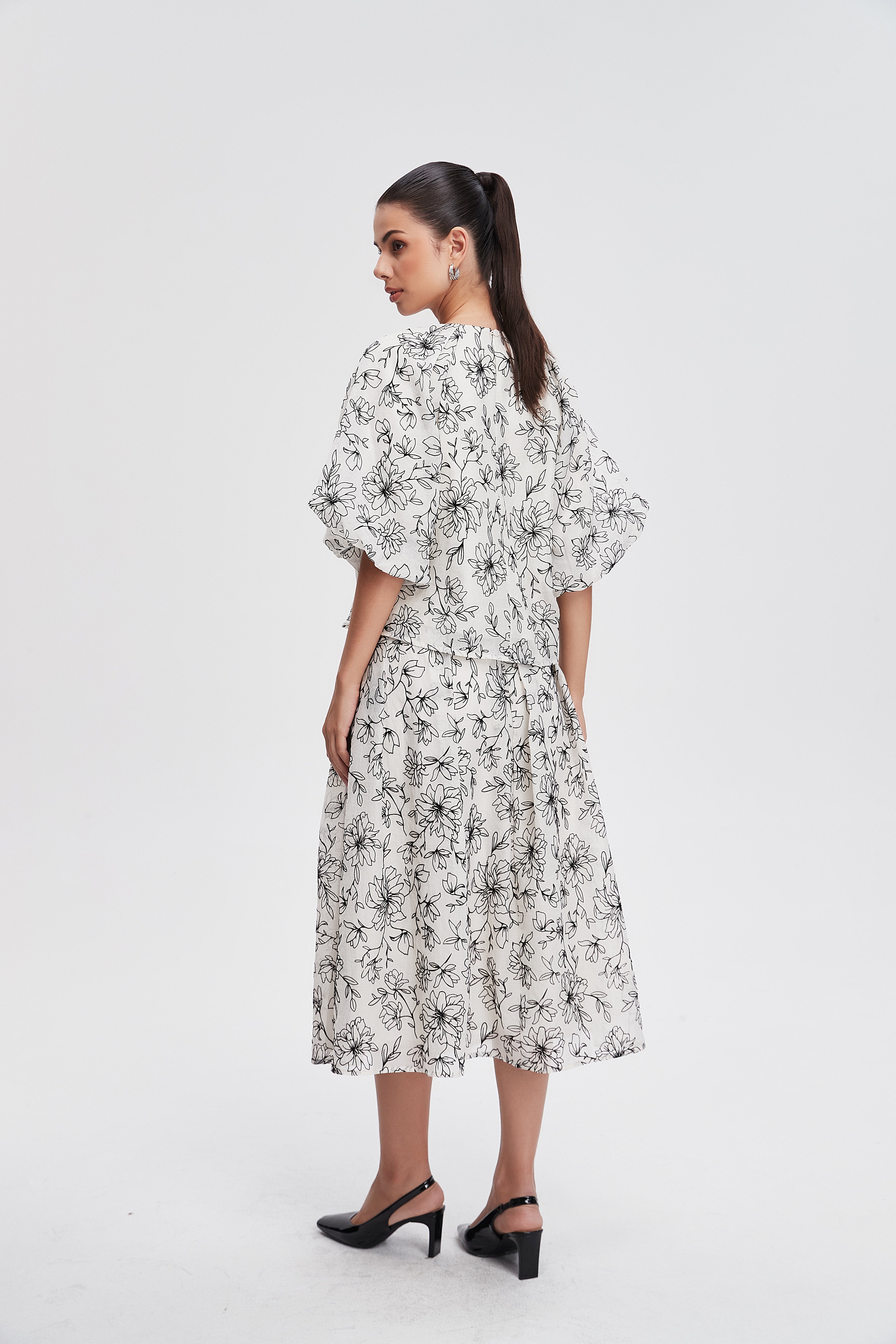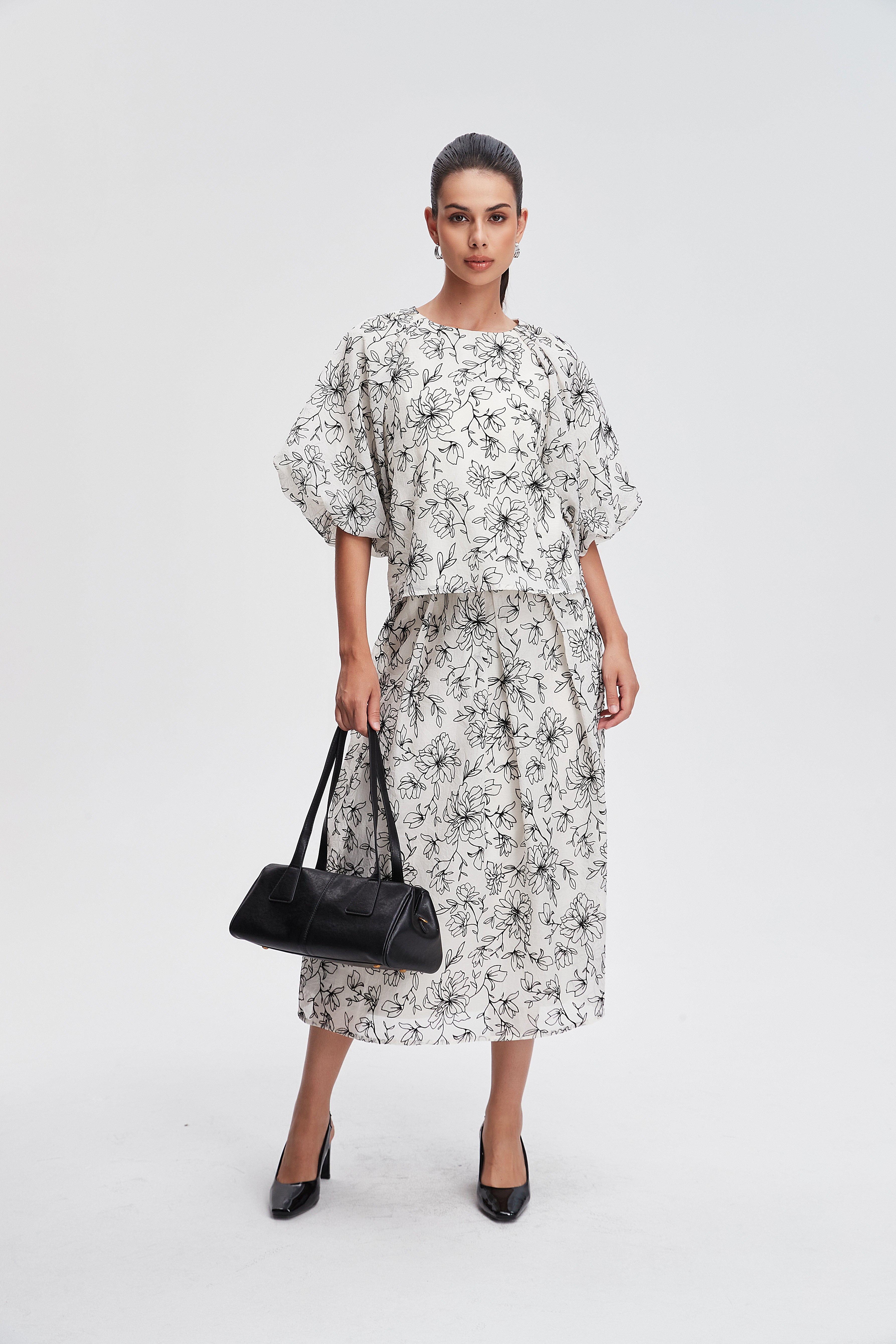 بلوزة مشجرة نصف كم بفتحة رقبة مستديرة