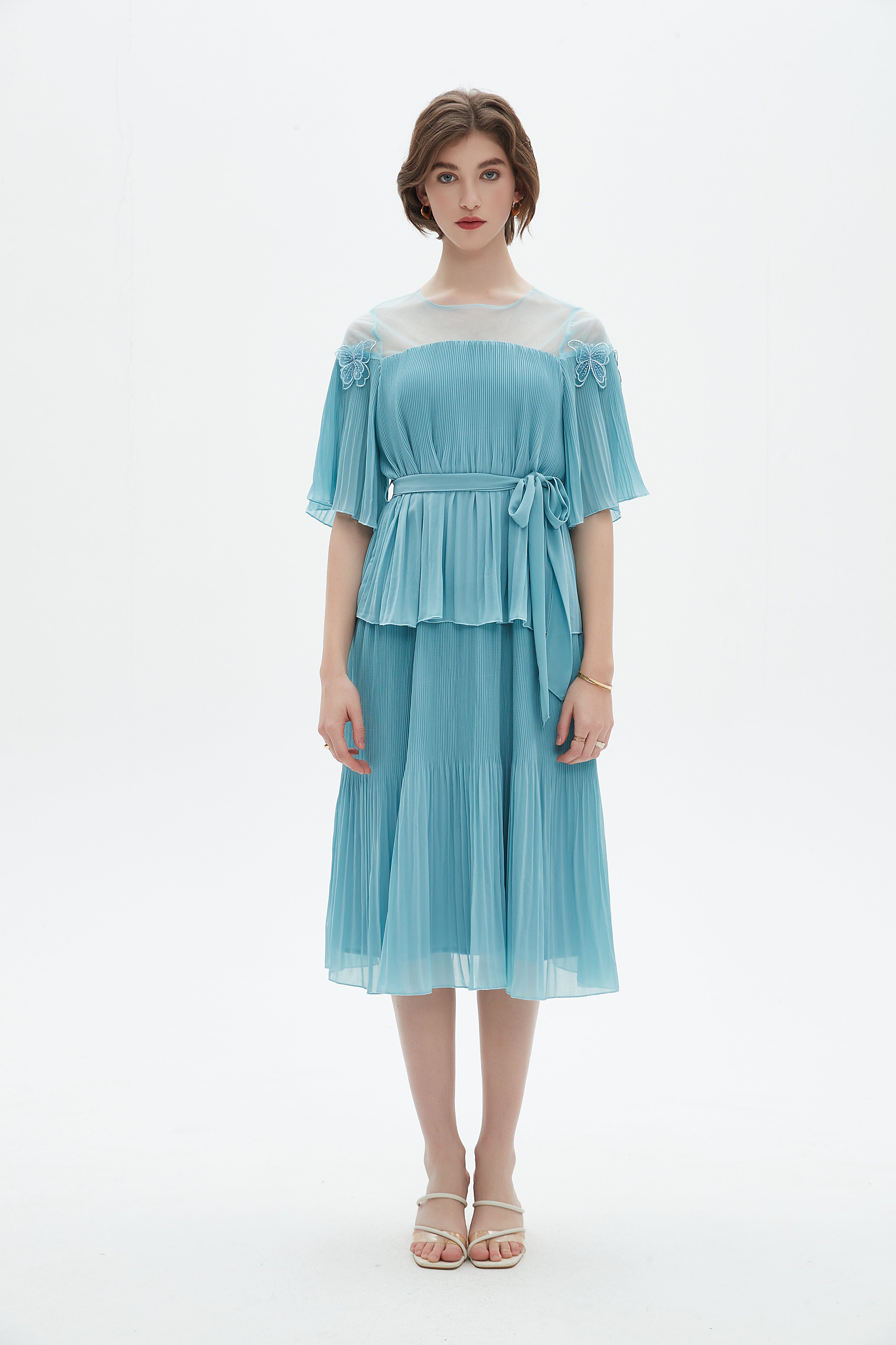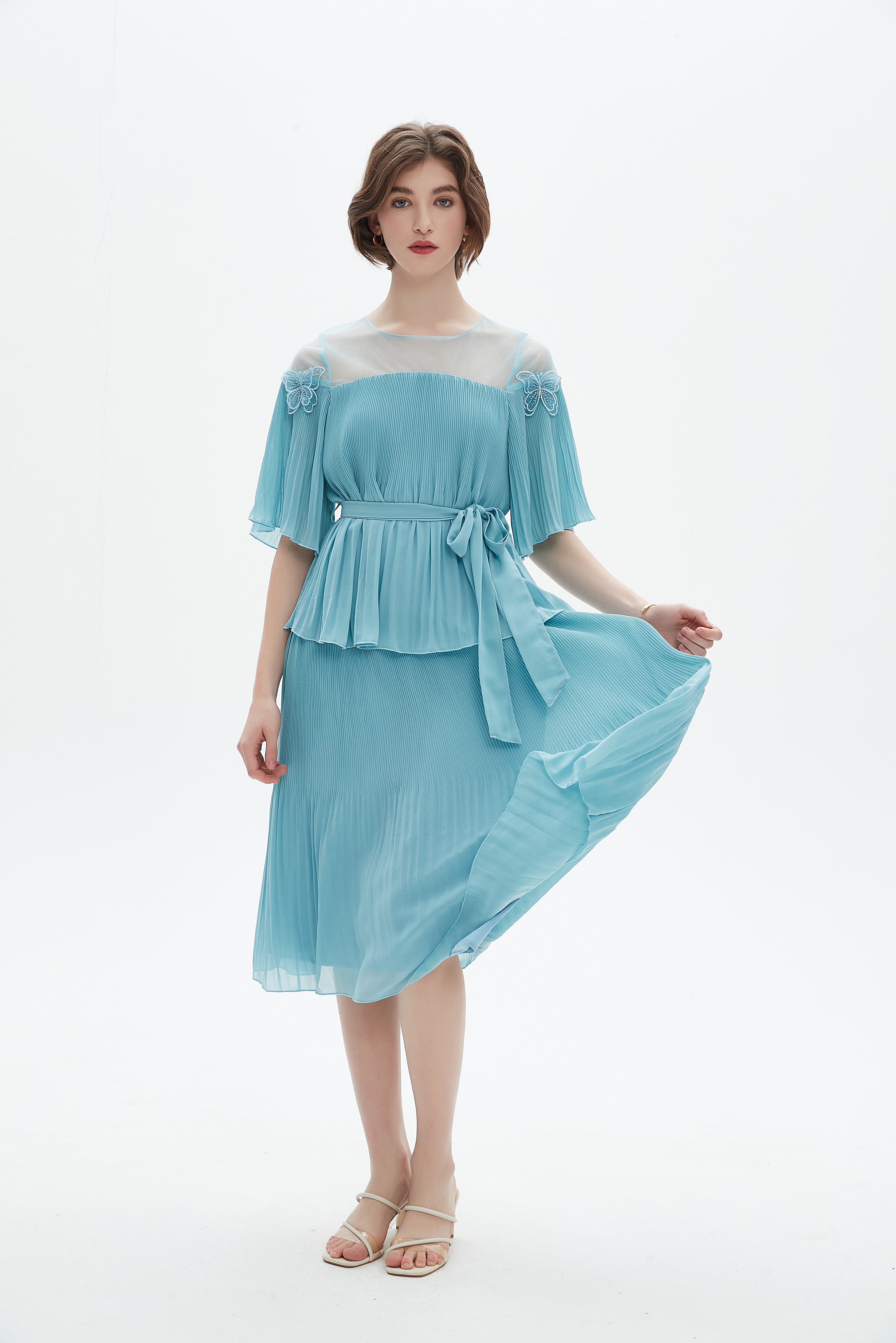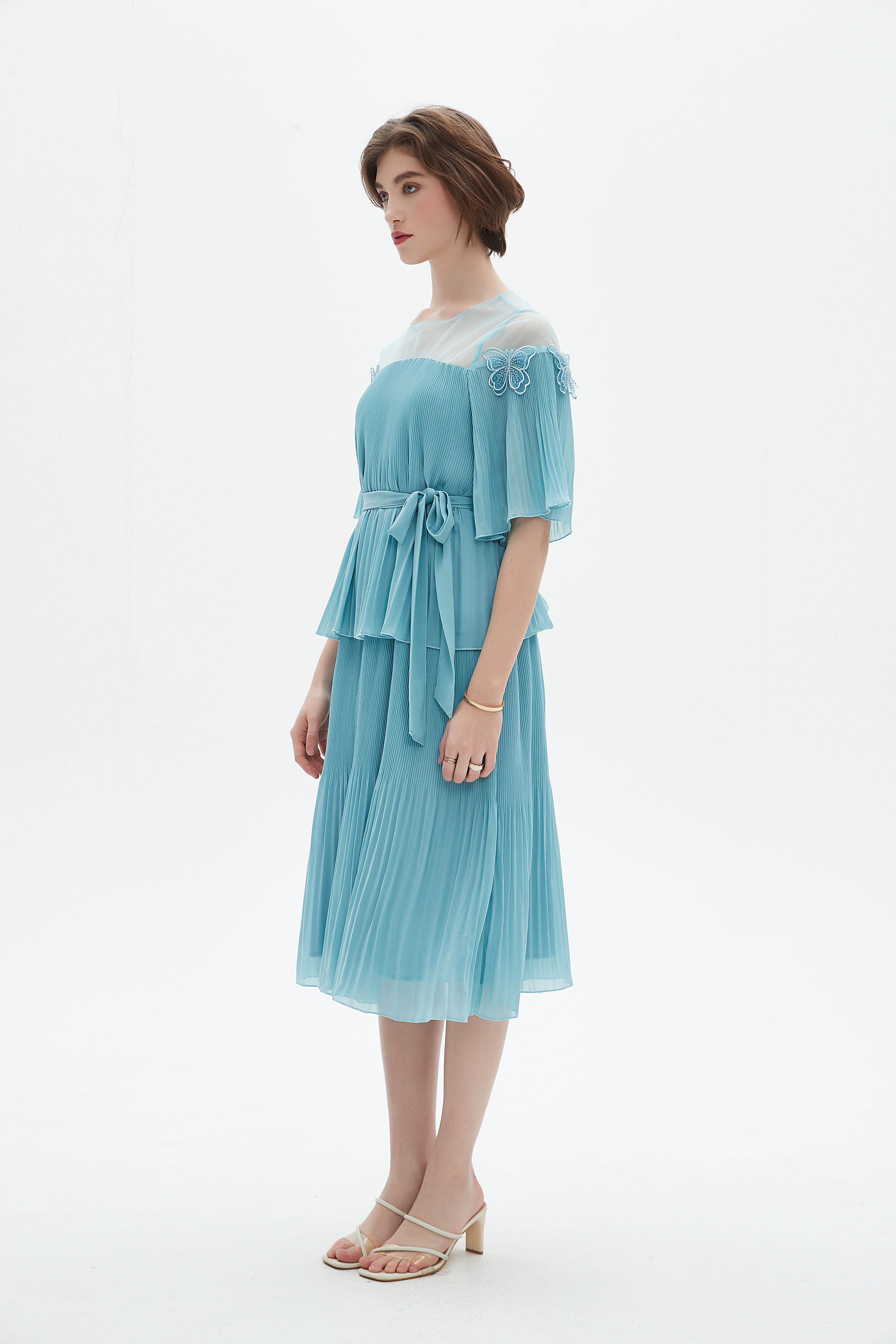 فستان ميدي نصف كم واسع بيلسيه وبياقة دائرية بتفاصيل شيفون