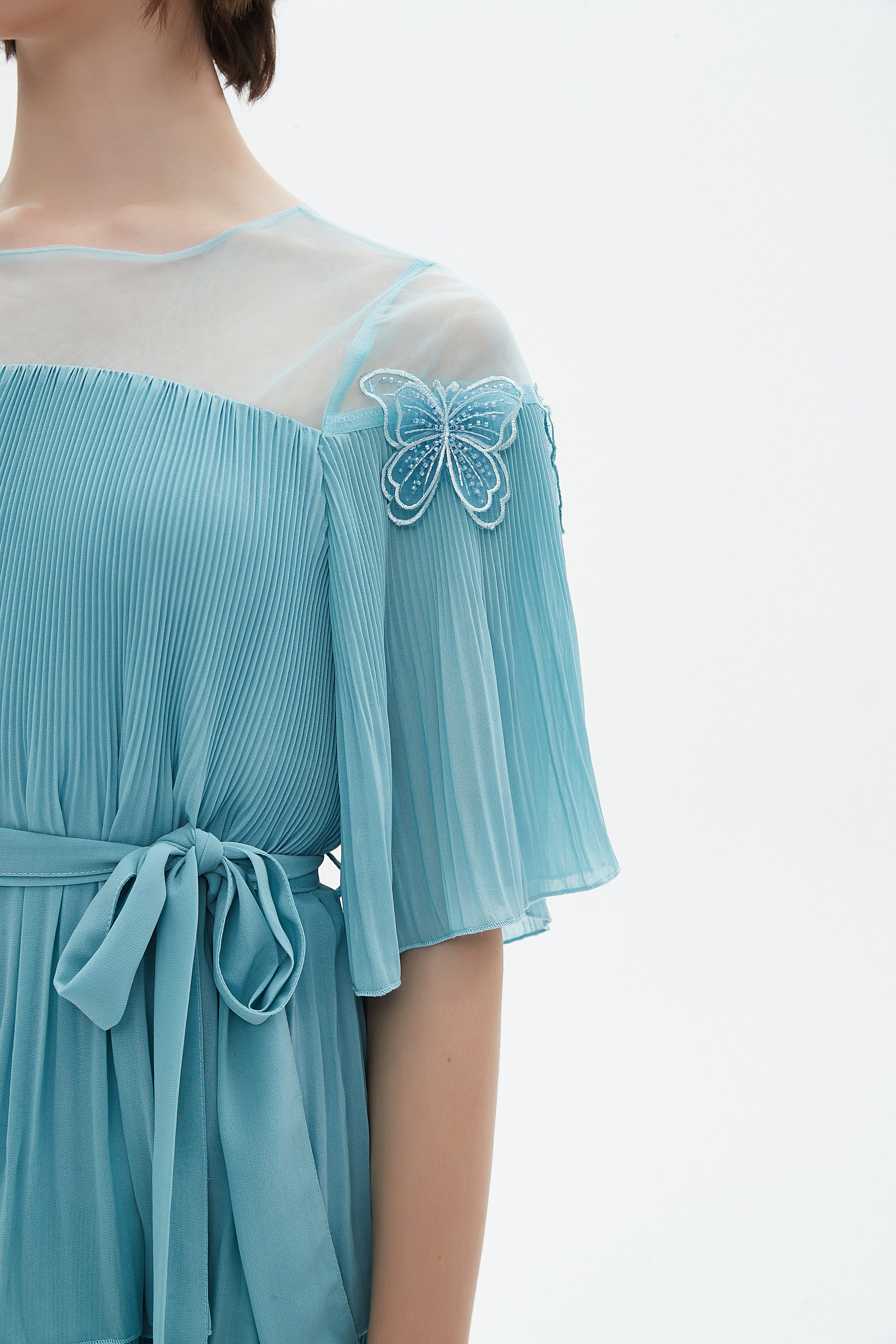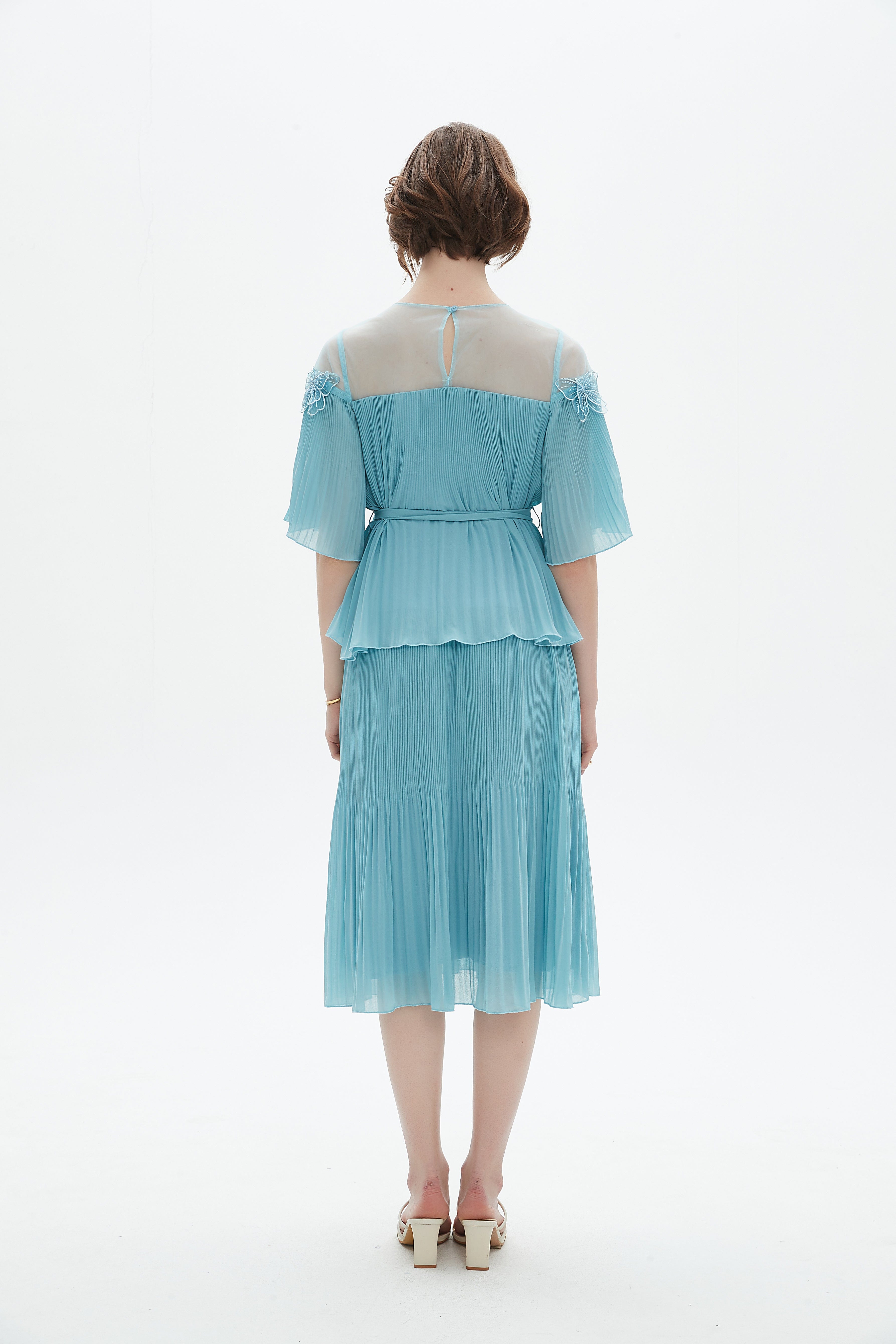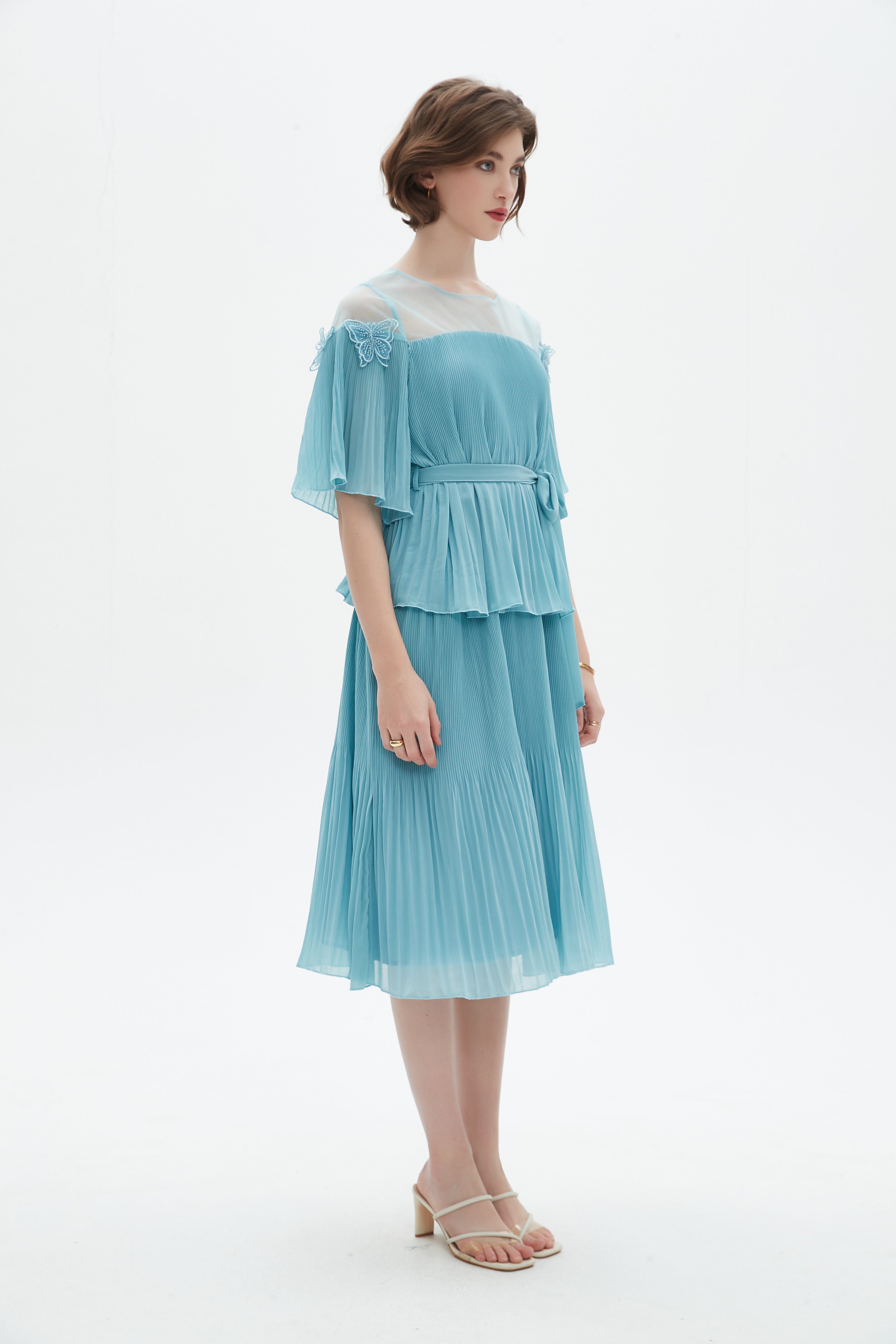 فستان ميدي نصف كم واسع بيلسيه وبياقة دائرية بتفاصيل شيفون