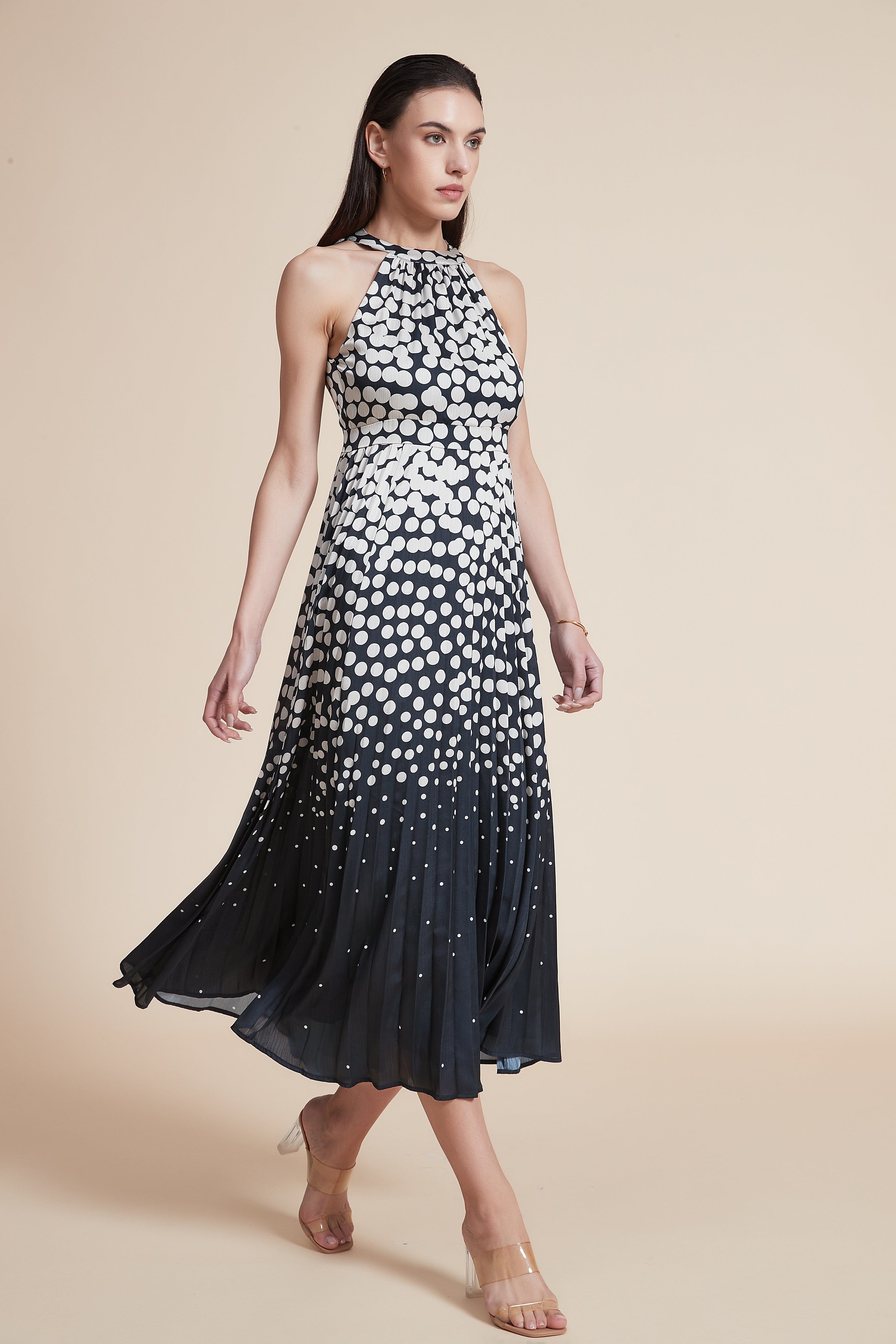 هذا الفستان رائع إذا كنتِ تبحثين عن قطعة صيفية مواكبة للموضة وسهلة التنسيق. خامته بسماكة متوسطة تمنح شعورًا مريحًا في الأيام الحارة، وهو بدون بطانة ليسخن بسيطًا ويعطي تهوية أفضل. التصميم بقصة A ميدي يبرز الخصر وينساب برفق، مع ياقة هالتر تعطي لمسة أنيقة وعصرية. الفستان منقط بالأسود والأبيض وبلا أكمام، مناسب للخروجات الكاجوال والمشاوير النهارية، وستحبين كيف يتحرك معك عند المشي. لا يحتوي على جيوب ولا حزام، وقصته عادية تناسب البالغات الباحثات عن مظهر أنيق لكن عملي. أضيفيه إلى خزانة ملابسك الصيفية للمناسبات اليومية أو لموعد رومانسي بسيط. اعثري على مقاسك في فاشن السعودية وأضيفي هذه القطعة المتنوعة إلى خزانة ملابسك اليوم.