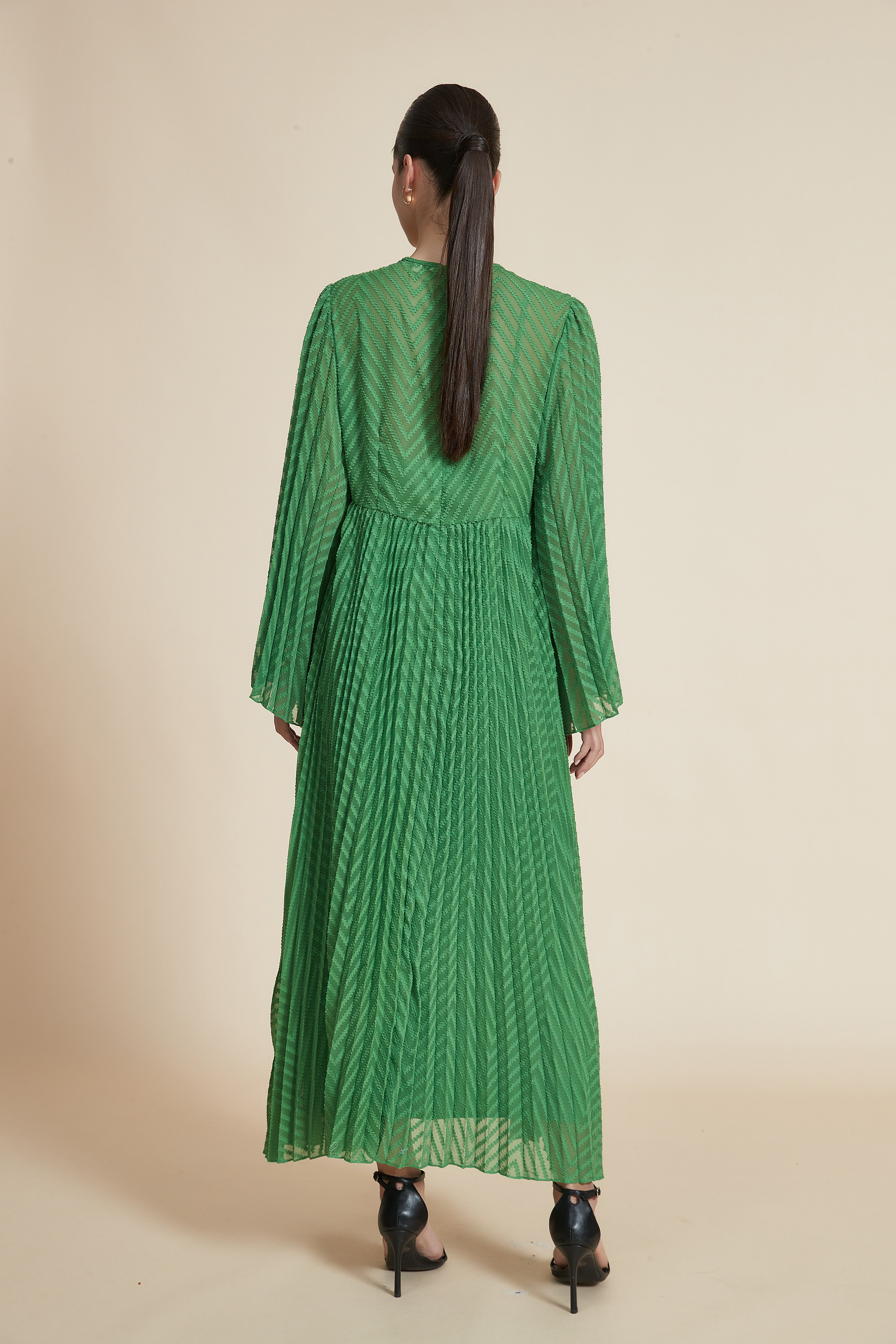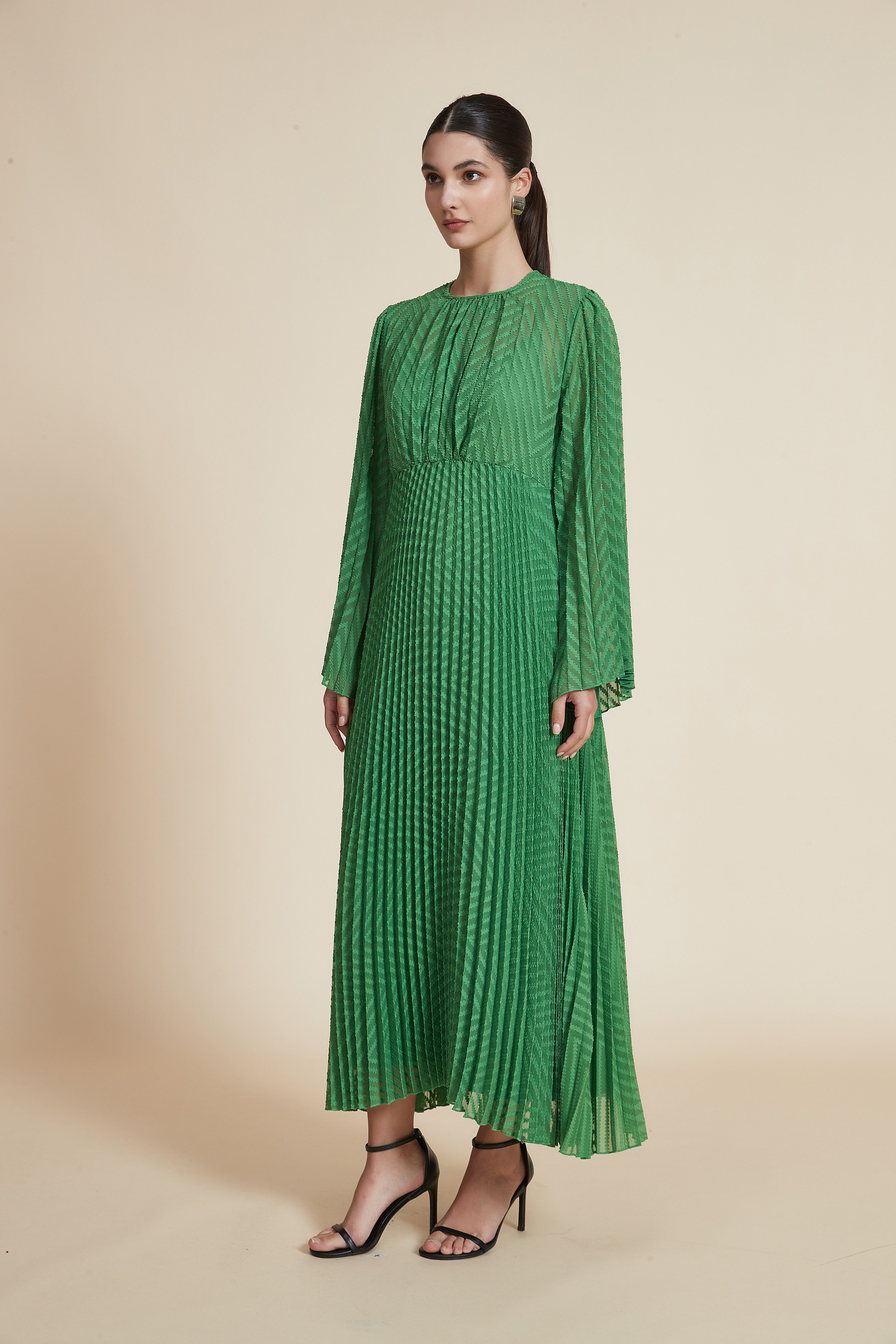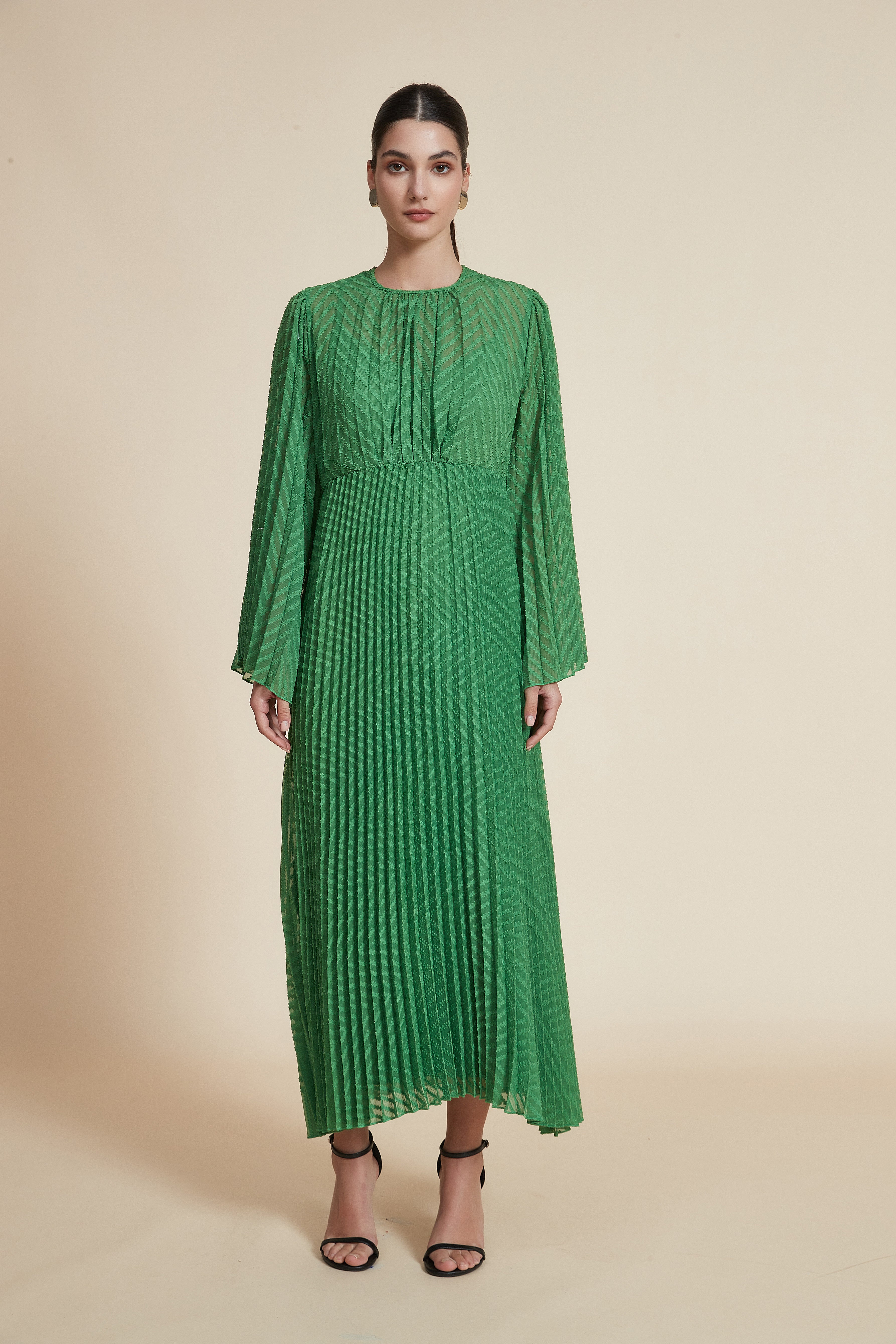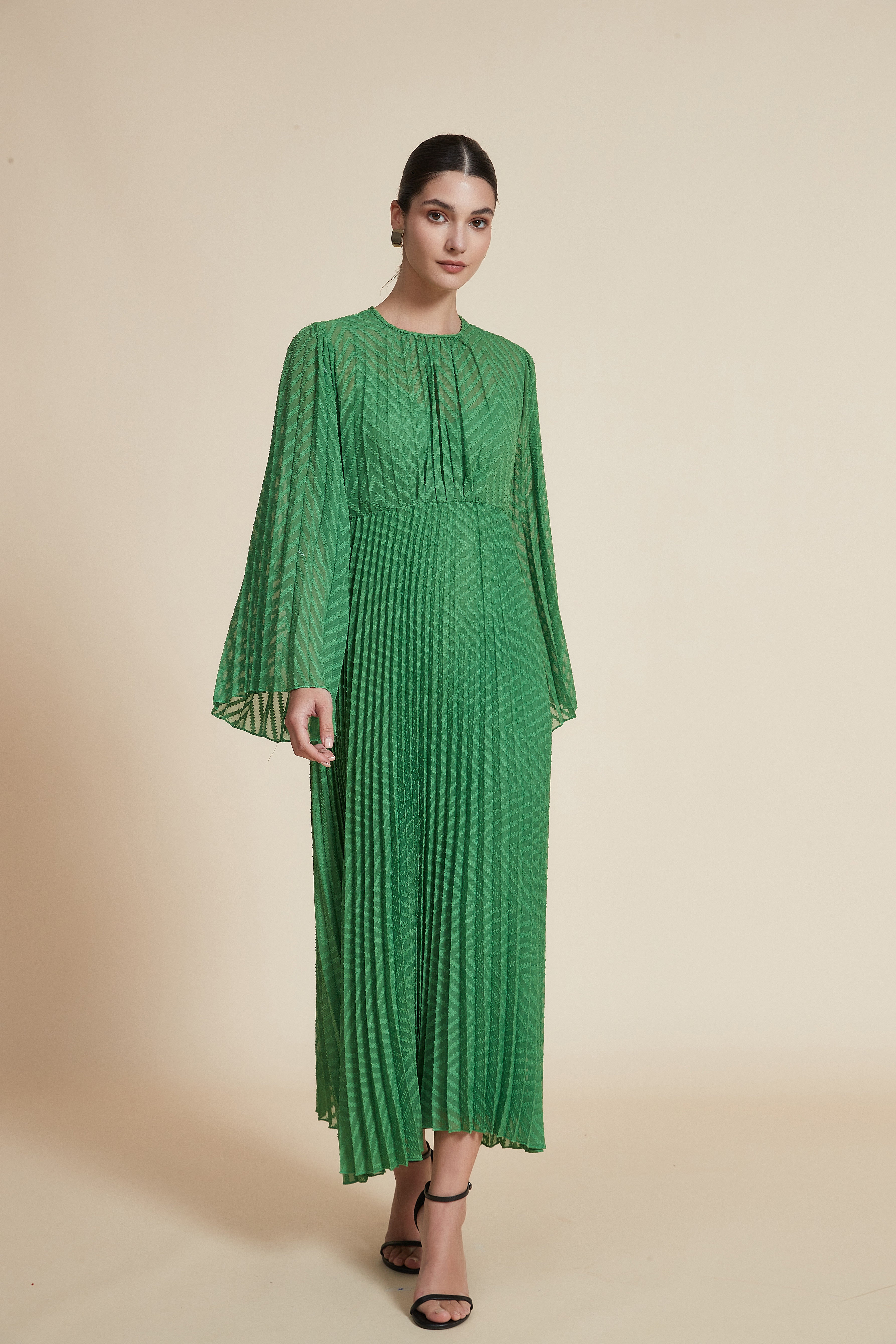 لو تبحثين عن فستان يلفت الانتباه دون مبالغة، هذا الفستان الطويل بقصة A هو خيارك المثالي. بسماكة متوسطة ونقشة مطرزة بارزة مع تأثير مبطن خفيف، يعطي حضور أنيق ويشعر بالدفء المعتدل رغم أنه بدون بطانة داخلية. الياقة المستديرة والكمّ ذو شكل الجرس والطول الماكسِي يضيفان لمسة أنثوية متجددة، وقصته العادية تجعل الحركة سهلة ومناسبة لكل الأحجام. لونه الأخضر يمنحه حيوية تناسب كل المواسم، وبدون جيوب أو حزام مما يحافظ على خط نظيف وأنيق. مناسب للخروج الرومانسي والسهرات الرسمية والاجتماعات الأنيقة. صدقيني، ستحبين كيف يتحرك القماش معك وكيف تمنحك التفاصيل المطرزة طابع مواكب للموضة دون مبالغة. اعثري على مقاسك في فاشن السعودية وأضيفي هذه القطعة المتنوعة إلى خزانة ملابسك اليوم.
