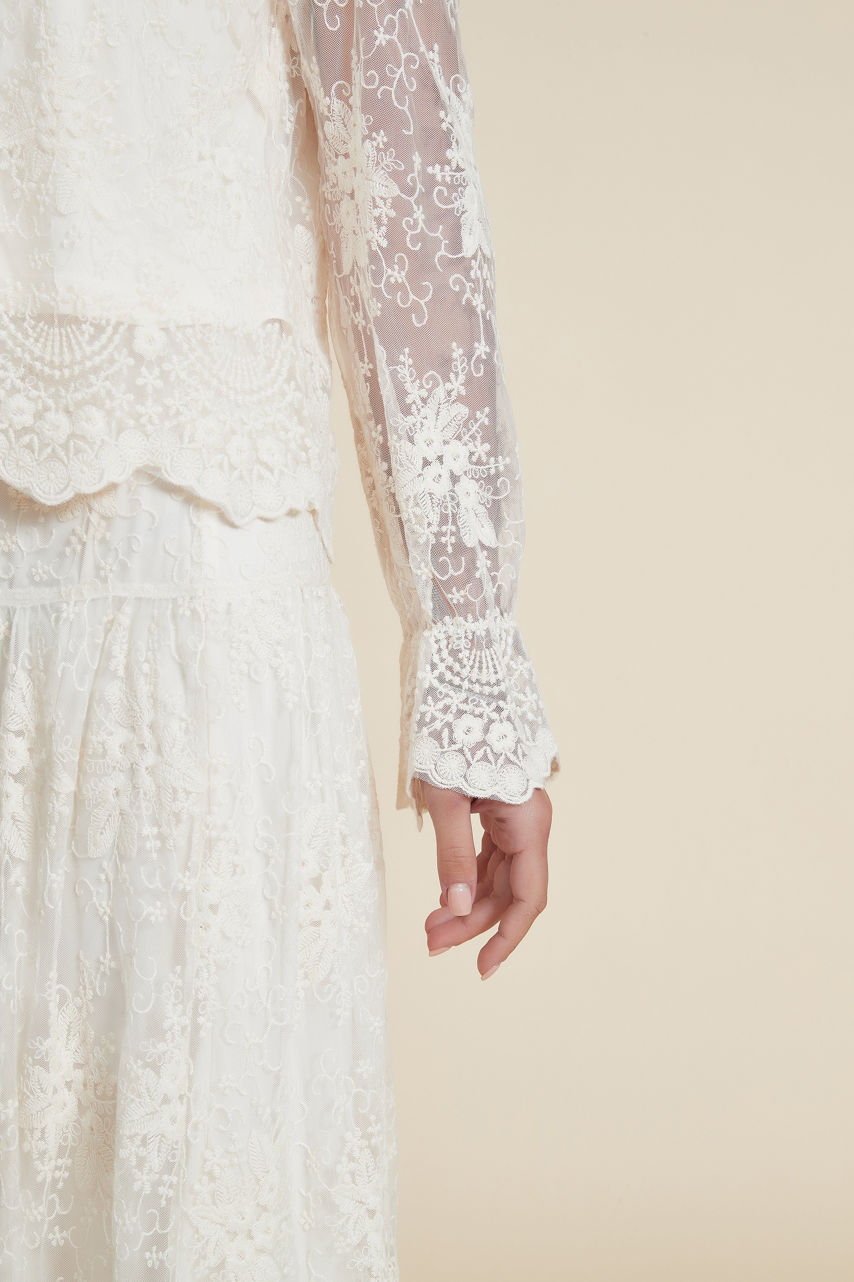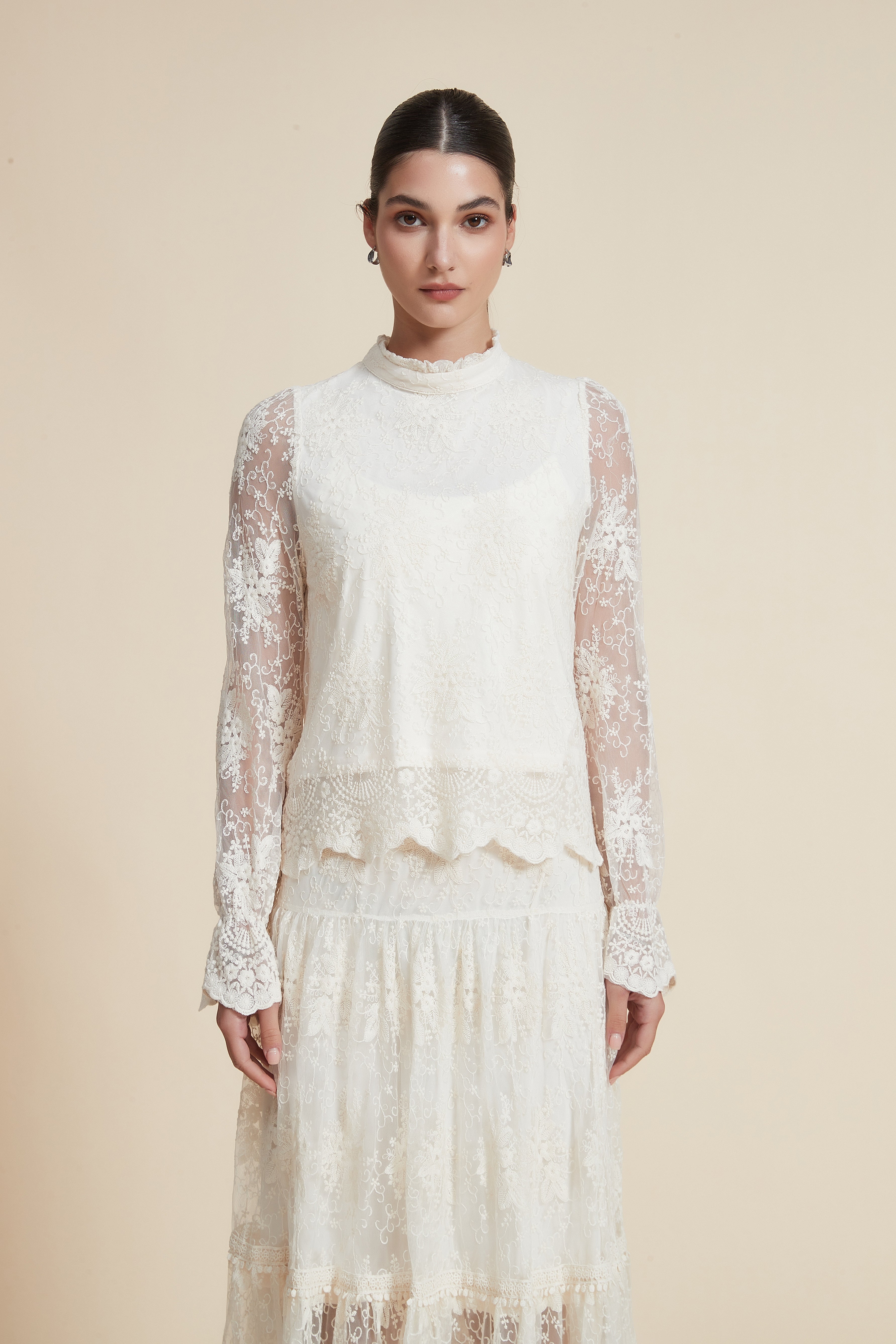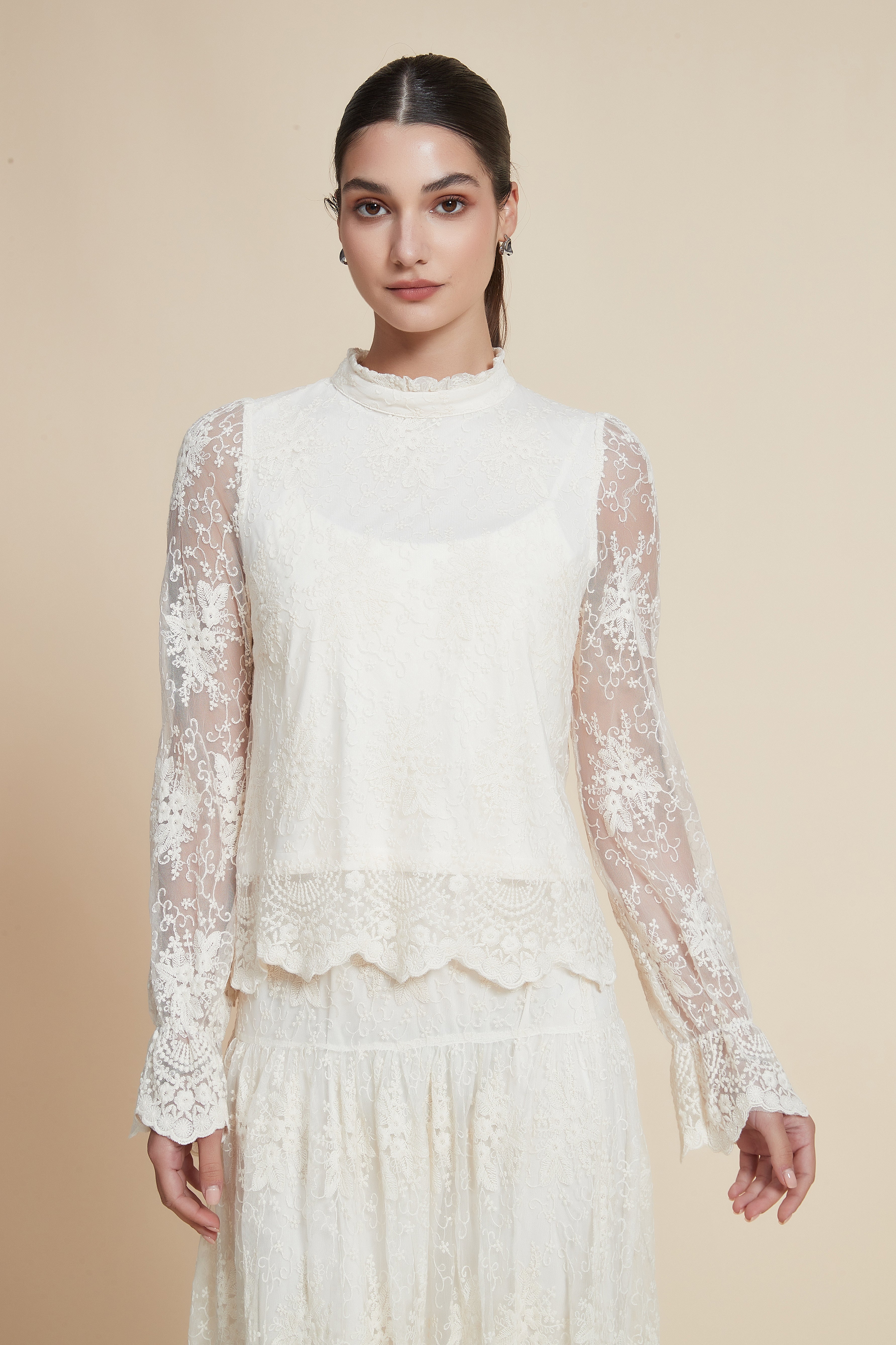 بلوزة بكم طويل شفاف منقوش وياقة مرتفعة