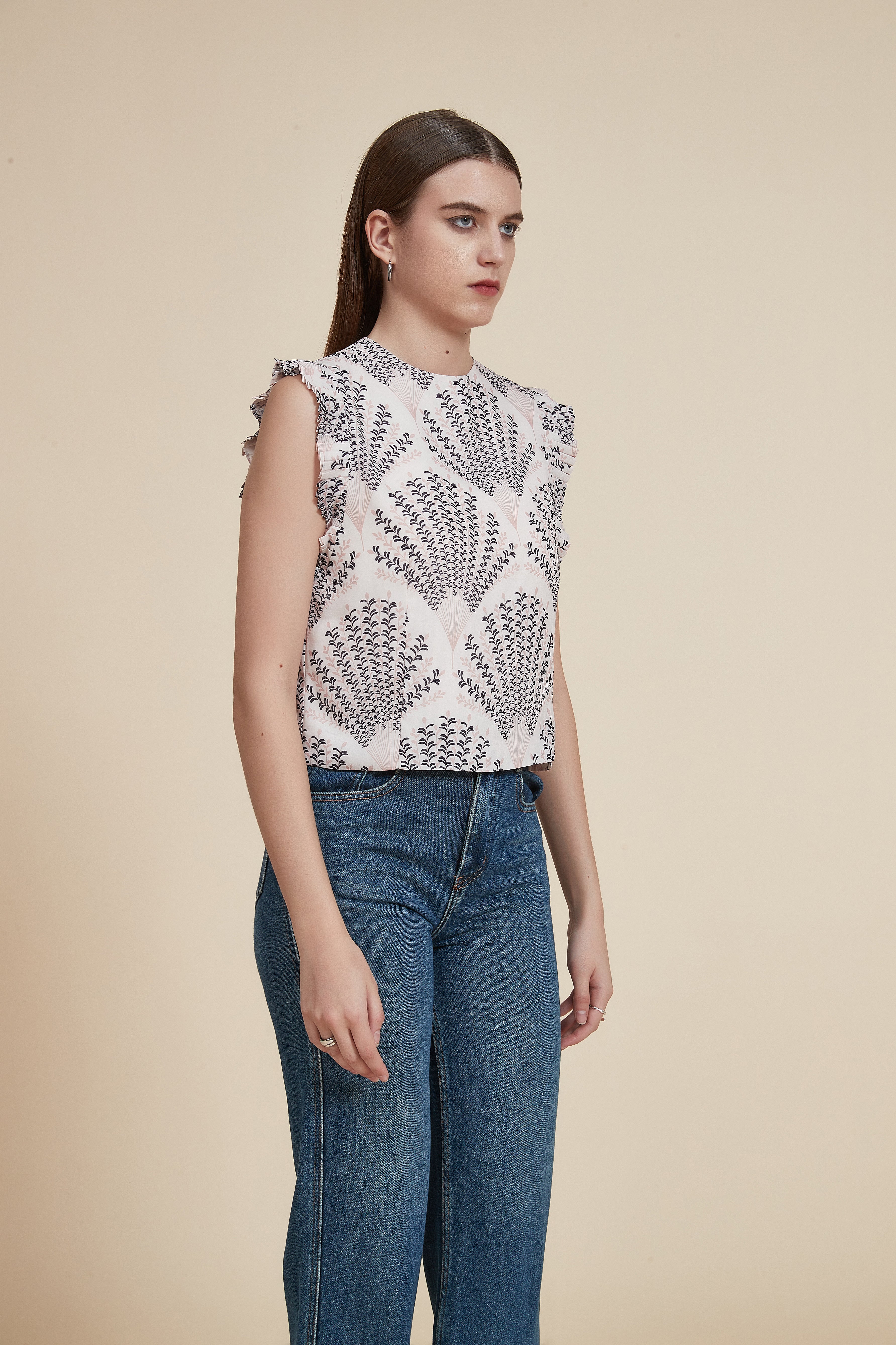 بلوزة منقوشة بدون أكمام وفتحة رقبة مستديرة