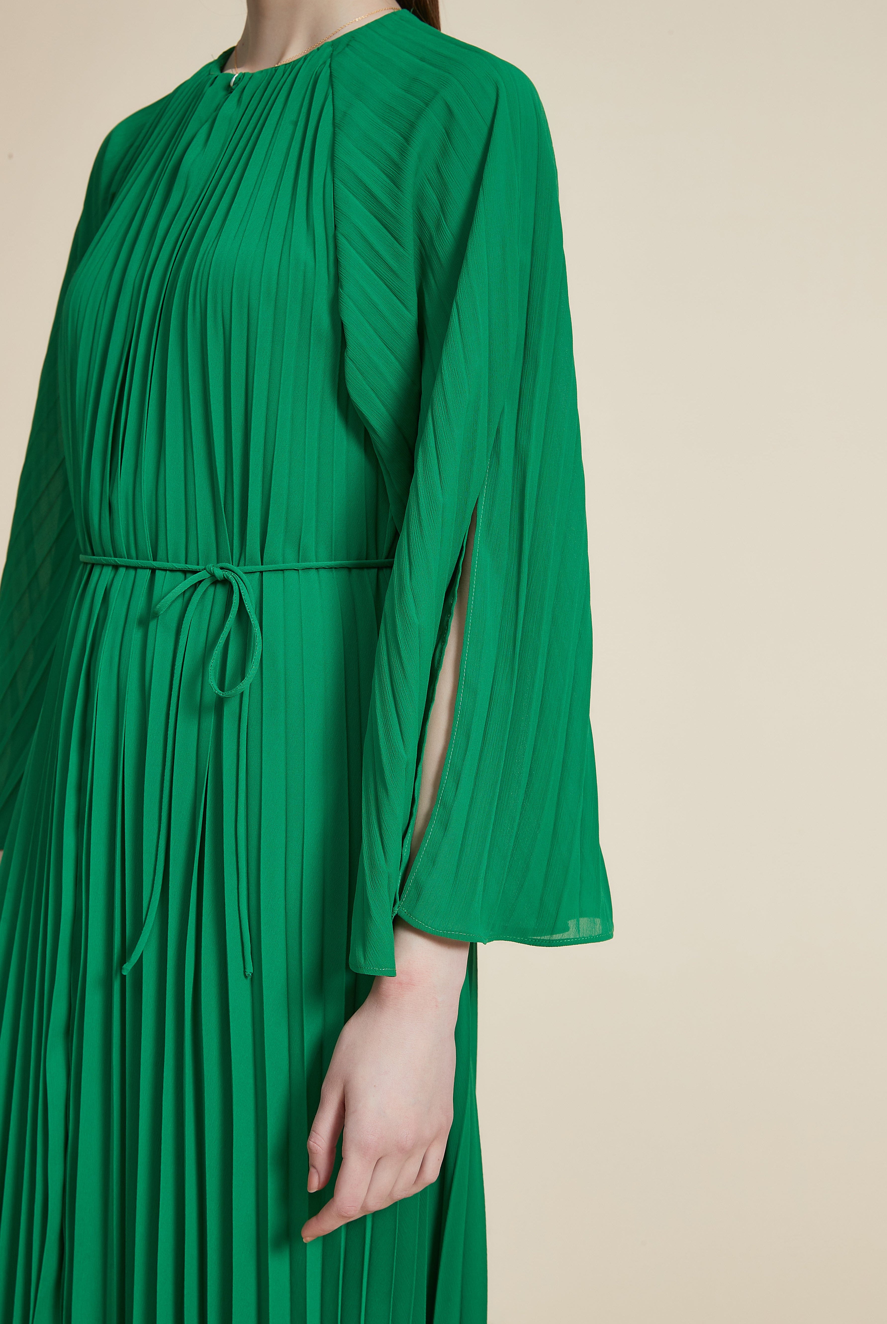 فستان بطول الركبة بفتحة صدر عميقة وحزام علي الخصر