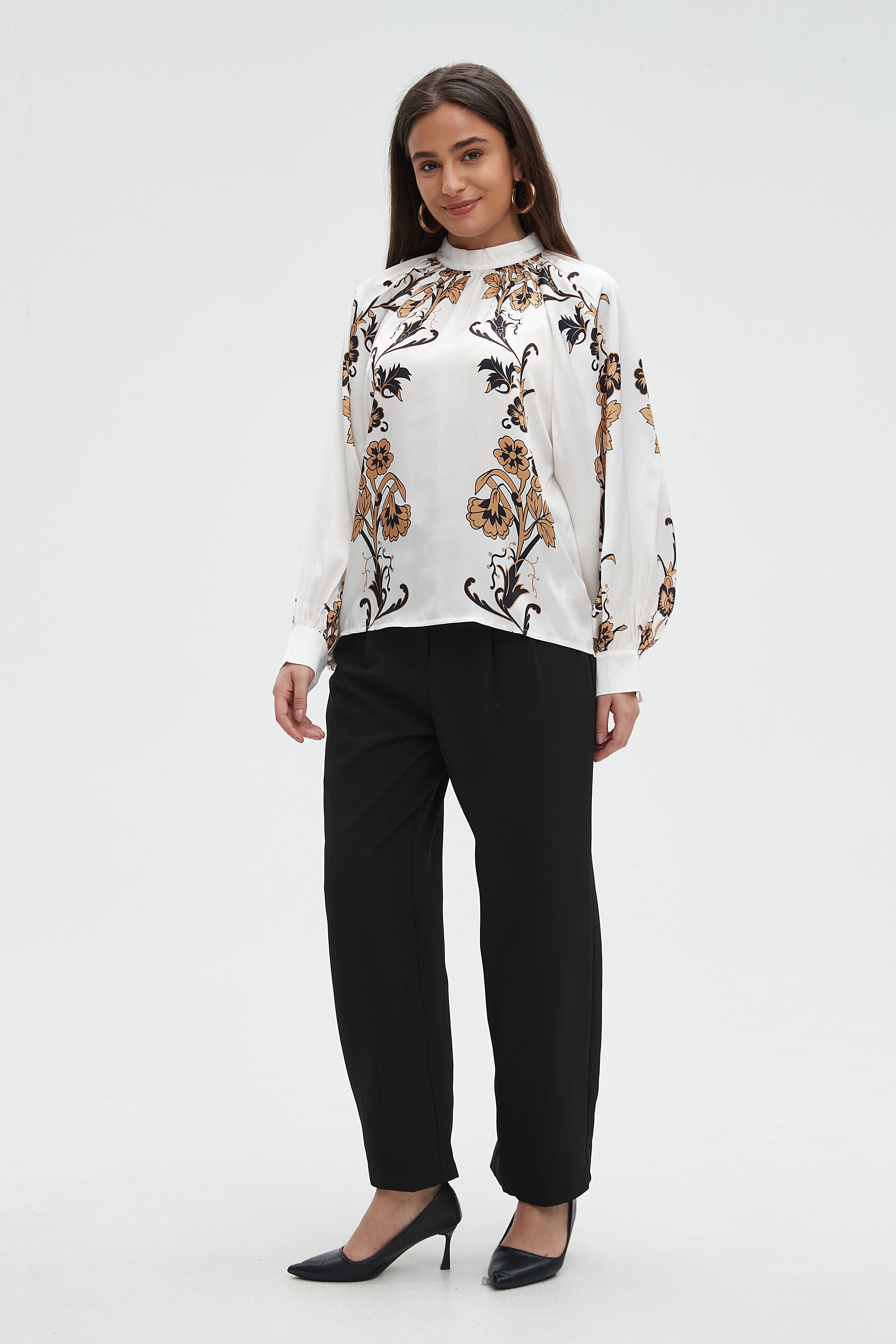 بلوزة نسائية منقوشة بياقة وكم طويل