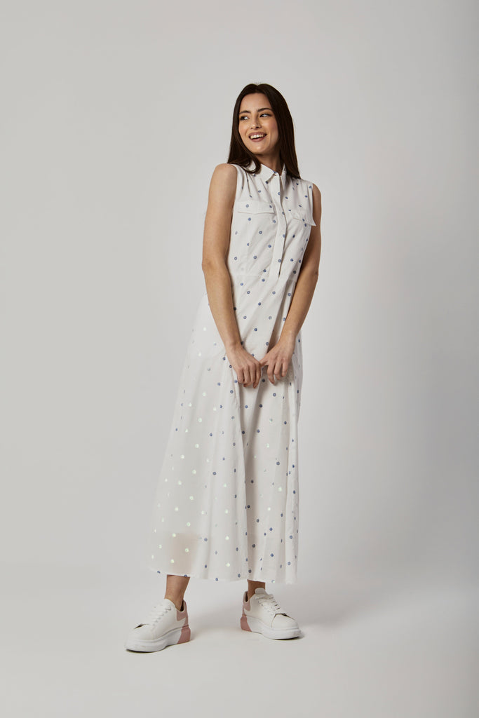 فستان طويل منقوش بكم قصير مزين بخيوط