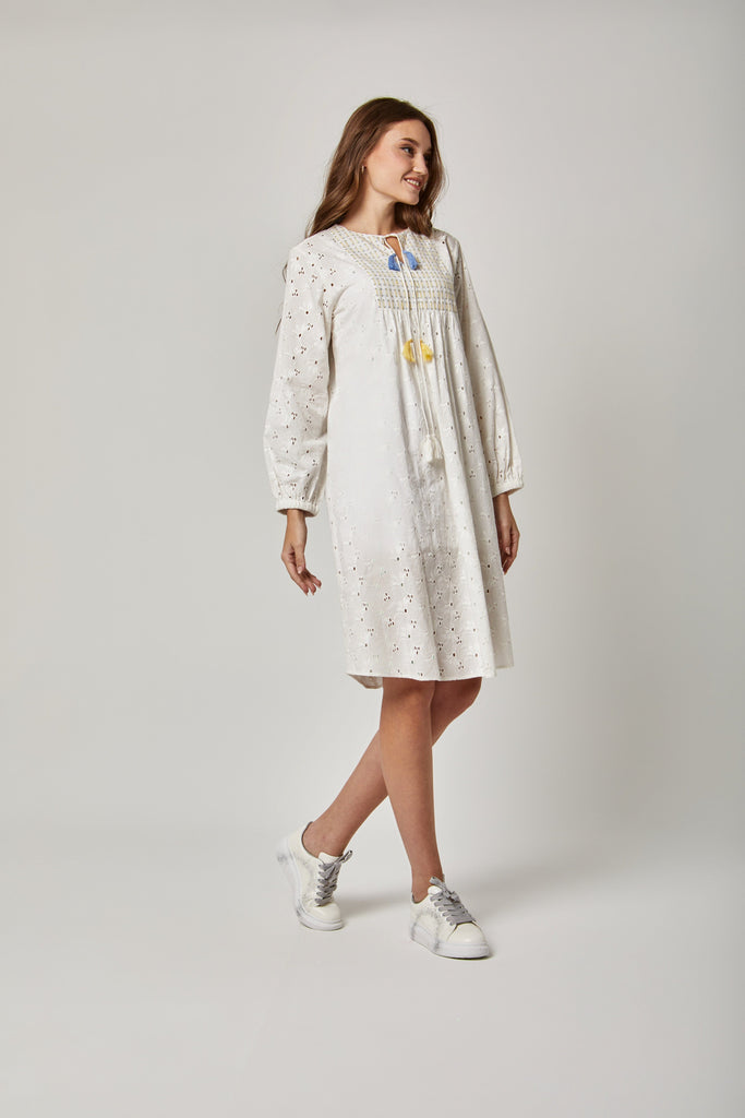 فستان قصير مطرز بفتحة صدر صغيرة كم طويل