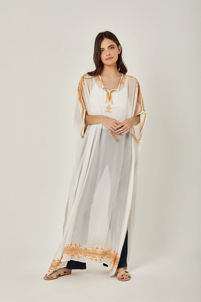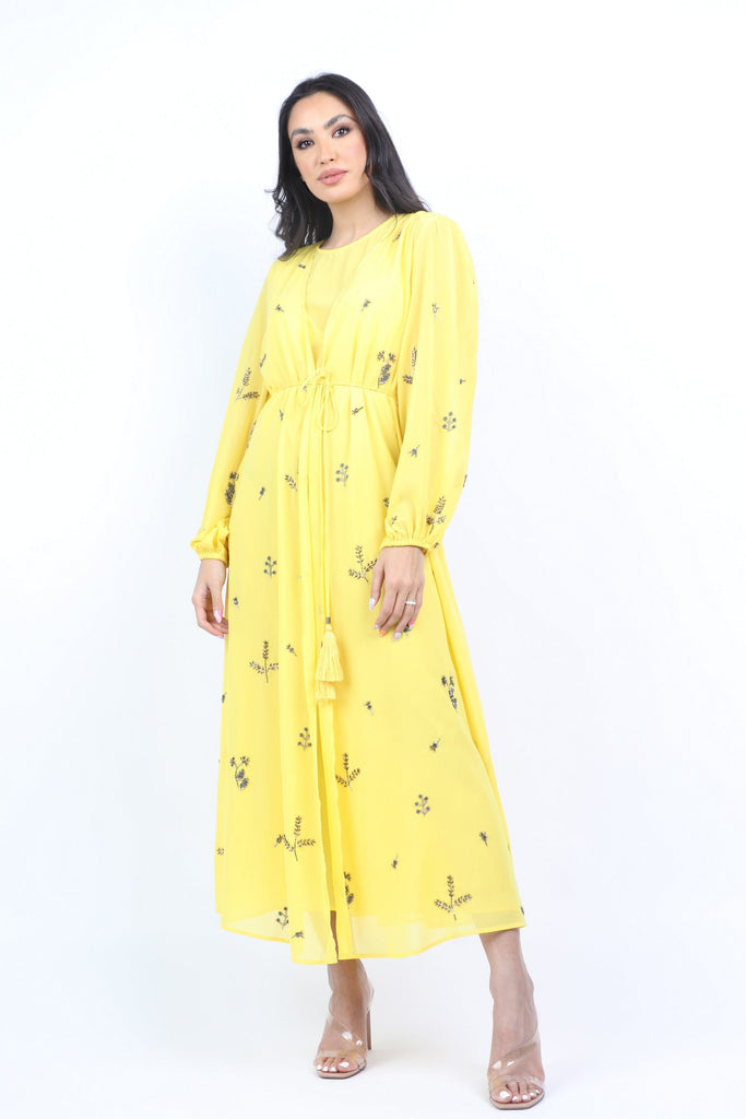 فستان مفتوح طويل شفاف مطرز برباط خصر بكم طويل واسع