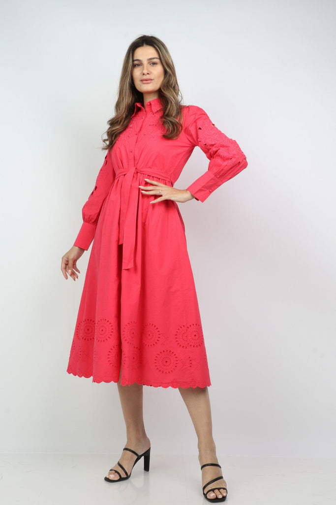 فستان قميص ميدي بحزام خصر وياقة طويلة وأزرار أمامية بكم طويل