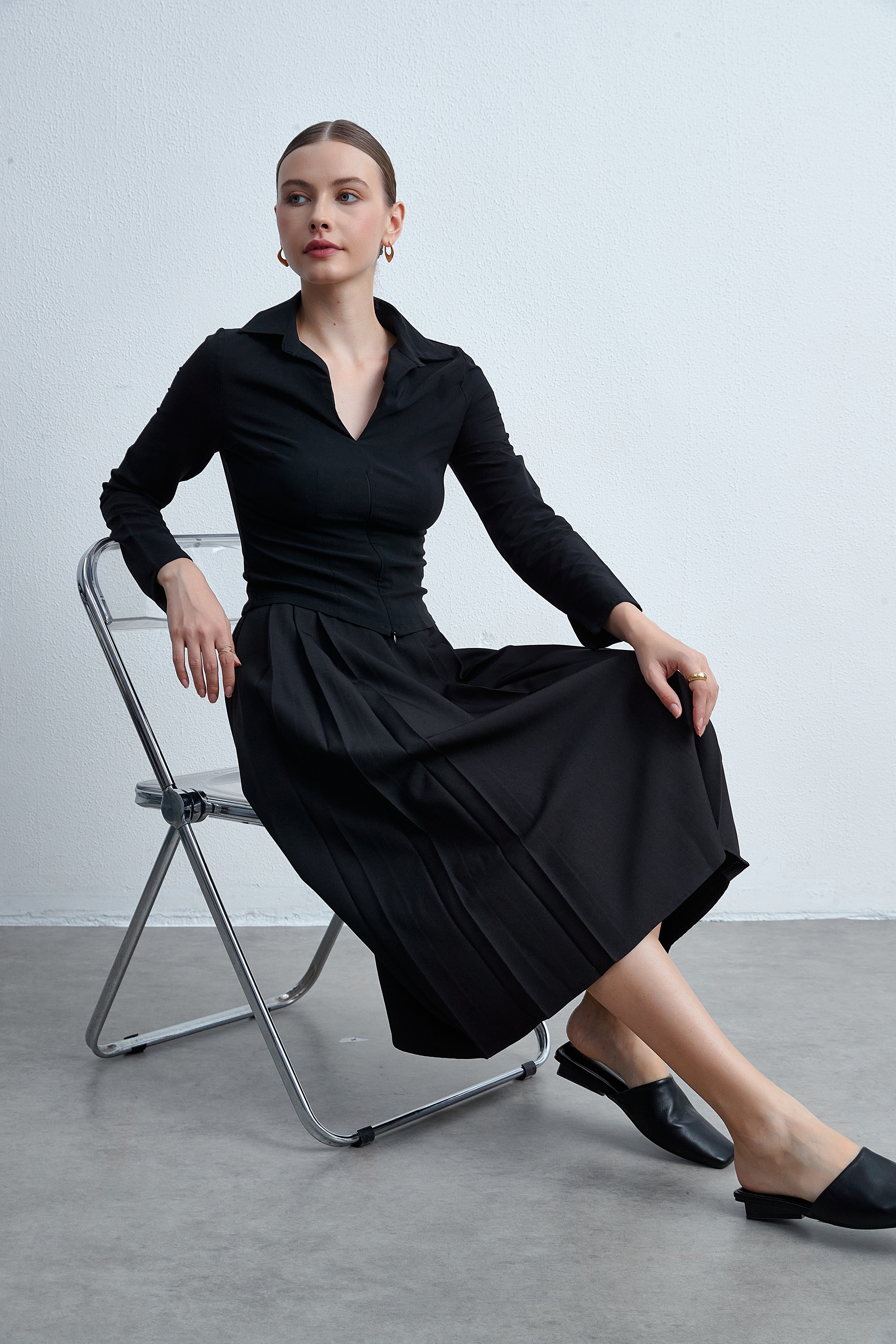 بلوزة بكم طويل وياقة قميص مع أزرار أمامية