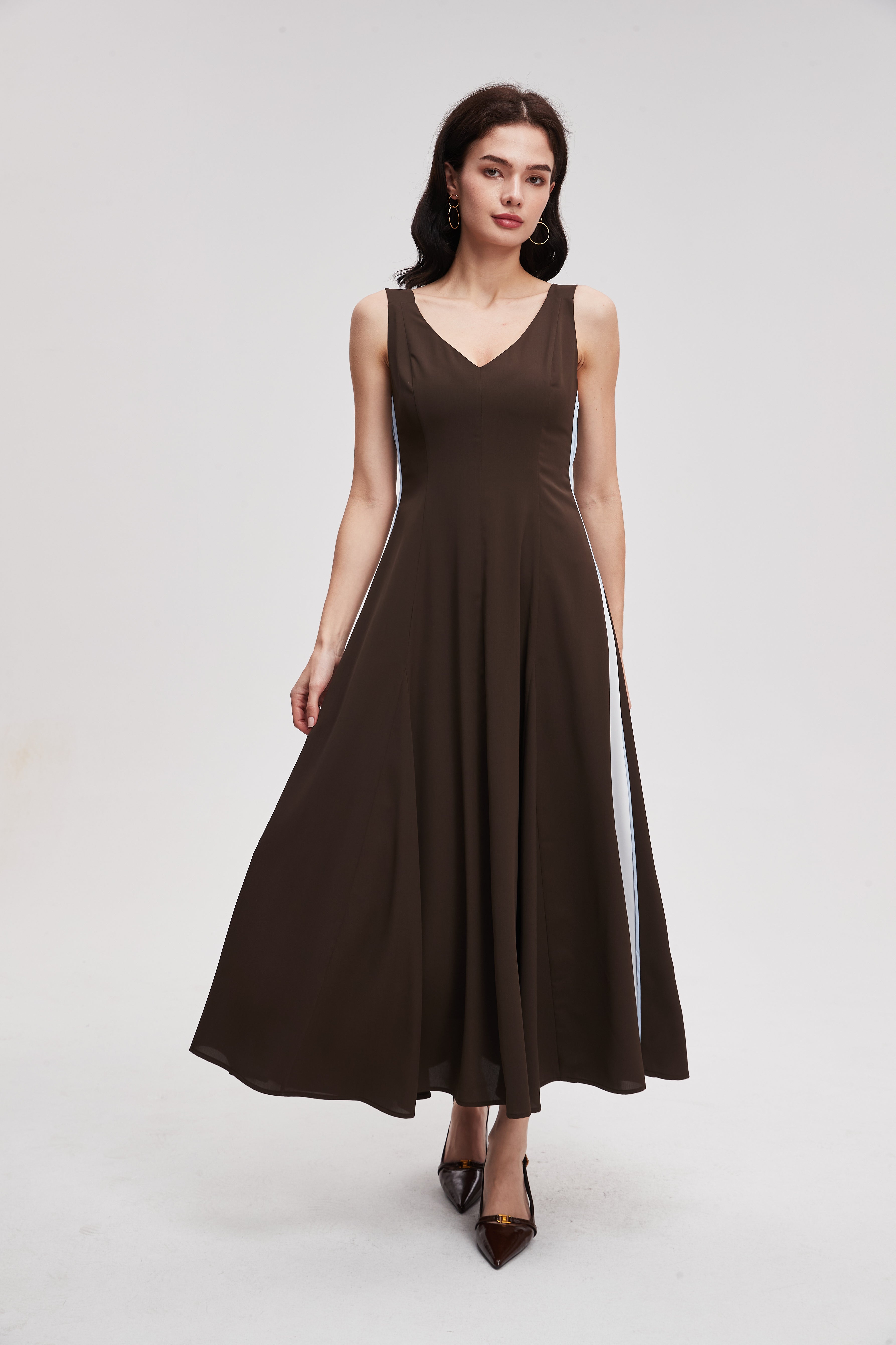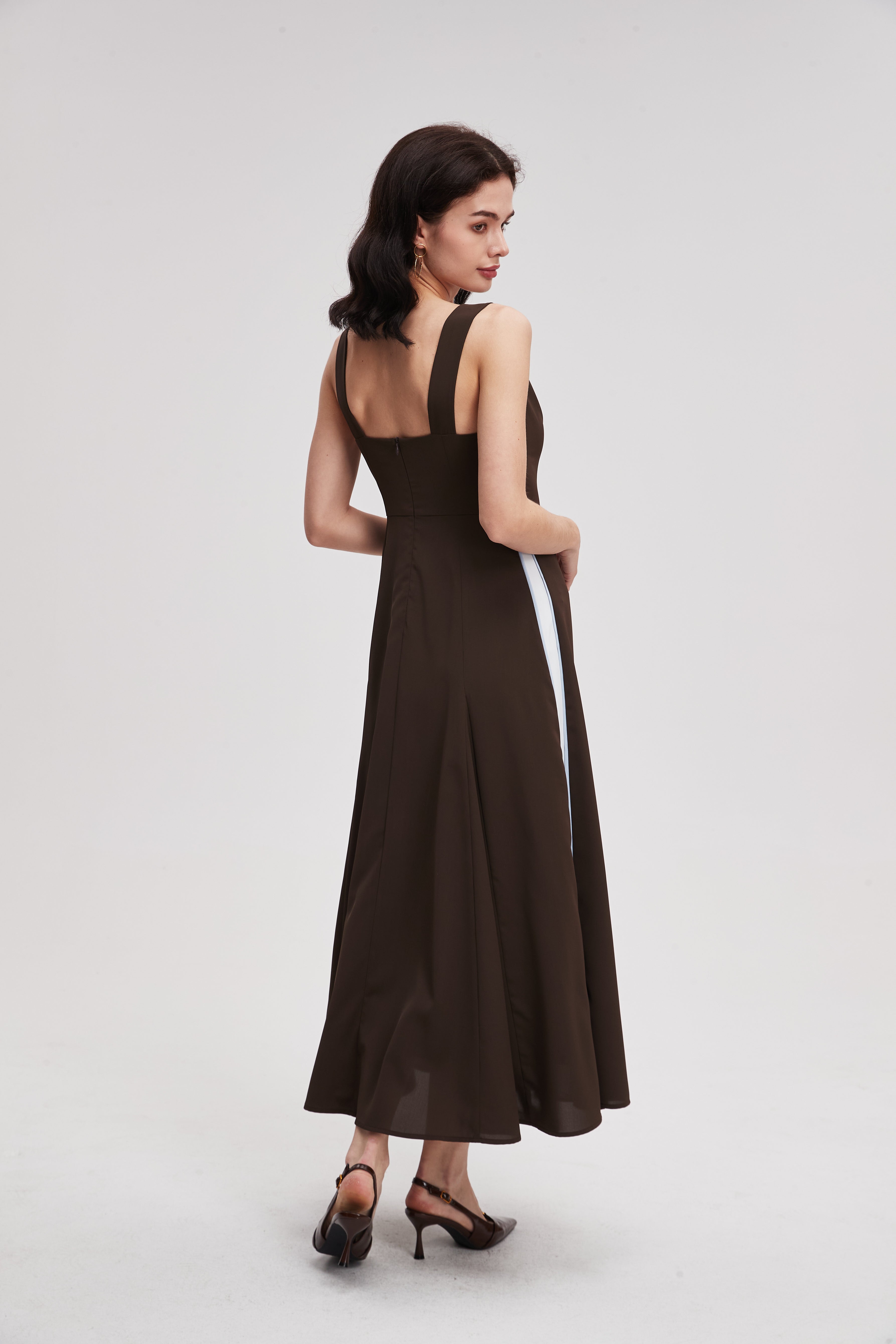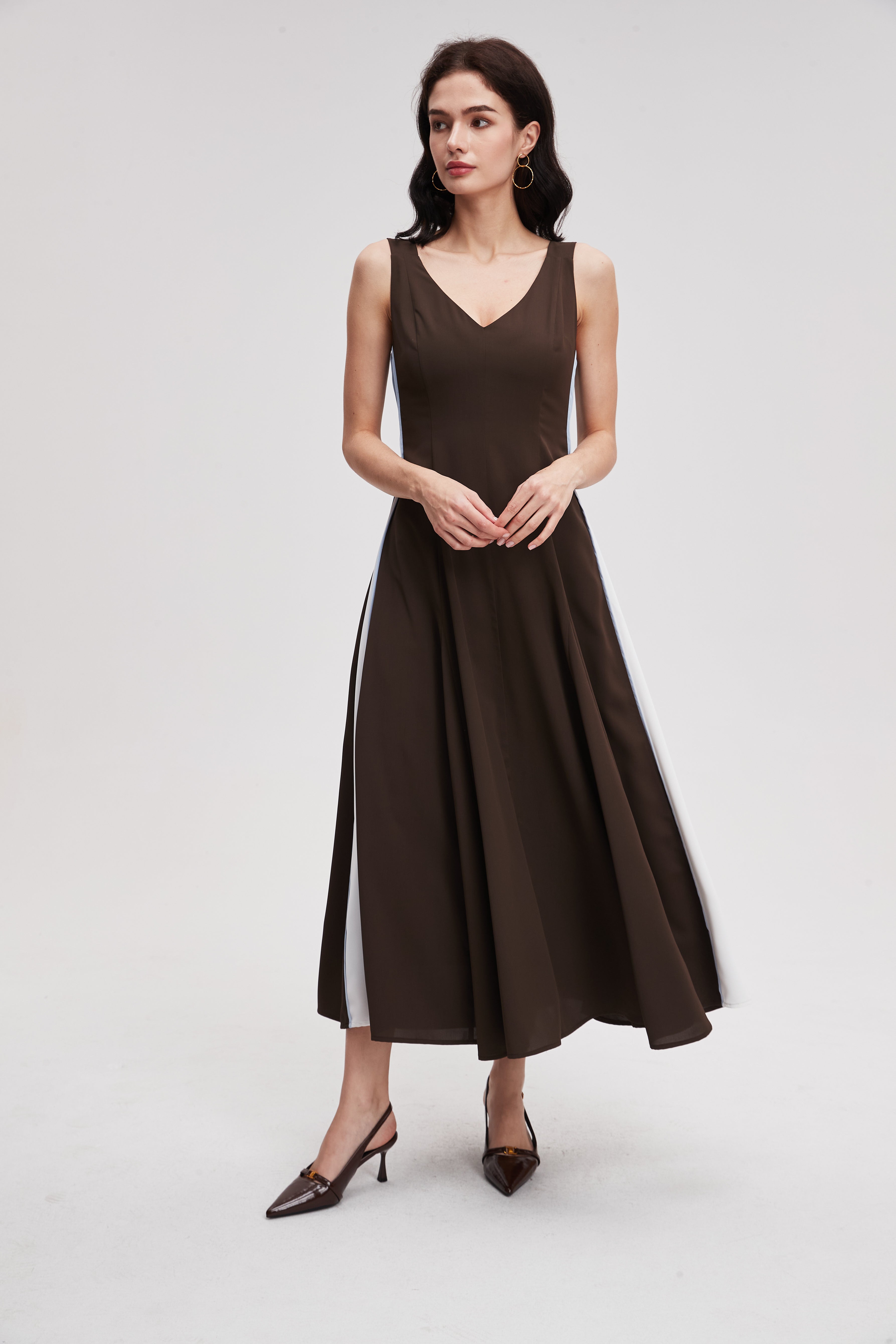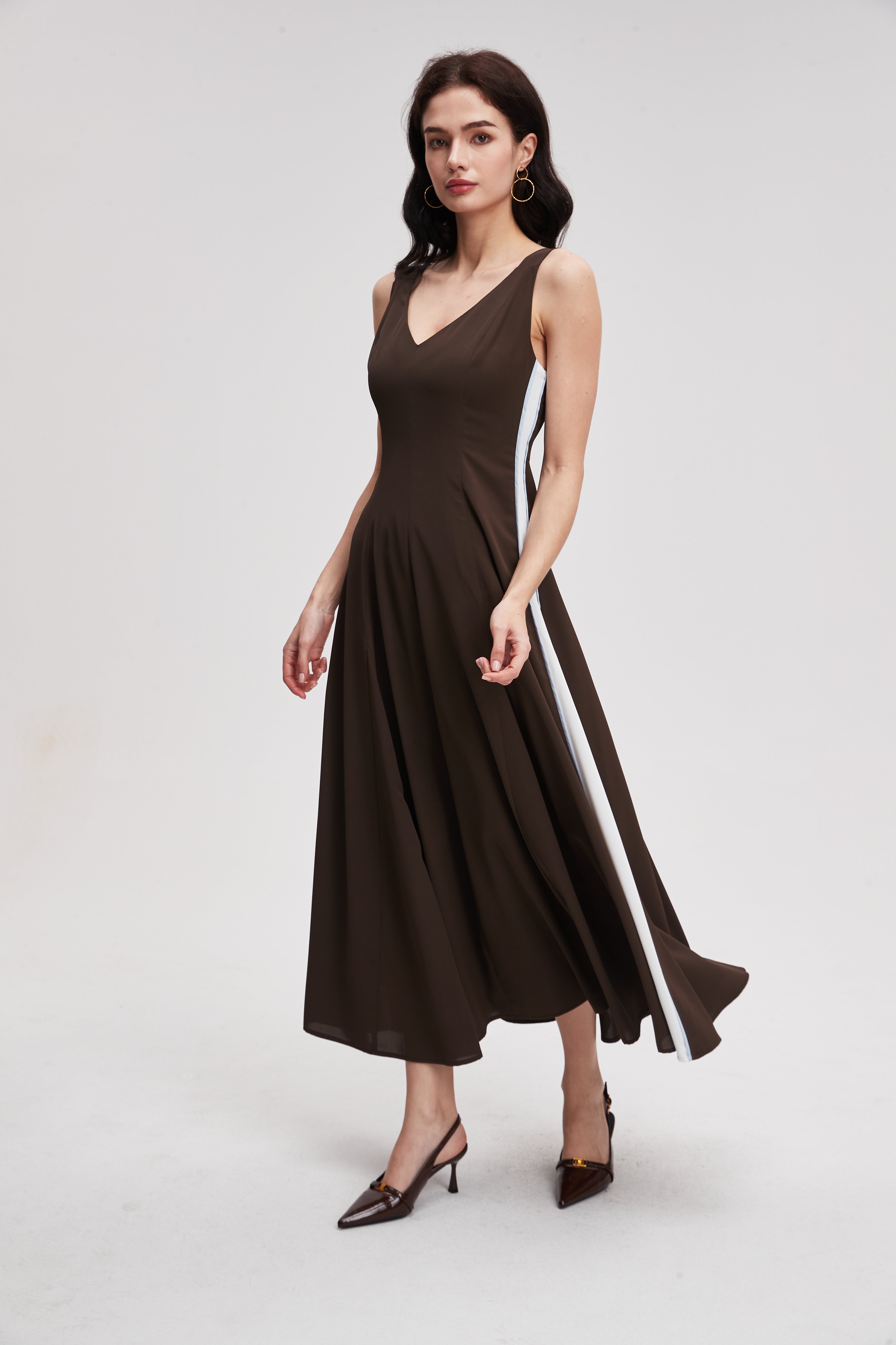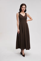 نسقي هذا الفستان الميدي بدون أكمام مع صندل بكعب عالٍ لإطلالة مسائية أنيقة، أو مع حذاء رياضي لإطلالة عملية. أضيفي قلادة بسيطة أو وشاحاً خفيفاً، وهو مثالي للعمل أو للقاءات غير الرسمية.