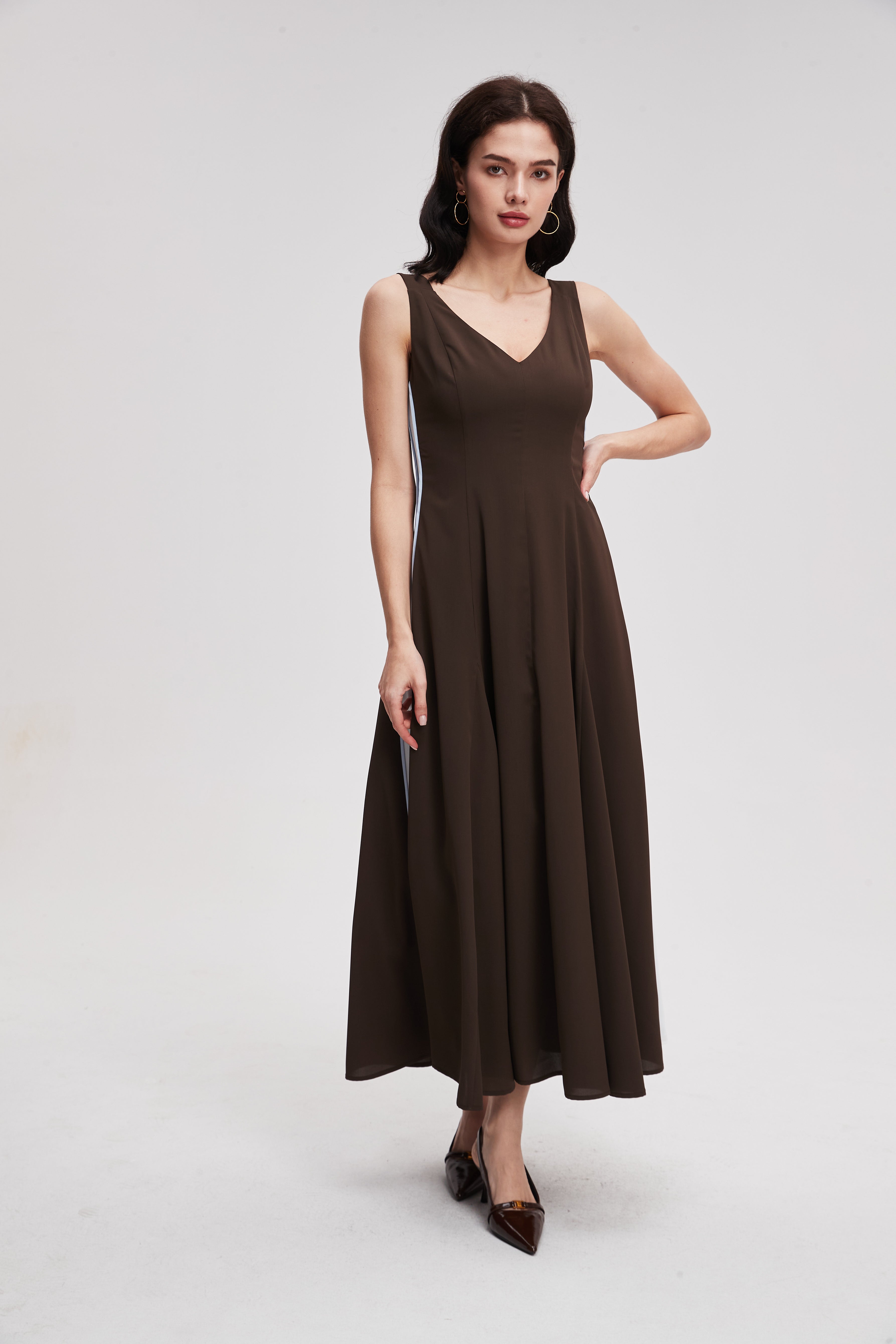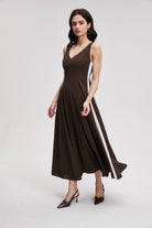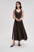 صباح عمل مزدحم وعندك اجتماع بعد الظهر ثم عشاء مع صديقاتك. قطعة واحدة تعبر معك كل هذه الأوقات بدون ما تحتاجين تغيرين. فستان بطول ميدي وتصميم بدون أكمام يخليك مرتاحة وأنيقة من أول الصبح لآخر الليل.
