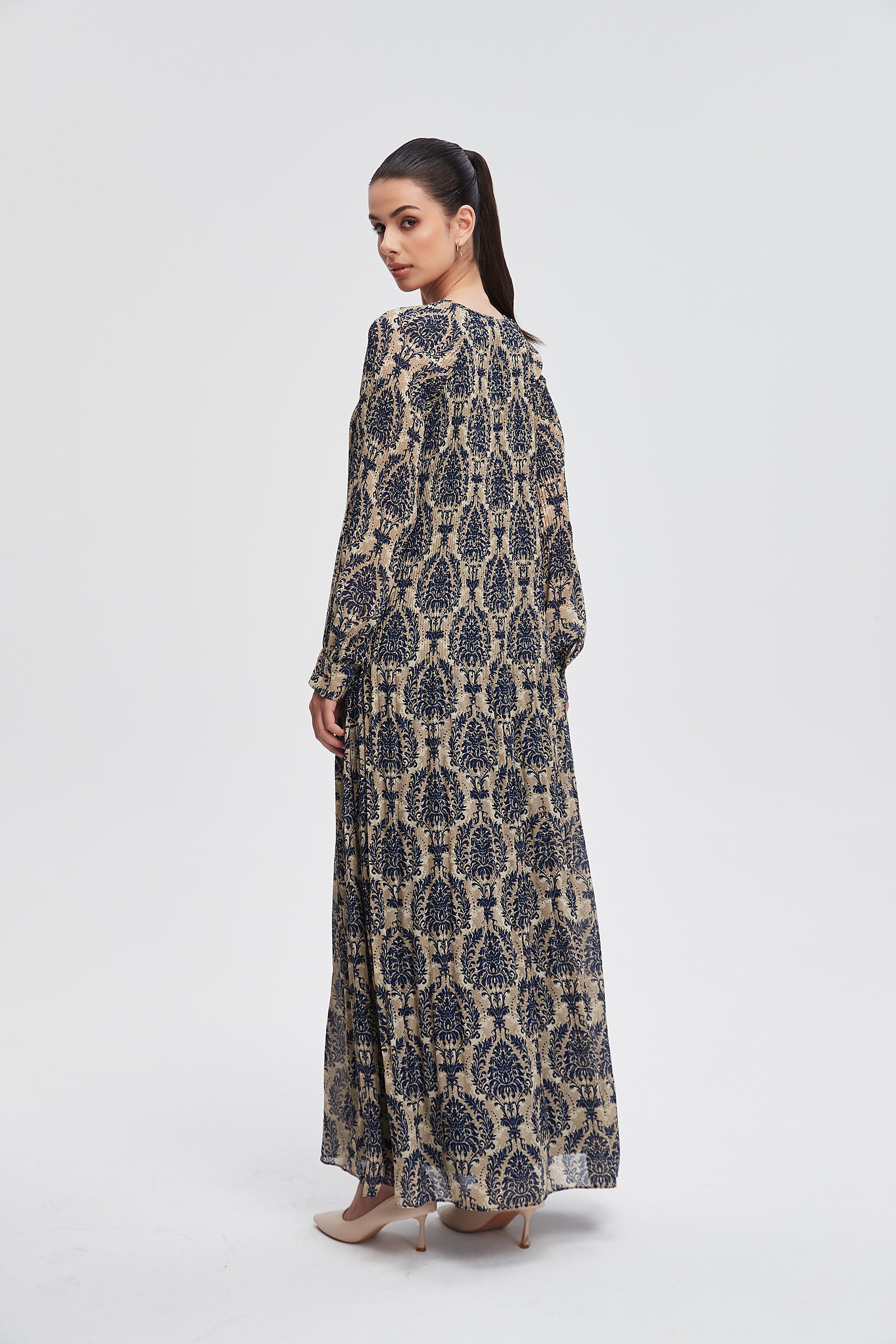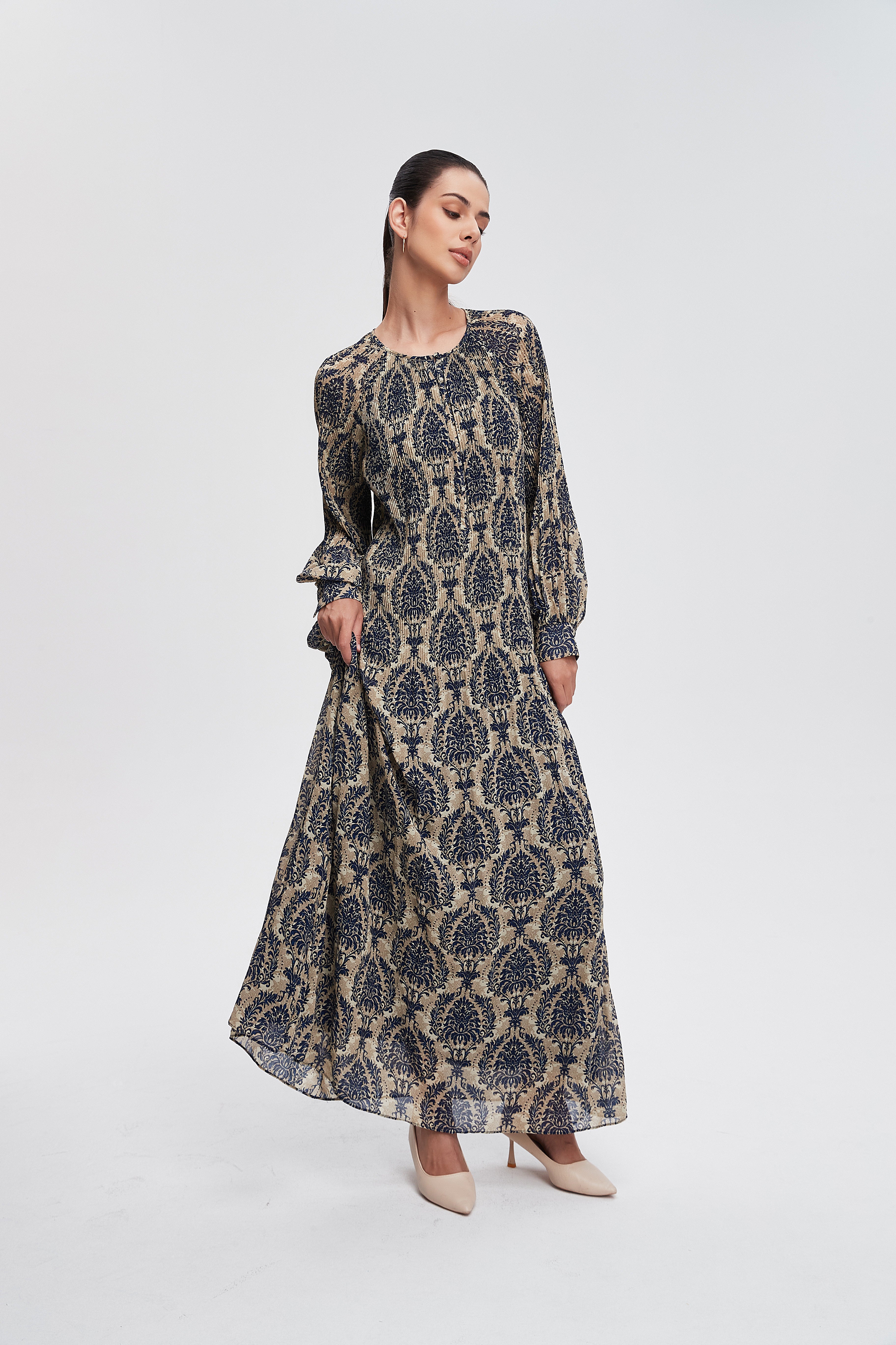 لو تبحثين عن فستان مريح وعصري يليق بخروجاتك اليومية، هذا الفستان رائع. مصنوع من شيفون مطبوع رقمي بخامة متوسطة السماكة تُبرز نقشة منقوشة بلون أخضر جذاب، ويمنحك إحساساً خفيفاً لأن الفستان بلا بطانة. القصّة A ماكسي تعطي حركة أنثوية وأناقة طويلة، وياقته مستديرة تمنح بساطة مريحة، والأكمام الطويلة تضيف لمسة احتشام أنيقة. الفستان بقصة عادية وبدون جيوب وبدون حزام، ما يترك لك حرية إضافة إكسسوار حسب مزاجك. النقشة الرقمية تظهر تفاصيل دقيقة تبرز اللون الأخضر في أنماط متباينة. لأن الفستان خفيف ومكسي، مثالي للخروجات الكاجوال والرومانسية، وستحبين كيف يتحرك معك أثناء المشي والمناسبات اليومية، مناسب لخزانة ملابسك لكل المواسم. اعثري على مقاسك في فاشن السعودية وأضيفي هذه القطعة المتنوعة إلى خزانة ملابسك اليوم.